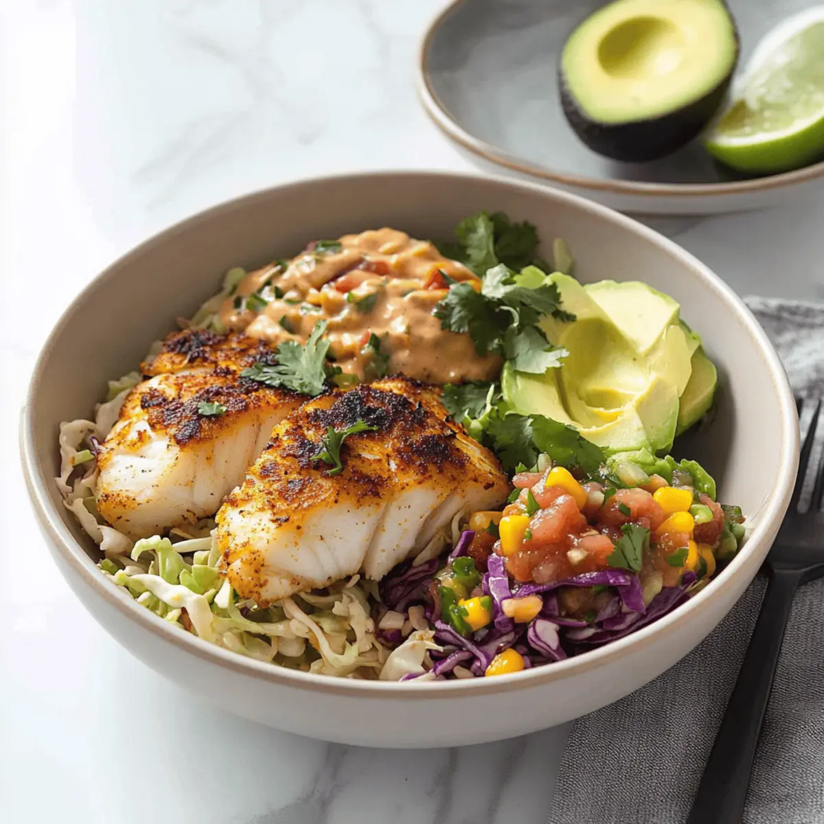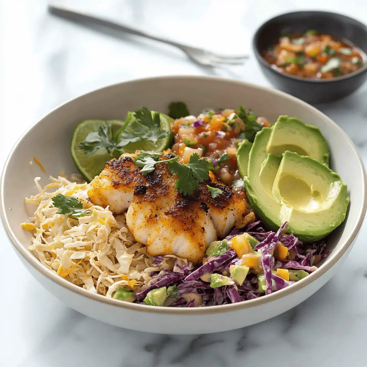 The aroma of zesty lime and sizzling fish greets you as you walk into the kitchen, setting the stage for a delightful culinary adventure. Today, I’m thrilled to share my Baja Fish Taco Bowls, where vibrant flavors come together without the need for tortillas. This dish transforms classic tacos into a light and customizable meal that’s not only quick to whip up but also a sure crowd-pleaser for weeknight dinners or special gatherings. Imagine flaky, seasoned cod paired with crunchy slaw and smoky salsa, all topped generously with creamy avocado. Whether you’re looking for a healthier dinner option or simply want to jazz up your taco night, these bowls have got you covered. Ready to dive into a world of flavor? Let’s get cooking! Why Are Baja Fish Taco Bowls So Irresistible? Vibrant flavors: This recipe captivates your taste buds with a delightful blend of flaky cod, zesty lime, and smoky salsa. Fast and easy: Perfect for busy weeknights, these bowls come together quickly, allowing you to spend less time cooking and more time enjoying. Customizable options: Want to switch things up? Try variations like Spicy Mango Baja Bowls or Southwest Shrimp Bowls to keep your meals exciting! Healthy and nutritious: With each serving rich in protein and vitamins, these bowls are a guilt-free indulgence that everyone can appreciate. No tortillas necessary: Enjoy all the taco flavor without the carbs, making it a lighter meal option that doesn’t skimp on satisfaction. Add a refreshing side with some Baked Chicken Tacos for a complete dinner experience! Baja Fish Taco Bowls Ingredients For the Slaw • Mayonnaise (or plain yogurt) – Adds creaminess. Substitute with Greek yogurt for a healthier option. • Taco seasoning – Provides flavorful spice. Use homemade if desired. • Fresh lime juice – Brightens the flavors. Fresh juice recommended for optimal taste. • Shredded cabbage – Base for slaw, adds crunch. Red cabbage can be fully or partially replaced. • Shredded red cabbage – Adds color and flavor. • Carrots – Sweetness and crunch, shredded for texture. • Green onions – Adds mild onion flavor and freshness. • Fresh cilantro – Enhances freshness. Substitute with parsley if needed. For the Fish • Cod fillets – Main protein, flaky and mild. Alternatives include halibut, tilapia, or sea bass. • Olive oil – Used for cooking the fish, contributes flavor and moisture. • Taco seasoning – For seasoning the fish, making those Baja Fish Taco Bowls extra delicious. For the Salsa • Olive oil – For sautéing ingredients in salsa. • Red onion – Adds sweetness and crunch. • Red bell pepper – Sweetness and color. • Jalapeño – Adds heat; can be omitted or adjusted for spice preference. • Frozen corn kernels – Sweetness and texture; can use fresh corn when in season. • Canned black beans – Protein and fiber source; rinsed for reduced sodium. • Fresh lime – Adds acidity to salsa. • Green onions – For garnish and flavor. For Serving • Avocado – Creaminess and richness. • Lime wedges – For extra zesty flavor. • Fresh cilantro – Optional as a garnish. Step‑by‑Step Instructions for Baja Fish Taco Bowls Step 1: Prepare the Slaw In a large bowl, whisk together mayonnaise (or yogurt), taco seasoning, and fresh lime juice until smooth. Add the shredded cabbage, red cabbage, shredded carrots, sliced green onions, and chopped cilantro to the mix. Toss everything together until the veggies are well-coated in the dressing, creating a vibrant slaw that adds crunch to your Baja Fish Taco Bowls. Set aside while you prepare the fish and salsa. Step 2: Cook the Fish Pat the cod fillets dry with paper towels to ensure better browning. Brush both sides with olive oil and generously season with taco seasoning. Heat a skillet over medium heat and add a bit of olive oil; once hot, place the fillets in the skillet. Cook for about 4 minutes until the fish releases easily from the pan. Carefully flip the fillets and cook for an additional 3-4 minutes until flaky and cooked through. Step 3: Make the Salsa In the same skillet used for the fish, add a little more olive oil if necessary and sauté the diced red onion, red bell pepper, and jalapeño over medium heat for about 1 minute until fragrant. Stir in the frozen corn kernels and black beans, cooking for another 1-2 minutes, until heated through. Squeeze in fresh lime juice and sprinkle with chopped green onions to finish your flavorful salsa for the Baja Fish Taco Bowls. Step 4: Assemble the Bowls To create your stunning Baja Fish Taco Bowls, divide the prepared slaw evenly among serving bowls as a base. Spoon the warm salsa on top of the slaw, then place the flaky cod fillets alongside. Finish each bowl with slices of creamy avocado and serve with lime wedges for a burst of freshness. A sprinkle of fresh cilantro adds the perfect touch to these delightful bowls! Baja Fish Taco Bowls Variations & Substitutions Feel free to get creative and make these delicious Baja Fish Taco Bowls your own with these fun twists and substitutions! Dairy-Free: Substitute the mayonnaise with almond or cashew cream for a creamy, dairy-free alternative. This keeps the texture while ensuring everyone can enjoy it. Spicy Mango Baja Bowls: Swap out the avocado for diced fresh mango and add some cayenne to the salsa. The sweetness of the mango pairs beautifully with the spicy notes, offering a refreshing twist. Southwest Shrimp Bowls: Replace the cod fillets with grilled shrimp and toss in roasted poblano peppers to the salsa for added smokiness. The shrimp adds a nice touch, bringing quick cooking and a delightful sweetness. Blackened Cod Taco Bowls: Season the cod with blackening spice for a bold flavor punch. Serve it with a zesty avocado lime crema for an irresistible creaminess that complements the spices perfectly. Vegetarian Option: Switch the fish with grilled zucchini or portobello mushrooms. They’ll absorb flavors