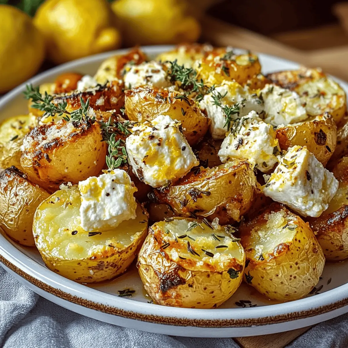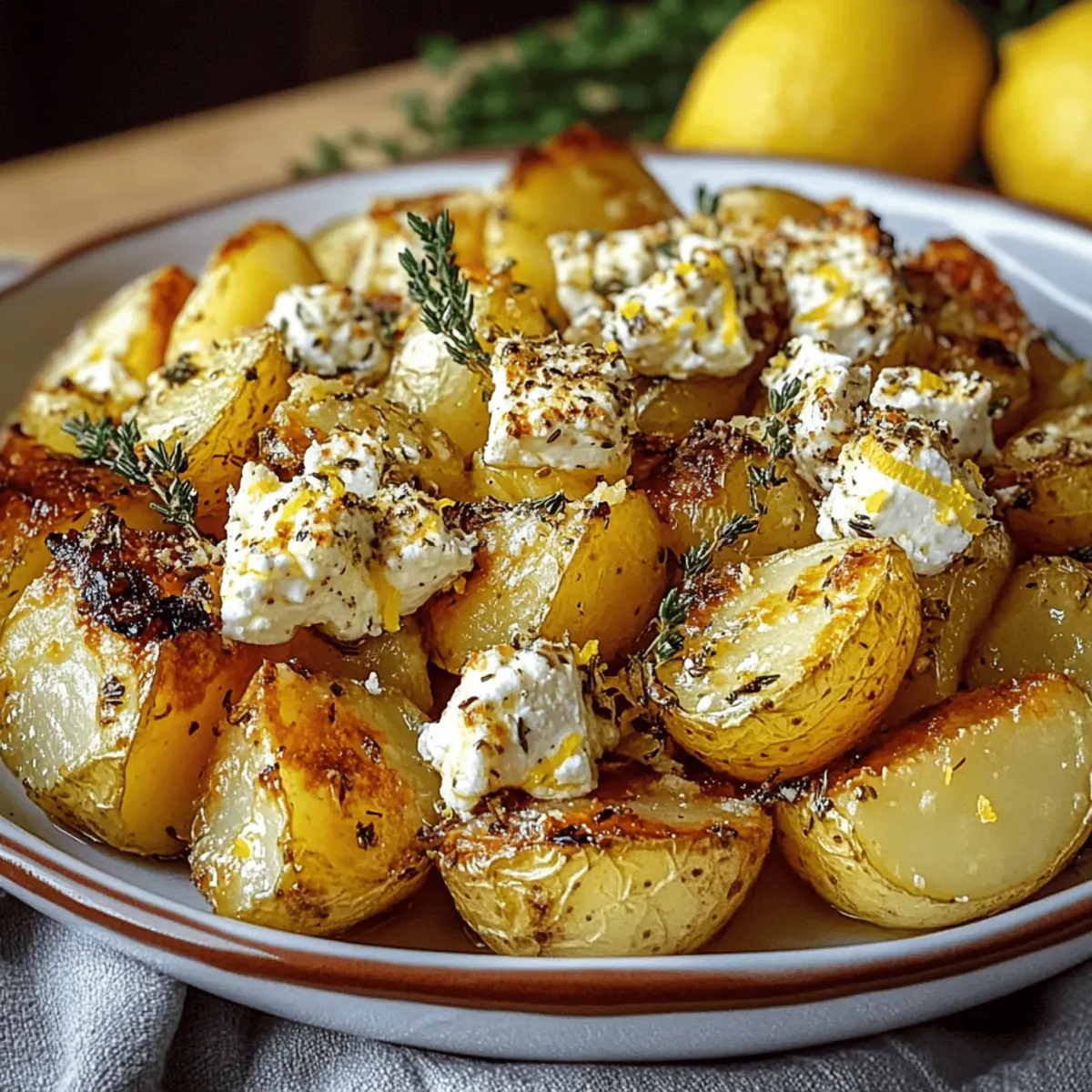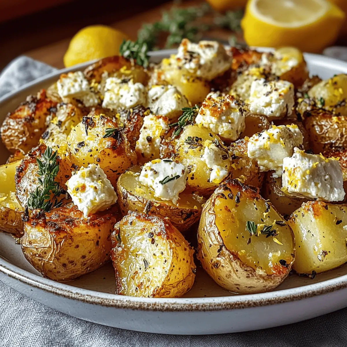 As I pulled open the oven door, the tantalizing aroma of lemon and herbs wrapped around me like a warm hug. If you’re hunting for a way to elevate your side dishes, look no further than these Creamy Baked Feta Potatoes with Lemon. This simple yet stunning vegetarian delight combines tender potatoes enveloped in rich, melted feta for a seriously satisfying bite. Not only does this dish come together in just 90 minutes, making it perfect for busy weeknights, but it also adds a fresh Mediterranean flair that will have your dinner guests buzzing with delight. Are you ready to bring some sunshine into your kitchen with these creamy, zesty delights? Why Are Baked Feta Potatoes Irresistible? Creamy Deliciousness: This dish features a heavenly blend of creamy feta and perfectly tender potatoes, creating a luxurious texture that will have you coming back for more. Quick Preparation: With only 90 minutes from start to finish, this recipe fits beautifully into any busy schedule. Mediterranean Vibes: Infused with zesty lemon and fresh thyme, these potatoes bring a burst of sunny flavors to your table, reminiscent of a rustic Mediterranean feast. Versatility at Its Finest: Enjoy them as a side with grilled chicken or fish, or pair with a refreshing Peach Lemonade Refreshing for a complete meal. Easy to Customize: Want to switch things up? Substitute sweet potatoes or try a vegan twist with your favorite plant-based cheese—endless possibilities await! Crowd-Pleasing Choice: Serve these creamy Baked Feta Potatoes at gatherings, and watch as they vanish in no time, leaving your guests raving about the flavors. Baked Feta Potatoes with Lemon Ingredients For the Potatoes • Potatoes – Use starchy varieties like Russets for the creamiest texture in your Baked Feta Potatoes with Lemon. • Olive Oil – Adds richness and helps crisp the edges; substitute with avocado oil for a different twist. • Thyme – Fresh thyme gives an aromatic Mediterranean touch; dried works in a pinch. For the Zesty Mixture • Lemon Zest – Brightens the dish; use the zest from the lemon you’re juicing for minimal waste. • Lemon Juice – Fresh juice provides a balancing acidity that elevates the overall flavor. • Salt & Pepper – Season to taste for that perfect flavor balance. For the Creamy Topping • Feta Cheese – Adds a rich, tangy creaminess; opt for reduced-fat feta or goat cheese for a lighter option. Step‑by‑Step Instructions for Baked Feta Potatoes with Lemon Step 1: Preheat the Oven Begin by preheating your oven to 400°F (200°C). This temperature ensures that your Baked Feta Potatoes with Lemon cook evenly, allowing the potatoes to become tender and the feta to melt beautifully. While the oven heats up, you can prepare the potatoes, making the most of your time. Step 2: Prepare the Potatoes In a spacious baking dish, combine your diced starchy potatoes with olive oil, lemon zest, lemon juice, thyme, salt, and pepper. Use a large spoon to toss everything together until the potatoes are well-coated, ensuring that every piece absorbs the lovely zesty flavors. You’ll see the potatoes glisten with oil, signaling they’re ready for the next step. Step 3: Crumble the Feta Next, take your feta cheese and crumble it generously over the top of the potato mixture. This layer of feta will melt and create a rich, creamy topping as it bakes. Visually, you want to cover the potatoes evenly, so each bite of your Baked Feta Potatoes with Lemon is loaded with that delicious tangy flavor. Step 4: Bake the Dish Carefully place the baking dish in your preheated oven and bake for 30-35 minutes. You’ll know it’s time to check for doneness when your kitchen fills with savory aromas. The potatoes should be tender when pierced with a fork, and the feta should be beautifully golden, bubbling enticingly over the potatoes. Step 5: Serve Warm Once baked to perfection, remove the dish from the oven and let it cool slightly. Serve your Baked Feta Potatoes with Lemon warm as a delightful side dish. You’ll love the creamy texture coupled with a hint of citrus; it’s sure to impress everyone at the table. Expert Tips for Baked Feta Potatoes Choose the Right Potatoes: Opt for starchy varieties like Russets to achieve the creamiest texture in your Baked Feta Potatoes with Lemon. Don’t Overcrowd: Ensure the potatoes are evenly spaced in the baking dish to promote even cooking and prevent steaming. Fresh Ingredients Matter: Use fresh lemon juice and thyme for the best flavor; dried herbs can alter the taste. Watch the Feta: To avoid burning, check the feta in the last few minutes. Remove it when golden but still creamy. Store Properly: Keep leftovers in an airtight container in the fridge for up to 3 days; reheat in the oven for the best texture. Baked Feta Potatoes with Lemon Variations Feel free to put your personal spin on these delightful potatoes while savoring their creamy goodness and bright flavors! Sweet Potato Swap: Substitute regular potatoes with sweet potatoes for a touch of sweetness and an extra nutrient boost. This variation adds a lovely caramelized flavor that pairs wonderfully with the feta. Vegan Twist: For a vegan version, simply replace the feta with your favorite plant-based cheese or omit it altogether. The dish remains full of flavor and comfort without compromising on deliciousness. Heat it Up: Add a sprinkle of red pepper flakes to the potato mixture before baking for a delightful kick of heat. This subtle twist brings additional warmth without overpowering the dish’s zesty notes. Herb Infusion: Incorporate fresh rosemary or dill along with or instead of thyme for an herbaceous twist. These herbs complement the lemon and feta beautifully, giving each bite a new depth of flavor. Add Creaminess: Mix a dollop of Greek yogurt or sour cream into the cooked potatoes before placing them in the oven for extra creaminess. This indulgent addition elevates the dish while keeping it just as comforting a