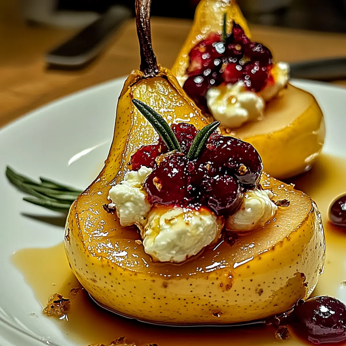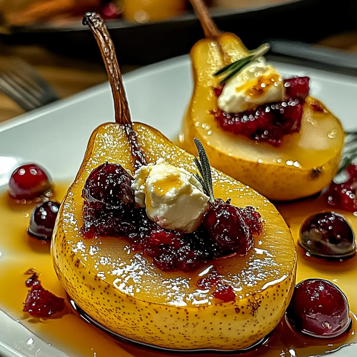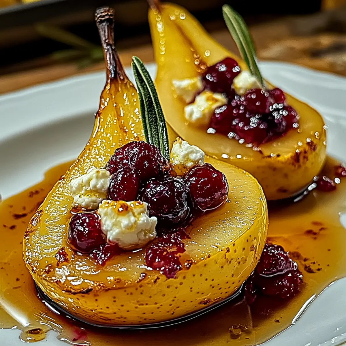 As the scent of autumn fills the air, the allure of baked fruits beckons us back to the kitchen. I’ve found that nothing captures the season quite like these Elegant Baked Pears with Goat Cheese, Honey, and Cranberries. This recipe not only transforms pears into a stunning appetizer or light dessert, but it also offers the remarkable benefit of quick prep, allowing you to enjoy more moments with loved ones. The creamy goat cheese effortlessly complements the sweet, tender pears and tart cranberries, creating a delightful balance that’s perfect for any occasion. Whether you’re hosting a festive gathering or simply treating yourself, these baked pears are sure to impress without requiring hours in the kitchen. Curious to learn how to create this seasonal masterpiece? Let’s dive in! Why Are Baked Pears So Irresistible? Simplicity: This recipe requires minimal effort, making it ideal for busy schedules while enhancing your culinary repertoire. Elegant Presentation: The warm, caramelized pears topped with creamy goat cheese and vibrant cranberries look stunning on any table, perfect for impressing guests. Flavor Balance: The sweetness of honey, the tartness of cranberries, and the richness of goat cheese create a delightful medley of tastes that will have everyone asking for seconds. Versatility: Serve these baked pears as a sophisticated appetizer, a delightful light dessert, or a lovely side dish during festive gatherings. They fit any occasion! For a delicious twist, consider adding nuts for crunch or experimenting with different honey types to enhance flavor—just like in my Mini Baked Chicken recipe! Enjoy the burst of seasonal flavors that these baked pears bring. Baked Pears with Goat Cheese Ingredients Discover the perfect balance of flavors with these baked pears. For the Pears • Pears – Choose ripe but firm varieties like Bartlett or Bosc for optimal baking. • Unsalted Butter – Adds richness and helps caramelize the pears for a lovely golden finish. For the Filling • Goat Cheese – This creamy, tangy cheese pairs beautifully with the sweetness of the pears and honey. • Fresh Cranberries – They provide a juicy burst of tartness, adding depth to the dish. For Drizzling • Honey – A drizzle of honey not only enhances sweetness but also gives a glossy touch to the baked pears. For Optional Garnish • Fresh Mint Leaves – They add a pop of color and freshness to the finished dish. • Cinnamon – Sprinkle lightly for added warmth and aromatic depth. Elevate your gatherings with this stunning recipe featuring baked pears with goat cheese, honey, and cranberries! Step‑by‑Step Instructions for Baked Pears with Goat Cheese, Honey, and Cranberries Step 1: Preheat the Oven Begin by preheating your oven to 375°F (190°C). This temperature is key to achieving perfectly baked pears that are tender with a golden exterior. While the oven heats up, gather your baking dish and the ingredients for a smooth cooking process. Step 2: Prepare the Pears Gently halve the ripe but firm pears, ensuring to core them carefully. Place the pear halves cut-side up in your baking dish, making sure they sit flat for even baking. This preparation is essential for your Baked Pears with Goat Cheese, Honey, and Cranberries to cook beautifully. Step 3: Add Butter Dot each pear half with small pieces of unsalted butter, allowing the richness to enhance the natural sweetness during baking. Make sure to distribute the butter evenly across all pear halves. This step is crucial for achieving that delightful caramelization that will make your pears irresistible. Step 4: Roast the Pears Place the baking dish in the preheated oven and roast the pears for about 20 minutes. Keep an eye on them as they begin to turn golden and become fork-tender. The aroma of baking pears will fill your kitchen, hinting at the delicious creation that’s about to unfold. Step 5: Prepare the Cranberry Compote While the pears are roasting, take a saucepan and combine fresh cranberries with honey over medium heat. Simmer this mixture until the cranberries begin to burst and form a loose compote, which should take about 5-7 minutes. Stir occasionally, ensuring the berries soften and meld with the honey for a delightful tartness. Step 6: Fill the Pears Once the pears are done roasting, pull them from the oven and carefully fill each cavity with creamy goat cheese. This tangy cheese complements the sweetness of the pears and enhances the overall flavor profile of your Baked Pears with Goat Cheese, Honey, and Cranberries. Step 7: Top with Compote Spoon your freshly made cranberry mixture generously over the goat cheese in each pear half. The vibrant color and tartness of the cranberries provide a beautiful contrast to the creamy cheese and sweet pears, creating an elegant look and delightful taste. Step 8: Drizzle and Garnish Finally, drizzle a bit of honey over the top of the filled pears for an extra touch of sweetness. If desired, sprinkle cinnamon for warmth and aromatic depth, and garnish with fresh mint leaves to add a pop of color. Your sophisticated dish is now ready to impress! What to Serve with Baked Pears with Goat Cheese, Honey, and Cranberries Elevate your dining experience by pairing these exquisite baked pears with complementary flavors and textures that will resonate with your guests. Creamy Mashed Potatoes: The velvety smoothness of mashed potatoes offers a comforting, hearty contrast to the elegance of the pears, making every bite a delightful surprise. Mixed Greens Salad: A fresh salad with peppery arugula, citrus segments, and a light vinaigrette brings a refreshing balance to the sweetness of the baked pears. The acidity cuts through the creaminess beautifully. Candied Walnuts: These crunchy, sweet-tart nuts add a fantastic texture and a nutty depth, enhancing the overall flavor profile of your meal. Their caramelized coating echoes the sweetness of the pears. Roasted Brussels Sprouts: Crisp, carame