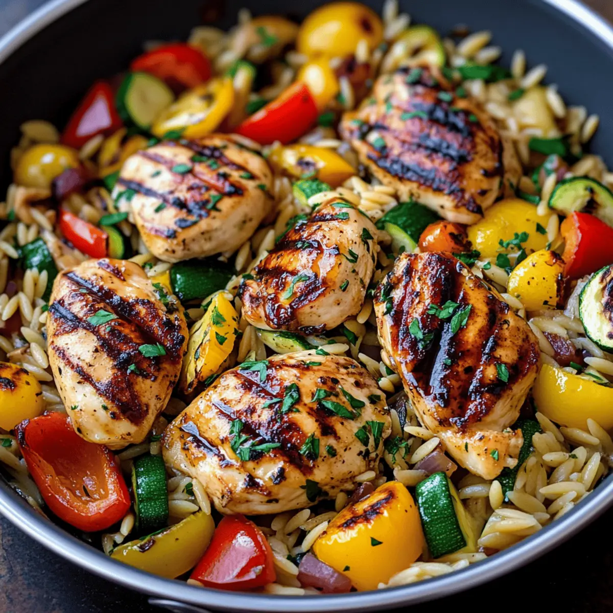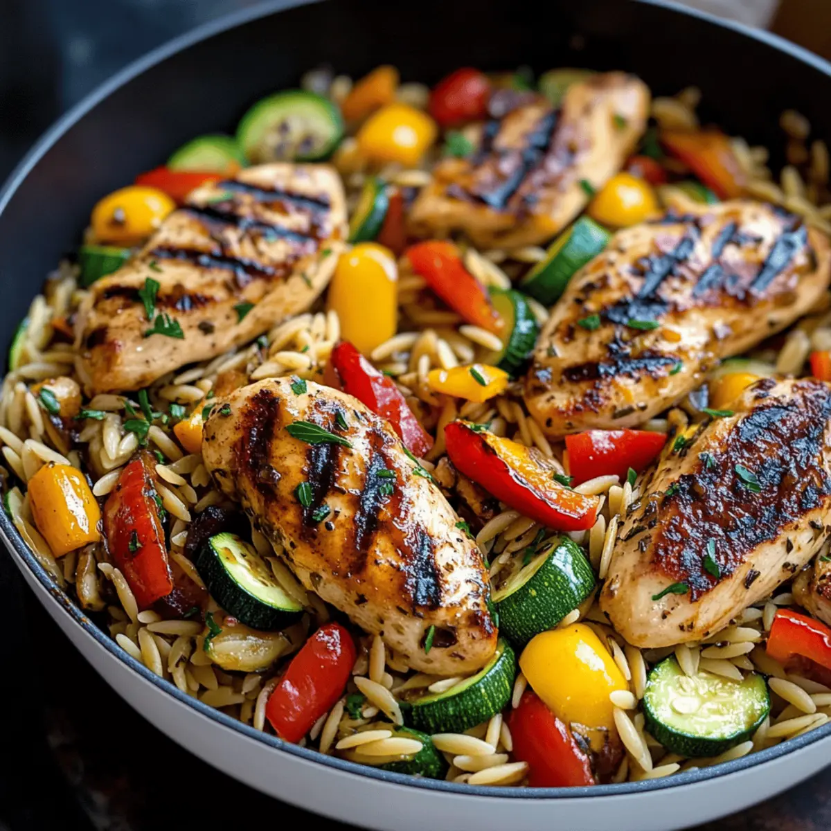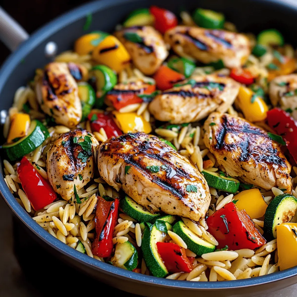 As I sliced through the golden-brown chicken, I could already envision the vibrant plate that awaited: a delightful symphony of colors and flavors swirling together. This Easy Balsamic Chicken & Veggie Orzo is not just a one-pan meal; it’s a culinary celebration ready in just 30 minutes! With minimal cleanup, it’s perfect for those bustling weeknights when time is short but the desire for a home-cooked feast is strong. Imagine tender chicken mingling with perfectly cooked orzo and piles of fresh vegetables, all drizzled in a tangy balsamic glaze. It’s both hearty and wholesome while carrying a delightful Mediterranean flair. Plus, you can easily swap ingredients to cater to your cravings or dietary needs. Are you curious to see just how simple and delicious this dish can be? Let’s dive right in! Why is Balsamic Chicken & Veggie Orzo a Must-Try? Simplicity meets Flavor: With just one pan and only 30 minutes, you’ll create a delicious meal that satisfies any craving! Versatile Options: Feel free to substitute seasonal veggies or pasta types to keep it fresh. Crowd-Pleasing Delight: Perfect for family dinner or gathering, its vibrant colors and flavors are sure to impress! Nutritious and Wholesome: Packed with protein and fiber, this dish is as healthy as it is hearty. For another comforting meal, check out my recipe for Butter Chicken Comfort. Easy Clean-Up: Minimal dishes mean you can spend more time enjoying the meal and less time scrubbing pots! Don’t miss the chance to impress with this Mediterranean-inspired gem. Balsamic Chicken & Veggie Orzo Ingredients Here’s everything you need to whip up this delicious and hearty one-pan meal! For the Chicken Chicken Breasts – Main protein source; substitute with boneless, skinless chicken thighs for even more flavor. Olive Oil – Essential for sautéing; any high-heat cooking oil can work if you’re out of olive oil. For the Vegetables Red Onion – Adds depth and sweetness; yellow onion is an excellent substitute if needed. Garlic – Provides aromatic flavor; fresh minced garlic is best, but garlic powder can work in a pinch. Bell Pepper – Bursting with sweetness and crunch; any color works, or swap for zucchini or seasonal vegetables. Zucchini – Provides mild flavor; replace with asparagus or yellow squash if desired. For the Pasta and Broth Orzo Pasta – Absorbs all the delicious flavors; gluten-free pasta can be used as a substitute for dietary preferences. Chicken Broth – Enhances moisture and flavor; vegetable broth is a great alternative for a lighter option. For the Finishing Touches Cherry Tomatoes – Adds a sweet and tangy element; fresh is best, but canned will do in a pinch. Balsamic Vinegar – Delivers a fantastic tangy glaze; using high-quality balsamic elevates this dish immensely. Fresh Basil – Offers a burst of freshness as garnish; simply omit if you can’t find any. Enjoy preparing your Balsamic Chicken & Veggie Orzo, where every bite is a celebration of Mediterranean-inspired flavors! Step‑by‑Step Instructions for Balsamic Chicken & Veggie Orzo Step 1: Prepare the Chicken Begin by seasoning the chicken breasts with salt, pepper, and half of the oregano to enhance their flavor. Heat a drizzle of olive oil in a large skillet over medium heat, and sauté the chicken for 6-7 minutes per side or until golden brown and cooked through. Once done, transfer the chicken to a plate and allow it to rest while you continue with the vegetables. Step 2: Sauté Vegetables In the same skillet, add a bit more olive oil if needed, then toss in the chopped red onion. Sauté over medium heat for 2-3 minutes until the onion is soft and translucent. Next, add minced garlic, cooking for an additional 30 seconds until fragrant, making sure not to burn the garlic, which can alter the dish’s flavor. Step 3: Add Vegetables and Orzo Now, introduce diced bell pepper and zucchini to the skillet, sautéing them for 3-4 minutes until they begin to soften and brighten in color. Stir in the orzo pasta, mixing everything well to ensure the orzo is evenly coated with the flavorful vegetable mixture, allowing it to absorb the essence of the sautéed ingredients. Step 4: Liquid and Simmer Pour the chicken broth into the skillet, bringing the mixture to a boil. Once boiling, reduce the heat to medium-low, cover the skillet, and let it simmer for 10-12 minutes, or until the orzo is tender and most of the liquid has been absorbed. Keep an eye on it, stirring occasionally to prevent sticking. Step 5: Finish the Dish Slice the rested chicken into strips, then stir it back into the skillet along with the cherry tomatoes and balsamic vinegar. Allow everything to cook together for an additional 2-3 minutes over low heat, just until the tomatoes soften and release their juices, combining with the other flavors in the Balsamic Chicken & Veggie Orzo. Step 6: Serve Remove the skillet from the heat and sprinkle the remaining oregano and fresh basil over the top for a burst of flavor and color. Serve the Balsamic Chicken & Veggie Orzo warm, ensuring each plate gets a lovely mix of chicken, orzo, and vibrant vegetables. Enjoy the colorful presentation and hearty taste! Expert Tips for Balsamic Chicken & Veggie Orzo Even Thickness: Pound the chicken to an even thickness of about ¾ inch. This ensures it cooks uniformly for perfect tenderness. Stir Often: Stir the orzo occasionally during cooking to prevent it from sticking. If the liquid absorbs too quickly, add more chicken broth as needed. Creamy Twist: For a creamier texture, stir in a splash of cream or a handful of grated Parmesan before serving for extra richness. Vegetarian Option: To make a vegetarian version of this Balsamic Chicken & Veggie Orzo, simply omit the chicken and use vegetable broth. Add extra veggies or chickpeas for heartiness. Fresh Ingredients: Always prefer fresh ingredients when possible, particularly basil and garlic, to maximize flavor in this one-pan meal. What to
