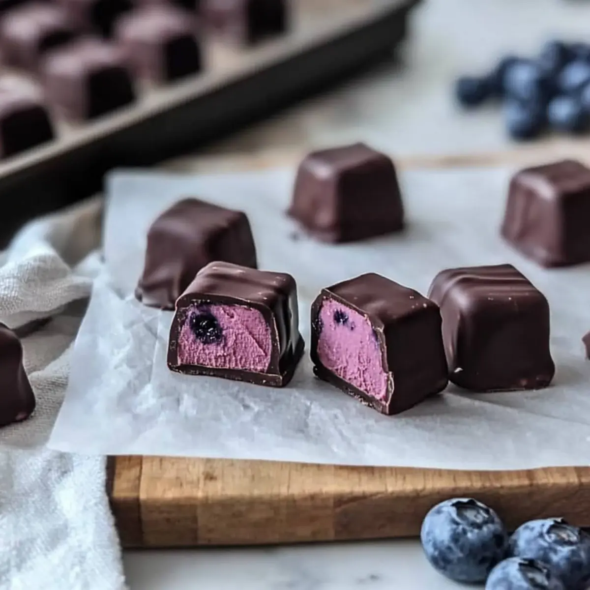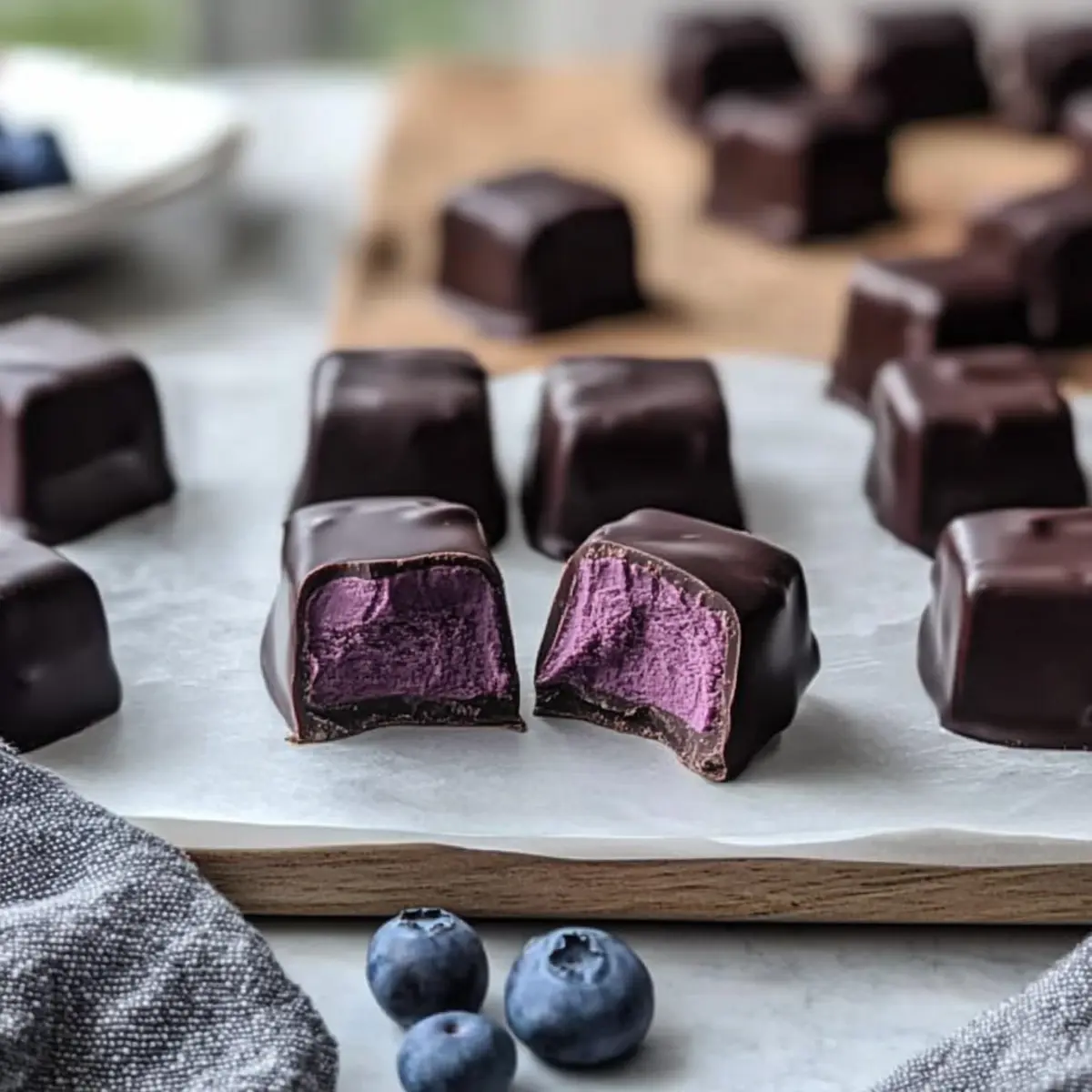 As I stirred those vibrant hues of blueberry flavor into the creamy buttercream, a luscious no-bake creation took shape before my eyes. This journey led me to crafting Blueberry Buttercream Chocolates, an indulgence that marries the sweet nostalgia of fruity treats with the sophistication of dark chocolate. Not only are these delightful chocolates incredibly easy to whip up, but they also make for a stunning centerpiece at any gathering or thoughtful gifts for loved ones. The smooth, silky filling, encased in glossy chocolate, offers a refreshing twist that is perfect for springtime celebrations or cozy afternoons alike. Curious how to make these dreamy bites that can lift your spirits? Let’s dive in! Why Are These Chocolates So Special? Indulgence at Its Finest: Each bite of these Blueberry Buttercream Chocolates delivers a luxurious combination of silky buttercream and rich dark chocolate, creating a treat that feels gourmet. Effortlessly Elegant: With a no-bake approach, you can whip these up without any complicated techniques or baking equipment. Crowd-Pleasing Delight: Perfect for gatherings or as a sweet gift, they are sure to impress friends and family alike, making any occasion feel special. Versatile Surprises: Feel free to experiment by swapping the blueberry flavor for others like raspberry or lemon to suit your mood or theme! For an equally delightful twist, why not try our Blueberry Buttermilk Pancake recipe? Storage Simplicity: Keeping them fresh is a breeze, and they stay delicious for up to two weeks in an airtight container. Blueberry Buttercream Chocolates Ingredients For the Buttercream Powdered Sugar – Provides sweetness and structure; adjust the amount for your desired consistency. Unsalted Butter – Offers a creamy base; make sure it’s softened to ensure that your buttercream is fluffy. Blueberry Flavor Paste – Infuses a deep, natural flavor; fresh or frozen blueberries can be substituted, but this may alter texture. Whole Milk – Helps achieve a smooth, pipeable consistency; adjust quantity based on thickness needed. Salt – Enhances the flavor depth by balancing sweetness. For the Chocolate Coating Dark Chocolate – Creates a glossy finish and rich flavor; opt for high-quality chocolate for the best results. Step‑by‑Step Instructions for Blueberry Buttercream Chocolates Step 1: Prepare the Pan Start by lining an 8 x 6 quarter sheet pan with parchment paper, ensuring that it sits smoothly against the bottom and sides. This will provide a non-stick surface for your Blueberry Buttercream Chocolates, making it easier to lift them out later. Take a moment to press the paper into the corners so it stays secure while you work. Step 2: Make Buttercream In a mixing bowl, beat 1 cup of softened unsalted butter with an electric mixer until smooth and creamy, about 3 minutes on medium speed. Gradually add 4 cups of powdered sugar, mixing on low speed to avoid a sugar cloud, and increase to medium as it incorporates until you have a fluffy texture. Step 3: Add Flavor Stir in 2-3 tablespoons of blueberry flavor paste and a pinch of salt. Continue mixing until the blueberry flavor is fully integrated, which will take about a minute. The mixture should have a vibrant hue and a rich aroma that indicates you’re on the way to creating the delicious Blueberry Buttercream Chocolates. Step 4: Adjust Consistency To achieve the desired smooth and pipeable consistency, slowly add whole milk, one tablespoon at a time, mixing after each addition. Keep an eye on the texture; it should be spreadable but not runny. If the mixture is too soft, add an extra tablespoon of powdered sugar until it reaches a fluffy and stable consistency. Step 5: Chill and Cut Spoon the blueberry buttercream mixture into the prepared parchment-lined pan, smoothing it out into an even layer. Chill in the refrigerator for 15-20 minutes until firm to the touch. Once set, carefully lift the buttercream from the pan and use a sharp knife to cut it into 1-inch squares, creating perfectly sized pieces for your Blueberry Buttercream Chocolates. Step 6: Dip in Chocolate Melt high-quality dark chocolate in a heatproof bowl over simmering water or in the microwave, stirring until smooth. Take each buttercream square and dip it into the melted chocolate, ensuring each piece is fully coated. Allow excess chocolate to drip off, then place them on a parchment-lined tray to set. Step 7: Store After dipping, let the chocolates sit at room temperature for 30-60 minutes or pop them in the fridge for a quicker set. Once firm, transfer your Blueberry Buttercream Chocolates to an airtight container, where they can be stored at room temperature for up to two weeks. This ensures your treats remain fresh and ready for enjoyment! How to Store and Freeze Blueberry Buttercream Chocolates Room Temperature: Store your Blueberry Buttercream Chocolates in an airtight container at room temperature for up to 2 weeks to maintain their delightful texture. Fridge: If needed, you can refrigerate them, but note that this may alter the smooth creaminess of the buttercream filling. Freezer: For long-term storage, freeze the chocolates in an airtight container for up to 2 months. Allow them to thaw at room temperature before enjoying their full texture and flavor. Reheating: While not typically necessary, if you prefer a warm treat, you can gently re-melt the outer chocolate layer in a microwave for a few seconds, ensuring not to overheat. Make Ahead Options These Blueberry Buttercream Chocolates are perfect for busy home cooks looking to save time without sacrificing flavor! You can prepare the buttercream filling up to 3 days in advance. Simply follow the instructions to make the buttercream, then chill it in the prepared pan, cover it tightly with plastic wrap, and refrigerate. When you’re ready to serve, cut the buttercream into squares and dip them in melted dark chocolate. This method retains the vibrant blueberry flavor and silky 