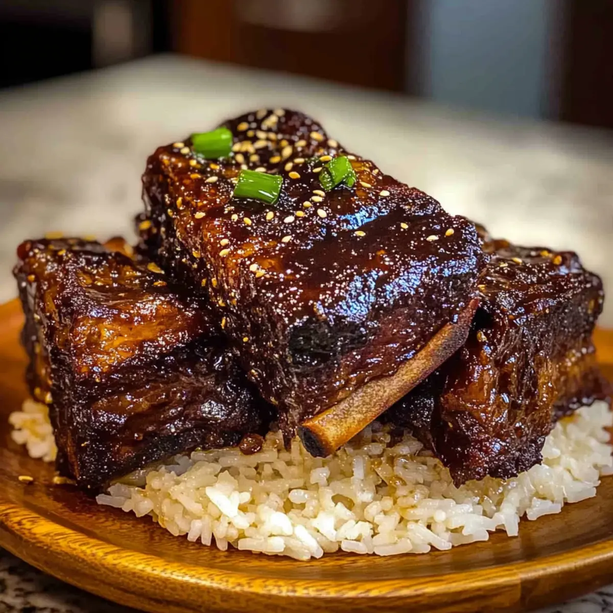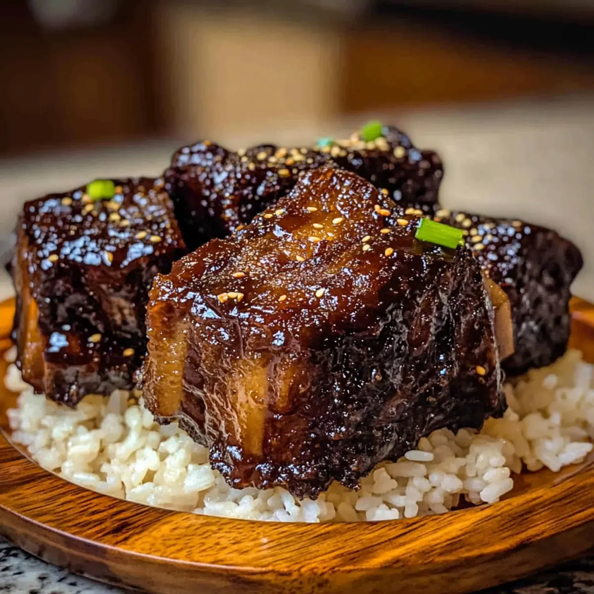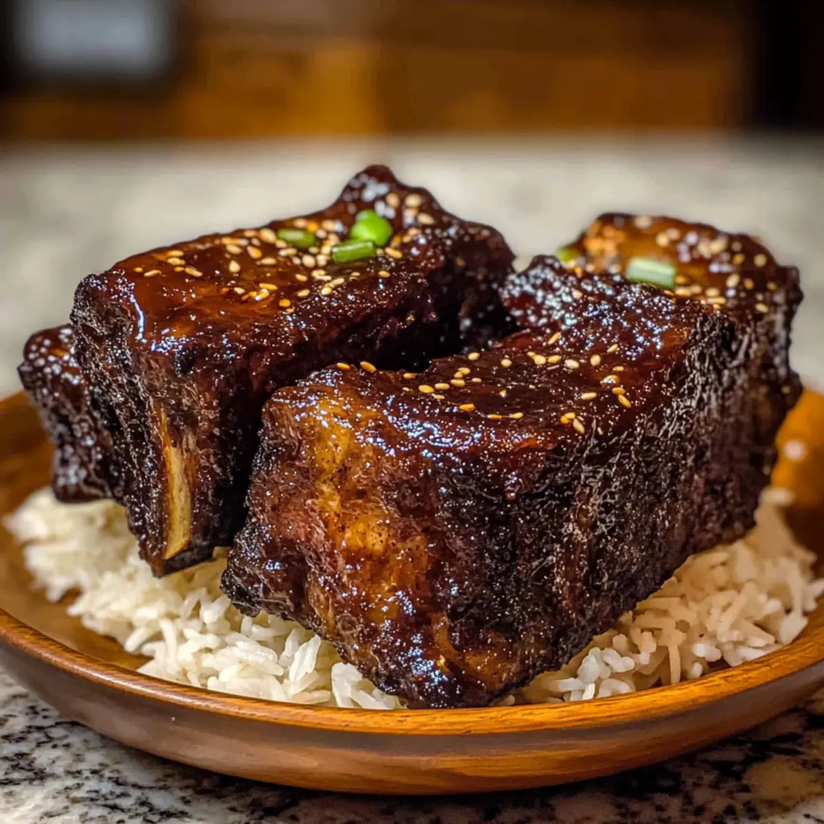 As I stood in my kitchen, watching the beef short ribs sizzle in the skillet, a wave of anticipation washed over me. There’s something magical about caramelizing meat, especially when you’re preparing Caramelized Slow Roast Asian Beef Short Ribs. This recipe takes comfort food to a whole new level—tender, juicy ribs glazed with a sticky, umami-rich sauce that’s simply irresistible. The best part? It’s perfect for sharing a gourmet meal with loved ones, yet oh-so-easy to whip up on a cozy weeknight. These slow-roasted ribs are not only a crowd-pleaser but also allow you to savor that homemade goodness without the fuss. Ready to add a touch of magic to your dinner table? Let’s dive into this culinary adventure together! Why are these ribs a must-try? Melt-in-your-mouth tenderness: The slow roasting method ensures the beef is incredibly tender, practically falling off the bone. Crispy caramelized edges: A brief broil at the end gives these short ribs irresistible caramelization, enhancing their flavor and visual appeal. Umami explosion: The combination of soy sauce, hoisin, and ginger creates a sauce that’s rich and savory, perfect for pouring over rice or noodles. Family-friendly favorite: This dish is ideal for both casual family dinners and special occasions, making it a versatile addition to your meal rotation. Easy preparation: With simple ingredients and straightforward steps, you can create a gourmet experience in the comfort of your own home. For a tasty side, consider pairing with Garlic Butter Beef or steamed greens to round out your meal! Caramelized Slow Roast Asian Beef Short Rib Ingredients • Get ready to savor every bite! Bone-in beef short ribs (3–4 lbs): Main protein, offers rich flavor and tenderness. Substitutable with boneless cuts if necessary. Soy sauce (½ cup): Adds salty umami depth; for a gluten-free option, use tamari. Hoisin sauce (¼ cup): Provides sweet and tangy richness that elevates the glaze. Mirin (¼ cup): Contributes subtle sweetness and acidity, balancing the flavors perfectly. Brown sugar (3 tbsp): Enhances caramelization for those delicious sticky edges; coconut sugar works well too. Garlic cloves (4, minced): Adds aromatic warmth and depth to the sauce. Fresh ginger (1 tbsp, grated): Heightens the dish’s flavor profile with aromatic zest. Chili flakes or Sriracha (½–1 tsp, optional): Introduces a gentle heat, customizable to your spice preference. Small onion (1, sliced): Infuses savory notes that blend beautifully with the sauce. Green onions (2–3, cut into 2-inch pieces): Adds freshness and a mild onion flavor for garnish. Cornstarch (1 tsp mixed with 1 tbsp water, optional): Thickens the glaze for a glossy finish that’s utterly tantalizing. Prepare to impress your palate and your guests with this Caramelized Slow Roast Asian Beef Short Rib recipe! Step‑by‑Step Instructions for Caramelized Slow Roast Asian Beef Short Rib Step 1: Prep Ribs Begin by trimming excess fat from the bone-in beef short ribs, ensuring a clean surface for seasoning. Pat the ribs dry with paper towels, then generously season them with salt and pepper to enhance flavor. Create a flavorful foundation for your Caramelized Slow Roast Asian Beef Short Rib as you prepare to sear them. Step 2: Sear Meat Heat a large skillet over medium-high heat, adding a splash of oil once hot. Carefully place the prepared short ribs in the skillet, browning them on all sides for about 4-5 minutes per side until a beautiful golden crust forms. This step not only adds texture but also infuses rich flavors into your ribs, setting the stage for the next stages of cooking. Step 3: Prepare Marinade In a mixing bowl, combine soy sauce, hoisin sauce, mirin, brown sugar, minced garlic, grated ginger, and optional chili flakes. Whisk the mixture well until the sugar dissolves, creating a balanced marinade full of umami flavors that will penetrate the ribs during slow roasting. This concoction is vital for crafting the sticky glaze associated with Caramelized Slow Roast Asian Beef Short Rib. Step 4: Roast Transfer the seared short ribs to a Dutch oven and pour the marinade over them, ensuring they are well coated. Add the sliced onion and green onion pieces for additional seasoning. Cover the pot and place it in an oven preheated to 275–300°F (135–150°C). Let the ribs slow roast for 3-4 hours, basting occasionally, until they become tender and infused with flavors. Step 5: Reduce Sauce Once the ribs are fork-tender, carefully remove them from the Dutch oven and set them aside. Pour the remaining braising liquid into a skillet over medium heat, simmering it for about 10-15 minutes until it thickens and becomes glossy. If desired, mix cornstarch with water to create a slurry, adding it to the sauce for an extra glossy finish that will enhance your dish. Step 6: Optional Broil For an added touch of decadence, preheat your broiler. Place the tender short ribs on a baking sheet and broil for 2-3 minutes, watching closely for caramelization. This quick step creates crispy edges that add a delightful texture to your Caramelized Slow Roast Asian Beef Short Rib, making them even more irresistible. Step 7: Serve Plate the beautifully glazed ribs over a bed of steamed rice, noodles, or roasted vegetables to complement the dish. Drizzle the reduced sauce generously over the ribs and garnish with chopped green onions, sesame seeds, or fresh cilantro. Serving them in this way not only elevates your meal presentation but also invites everyone to savor the explosion of flavors in each mouthful. Make Ahead Options These Caramelized Slow Roast Asian Beef Short Ribs are ideal for meal prep and can save you precious time during busy weeknights! You can marinate the ribs for up to 24 hours in advance to infuse them with delicious flavors. Simply season, sear, and place them in a sealed container with the marinade before refrigerating. Additionally, you can prepare the glaze and store it in th
