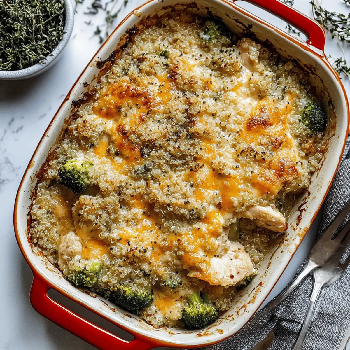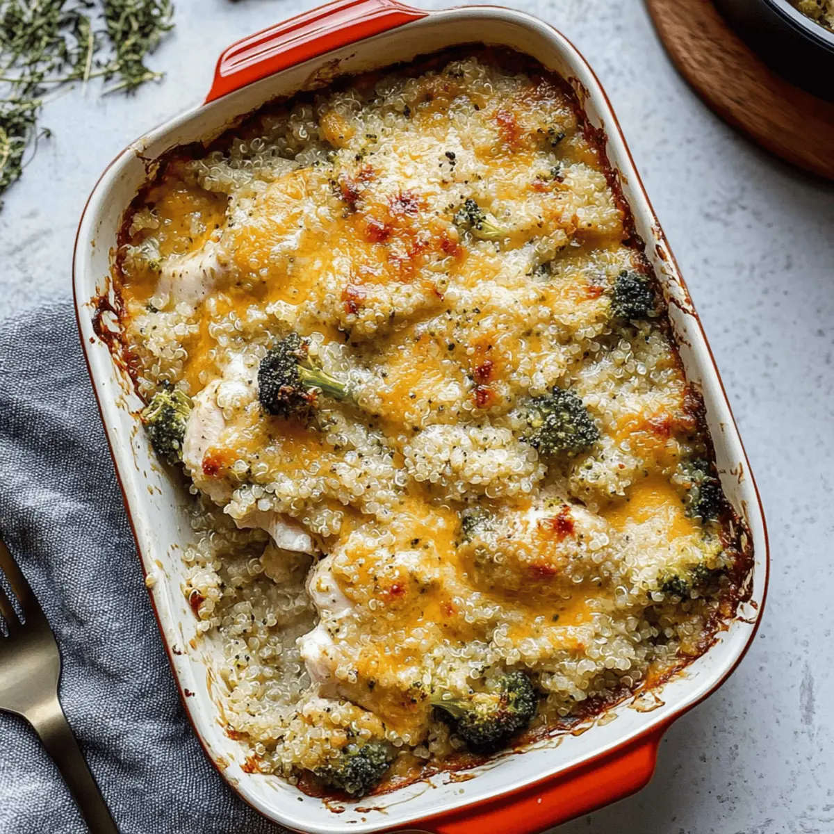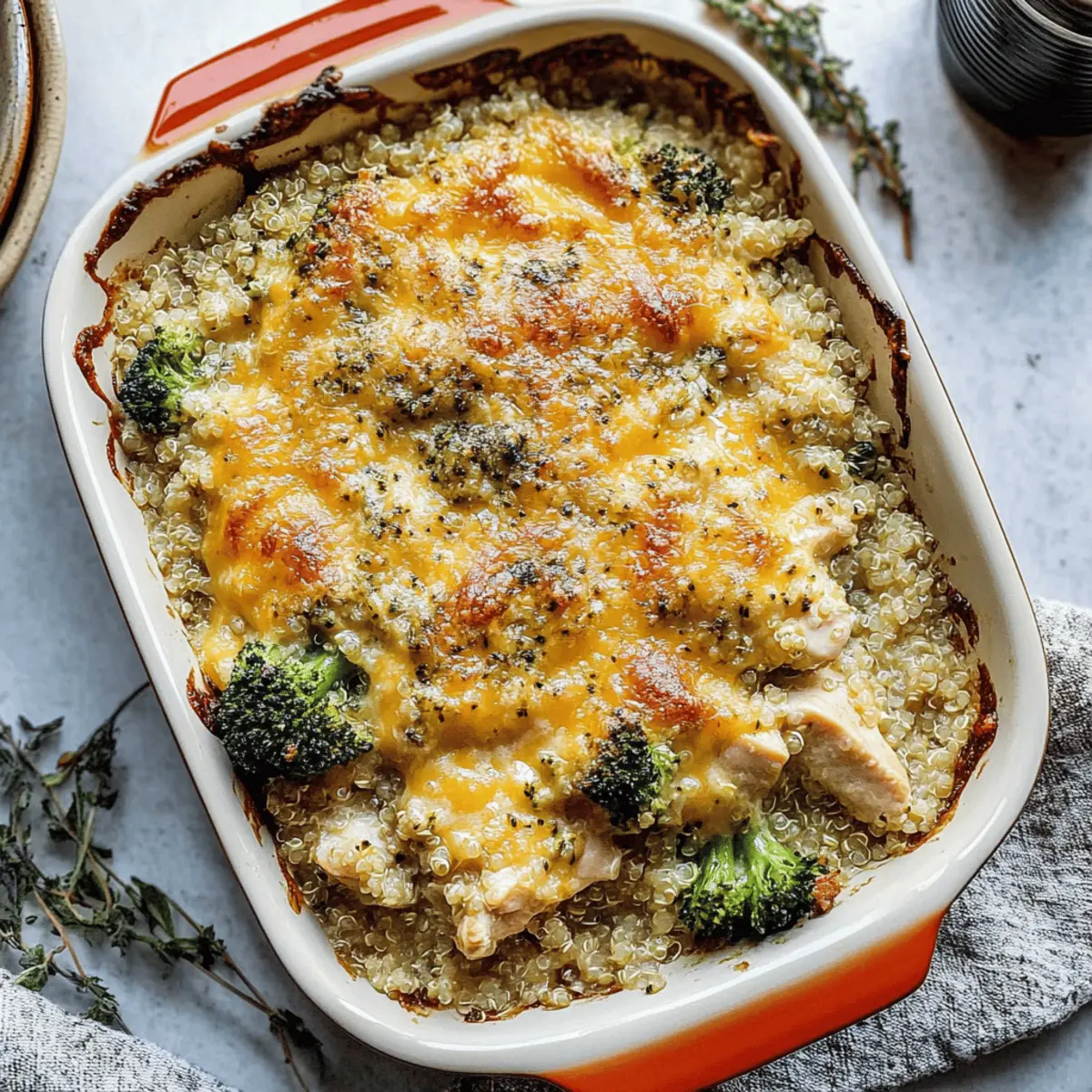 At the end of a long day, I often find myself craving something warm and comforting that I can whip up without a fuss. Enter my Cheesy Chicken Broccoli Quinoa Bake, a wholesome dish that transforms simple ingredients into a family favorite. Packed with tender chicken, crisp broccoli, and fluffy quinoa, this healthy casserole is not only delicious but also gluten-free. The best part? It’s a quick weeknight dinner that delivers creamy comfort food while keeping things nutritious. Whether you’re trying to impress guests or just satisfy hungry bellies at home, this dish will become your new go-to. Curious about how to make this easy delight? Let’s dive into the details! Why will you adore this recipe? Wholesome Ingredients: The Cheesy Chicken Broccoli Quinoa Bake uses nutritious elements that make it a guilt-free indulgence. Each bite combines protein-packed chicken, fiber-rich quinoa, and vibrant broccoli, ensuring your meal is both hearty and healthy. Quick Preparation: This dish shines on busy weeknights! With simple prep and minimal cooking time, you’ll have a satisfying meal ready in under an hour, allowing more time for family and relaxation. Crowd-Pleasing Comfort: Who can resist the appeal of cheesy goodness? This casserole is perfect for family dinners or gatherings, making it an instant hit with both kids and adults alike. Paired with a simple salad or crusty bread, it’s a complete meal! Versatile Options: Feel free to make it your own! Switch up proteins by substituting chicken with turkey or tofu, or try different veggies to suit your taste. With ideas like the Chicken Tortilla Wraps or Butter Chicken Comfort, the possibilities are endless! By crafting this dish, you’re embracing the joys of homemade cooking while creating a nutritious meal for yourself and your loved ones. Cheesy Chicken Broccoli Quinoa Bake Ingredients For the Casserole Butter – Adds richness and flavor; can substitute with olive oil for a dairy-free option. Extra-Virgin Olive Oil – Provides healthy fats; can replace with avocado oil for a different twist. Chopped Yellow Onion or Shallots – Enhances flavor base; use shallots for a milder taste or green onions for freshness. Garlic Cloves, minced – Offers aromatic flavor; substitute with garlic powder if you’re in a pinch. All-Purpose Flour – Thickens the sauce; for gluten-free, substitute with cornstarch or gluten-free flour. Lower-Sodium Chicken Broth – Adds moisture and depth; vegetable broth can be used for a vegetarian option. Whole Milk – Establishes creaminess; swap with almond milk or coconut milk for a dairy-free version. Poultry Seasoning – Infuses savory flavor; Italian seasoning or herbs de Provence can be a great alternative. Kosher Salt & Black Pepper – Season to taste; sea salt or freshly ground pepper also works wonderfully. Shredded Sharp Cheddar Cheese – Provides a creamy, cheesy element; mozzarella can be used for a milder taste or nutritional yeast as a dairy-free option. Dry Quinoa – Acts as the main base for the dish; pre-cooked quinoa or couscous can be an alternative. Boneless Skinless Chicken Breasts – Main protein source for tenderness; swap with turkey or firm tofu as desired. Broccoli Florets – Adds nutrition and texture; cauliflower or green beans are excellent substitutes. This Cheesy Chicken Broccoli Quinoa Bake blends wholesome ingredients into a nourishing meal that your family will love! Step‑by‑Step Instructions for Cheesy Chicken and Broccoli Quinoa Bake Step 1: Prepare Cheese Sauce In a medium saucepan over medium heat, melt 2 tablespoons of butter and 1 tablespoon of extra-virgin olive oil. Add 1 chopped onion and 2 minced garlic cloves, stirring until the onion is translucent (about 3-4 minutes). Gradually whisk in 3 tablespoons of all-purpose flour and cook for an additional minute to eliminate the raw taste. Slowly pour in 2 cups of lower-sodium chicken broth and 1 cup of whole milk, stirring continuously until thickened, about 5-7 minutes. Remove from heat and mix in seasonings and 2 cups of shredded sharp cheddar cheese until melted. Step 2: Combine Ingredients Grease a 4-quart baking dish with a little olive oil. Layer the base with 1 cup of dry quinoa, followed by 1 pound of diced boneless skinless chicken breasts and 2 cups of broccoli florets. Pour the prepared cheese sauce over the mixture, then gently stir to ensure the quinoa, chicken, and broccoli are thoroughly coated. This combination of ingredients sets the stage for your Cheesy Chicken and Broccoli Quinoa Bake. Step 3: Bake Preheat your oven to 375°F (190°C). Place the baking dish in the oven and bake uncovered for 45 minutes. Halfway through, gently stir the casserole to help incorporate the moisture. Keep an eye on it—once the chicken reaches an internal temperature of 165°F (73.8°C) and the quinoa is fluffy, you know it’s nearly done. If it’s not quite there, add an additional 5-10 minutes as necessary. Step 4: Finish with Cheese After the baking time, carefully remove the dish from the oven. Stir the casserole gently to combine, then sprinkle an extra cup of shredded cheese on top for an even cheesier finish. Return the dish to the oven and broil for 3-5 minutes, watching closely until the cheese is bubbly and golden brown. This final step of your Cheesy Chicken and Broccoli Quinoa Bake elevates it to pure comfort food perfection. Expert Tips for Cheesy Chicken Broccoli Quinoa Bake Rinse the Quinoa: Always rinse quinoa before cooking to eliminate its natural bitterness, ensuring your Cheesy Chicken and Broccoli Quinoa Bake has a delicious flavor. Mind the Broiler: Keep an eye on the casserole while broiling to avoid burning the cheese topping; it happens quickly, and nobody likes a charred taste! Check Chicken Temp: Use a meat thermometer to check that the chicken reaches an internal temperature of 165°F (73.8°C), ensuring it’s fully cooked for a safe and delicious meal. Adjust for Altitude: If yo