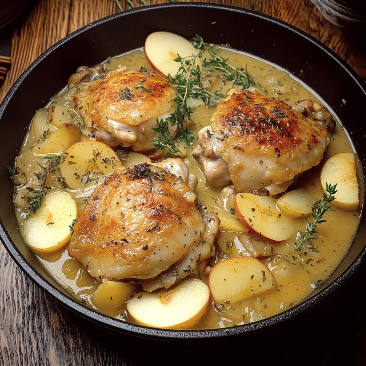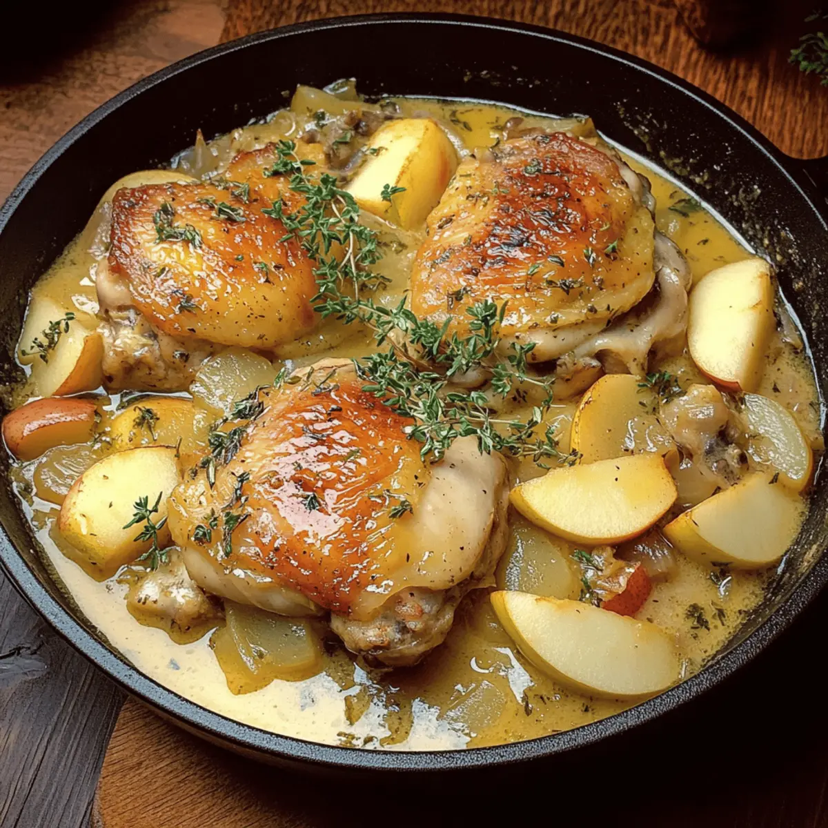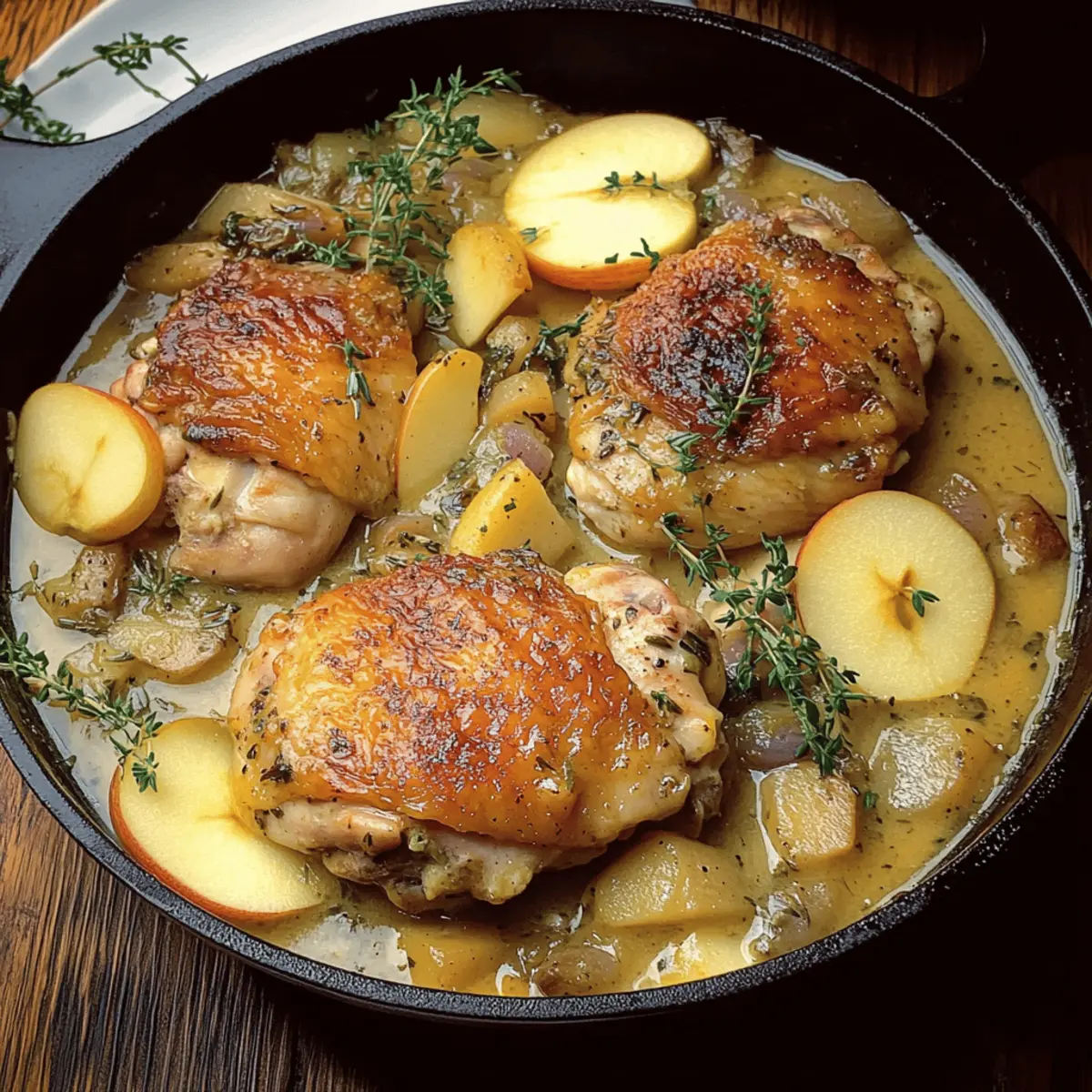 As I hovered over the stove, the scent of sautéing onions mingled with the sweet aroma of crisp apples, instantly transporting me to a cozy French bistro. That’s the magic of Chicken Normandy, or French Apple Cider Chicken, where tender chicken thighs soak up a luscious apple cider sauce, creating a comforting dish that feels like a warm hug. Not only is it a delightful option for weeknight dinners, but it can also impress at special gatherings with minimal effort. Plus, you can easily adapt this recipe for lighter meals or dietary preferences without sacrificing flavor. Are you ready to savor a taste of France right from your kitchen? Why choose Chicken Normandy tonight? Irresistible Comfort: This Chicken Normandy recipe wraps tender chicken thighs in a velvety apple cider sauce, delivering warmth and satisfaction in every bite. Versatile Options: Easily adapt it for bone-in or boneless chicken—perfect for whatever you have on hand. Want a lighter meal? Substitute with half-and-half or a plant-based cream. Quick & Easy: Enjoy a gourmet, French-inspired dish on your table in just 45 minutes, making it an ideal choice for busy weeknights. Crowd-Pleasing Delight: Whether you’re hosting a dinner party or a cozy family meal, this comforting classic is guaranteed to impress your guests. Serve it alongside crusty bread or mashed potatoes for a complete experience. Flavorful Depth: With the sweet notes of apples and the savory richness of the sauce, each bite is truly a taste of France you’ll want to revisit again and again! Chicken Normandy Ingredients For the Chicken • Chicken Thighs – Bone-in, skin-on thighs bring robust flavor and moisture; you can use boneless for faster cooking. For the Sauce • Onion – Adds depth to the sauce; shallots or green onions are great substitutes if you prefer. • Apple – Choose crisp varieties like Granny Smith or Fuji for sweet balance, steering clear of soft apples. • Apple Cider – Essential for bringing authentic flavor; dry French apple cider shines, but apple juice with white wine works too. • Garlic – Minced cloves elevate the overall flavor; don’t skip this key ingredient! • Fresh Thyme – Offers a fragrant herb note; dried thyme can be a substitute but adjust quantity. • Fresh Rosemary – Enhances the savory aspect; can use dried if fresh isn’t on hand. • Chicken Broth – Adds richness to the sauce; vegetable broth works well for a lighter option. • Dijon Mustard – Introduces a hint of tanginess that perfectly complements the sauce. • Heavy Cream – A luxurious touch for creaminess; use half-and-half or plant-based cream for a lighter or dairy-free variation. This Chicken Normandy recipe is not only comforting but also flexible, allowing for delicious variations without compromising flavor! Enjoy the delightful blend of sweet and savory that makes this dish a standout. Step‑by‑Step Instructions for Chicken Normandy or French Apple Cider Chicken Step 1: Season the Chicken Start by generously seasoning the chicken thighs with salt and pepper, ensuring an even coating on all sides to enhance flavor. This foundational step prepares the chicken for savory success, making each bite of your Chicken Normandy truly irresistible. Set aside while you prepare the skillet. Step 2: Brown the Chicken In a large skillet, heat two tablespoons of olive oil or butter over medium-high heat until shimmering but not smoking. Carefully place the chicken thighs skin-side down in the pan. Cook for 5–7 minutes or until the skin is beautifully golden and crispy. Flip the thighs over and cook for an additional 3–4 minutes. Remove the chicken from the pan and set aside. Step 3: Sauté the Aromatics Using the same skillet, add a sliced onion, stirring occasionally for about 5 minutes until it becomes translucent and slightly caramelized. This adds a depth of flavor to your Chicken Normandy. Next, add 2 minced garlic cloves and cook for another 30 seconds, allowing the fragrant aroma to fill your kitchen. Step 4: Add the Apples and Herbs Stir in 2 sliced apples, along with 1 teaspoon each of fresh thyme and rosemary. Cook the mixture for 2–3 minutes until the apples begin to soften and their sweetness becomes fragrant. This step brings a wonderful contrast of textures and flavors to your dish. Step 5: Deglaze the Pan Pour in 1 cup of apple cider and 1 cup of chicken broth, using a wooden spoon to scrape the bottom of the pan and deglaze it. This action lifts all the flavorful browned bits stuck to the pan, infusing your sauce with a robust flavor. Bring the mixture to a gentle simmer over medium heat. Step 6: Simmer the Chicken Return the browned chicken thighs to the skillet, making sure they are submerged in the liquid. Cover the skillet and let it simmer for 25–30 minutes, or until the chicken is fully cooked and tender, reaching an internal temperature of 165°F. The sauce will thicken slightly during this time. Step 7: Enrich the Sauce Once the chicken is cooked, remove it from the pan and set it aside again. Whisk in 2 tablespoons of Dijon mustard and 1 cup of heavy cream into the remaining sauce, stirring until well combined. Simmer uncovered over low heat for about 5–7 minutes, allowing the sauce to thicken into a luscious, creamy consistency. Step 8: Final Touches Return the chicken thighs to the skillet briefly, ensuring they are heated through. Garnish your savory Chicken Normandy with fresh thyme and parsley for a pop of color and brightness. This final step elevates both the presentation and flavor, readying your dish for serving. Chicken Normandy Variations & Substitutions Customize this comforting dish to suit your taste and dietary needs, creating a delightful experience in every bite! Boneless Chicken: Use boneless thighs for quicker cooking. They will reduce your cook time, making it a speedy weeknight meal. Dairy-Free Cream: Swap out heavy cream for a plant-based alternative like coconut cream or cashew 