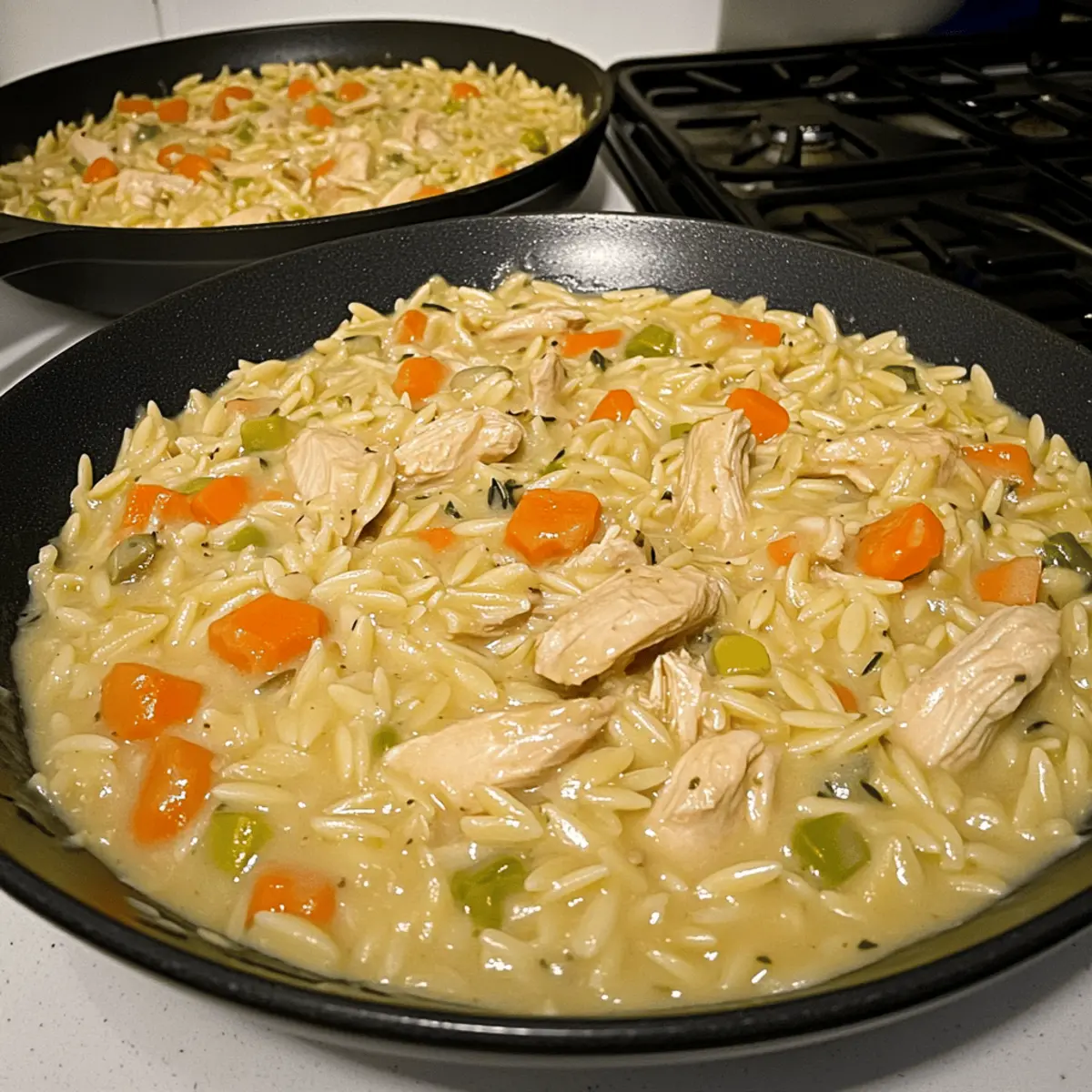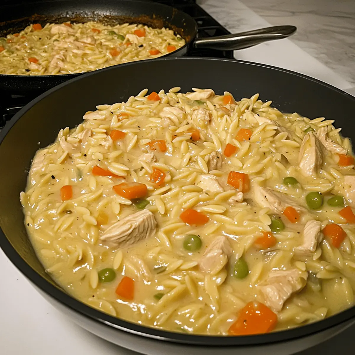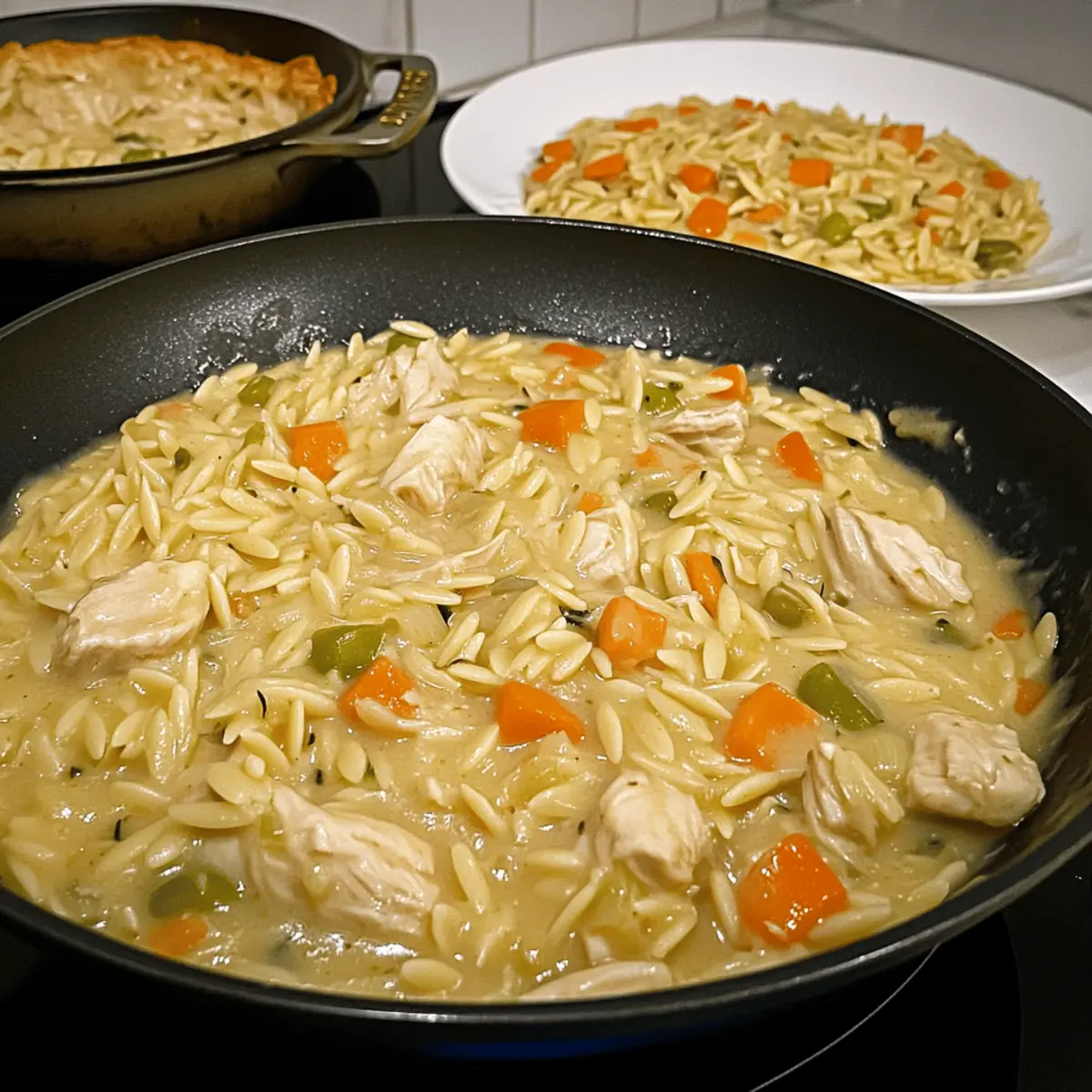 The aroma of a savory stew filled with tender chicken and fresh vegetables instantly transports me to cozy family dinners. Today, I’m excited to share my Creamy Chicken Pot Pie Orzo, a delightful twist on the classic comfort food we all know and love. This recipe marries the heartiness of orzo pasta with a creamy, rich sauce that envelops succulent pieces of chicken—making it a perfect family-friendly meal. What’s even better? It’s incredibly quick to prepare, perfect for those busy weeknights when time is of the essence. Plus, it’s an easy one-pot dish that encourages you to get creative with leftovers or whatever veggies you have on hand. Ready to dive into a bowl of warm nostalgia? Let’s cook! Why is Chicken Pot Pie Orzo So Special? Comforting and familiar, this dish combines the beloved flavors of chicken pot pie with the chewiness of orzo for a truly satisfying meal. Quick preparation makes it a go-to for busy families, while its versatility allows you to customize with whatever vegetables you have on hand. Crowd-pleasing and rich in flavor, this dish is sure to become a family favorite. Serve it with a light green salad or some garlic bread for a complete meal that feels like a warm hug. For another hearty option, check out my Fiery Chicken Ramen or Butter Chicken Comfort. Chicken Pot Pie Orzo Ingredients For the Base • Chicken Breasts – Provides lean protein; rotisserie chicken is a fantastic time-saving alternative. • Orzo Pasta – Forms the hearty base; can also use small pasta varieties like ditalini. For Flavoring • Onion Powder – Adds depth and savory flavor to the dish. • Garlic Powder – Enhances the flavor profile with aromatic notes. • Paprika – Contributes a hint of smokiness; swap it with cayenne for an extra kick. For Vegetables • Yellow Onion – Provides a foundational flavor when sautéed. • Celery Stalks – Adds crunch and freshness. • Carrots – Brings sweetness and vibrant color to the dish. For the Creamy Sauce • Butter – Enriches the sauce and aids in sautéing. • Olive Oil – Great for cooking the chicken and veggies; feel free to use any neutral oil. • Chicken Broth – Serves as the liquid base for the sauce; low-sodium versions can enhance healthiness. • Heavy Whipping Cream – Delivers creaminess and richness; half-and-half can be used, though it will result in a thinner sauce. • Chicken Bouillon Powder – Intensifies flavor; homemade stock can be a great substitute (just remember to adjust salt). • All-Purpose Flour – Thickens the sauce; gluten-free flour is an option for those with dietary restrictions. This Chicken Pot Pie Orzo is a delightful twist on a classic that you’ll want to make again and again! Step‑by‑Step Instructions for Chicken Pot Pie Orzo Step 1: Cook the Orzo Begin by bringing a large pot of salted water to a boil over medium-high heat. Add the orzo pasta and cook according to package instructions until al dente, typically about 9-11 minutes. Once cooked, drain it in a colander and set aside, allowing the orzo to cool slightly while you prepare the rest of the ingredients for your Chicken Pot Pie Orzo. Step 2: Prepare the Chicken Season your chicken breasts with onion powder, garlic powder, paprika, salt, and black pepper to enhance their flavor. In a large skillet over medium heat, add a drizzle of olive oil and cook the seasoned chicken for approximately 6-7 minutes on each side, or until it reaches an internal temperature of 165°F. Once fully cooked, remove the chicken from the skillet, dice it into bite-sized pieces, and set aside. Step 3: Sauté the Vegetables Using the same skillet, melt 2 tablespoons of butter with another drizzle of olive oil over medium-high heat. Add diced yellow onion, carrots, and celery to the skillet, sautéing them for 4-5 minutes until they soften and become fragrant. This step is crucial for building the flavor base of your Chicken Pot Pie Orzo, so stir frequently to prevent any burning. Step 4: Create the Roux Lower the heat to medium and sprinkle ¼ cup of all-purpose flour over the sautéed vegetables in the skillet. Whisk constantly for about 2-3 minutes to form a roux, which will help thicken the sauce. The mixture should turn a light golden color and smell toasty, indicating it’s ready for the next step in your delicious Chicken Pot Pie Orzo. Step 5: Make the Creamy Sauce Gradually whisk in 4 cups of chicken broth and 1 cup of heavy whipping cream into the roux, stirring continuously to avoid lumps. Keep the mixture on medium heat and cook until the sauce thickens, which should take about 5-7 minutes. You’re aiming for a creamy consistency that will beautifully coat all the ingredients in your Chicken Pot Pie Orzo. Step 6: Combine Ingredients Now, add the diced chicken back into the sauce and let everything simmer for an additional 2-3 minutes to meld the flavors together. Stir in the cooked orzo, ensuring it’s well coated in the creamy sauce. This step is essential for allowing the orzo to absorb all that comforting flavor from the Chicken Pot Pie Orzo. Step 7: Adjust and Serve Finally, taste your dish for seasoning, adjusting with salt or pepper as needed. Once you’re satisfied with the flavor and the sauce is thickened to your liking, remove the skillet from the heat. Serve your warm Chicken Pot Pie Orzo immediately in bowls, and get ready to enjoy this cozy, comforting meal with family or friends! Expert Tips for Chicken Pot Pie Orzo • Perfectly Al Dente: Ensure the orzo is cooked just to al dente to maintain its texture; overcooking can make it mushy. • Flavor Depth: Sauté vegetables until they’re caramelized to unlock their full flavor. Remember to season the Chicken Pot Pie Orzo gradually as you go! • Right Consistency: If your sauce becomes too thick, simply add more chicken broth or cream. This helps maintain the creamy texture of your Chicken Pot Pie Orzo. • Reheating Tip: For leftovers, add a splash of chi