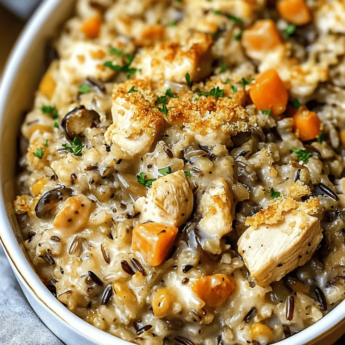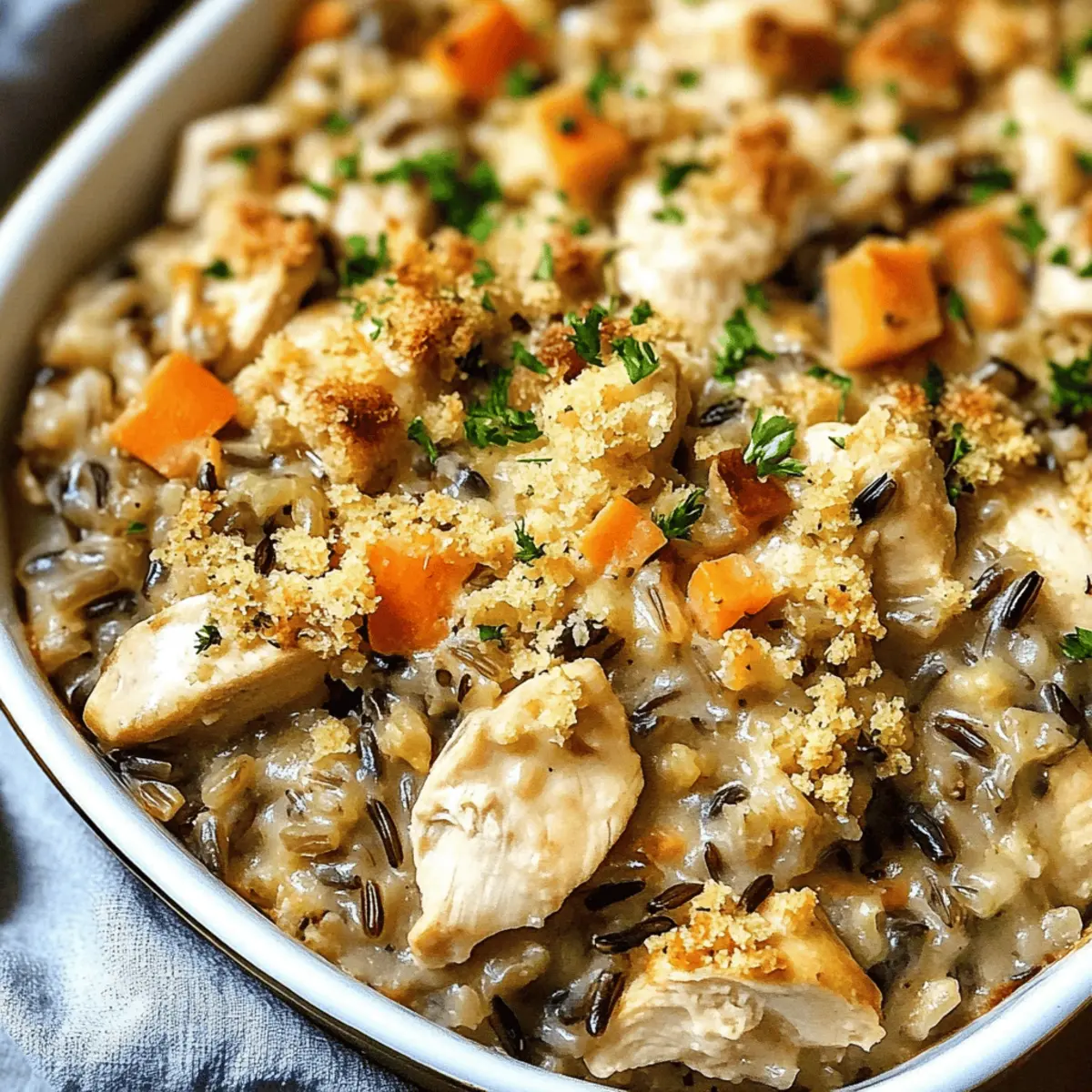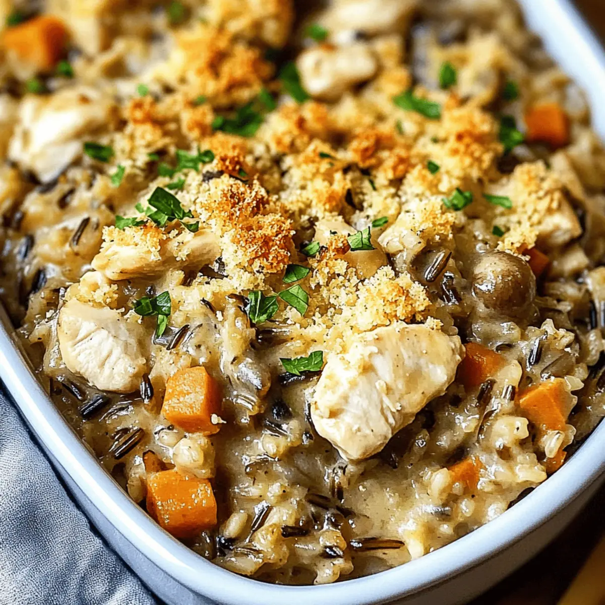 The aroma of cozy family dinners fills the air as I pull this Chicken Wild Rice Casserole from the oven. Each layer of tender chicken mingles with earthy mushrooms and nutty wild rice, all bathed in a creamy, cheese-laden sauce. Topped with golden, crispy panko breadcrumbs, this dish not only delights the palate but also brings a sense of warmth and togetherness to the table. It’s my go-to comfort food that’s made from scratch, packing nutrition without any preservatives. With around 350 calories per serving and 25 grams of protein, it’s a satisfying meal for everyone, even the picky eaters! Plus, it can easily adapt to seasonal veggies or individual ramekins, making it versatile for any occasion. Are you ready to elevate your dinner game and dish up some heartwarming goodness? Why Choose Chicken Wild Rice Casserole? Comforting and Hearty: This Chicken Wild Rice Casserole is the epitome of cozy family meals, with layers of flavor that’ll have everyone asking for seconds. Nutritious Goodness: Packed with 25 grams of protein per serving, it’s a wholesome choice, free from preservatives. Versatile and Customizable: Feel free to switch up the veggies with seasonal favorites or personalize servings in ramekins—perfect for entertaining! Easy to Prepare: From prep to table, it’s a straightforward recipe that can be assembled a day ahead! Irresistible Crunch: With a golden panko topping, each bite offers a satisfying texture contrast that keeps you coming back for more! Elevate your dinner experience with this crowd-pleasing dish—whether you pair it with a simple side salad or opt for a piece of garlic bread, your taste buds will thank you! Chicken Wild Rice Casserole Ingredients For the Casserole • Wild Rice Blend – Provides a nutty flavor and chewy texture; cook according to package directions for the best results. • Chicken Breasts or Thighs – Main protein source, chopped into bite-sized pieces for even cooking and tender bites. • Salt, Pepper, Paprika – Simple seasonings that enhance flavor; adjust to your taste preference for a personalized touch. • Olive Oil – Ideal for searing chicken; substitute with avocado oil if preferred for a lighter option. • Unsalted Butter – Adds richness to the sauce; can easily be replaced with margarine for a dairy-free delight. • Yellow Onion, Celery, Carrots (Mirepoix) – Forms a flavor base; feel free to mix in other veggies like bell peppers for variety. • Garlic – Offers aromatic flavor; fresh is best, but garlic powder works perfectly in a pinch. • Baby Bella/Creamy Mushrooms – Adds umami depth; substitute with other mushrooms like button or shiitake if desired. • Low Sodium Chicken Broth – A flavorful liquid base for sauce; vegetable broth can be used for a vegetarian-friendly option. • Cornstarch – Serves as a thickening agent; if gluten isn’t a concern, flour can work as an alternative. • Milk – Provides creaminess; any plant-based milk will also add a lovely texture to the casserole. • Chicken Bouillon, Dijon Mustard, Worcestershire Sauce – Enhances depth of flavor; feel free to use store-bought or homemade. • Dried Herbs (Parsley, Basil, Thyme) – Imparts further flavor; fresh herbs can elevate the dish even more. • Sharp Cheddar Cheese & Parmesan – For creaminess and rich flavor; can be swapped for non-dairy options if needed. • Panko Breadcrumbs – Adds a crispy topping contrast; can replace with regular breadcrumbs or crushed crackers for crunch. • Additional Butter & Olive Oil – Used for toasting breadcrumbs; these are optional but add a delicious layer of flavor. The Chicken Wild Rice Casserole is truly a comfort dish that invites warmth and togetherness to the table. Get ready to create a meal that everyone will love! Step‑by‑Step Instructions for Chicken Wild Rice Casserole Step 1: Preheat the Oven Begin by preheating your oven to 350°F (175°C) and preparing a 9×13 inch baking dish by spraying it lightly with cooking spray. This ensures that your Chicken Wild Rice Casserole won’t stick, allowing for easy serving later. While the oven heats up, gather your ingredients to streamline the cooking process. Step 2: Sear the Chicken Season your chopped chicken breasts or thighs generously with salt, pepper, and paprika. In a large skillet, heat 1 tablespoon of olive oil over medium-high heat. Sear the chicken pieces for about 5–7 minutes until they’re just opaque, then remove them from the skillet and set them aside. This initial step adds flavor and texture to your casserole. Step 3: Sauté the Mirepoix In the same skillet, add a bit more oil if needed and toss in the chopped onion, celery, and carrots, creating a delightful mirepoix. Sauté for about 5 minutes until the vegetables are tender and aromatic. Then, add minced garlic and cook for another minute, giving your Chicken Wild Rice Casserole a rich depth of flavor as you return the seared chicken back to the pan. Step 4: Cook the Mushrooms Next, add sliced baby bella or creamy mushrooms to the skillet. Sauté them over medium heat for about 5-6 minutes until they’re golden and nicely caramelized. This process enhances their umami flavor, which will beautifully complement the other ingredients in your Chicken Wild Rice Casserole. Once cooked, transfer everything to a large mixing bowl. Step 5: Prepare the Cheese Sauce In the same skillet, whisk together low-sodium chicken broth and cornstarch until smooth. Melt 2 tablespoons of butter over medium heat and whisk in an equal amount of flour, cooking for around 2 minutes. Gradually add your broth mixture and milk, stirring continuously until it thickens, about 3–5 minutes. Stir in the shredded sharp cheddar and Parmesan cheese until it’s perfectly melted, creating a creamy sauce for your casserole. Step 6: Combine Ingredients In the large bowl with your chicken and sautéed vegetables, now fold in the cooked wild rice and the cheese sauce you just pr