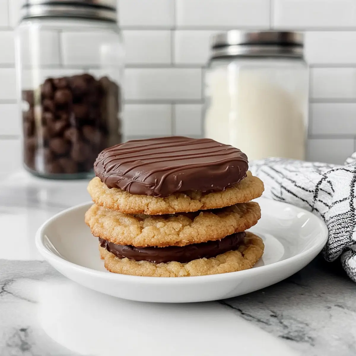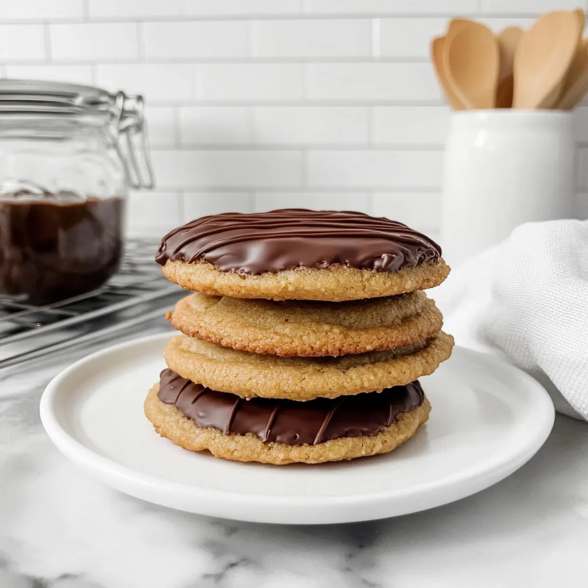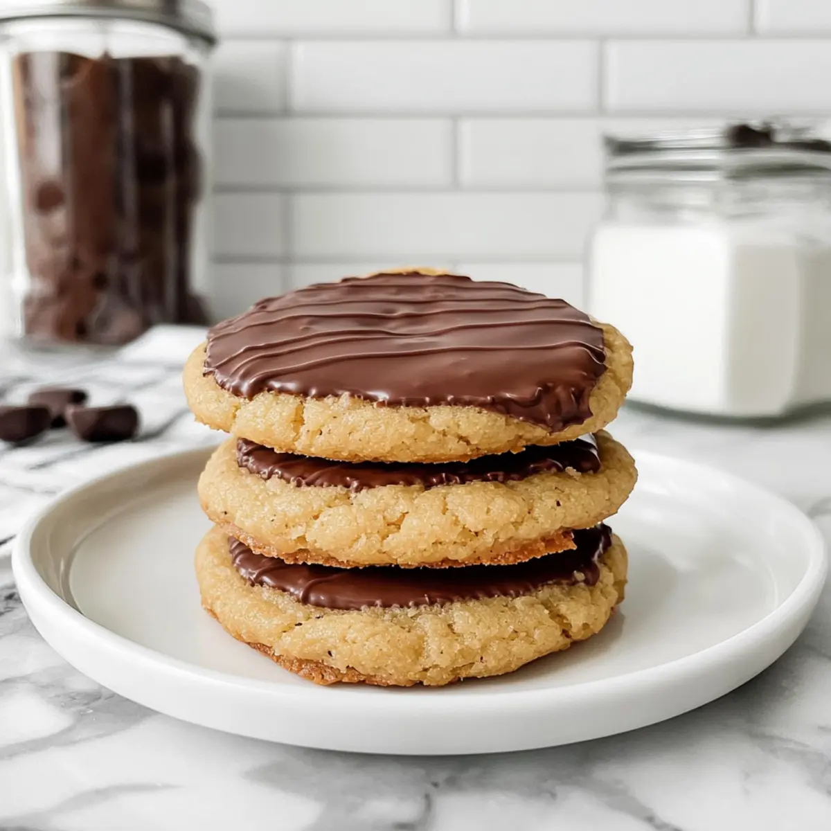 As I stood in my kitchen, the rich aroma of melting chocolate enveloped me—an invitation I couldn’t resist. This moment sparked the creation of my Chocolate Dipped Chipless Cookies, a delightful twist on the classic cookie that’s sure to lighten your mood. With just a few simple steps, you can achieve a soft and chewy cookie base coated in luxurious chocolate, making it a must-try for both new bakers and seasoned pros alike. Not only are these cookies quick to prepare, but they also promise to please every sweet tooth who dares to indulge. What could be better than that? Dive in and discover how to elevate your cookie game to a whole new level—are you ready for this delicious adventure? Why Make Chocolate Dipped Chipless Cookies? Irresistible flavor: Each cookie wraps a chewy, buttery base in a silky chocolate coat that perfectly complements its soft texture. Easy preparation: This straightforward recipe is ideal for both beginner bakers and seasoned chefs, allowing anyone to whip up delicious treats without hassle. Versatile options: Feel free to mix in nut butters or use dark chocolate for a twist; creativity is encouraged! Perfect for sharing: Bring these delightful cookies to gatherings or serve them warm with coffee for a cozy treat. With their crowd-pleasing appeal, they’re sure to become a family favorite—just like my Decadent Caramel Swirl Brownies! Chocolate Dipped Chipless Cookies Ingredients Elevate your baking skills with these essential ingredients! For the Cookie Base Salted Butter – Adds moisture and richness; unsalted works well if you prefer more control over saltiness. Light Brown Sugar – Provides sweetness and helps create a chewy texture for those dreamy cookies. Granulated Sugar – Balances sweetness while contributing to the overall cookie structure. Vanilla Extract – Enhances the flavor; using pure vanilla deepens the taste experience. Eggs – Essential for binding and texture; bring them to room temperature for an even mix. All-Purpose Flour – The core structure component; can be swapped for gluten-free flour if required. Corn Starch – Creates that desired soft, chewy texture—arrowroot is a great alternative. Baking Soda – Essential for leavening; helps your cookies rise beautifully. Kosher Salt – Balances the sweetness and elevates the overall flavor. For the Chocolate Coating Milk Chocolate Melting Wafers – Provides a smooth, sweet coating; consider semi-sweet or dark chocolate for a different vibe. Discover the joy of making Chocolate Dipped Chipless Cookies and surprise your loved ones with these delectable treats! Step‑by‑Step Instructions for Chocolate Dipped Chipless Cookies Step 1: Mix Wet Ingredients In a stand mixer, combine ½ cup of melted salted butter, ¾ cup of light brown sugar, ¼ cup of granulated sugar, and 1 teaspoon of vanilla extract. Beat on medium speed until well mixed and creamy, roughly 2-3 minutes. Then, add in 1 large egg at a time, mixing thoroughly after each addition to achieve a smooth, unified batter. Step 2: Combine Dry Ingredients In a separate bowl, whisk together 1 ½ cups of all-purpose flour, 2 tablespoons of cornstarch, 1 teaspoon of baking soda, and ½ teaspoon of kosher salt. Gradually add the dry mixture to the wet ingredients in the stand mixer. Mix on low speed until just combined, ensuring no dry patches remain, which will ensure your Chocolate Dipped Chipless Cookies possess a perfect texture. Step 3: Chill the Dough Scoop 24 equal-sized balls of cookie dough using a cookie dough scoop or a tablespoon. Place them on a parchment-lined plate or tray, ensuring they aren’t touching. Cover with plastic wrap and chill in the refrigerator for at least 45 minutes, or up to 24 hours for enhanced flavor and texture, allowing the dough to firm up nicely. Step 4: Preheat and Prepare the Oven While the dough chills, preheat your oven to 350°F (175°C). Once ready, line a baking sheet with parchment paper. Remove the dough from the refrigerator and place the chilled dough balls on the prepared baking sheet, spacing them 2 inches apart to allow room for spreading during baking. Step 5: Bake Cookies Bake the cookies in the preheated oven for 12 minutes, or until the edges are just set and slightly golden. Keep an eye on them to prevent overbaking, as they’ll continue to firm up outside the oven. If some cookies look a bit misshapen, gently reshape them with a round cookie cutter immediately after removing from the oven. Step 6: Cool the Cookies Let the cookies cool on the baking sheet for 5 minutes. This step is crucial as it helps maintain a soft texture. Afterward, transfer the cookies to a wire rack to cool completely. This will enhance their chewy center and prepare them for the exciting chocolate dip ahead. Step 7: Melt the Chocolate In a microwave-safe bowl, melt 1 cup of milk chocolate melting wafers according to package instructions, stirring every 30 seconds to prevent overheating. The chocolate should be smooth and lump-free; this will coat your cookies beautifully. Step 8: Dip the Cookies Once melted, dip the cooled cookies halfway into the chocolate, allowing any excess to drip off. Place each dipped cookie on a wax-lined baking sheet to set. Repeat until all cookies are coated, ensuring each one receives a lovely, luscious layer that enhances the overall experience of these Chocolate Dipped Chipless Cookies. Make Ahead Options These Chocolate Dipped Chipless Cookies are perfect for busy home cooks looking to save time during the week! You can prepare the cookie dough up to 24 hours in advance, covering scooped balls tightly and refrigerating them to enhance flavor and texture. For even longer storage, freeze the dough balls for up to 3 months; simply bake them straight from the freezer, adding a couple of extra minutes to the baking time. Once baked, the cookies can be stored in an airtight container for up to a week, maintaining their delightful softness. When ready to serve, di