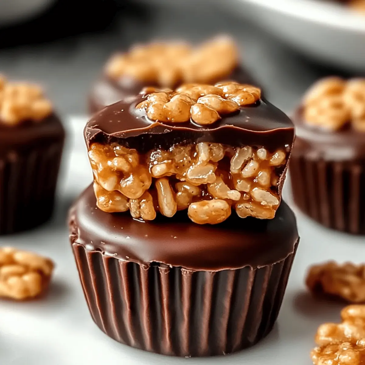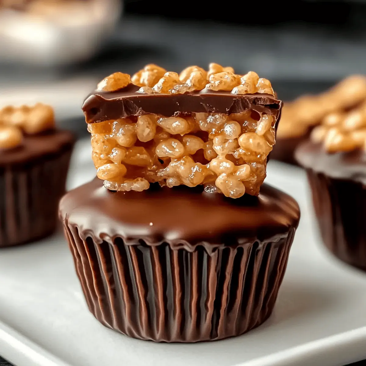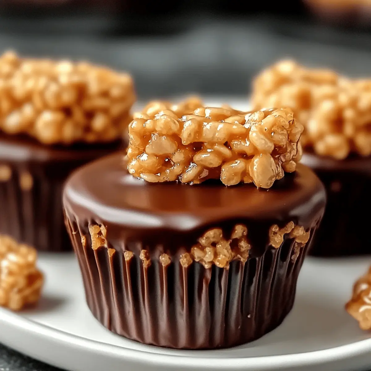 As I sat on the porch enjoying a warm afternoon, the thought of sweet, crunchy treats danced through my mind. That’s when I recalled my beloved Chocolate Peanut Butter Rice Krispie Cups, a simple yet irresistible no-bake delight that never fails to satisfy my cravings. With just a handful of ingredients, these treats come together in a flash, making them perfect for unexpected guests or a quick family dessert. The combination of creamy peanut butter, rich chocolate, and the delightful crunch of Rice Krispies creates a satisfying journey for your taste buds. Plus, they’re gluten-free if you opt for the right ingredients! Are you ready to whip up a batch of these easy-to-make cups that are sure to become a favorite in your home? Let’s dive in! Why Are These Rice Krispie Cups Irresistible? No-Bake Convenience: These Chocolate Peanut Butter Rice Krispie Cups are incredibly easy to whip up, needing no oven, making them perfect for busy days or late-night cravings. Crowd-Pleasing Treat: Whether at a family gathering or a potluck, these delightful cups are always the star of the show. Their delightful combination of flavors appeals to kids and adults alike. Customizable Goodness: Feel free to play with variations—try adding crunchy nuts or using dark chocolate for a richer taste—you can easily make them your own! Quick Preparation: With just a few simple steps, these treats come together in a flash, freeing up your time to enjoy the company of friends or family. Deliciously Satisfying: The harmonious mix of creamy peanut butter, smooth chocolate, and the satisfying crunch of Rice Krispies creates a flavor explosion that is hard to resist. You’ll find yourself coming back for seconds! Chocolate Peanut Butter Rice Krispie Cups Ingredients For the Cups • Rice Krispies Cereal – Adds crunch and structure; any crispy rice cereal can be used as a substitute. • Creamy Peanut Butter – Provides rich, nutty flavor and creaminess; swap with crunchy peanut butter for added texture, or sunbutter for a nut-free alternative. • Unsalted Butter – Helps bind the ingredients and adds richness; coconut oil can replace it for a dairy-free version. • Mini Marshmallows – Offer sweetness and a chewy texture, binding the mixture together; consider using marshmallow fluff or vegan marshmallows for a variation. For the Chocolate Topping • Chocolate Chips – Creates a sweet topping that firms up the cups; dark chocolate is a great substitute for a richer flavor or for allergies. • Vanilla Extract (optional) – Enhances flavor depth; can be omitted for simplicity or allergy reasons. • Sea Salt (optional) – Balances sweetness and enhances flavors; use regular salt if sea salt isn’t available. These Chocolate Peanut Butter Rice Krispie Cups are a delightful treat that everyone will adore! Step‑by‑Step Instructions for Chocolate Peanut Butter Rice Krispie Cups Step 1: Melt the Base In a medium saucepan, combine the unsalted butter and mini marshmallows over low heat. Stir continuously for about 5-7 minutes until the mixture is completely melted and smooth, ensuring it doesn’t burn. This melted blend forms the delicious base for your Chocolate Peanut Butter Rice Krispie Cups, providing a sweet and gooey foundation. Step 2: Add Peanut Butter Once the butter and marshmallow mixture is smooth, remove the saucepan from heat. Stir in the creamy peanut butter and optional vanilla extract, mixing until combined and creamy. The peanut butter adds richness and depth of flavor, making your chocolate peanut butter rice krispie cups even more indulgent and irresistible. Step 3: Mix with Cereal Pour the melted mixture into a large mixing bowl and add the Rice Krispies cereal. Using a spatula, gently fold the cereal into the mixture for 2-3 minutes until each piece is evenly coated. The combination should be sticky yet crunchy, creating a delightful texture that will hold together in the cups. Step 4: Shape the Cups Prepare a muffin tin by lining each cup with paper liners. Spoon the Rice Krispie mixture into each liner, filling them halfway. Press down gently to create a flat surface. This step is crucial for forming your Chocolate Peanut Butter Rice Krispie Cups, so avoid packing them too tightly to retain their airy crunch. Step 5: Add Chocolate Layer In a microwave-safe bowl, melt the chocolate chips in 30-second intervals, stirring in between until fully melted and smooth—this should take about 1-2 minutes. Take a spoonful of the melted chocolate and drizzle it over each cup, spreading it evenly without overfilling, to create a delicious chocolate topping that complements the peanut butter beautifully. Step 6: Set & Serve Let the cups cool at room temperature for about 20 minutes. For quicker results, you can place them in the refrigerator for about 10 minutes until firm. Once set, carefully remove the paper liners, revealing your deliciously crafted Chocolate Peanut Butter Rice Krispie Cups. They’re now ready to be enjoyed—go ahead and dig in! What to Serve with Chocolate Peanut Butter Rice Krispie Cups These Chocolate Peanut Butter Rice Krispie Cups are a delightful treat that can be enjoyed on their own, but pairing them with complementary flavors and textures can elevate your dessert experience. Fresh Berries: Juicy strawberries, raspberries, or blueberries provide a tart contrast that brightens the sweetness of the cups. Creamy Ice Cream: A scoop of vanilla or chocolate ice cream adds a luxurious touch, balancing the crunch with creaminess. Coconut Flakes: Toasted coconut brings a nutty flavor and chewy texture, enhancing the tropical vibes of the peanut butter. Chocolate Ganache Topping: Drizzling extra ganache over the cups can intensify the chocolatey goodness and create an irresistible glossy finish. Nutty Trail Mix: A sprinkle of trail mix on the side offers a crunchy element that complements the soft texture of the Rice Krispie Cups. Coffee or Latte: The rich flavors of coff