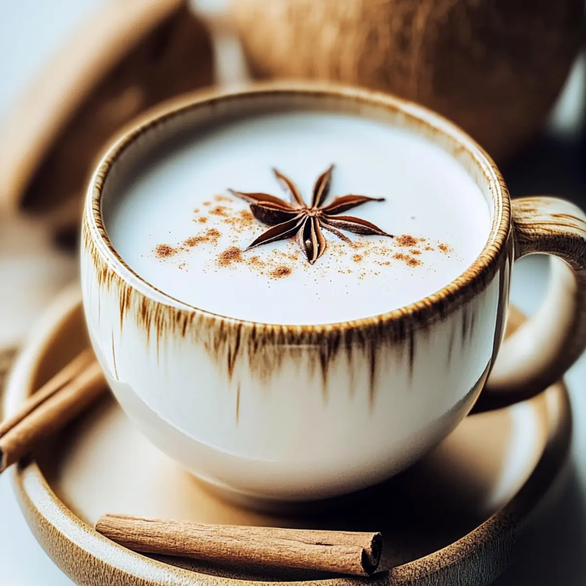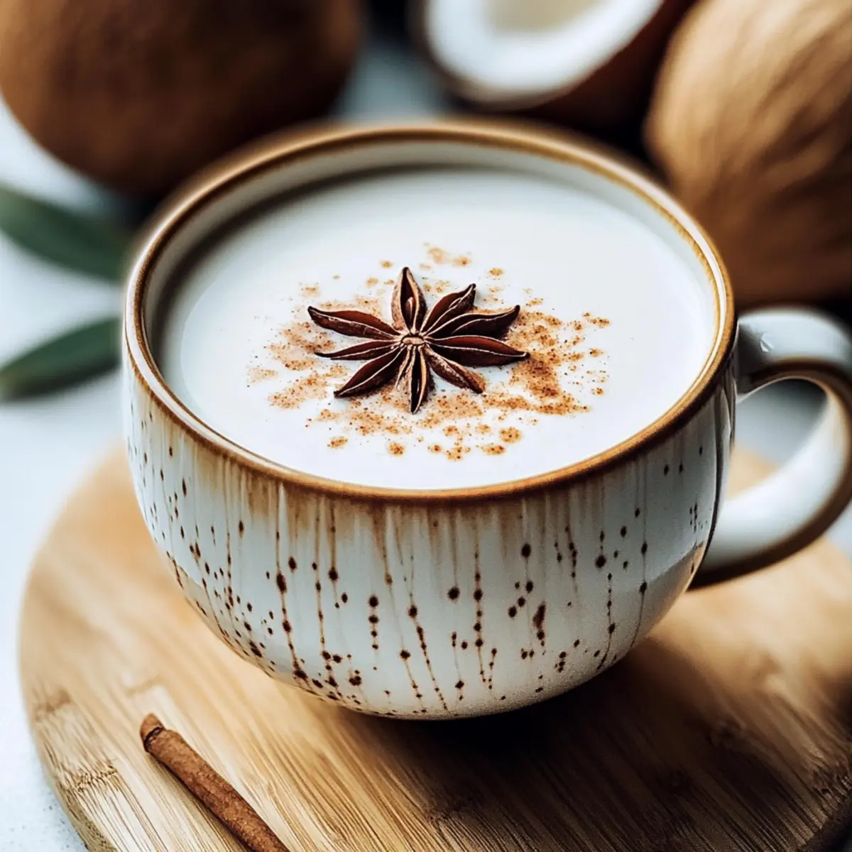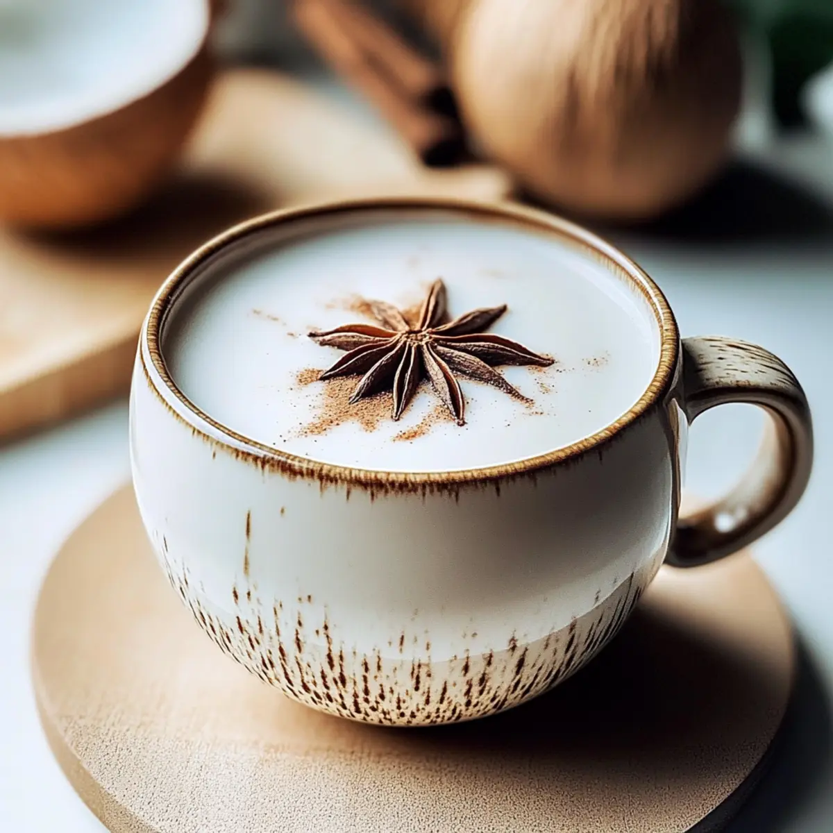 Finally, take a moment to elevate your Coconut Chai with a pinch of ground cinnamon or a star anise for garnish if desired. This final touch not only adds an enticing aroma but also enhances the visual appeal. Your Coconut Chai is now perfectly crafted; serve it hot right away or chill it for a refreshing iced version!