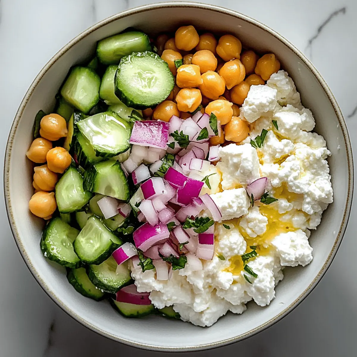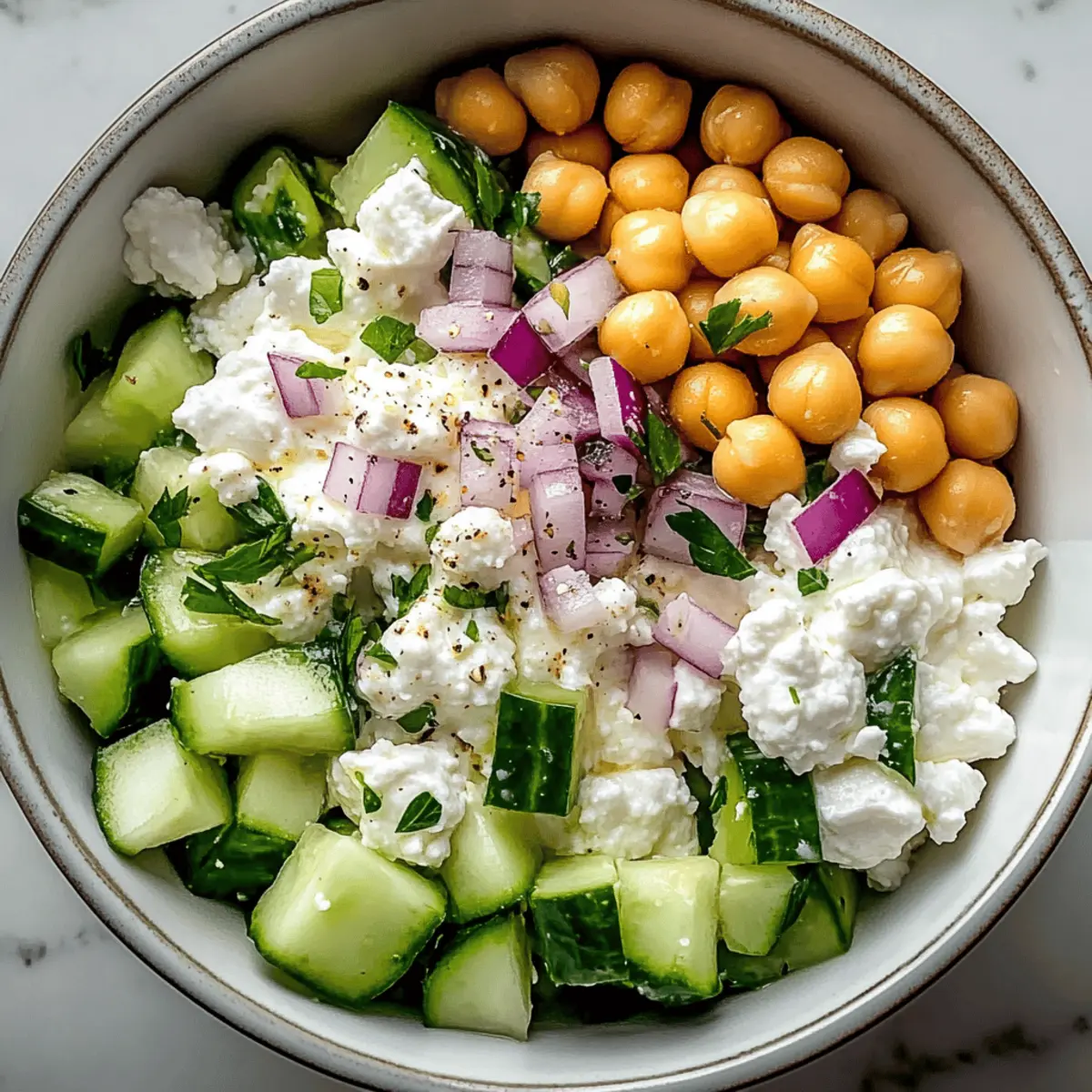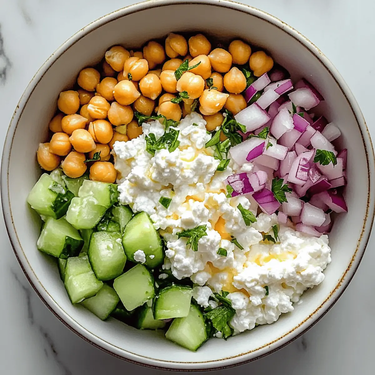 Stepping into my kitchen, I was struck by a burst of color from fresh vegetables lounging on the counter, just waiting to be transformed into something delicious. That’s when I decided to whip up a Cottage Cheese and Chickpea Salad, a vibrant dish that’s not only quick to prepare but also a protein-packed powerhouse. Say goodbye to lifeless salads that leave you unsatisfied—this delightful creation is bursting with creamy cottage cheese, crunchy cucumbers, and nutty chickpeas, ensuring each mouthful is a satisfying experience. Plus, it’s incredibly versatile, inviting you to play with different herbs and dressings for your own signature twist. Are you ready to bring some excitement back to your lunch game? Let’s get started! Why is this salad so satisfying? Boldly delicious, this Cottage Cheese and Chickpea Salad brings excitement to your plate with its mix of creamy, crunchy, and tangy elements. Packed with protein, it transforms a mundane meal into a nutritious powerhouse perfect for lunch or a light dinner. Customization is key—feel free to swap in your favorite veggies or herbs! Quick and easy, this recipe comes together in minutes, making it an ideal choice for busy days. Crowd-pleaser appeal means it’s great for gatherings, too; serve it alongside Corn Pasta Salad or as a refreshing side to your favorite grilled dishes! Cottage Cheese and Chickpea Salad Ingredients • To create this invigorating Cottage Cheese and Chickpea Salad, gather these fresh ingredients that will enhance both flavor and nutrition! For the Base Cottage Cheese – Provides creaminess and a boost of protein; opt for low-fat or full-fat based on your preference. Chickpeas – Offers texture and plant-based protein; use canned for convenience or cooked for a homemade touch. For the Veggies Cucumbers – Adds crunch and freshness; substitute with bell peppers for a different texture. Red Onion – Contributes a tangy flavor; feel free to experiment with yellow or green onions as an alternative. For the Dressing Vinaigrette – A simple dressing to unite flavors; made with olive oil, vinegar (apple cider or red wine), and seasoning—customize with your favorite herbs for added flair. Step‑by‑Step Instructions for Cottage Cheese and Chickpea Salad Step 1: Prepare Ingredients Begin by gathering all your fresh ingredients for the Cottage Cheese and Chickpea Salad. Rinse and drain one can of chickpeas under cold water. Chop one cucumber into bite-sized pieces, and finely dice half of a red onion. Lay everything out on a cutting board for easy access, and make sure your measuring cups and bowls are ready. Step 2: Combine Main Ingredients In a large mixing bowl, combine the prepared chickpeas, chopped cucumber, and diced red onion. Next, add one cup of creamy cottage cheese to the bowl, ensuring you have a wonderful mix of textures. Use a spatula to gently fold the ingredients together, celebrating that delightful range of colors and flavors as they come together. Step 3: Mix Dressing In a separate small bowl, whisk together three tablespoons of olive oil, two tablespoons of apple cider vinegar, and a pinch of salt and pepper to create a light vinaigrette. Continuously whisk until the dressing emulsifies and thickens slightly, showcasing a glossy texture. This simple dressing will tie the flavors of the Cottage Cheese and Chickpea Salad together beautifully. Step 4: Toss Together Pour the vinaigrette over the combined salad ingredients, and use your spatula to toss everything together gently. Ensure that each component is nicely coated with the dressing, creating a harmonious blend of flavors. You’ll see the dressing glistening on the creamy cottage cheese and crisp vegetables, filling your bowl with vibrant colors. Step 5: Serve Once all ingredients are well-coated and mixed, your Cottage Cheese and Chickpea Salad is ready to be served! For an extra touch, garnish with freshly chopped herbs like parsley or cilantro. Enjoy immediately as a satisfying meal, or refrigerate for up to two days in an airtight container for a refreshing lunch option later. Make Ahead Options These Cottage Cheese and Chickpea Salad ingredients are perfect for meal prep! You can chop the cucumbers and red onion up to 24 hours in advance and refrigerate them in an airtight container to maintain their crunch and freshness. The chickpeas and cottage cheese can also be combined in advance, as they hold their texture well for up to 3 days. To preserve the salad’s quality, keep the vinaigrette separate until ready to serve; this prevents the vegetables from becoming soggy. When ready to enjoy, simply mix the prepped ingredients with the dressing, and you’ll have a delicious and satisfying meal with minimal effort, ideal for busy weeknights! Expert Tips for Cottage Cheese and Chickpea Salad Fresh Ingredients: Always use fresh, high-quality vegetables to enhance the flavor and nutritional value of your Cottage Cheese and Chickpea Salad. Prep Ahead: Chop and prepare your ingredients in advance for an effortless assembly process, making lunchtime stress-free and enjoyable. Customize Your Dressing: Experiment with different herbs and spices in the vinaigrette to create a unique flavor profile that suits your taste preferences. Don’t Overmix: Gently toss the salad ingredients to avoid smashing the cottage cheese; this keeps the textures intact and the presentation appealing. Chill for Flavor: For an even more refreshing taste, refrigerate the salad for at least 30 minutes before serving to allow the flavors to meld beautifully. Cottage Cheese and Chickpea Salad Variations Feel free to let your creativity shine with these delightful twists on the Cottage Cheese and Chickpea Salad, making every bite an exciting adventure! Herb Boost: Add chopped fresh herbs like parsley or cilantro for an aromatic flavor explosion. The bright notes of herbs elevate and complement the salad beautifully. Avocado Magic: Swap diced cucumbers for creamy