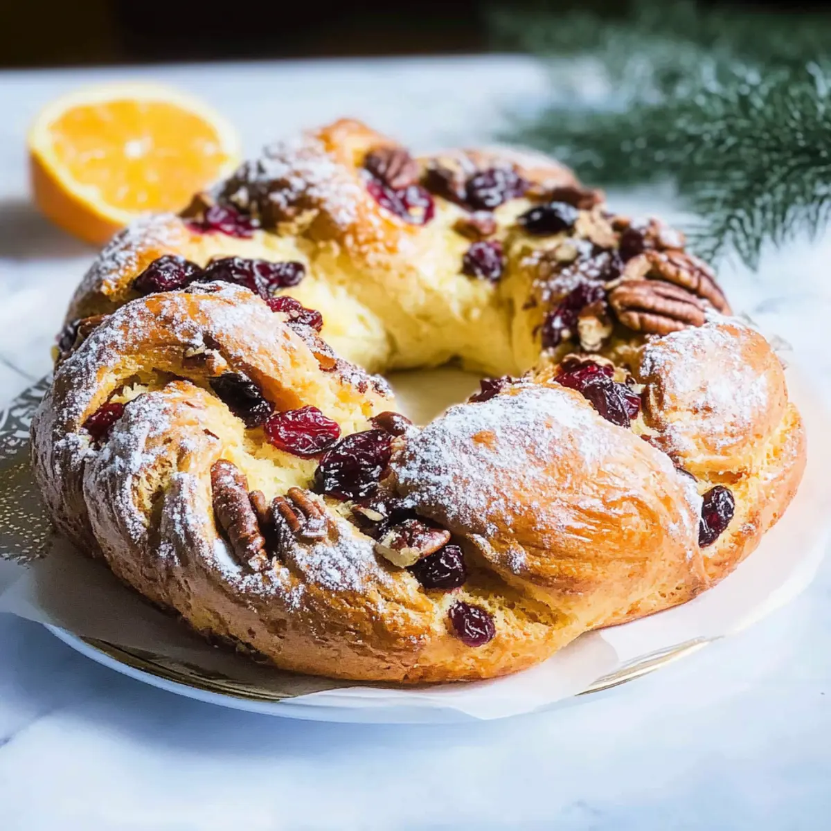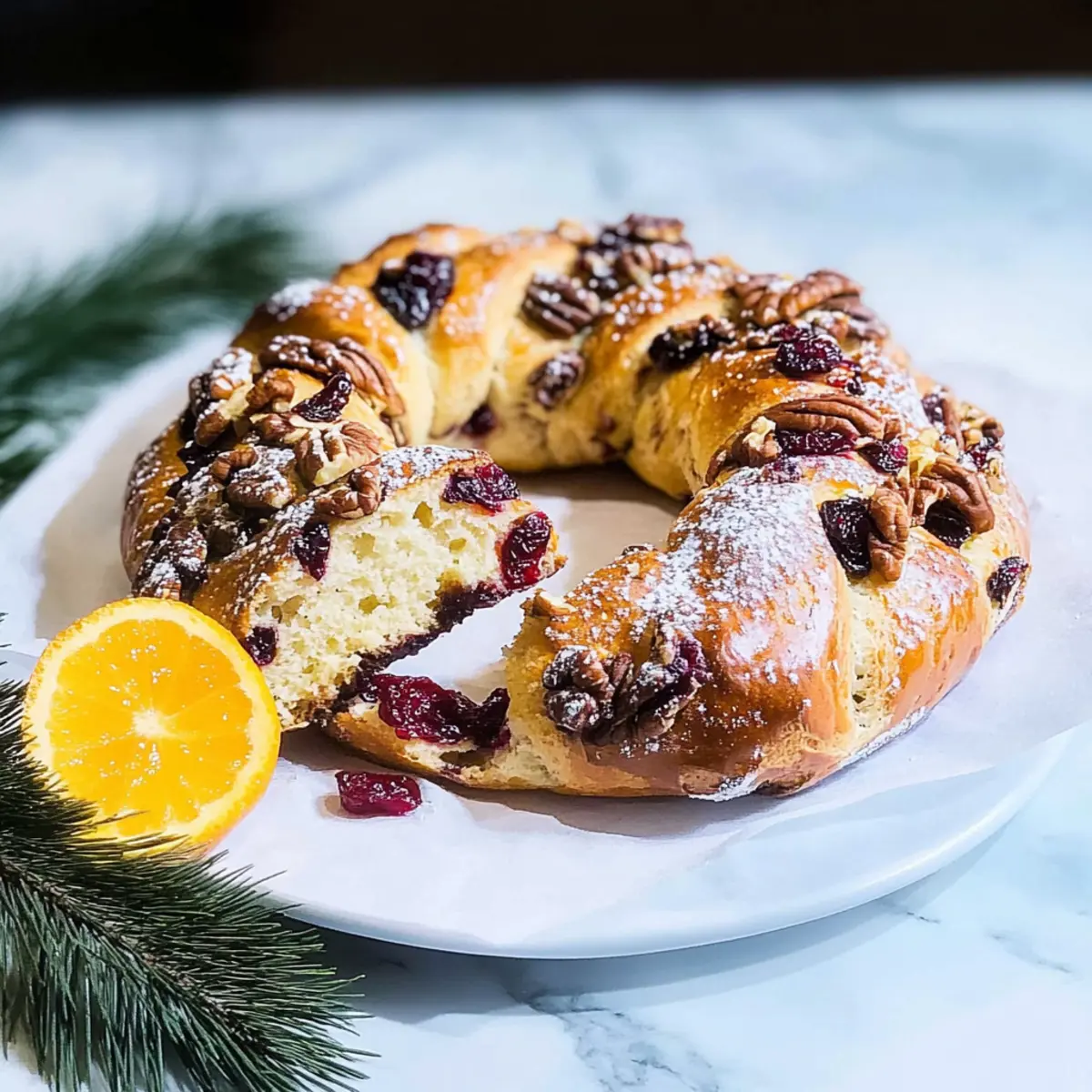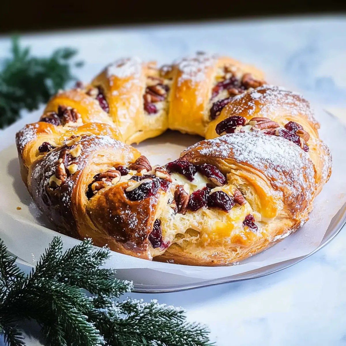 The aroma of freshly baked bread fills the kitchen, wafting through the air like a warm hug. If you’re looking to impress at the breakfast table or add a touch of elegance to your holiday feast, this Cranberry Pecan Couronne is just the ticket. Combining the rich taste of buttery dough with almond cream and the irresistible sweetness of cranberries, this French specialty is not only a show-stopper but also a breeze to make—perfect for bakers of all skill levels. The fluffy texture and delightful crunch of pecans turn each slice into a celebratory bite. Plus, it’s versatile enough for an indulgent weekend breakfast or a festive centerpiece that’ll make your guests swoon. Are you ready to elevate your morning routine with this stunning creation? Why is Couronne a Breakfast Must-Have? Elegant Presentation: This stunning couronne brings a touch of French flair to your breakfast table, impressing family and guests alike. Deliciously Versatile: Enjoy it warm with coffee or tea, or as a centerpiece for holiday gatherings to brighten up any feast. Flavor Explosion: The combination of buttery dough, sweet cranberries, and crunchy pecans creates a balanced bite that delights the senses. Easy to Make: Despite its intricate appearance, this recipe is simple and doesn’t require advanced baking skills, perfect for all home cooks. Make It Your Own: Feel free to experiment with different fillings or nuts as suggested, making it adaptable to your taste, just like my Chicken Enchiladas with Sour Cream Sauce. A Sweet Treat: Dust with powdered sugar for an extra special touch, transforming a cozy morning into a sweet occasion! Couronne with Cranberries and Pecans Ingredients • Get ready to create a stunning breakfast treat! For the Dough Active Dry Yeast – Essential for making the couronne rise; ensure it’s fresh for the best results. Granulated Sugar – Adds a hint of sweetness; feel free to reduce for a more subtle flavor. Milk – Provides richness; warm it slightly before mixing with the yeast. Unsalted Butter – Adds a delicious buttery flavor; make sure it’s melted for easier incorporation. All-Purpose Flour – The backbone of the dough; substituting with bread flour will give a chewier texture. Salt – Essential for enhancing flavors; don’t skip this important ingredient! Egg Yolk – Contributes richness and color; gives the crust a lovely golden hue. Oil – Greasing the bowl keeps the dough from sticking during proofing. For the Filling Unsalted Butter (Filling) – Forms the base of the frangipane; using it at room temperature makes mixing easy. Granulated Sugar (Filling) – Sweetens the almond cream; adjust to your taste, especially if using sweetened toppings. Egg – Binds the filling together; vital for achieving the perfect texture. Almond Flour – The star of the frangipane; can be swapped with ground almonds if desired. Cognac or Rum – Optional, but adds a delightful depth to the flavor of the filling. Dried Cranberries – Provide a sweet and tart burst in every bite; if using fresh cranberries, adjust the sugar accordingly. Pecan Pieces – Add delightful crunch and flavor; walnuts work too if you prefer a different nut. Orange Zest – Brightens the flavor; essential for enhancing the overall taste. Cornstarch – Helps stabilize the frangipane and absorb moisture, preventing melting during baking. For Finishing Touches Powdered Sugar – A sprinkle dusts the couronne with sweetness and makes it visually appealing. Egg for Wash – Use this to brush onto the formed bread for a shiny, beautiful crust before baking. Step‑by‑Step Instructions for Couronne with Cranberries and Pecans Step 1: Activate the Yeast Begin by combining 2 teaspoons of active dry yeast with 2 tablespoons of granulated sugar and 1 cup of warm milk in a small bowl. Let this mixture sit for about 5 minutes until it becomes frothy, indicating that the yeast is alive and ready. This crucial first step ensures your couronne with cranberries and pecans will rise beautifully. Step 2: Prepare the Dough In a large mixing bowl, whisk together 4 cups of all-purpose flour and 1 teaspoon of salt. Once combined, create a well in the center and pour in the activated yeast mixture along with 1 egg yolk and 5 tablespoons of melted unsalted butter. Mix until a dough forms, then knead it on a floured surface for approximately 8-10 minutes until smooth and elastic, giving your couronne the perfect texture. Step 3: First Proof Grease a large bowl with a bit of oil to prevent sticking, then place your kneaded dough inside, turning it to coat all sides. Cover the bowl with a clean kitchen towel and let the dough proof in a warm area for about 1 hour, or until it has doubled in size. This step is essential to develop the airy quality that makes the couronne light and fluffy. Step 4: Make the Frangipane Filling While your dough is rising, prepare the filling by creaming together 4 tablespoons of room-temperature unsalted butter and ½ cup of granulated sugar in a mixing bowl. Incorporate 1 egg, followed by 1 cup of almond flour, and a splash of cognac or rum for depth. Blend until the mixture is smooth and well-combined, ensuring a rich frangipane for your couronne. Step 5: Assemble the Couronne Once the dough has risen, punch it down and roll it out into a large rectangle on a floured surface, about ¼ inch thick. Spread the frangipane filling evenly over the dough, followed by a generous sprinkle of ¾ cup dried cranberries, ½ cup pecan pieces, and the zest of 1 orange. This combination melds together beautifully for a flavor-packed centerpiece. Step 6: Shape the Dough Carefully roll the dough tightly into a log, ensuring the filling remains inside. Using a sharp knife, make a vertical cut down the center of the log to form two tails. Twist and braid these tails together, forming a lovely ring shape. Pinch the ends to seal, creating a lovely crown that’s ready for the oven. Step 7: Final Proof and Egg Was