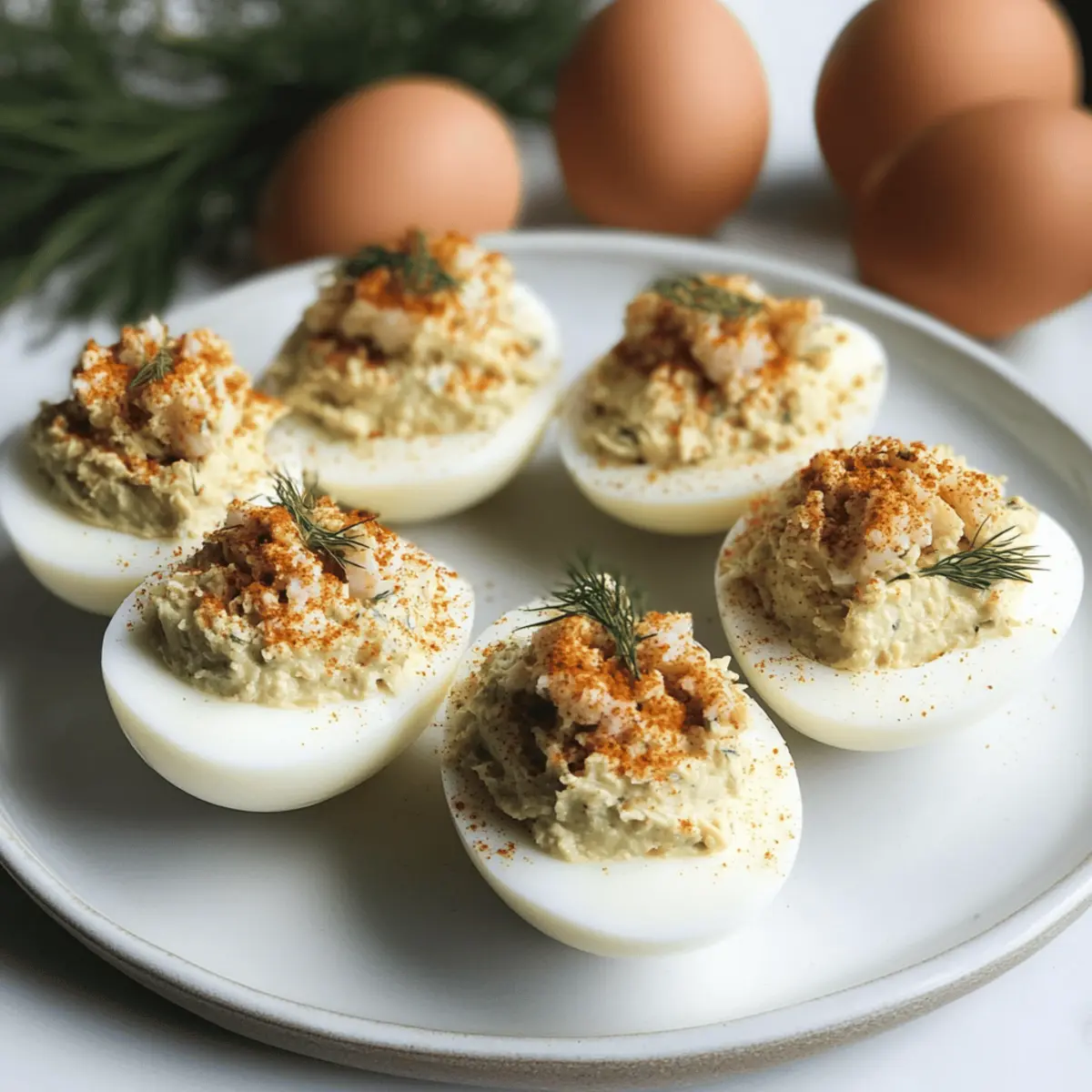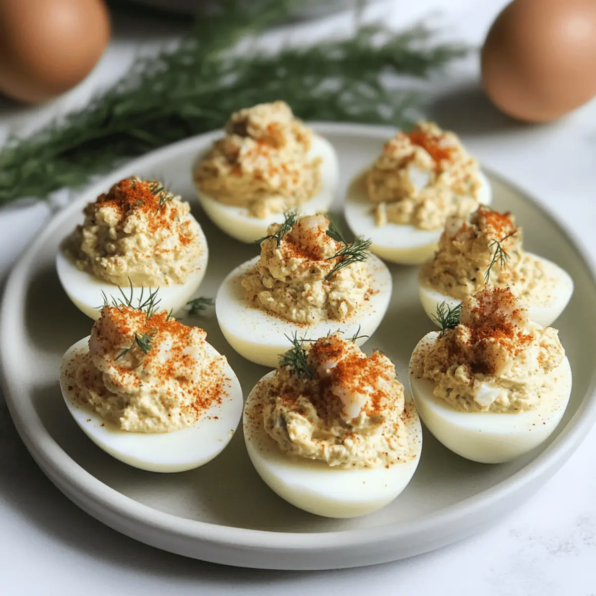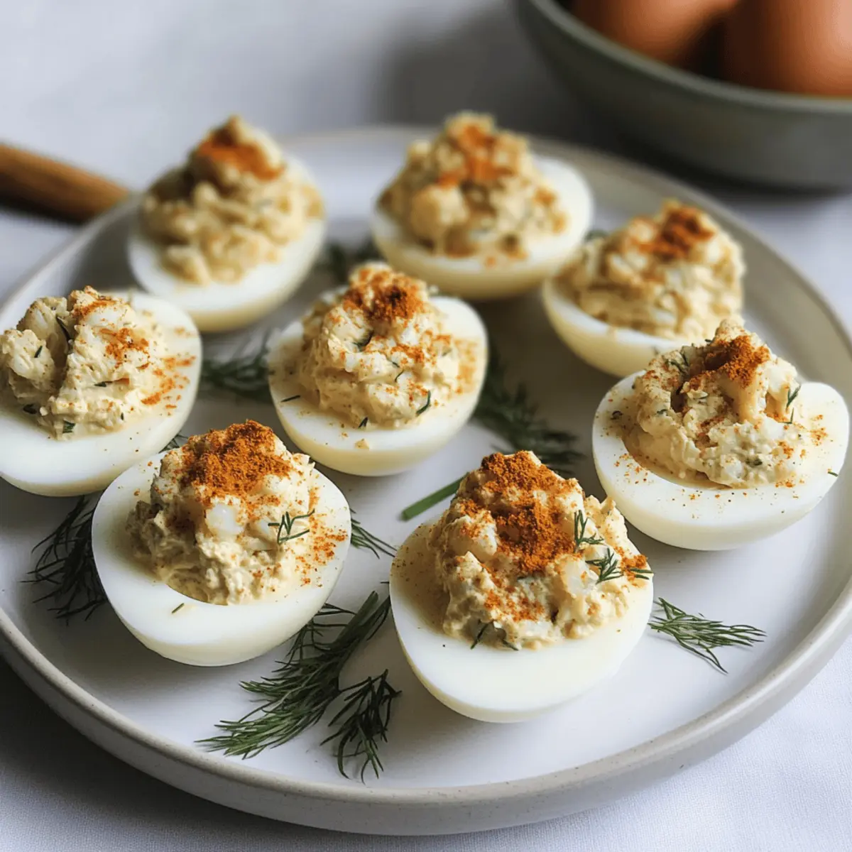 As I stood in my kitchen, the aroma of crab wafted from the can, instantly transporting me to the breezy shores of my favorite beach. That’s when the idea struck me: why not elevate the humble deviled egg with the rich, savory goodness of crab? These creamy crab deviled eggs make for an irresistible appetizer that’s perfect for brunch or intimate gatherings. They’re not only easy to whip up in minutes, but they also bring a touch of elegance to any table, ensuring you can impress your guests without breaking a sweat. So, are you ready to dive into this delectable twist on a classic? Why are Crab Deviled Eggs a Must-Try? Elevated Flavor: These crab deviled eggs transform a classic appetizer into a gourmet dish, thanks to the luscious combination of creamy mayo and sweet crab meat. Easy to Make: With just a handful of ingredients and minimal prep time, you can whip up these delightful bites in no time, perfect for both novice cooks and seasoned chefs. Versatile Serving Options: Ideal for brunch, parties, or casual snacking, serve them on their own or with a splash of cocktail sauce and fresh lemon wedges for an elegant touch! Crowd-Pleasing Appeal: Their unique twist on a beloved favorite is sure to impress guests and make your gatherings memorable. For something equally fun, check out my recipe for Eggs Benedict Casserole that complements any brunch spread! Make-Ahead Friendly: Prepare the crab filling a day in advance or boil eggs up to a week ahead, making your hosting duties a breeze. Enjoy these mouthwatering treats and watch as they become the star of your next brunch bash! Crab Deviled Eggs Ingredients For the Filling • Eggs – Fresh eggs provide optimal creaminess. • Mayo – Acts as a binder for rich flavor; try Miracle Whip for a tangy twist. • Dried Dill – Adds a subtle herbal note; switch to fresh dill for a bolder taste. • Yellow Mustard – Offers tang and depth; Dijon mustard makes a great substitute. • Garlic Powder – Enhances flavors, but fresh garlic may alter texture slightly. • Old Bay Seasoning – Gives that classic seafood flavor essential for crab deviled eggs; seafood seasoning can work too. • Lemon Juice – Provides needed acidity; fresh juice elevates the dish over bottled options. • Salt (optional) – Tweak flavor as needed, especially if using seasoned crab. • Crab (4 oz, reserve 1 oz for garnish) – The star ingredient for that luxurious taste; fresh lump crab is the best bet. For Garnishing • Fresh Dill – Adds a refreshing touch to your elegant presentation. Step‑by‑Step Instructions for Crab Deviled Eggs Step 1: Boil Eggs Start by gently placing large, fresh eggs in a saucepan and covering them with cold water, ensuring they are submerged by at least an inch. Turn the heat to high and bring the water to a rolling boil. Once boiling, immediately turn off the heat, cover the pan, and let the eggs sit in the hot water for 15-20 minutes for perfectly cooked yolks. Step 2: Peel and Prepare After the eggs have cooled for a few minutes, transfer them to a bowl of cold water or run them under cold water to make peeling easier. Carefully tap the shells on a hard surface to crack them, then peel off the shells and slice the eggs in half lengthwise. Place the yolks in a mixing bowl and arrange the whites on a paper towel to dry, ensuring a clean presentation for your crab deviled eggs. Step 3: Mix Filling In the bowl with the yolks, add creamy mayonnaise, yellow mustard, and a sprinkle of garlic powder, dried dill, Old Bay seasoning, and fresh lemon juice. Using a fork, mash and blend these ingredients until the mixture is smooth and creamy, tasting as you go to adjust the seasoning to your liking. This is where the flavors of crab deviled eggs really start to shine! Step 4: Incorporate Crab Delicately fold in about 3 ounces of fresh lump crab meat into the yolk mixture, being careful not to break up the crab too much. This step will allow the sweet, tender crab to shine through each bite of your crab deviled eggs while keeping the filling light and textured. Ensure that the crab is evenly distributed throughout the filling. Step 5: Assemble Using a small spoon or a piping bag, generously fill each egg white half with the crab yolk mixture, creating a lovely mound on top. For a touch of elegance, top each filled egg with a little of the reserved crab meat. This not only adds flavor but also visual appeal to your crab deviled eggs. Step 6: Serve Arrange the crab deviled eggs on a beautiful serving platter and garnish with fresh dill sprigs for an inviting look. These bites are best enjoyed fresh, so serve them immediately to ensure the creamy filling and tender crab are at their peak. Perfect for any gathering, these crab deviled eggs are sure to impress! What to Serve with Crab Deviled Eggs? These delightful bites of creamy goodness are perfect for crafting a well-rounded meal that marries flavors and textures beautifully. Crisp Garden Salad: A salad with fresh greens and a light vinaigrette adds a refreshing contrast to the richness of the deviled eggs. Garlic Breadsticks: Soft, warm breadsticks with a hint of garlic pair wonderfully, providing a satisfying bite to accompany your appetizer. Cocktail Sauce: A small dish of tangy cocktail sauce brings a zesty kick that complements the seafood flavor of the crab. Chilled Sauvignon Blanc: A crisp glass of Sauvignon Blanc enhances the dish, balancing the richness of the eggs with its vibrant acidity. Roasted Asparagus: Tender roasted asparagus spears drizzled with lemon provide a fresh, crisp element that brightens the meal. Deviled Egg Variations: Offer a medley of deviled eggs, like bacon or avocado variations, for a colorful and fun appetizer platter. Lemon Tart: A slice of zesty lemon tart will cleanse the palate, providing a sweet yet tangy contrast to the savory crab flavors. Charcuterie Board: Create an assortment of meats, cheeses, and pickles that pair beautifully with the c