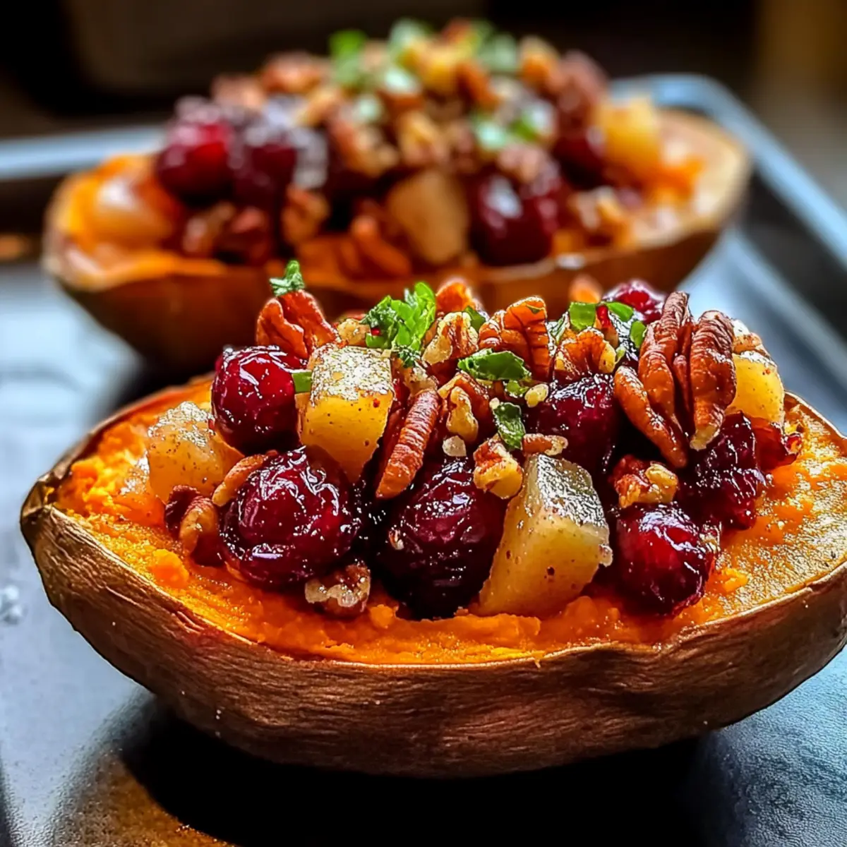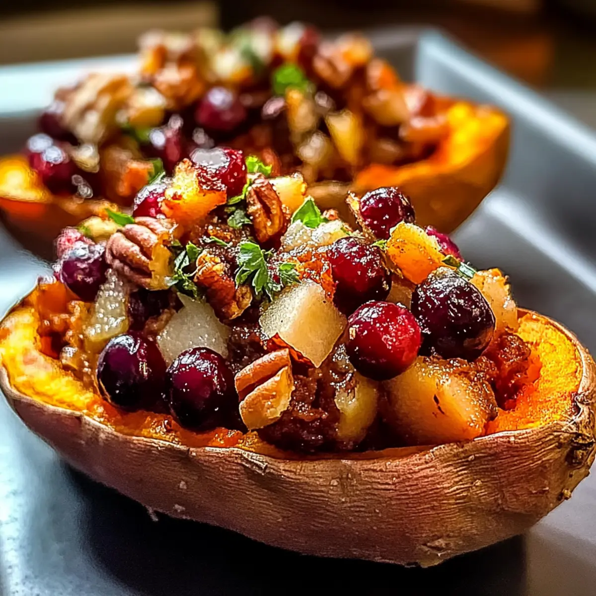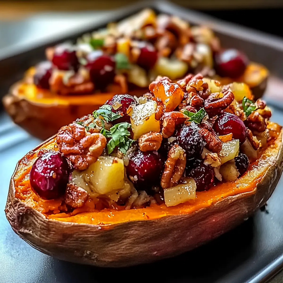 As the aroma of roasted sweet potatoes fills the kitchen, I’m reminded of the cozy gatherings we cherish during the holidays. This recipe for Cranberry Apple Twice Baked Sweet Potatoes is not only a feast for the eyes; it’s a delicious way to elevate your holiday table. Featuring the perfect fusion of sweet and tart flavors, these festive bites are both vegetarian and easily customizable to suit your taste. Besides offering a healthy twist on a classic dish, they also allow for delightful prep ahead of time, making your holiday entertaining a breeze. Imagine the joy on your loved ones’ faces when they discover this vibrant, comfort-laden side dish on their plates! What unique twist will you put on these elegant sweet potatoes? Why Are These Sweet Potatoes Irresistible? Elegant presentation: Their gorgeous colors make them visually stunning, turning any meal into a festive affair. Sweet and Savory: The combination of sweet potatoes, tart cranberries, and lively spices creates a harmonious flavor explosion that delights the palate. Customizable: Make it your own! Substitute ingredients like walnuts instead of pecans, or add a layer of cream cheese for extra richness. Easy Prep: Prepare these ahead of time, making your holiday hosting stress-free while impressing family and friends. Health-conscious: Packed with vitamins, antioxidants, and wholesome ingredients, this dish is a guilt-free indulgence. Pair it with a fresh salad or a savory roast to round out your meal! Cranberry Apple Twice Baked Sweet Potatoes Ingredients For the Sweet Potatoes • Sweet Potatoes – The star of the dish; their natural sweetness and creamy texture create a delightful base. • Butter – Enhances richness when caramelizing the apples; substitute coconut oil for a vegan twist. For the Filling • Apples (Granny Smith) – Tart and sturdy; they balance sweetness and retain shape while cooking. • Cranberries – Fresh ones are best for their tartness and texture, adding a pop of color and flavor. • Brown Sugar – Adds sweetness and a hint of caramel flavor; adjust based on the apples’ natural sweetness. • Cinnamon & Nutmeg – These warm spices elevate the dish; consider ginger or cardamom for a personalized touch. For Topping • Pecans – Provide a crunchy texture and nutty flavor; toast them beforehand to enhance their taste. Experience how these Cranberry Apple Twice Baked Sweet Potatoes come together to create a festive side dish perfect for any holiday gathering! Step‑by‑Step Instructions for Cranberry Apple Twice Baked Sweet Potatoes Step 1: Preheat the Oven Begin by preheating your oven to 425°F (220°C). While your oven heats up, line a baking sheet with parchment paper to prevent sticking. This step is crucial, as it ensures even roasting of the sweet potatoes, which are the star of the Cranberry Apple Twice Baked Sweet Potatoes dish. Step 2: Prepare Sweet Potatoes Scrub the sweet potatoes under cold running water until clean, then pierce each potato several times with a fork to allow steam to escape while baking. Rub them with a drizzle of olive oil and sprinkle with salt for enhanced flavor. Place the prepared sweet potatoes on the lined baking sheet, making sure they aren’t crowded for optimal roasting. Step 3: Roast Sweet Potatoes Roast the sweet potatoes in the preheated oven for about 40–45 minutes. They are done when their skins are slightly wrinkled and a fork easily pierces through the flesh. This roasting process caramelizes their natural sugars, providing a delicious foundation for your Cranberry Apple Twice Baked Sweet Potatoes. Step 4: Cook the Apples While the sweet potatoes roast, melt 2 tablespoons of butter in a skillet over medium heat. Add diced Granny Smith apples and let them cook undisturbed for 2-3 minutes until they start to caramelize. Stir and cook for another 3-4 minutes until the apples are tender but not mushy, creating a sweet base for the filling. Step 5: Combine Filling Ingredients To the skillet with caramelized apples, add fresh cranberries, a sprinkle of brown sugar, cinnamon, nutmeg, and a pinch of salt. Continue cooking for another 5–7 minutes until the cranberries begin to soften and burst, melding perfectly with the apple mixture. This filling will bring the vibrant flavors to your Cranberry Apple Twice Baked Sweet Potatoes. Step 6: Prepare Sweet Potatoes for Filling Once the sweet potatoes are perfectly roasted, remove them from the oven and allow them to cool slightly. Carefully cut each potato lengthwise down the center, taking care not to cut all the way through. Use a fork to fluff the interiors, creating a cozy bed for the apple-cranberry filling that will elevate your dish. Step 7: Fill the Sweet Potatoes Generously spoon the warm apple and cranberry mixture into the fluffed sweet potatoes, mounding it high for an appealing presentation. Make sure each potato is brimming with this delightful blend of flavors. The result will be a visually stunning component of your Cranberry Apple Twice Baked Sweet Potatoes. Step 8: Final Bake Once filled, return the sweet potatoes to the oven for an additional 10 minutes. This final baking will meld the flavors together and warm the filling through. Keep an eye on them to ensure they don’t overbake—your culinary adventure with Cranberry Apple Twice Baked Sweet Potatoes deserves perfect doneness. Step 9: Garnish and Serve After baking, remove the sweet potatoes from the oven and allow them to cool for a few moments. Garnish with toasted pecans, a sprinkle of fresh thyme, or flaky sea salt for added texture and flavor before serving. This step not only enhances the dish’s visual appeal but also adds a satisfying crunch. How to Store and Freeze Cranberry Apple Twice Baked Sweet Potatoes Fridge: Store any leftovers in an airtight container for up to 3 days. Reheat gently in the oven to keep the sweet potatoes tender and the flavors intact. Freezer: For longer storage, freeze unfilled roasted s