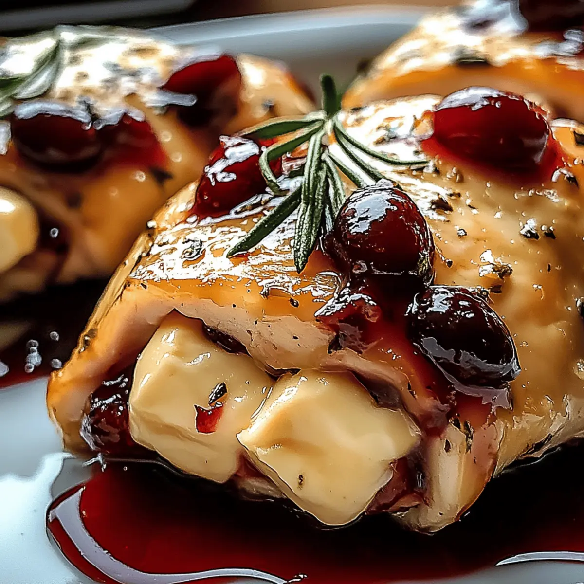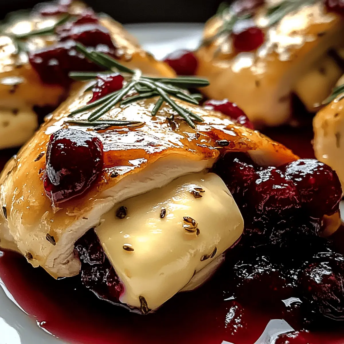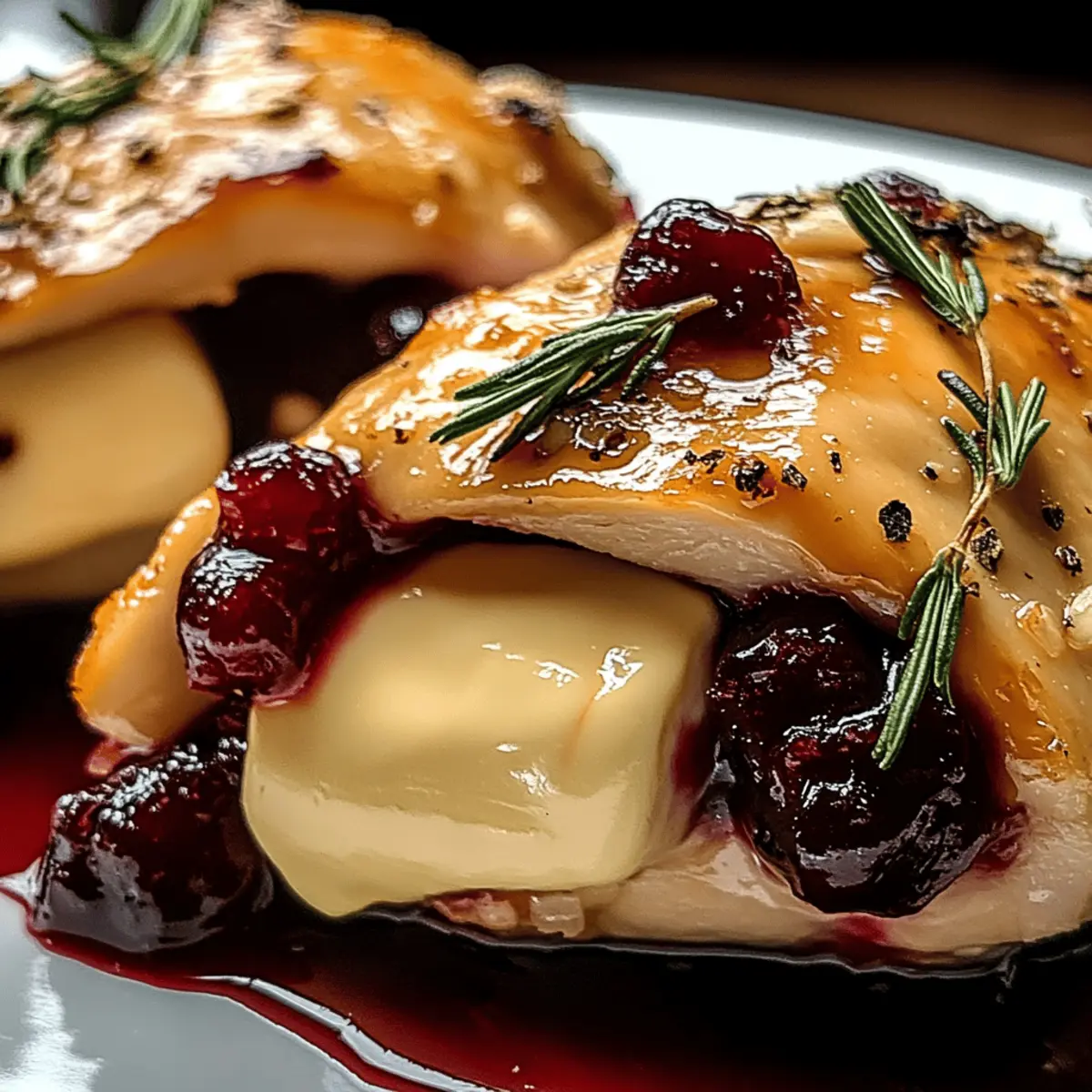 As I stood in my kitchen, the enticing aroma of roasted chicken mingled with the sweet-tart notes of cranberries, creating a comforting cocoon that reminded me of cozy holiday gatherings. This Cranberry Brie Stuffed Chicken has become a staple in my dinner rotation, not just for its gourmet flair, but also for how effortlessly it wows guests and family alike. It’s a gluten-free culinary masterpiece that transforms simple chicken breasts into succulent, cheesy delights. The best part? You can whip it up in under an hour, making it perfect for those busy weeknights or spontaneous dinner parties. Ready to impress with a dish that feels elegant yet easy to prepare? Let’s dive into this recipe and bring a touch of gourmet magic to your table! Why is this dish a must-try? Simplicity: This recipe requires minimal prep and cooking skills, making it accessible for everyone. Gourmet Experience: Elevate your dinner with the luxurious combination of creamy Brie and tart cranberries, providing restaurant-quality flavor at home. Versatility: Enjoy this dish for special occasions or weeknight dinners. It pairs effortlessly with simple sides like roasted asparagus or creamy polenta. Make-Ahead Friendly: Prepare the chicken ahead of time and refrigerate, allowing you to enjoy the moment with your guests. Crowd-Pleaser: Impress family and friends with a visually stunning and delicious dish that’s gluten-free, ensuring everyone can enjoy it without worry. Don’t forget to check out other crowd-pleasing dishes like Fiery Chicken Ramen or Bang Bang Chicken for more inspiration! Cranberry Brie Stuffed Chicken Ingredients For the Chicken Boneless, Skinless Chicken Breasts – The star of this dish provides a tender base perfect for stuffing. Salt and Pepper – Essential for seasoning the chicken and enhancing overall flavors. For the Stuffing Brie Cheese – Adds a smooth, creamy texture; if you prefer a mild flavor, camembert is a great alternative. Cranberry Sauce – Offers a sweet-tart punch to balance the richness; homemade is great, but store-bought simplifies prep. For Cooking Olive Oil – Ideal for searing the chicken, keeping it moist and infusing it with flavor. For Garnishing (Optional) Balsamic Glaze – Drizzle on top for a touch of acidity and sweetness to elevate presentation. Chopped Nuts – Adds a crunchy texture that complements the creamy filling. Honey Drizzle – A sweet finish that can enhance the flavors, perfect for special occasions. Now, with your ingredients ready, you’re set to create an unforgettable Cranberry Brie Stuffed Chicken that will leave your guests raving! Step‑by‑Step Instructions for Cranberry Brie Stuffed Chicken Step 1: Preheat and Season Begin by preheating your oven to 375°F (190°C). While the oven heats, take your boneless, skinless chicken breasts and season them generously with salt and pepper, ensuring you cover both the inside and outside for maximum flavor. This step sets the stage for your delectable Cranberry Brie Stuffed Chicken. Step 2: Create Chicken Pockets Carefully slice each chicken breast horizontally to create a pocket, being sure not to cut all the way through. Open the chicken breast and visually inspect the pocket to ensure it’s wide enough for stuffing, providing a perfect nest for the creamy Brie and tantalizing cranberry sauce. Step 3: Stuffing the Chicken Fill each chicken breast pocket with a generous amount of Brie cheese and a spoonful of cranberry sauce. Press the filling down gently but firmly to ensure it stays nestled inside. This combination of flavors is what makes the Cranberry Brie Stuffed Chicken a show-stopper, so don’t be shy with the stuffing! Step 4: Secure the Pockets To prevent the delicious filling from spilling out, secure each pocket with toothpicks or kitchen twine. Make sure the closing is tight but not overly so, as you want the chicken to remain juicy while cooking. This step is crucial for achieving a neat presentation for your gourmet dish. Step 5: Searing the Chicken Heat a tablespoon of olive oil in a large skillet over medium-high heat. Once the oil is shimmering, carefully add the stuffed chicken breasts. Sear for about 4-5 minutes on each side, or until they develop a beautiful golden brown crust. This initial step locks in juices and adds to the visual appeal of your Cranberry Brie Stuffed Chicken. Step 6: Bake to Perfection Once each breast is beautifully seared, transfer them to a baking dish and place it in the preheated oven. Bake for 25-30 minutes, or until the internal temperature reaches 165°F (74°C). Keep an eye on the chicken; once it’s firm and juices run clear, it’s time to take it out! Step 7: Rest and Serve After baking, allow the chicken to rest for about 5 minutes. This resting period allows the juices to redistribute, ensuring every bite is succulent. When ready to serve, slice the chicken and feel free to drizzle with balsamic glaze or sprinkle chopped nuts on top for an elegant touch, enhancing the experience of your Cranberry Brie Stuffed Chicken. What to Serve with Cranberry Brie Stuffed Chicken? Creating a memorable meal goes beyond the main dish; it’s an opportunity to explore vibrant sides that enhance your dining experience. Creamy Mashed Potatoes: These buttery potatoes add a velvety texture that pairs beautifully with the savory chicken and adds comfort to your plate. Their mild flavor allows the chicken’s gourmet taste to shine. Roasted Asparagus: This tender green veggie brings a slight crunch and earthiness, balancing the richness of the Brie cheese while adding a pop of color and nutrients to the meal. Herb-Infused Quinoa: Light and nutty, quinoa offers a wholesome grain alternative that complements without overshadowing the chicken’s gourmet flavors. Toss in fresh herbs for extra zing. Mixed Green Salad: A refreshing salad with a light vinaigrette provides a crisp contrast to the warm, creamy chicken. Consider adding seasonal fruits like pears fo