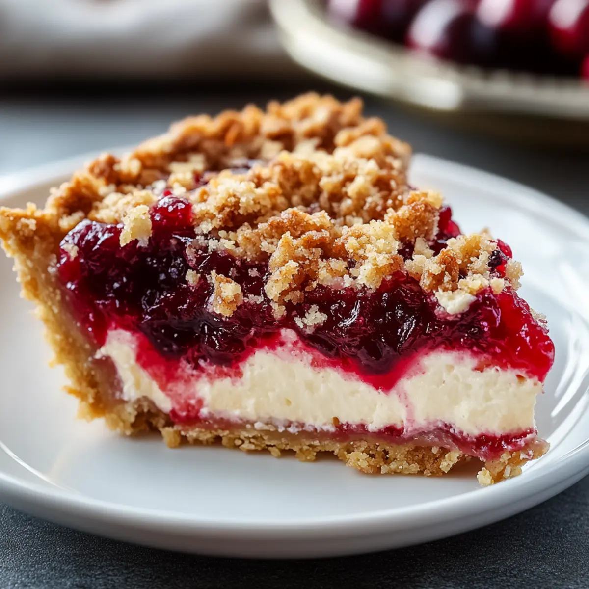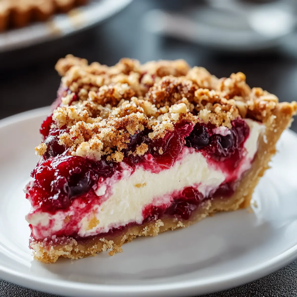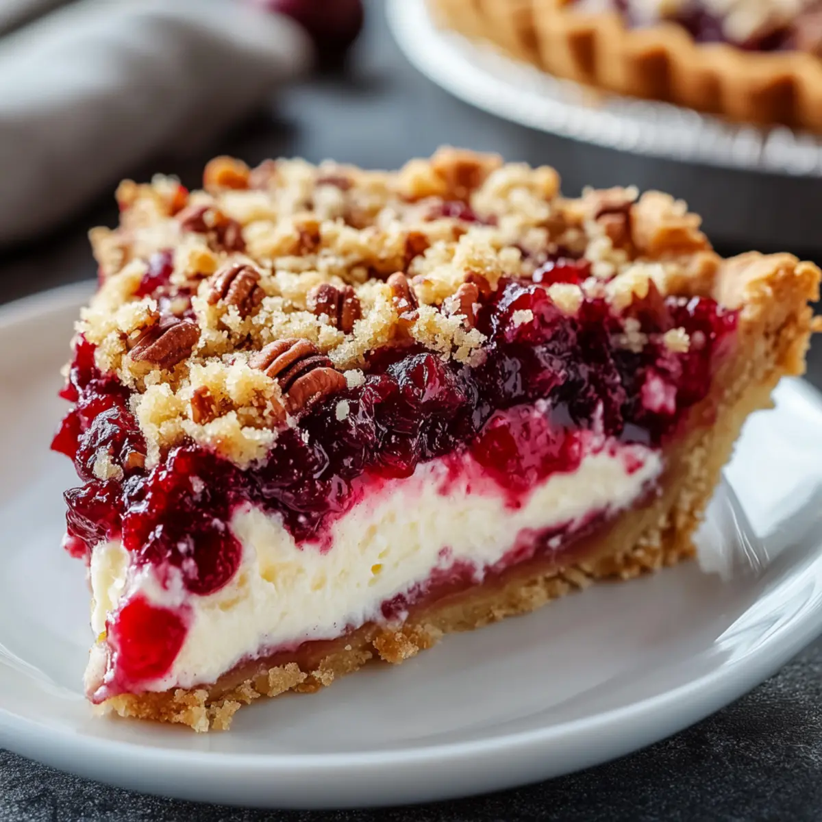 “Wow, this tastes just like the holidays!” I overheard someone say as they took the first slice of my Cranberry Cream Cheese Crumb Pie. There’s something magical about the combination of a flaky crust, creamy filling, and tart cranberry swirls that truly transports you to a festive gathering filled with love and laughter. This pie is not just a dessert; it’s a celebration of family traditions, easily made ahead of time for your convenience. With its delightful crunch from the pecan topping and creamy texture that pairs beautifully with a dollop of whipped cream, it promises to impress at any gathering. And if you’re feeling adventurous, there are so many variations to explore! Are you ready to dive into your new favorite holiday dessert? Why is this pie a festive favorite? Deliciously Unique: This Cranberry Cream Cheese Crumb Pie is unlike any traditional dessert, combining creamy filling with vibrant cranberry swirls for a striking appearance and flavor. Easy to Make: With simple ingredients and straightforward steps, it’s perfect for bakers of all skill levels. You can even prep it ahead of time for stress-free celebrations! Crowd-Pleasing Flavor: The balance of creaminess, tartness, and crunch makes it a hit at any gathering—your guests will be raving! Versatile Variations: Feel free to customize with the Lemon-Lover’s Twist or Chocolate Layer, so you can tailor it to your taste. Perfect Pairing: Served with whipped cream or vanilla ice cream, it elevates the dessert experience to new heights, ensuring every bite is a treat. This pie isn’t just a dessert; it’s an invitation to create new memories! Cranberry Cream Cheese Crumb Pie Ingredients For the Creamy Filling Cream Cheese – Ensures a rich, smooth texture; remember to soften before mixing for best results. Sweetened Condensed Milk – Supplies necessary sweetness and creaminess; no substitutes recommended for this recipe. Lemon Juice – Brightens the filling with acidity; crucial for thickening. Orange Zest – Adds a fresh citrus note; can be swapped with lemon zest for a different flavor profile. For the Cranberry Layer Cranberry Sauce – This key ingredient gives the pie its tartness; choose between homemade or store-bought based on your preference. Cornstarch – Acts as a thickener for the cranberry layer; adjust amount based on desired consistency. Brown Sugar – Enhances the sweetness and depth of flavors in the cranberry layer; crucial for balance. For the Crumb Topping Flour – Forms the base of the crumb topping; gluten-free flour blends can be substituted if needed. Brown Sugar – Adds sweetness and richness; it works beautifully with the flour and nuts. Pecans – Provide delightful crunch and flavor; swap with rolled oats for a nut-free option. Butter – Binds the crumb topping together; melting it ensures easy incorporation with dry ingredients. This Cranberry Cream Cheese Crumb Pie is not just a recipe—it’s a way to celebrate togetherness and delicious flavors! Step‑by‑Step Instructions for Cranberry Cream Cheese Crumb Pie Step 1: Preheat the Oven Begin by preheating your oven to 350°F (175°C). While the oven warms up, prep two 9-inch pie crusts and place them on a foil-lined baking sheet. This setup will catch any drips and make cleanup a breeze. Once your oven reaches the desired temperature, you’ll be ready to assemble your Cranberry Cream Cheese Crumb Pie! Step 2: Prepare the Creamy Filling In a mixing bowl, beat the softened cream cheese until it becomes smooth and creamy. Gradually add in the sweetened condensed milk, lemon juice, and orange zest, mixing until everything is well combined and glossy. This creamy filling is the heart of your Cranberry Cream Cheese Crumb Pie, so make sure there are no lumps before evenly distributing it between the prepared crusts. Step 3: Mix the Cranberry Layer Next, combine the cranberry sauce with cornstarch, brown sugar, and a pinch of cinnamon in a separate bowl. Stir gently until everything is well mixed, ensuring the cornstarch is completely dissolved. Spoon the tart cranberry layer over the creamy filling in each pie crust, being careful not to stir or mix the layers together. This creates a beautiful and distinct layer in your pie. Step 4: Make the Crumb Topping In another bowl, mix together the flour, brown sugar, and chopped pecans until evenly combined. Pour melted butter over this mixture and toss with a fork until clumps form. This crumb topping is what will give your Cranberry Cream Cheese Crumb Pie its crunchy texture, so make sure it’s well combined and ready to add a delightful crunch on top. Step 5: Bake the Pies Carefully sprinkle the crumb topping generously over the pie layers, ensuring an even distribution. Place the baking sheet with the pies in the preheated oven and bake for 55-60 minutes. Keep an eye on your pies, and if the topping starts to brown too quickly, tent them with foil to prevent burning while the filling cooks through. Step 6: Cool Completely Once baked, remove the pies from the oven and let them cool at room temperature. This will take about 30 minutes. After cooling, cover the pies and chill in the refrigerator for at least 4 hours or ideally overnight. Chilling allows the filling to set properly, making your Cranberry Cream Cheese Crumb Pie easier to slice and serve. Expert Tips for Cranberry Cream Cheese Crumb Pie Smooth Cream Cheese: Ensure your cream cheese is softened completely to achieve a silky filling without lumps. This step is crucial for a seamless texture in your Cranberry Cream Cheese Crumb Pie. Cooling Time: Allow the pie to cool completely at room temperature before refrigerating. Chilling for at least 4 hours—or overnight if possible—ensures the filling sets perfectly. Sharp Knife: Use a sharp, clean knife to cut the pie. Wipe the blade between slices to maintain clean edges for beautiful presentations. Adjusting Cornstarch: If you encounter a runny cranberry layer, consider 