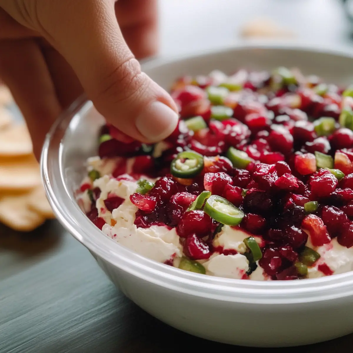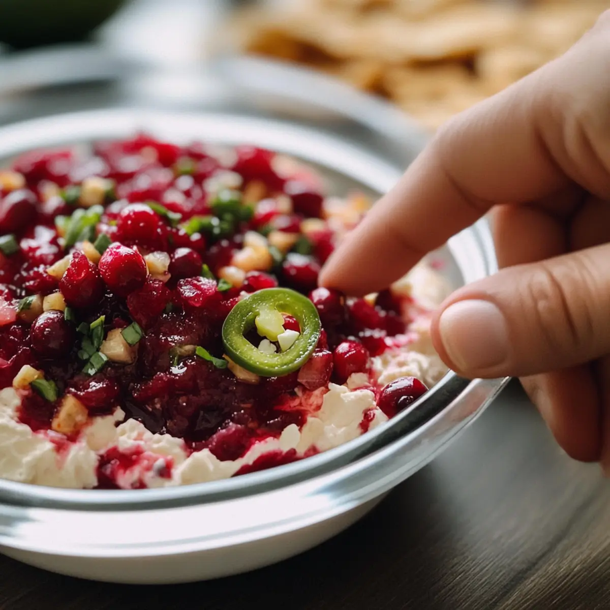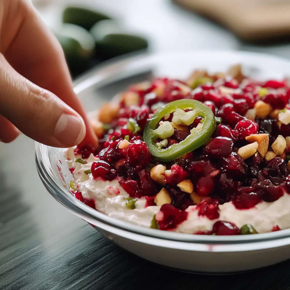 Every holiday gathering deserves a standout dish, and this Holiday Cranberry Jalapeño Cream Cheese Dip is just that! The zingy burst of fresh cranberries mingles beautifully with the spicy warmth of jalapeños, creating a vibrant appetizer that brings a festive touch to any table. Not only is it easy to whip up ahead of time, but this creamy dip also strikes the perfect balance between sweet and savory, making it a guaranteed crowd-pleaser. Picture your friends and family diving into this colorful creation, their taste buds dancing with delight. Ready to impress your guests with a dish that’s as fun to make as it is to eat? Let’s dive into this irresistible recipe together! Why Is This Dip So Addictive? Irresistible Flavors: The tantalizing combination of sweet cranberries and spicy jalapeños creates a bold, flavorful bite that keeps everyone coming back for more. Perfect for Gatherings: This showstopper appetizer is designed to impress, making it a must-have at any holiday party or family gathering. Flexible Serving Options: Pair it with crackers, chips, or even toasted baguette slices for a deliciously versatile experience that suits all tastes. Make-Ahead Convenience: Perfect for the busy host, this dip can be prepared in advance—saving you time and stress on the big day. Visually Stunning: Its vibrant colors not only look beautiful on the table but also ignite the festive spirit, drawing everyone in! Don’t forget to try it alongside other favorites like Coconut Cream Pancakes or Egg and Cheese Toasts. Your guests will love the variety! Cranberry Jalapeño Cream Cheese Dip Ingredients For the Dip • Fresh Cranberries – Tartness and texture; substitute with pomegranates for a sweeter profile. • Green Onions – Adds mild onion flavor and vibrant color; only use green tops if preferred. • Jalapeños – Provides heat; adjust quantity for spice preference and consider removing seeds for milder flavor. • Cilantro (optional) – Fresh herbal note; omit if you’re not a fan. • Sugar – Balances tartness; adjust to taste, use 3/4 to 1 cup depending on your preference. • Lemon Juice – Enhances flavor and adds brightness; fresh is best! • Salt – Balances flavors and enhances all ingredients for a perfect dip. • Cream Cheese – Creamy base for the dip; whip for easy spreading. Feel free to mix your own variations for this delicious Cranberry Jalapeño Cream Cheese Dip—it’s all about finding the flavor that hits just right for your holiday celebrations! Step‑by‑Step Instructions for Holiday Cranberry Jalapeño Cream Cheese Dip Step 1: Prepare Ingredients Begin by thoroughly rinsing 2 cups of fresh cranberries, then chop them coarsely for texture. Next, thinly slice 2 green onions, using only the green tops if you prefer a milder flavor. Finely dice 1-2 jalapeños, adjusting the quantity based on your spice tolerance (remove seeds for a milder version). If desired, chop a handful of cilantro. Step 2: Combine Ingredients In a mixing bowl, combine the chopped cranberries, green onions, jalapeños, cilantro (if using), and about 3/4 to 1 cup of sugar to balance the tartness. Add the juice of one fresh lemon along with a pinch of salt to enhance the flavors. Gently stir the mixture until all ingredients are well combined, creating a colorful blend of sweet and spicy flavors. Step 3: Refrigerate Cover the cranberry mixture tightly with plastic wrap or a lid, ensuring it’s sealed to retain moisture. Allow this vibrant concoction to chill in the refrigerator for at least 12 hours, but overnight is ideal for the flavors to meld beautifully, intensifying the overall taste of your Holiday Cranberry Jalapeño Cream Cheese Dip. Step 4: Strain Liquid Before serving, remove the mixture from the fridge and place it in a colander to drain off any excess liquid. This step is crucial to prevent your dip from becoming soggy. Allow it to strain for about 10 minutes, gently pressing down on the mixture with the back of a spoon to remove moisture while preserving that enticing texture and flavor. Step 5: Cream Cheese Layer In a medium bowl, whip 8 ounces of cream cheese until smooth and creamy, which will act as the delightful base for your dip. Spread the whipped cream cheese evenly across the bottom of your serving plate or dish, creating a luscious layer that will complement the vibrant cranberry mixture above it. Step 6: Top and Serve Finally, spoon the chilled cranberry mixture over the whipped cream cheese layer, spreading it evenly to make a visually beautiful presentation. Serve your Holiday Cranberry Jalapeño Cream Cheese Dip chilled, accompanied by a platter of your favorite crackers, tortilla chips, or toasted baguette slices for an irresistible appetizer that promises to be a hit! Expert Tips for Holiday Cranberry Jalapeño Cream Cheese Dip • Hand-Chop Cranberries: Avoid using a food processor; hand-chopping maintains the cranberries’ texture and prevents excess liquid. • Strain Wisely: Ensure you strain the liquid thoroughly before serving to keep your dip from getting soggy, especially if made ahead. • Adjust Spice Level: Taste your jalapeños beforehand; remove seeds for a milder dip, but keep some for that sweet and spicy kick! • Use Fresh Ingredients: For the best flavor, opt for fresh cranberries and lemon juice—this elevates your Cranberry Jalapeño Cream Cheese Dip considerably. • Chill Time: Allow at least 12 hours for the mixture to sit in the fridge before serving; this helps the flavors meld together beautifully. • Revamp Leftovers: If you have any dip left, consider using it as a topping for grilled chicken or mixed into a salad for a burst of flavor! Cranberry Jalapeño Cream Cheese Dip Variations Feel free to let your imagination run wild as you customize this creamy dip to suit your tastes and dietary needs! Pomegranate Twist: Substitute half the cranberries with pomegranate arils for a sweet and juicy addition. This makes every b