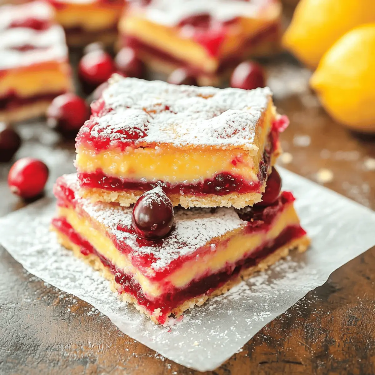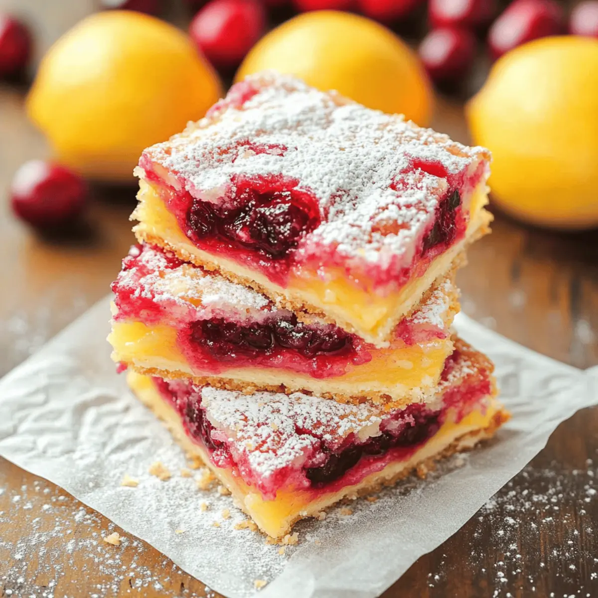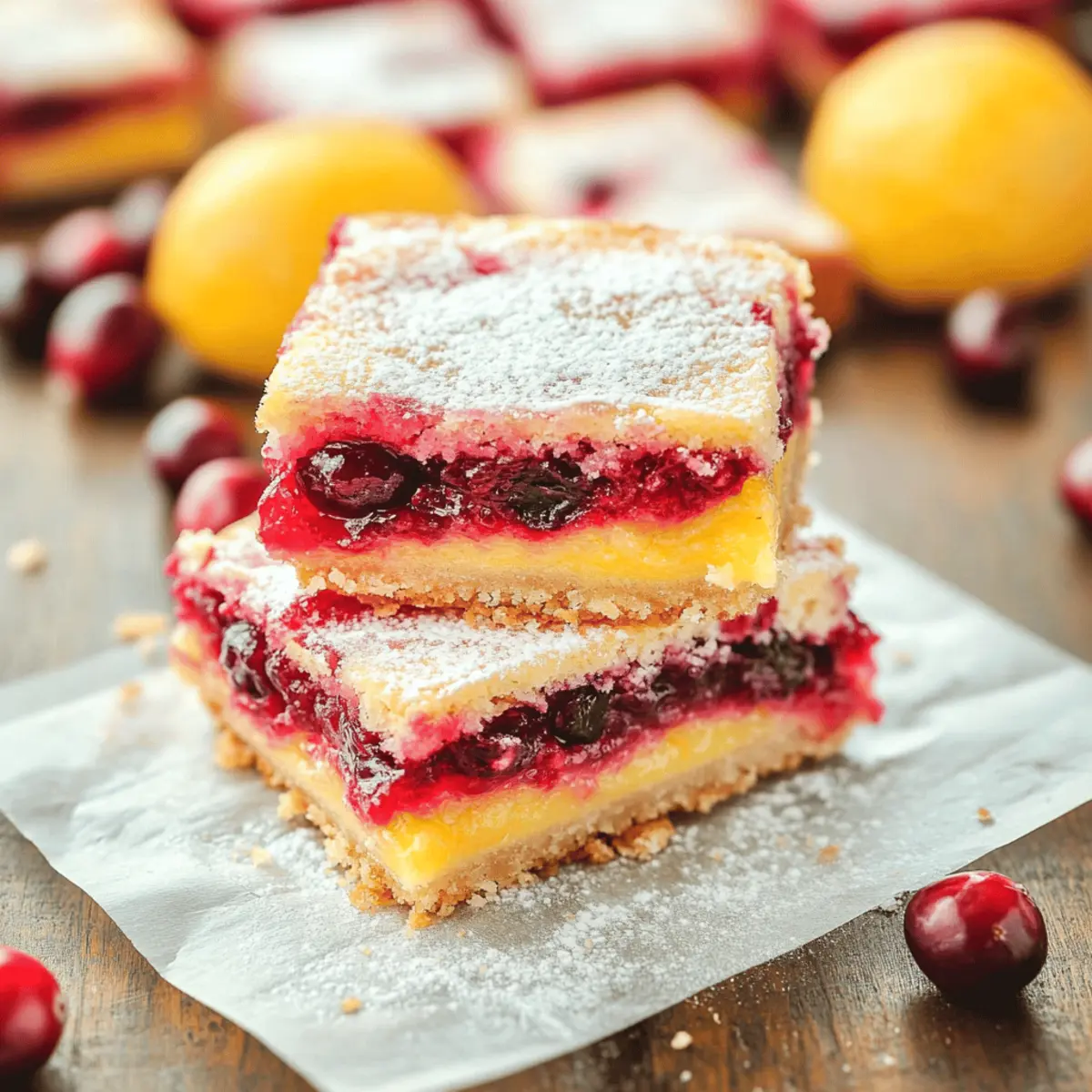 With the festive season just around the corner, I was caught off guard by a sudden craving for something vibrant and tangy. That’s when I decided to whip up a batch of Cranberry Lemon Bars, and let me tell you, they’re a game-changer! This easy recipe combines the sweet-tart explosion of fresh cranberries with the refreshing zing of lemon—making it the perfect holiday dessert or a delightful pick-me-up any day of the week. What’s more, these bars can easily accommodate both fresh and frozen cranberries, bringing flexibility to your kitchen creations. Plus, they’re a fantastic way to impress guests without spending hours in the kitchen! Are you ready to brighten up your dessert table with this delightful treat? Why Are Cranberry Lemon Bars So Irresistible? Decadent Flavor: The vibrant blend of tart cranberries and refreshing lemon creates a taste sensation that will leave your taste buds dancing! Perfect for the holidays or anytime you crave a sweet treat. Easy to Make: With just a few simple ingredients and steps, this recipe is ideal for both novice and seasoned bakers. Versatile Options: Feel free to use fresh or frozen cranberries—even leftover cranberry sauce works wonders—making it an adaptable recipe for all occasions! Crowd-Pleaser: These bars are sure to impress friends and family, serving as a delightful centerpiece at holiday gatherings or casual get-togethers. Texture Bliss: Enjoy the delightful contrast between the gooey filling and buttery shortbread crust that makes these bars a texture sensation. Want to elevate your dessert game? Pair them with a refreshing beverage like Peach Lemonade Refreshing for a perfect summer treat! Cranberry Lemon Bars Ingredients • Let’s gather everything you need to make these deliciously tangy treats! For the Cranberry Filling Fresh Cranberries (8 ounces) – Adds a vibrant tartness; for convenience, frozen cranberries can be used without thawing. Water (1/2 cup) – Helps create a sauce by cooking the cranberries down. Granulated Sugar (6 tablespoons) – Sweetens the filling, balancing the tangy cranberries. For the Crust Unsalted Butter (1/2 cup, melted) – Creates a rich and moist base for your bars. Granulated Sugar (1 cup + 1/4 cup) – Adds sweetness to both the crust and lemon layer. Salt (1/4 teaspoon) – Enhances flavors and balances sweetness. All-Purpose Flour (1 cup + 3 tablespoons) – Provides structure; can switch to gluten-free flour if desired. For the Lemon Layer Large Eggs (3) – Acts as a binder and adds richness to the lemon custard. Fresh Lemon Juice (1/2 cup) – Delivers that bright, refreshing flavor; fresh juice is best for taste. Granulated Sugar (for lemon) – Sweetens the custard layer perfectly, enhancing the flavor. For Serving Powdered Sugar (for dusting) – Lightens the presentation with a sweet touch on top before serving. Get ready to enjoy the refreshing taste of Cranberry Lemon Bars—a perfect treat that combines ease and deliciousness! Step‑by‑Step Instructions for Cranberry Lemon Bars Step 1: Prepare Cranberry Filling Begin by rinsing 8 ounces of fresh cranberries and placing them in a saucepan. Add 1/2 cup of water and 6 tablespoons of sugar, cooking over medium heat for about 10-15 minutes until the cranberries soften and burst. Stir occasionally and imagine the delightful tangy aroma wafting through your kitchen. Once ready, let the filling cool for 30 minutes while preparing the crust. Step 2: Preheat Oven & Prepare Crust Preheat your oven to 325°F (163°C). Line an 8×8-inch baking dish with parchment paper, leaving some overhang for easy removal later. In a mixing bowl, combine 1/2 cup melted unsalted butter, 1 cup plus 1/4 cup granulated sugar, 1 cup plus 3 tablespoons all-purpose flour, and 1/4 teaspoon salt. Mix until crumbly and press the mixture firmly into the dish. Bake for 16-18 minutes until lightly golden on top. Step 3: Make Lemon Layer As the crust is cooling, prepare the tangy lemon layer. In a bowl, whisk together 1 cup plus 3 tablespoons granulated sugar, 1/4 cup all-purpose flour, 3 large eggs, and 1/2 cup fresh lemon juice. The mixture should be smooth and well combined, bursting with vibrant lemony goodness. Ensure your crust has cooled slightly before pouring this mixture over it. Step 4: Layering Once the cranberry filling has cooled for 30 minutes, gently spread it over the baked crust using a spatula, ensuring an even layer. Pop it in the refrigerator for about 45 minutes to set, allowing the flavors to meld beautifully. After this chill, pour the lemon layer on top of the cooled cranberry layer, creating a beautiful fusion of colors and textures. Step 5: Baking Increase the oven temperature to 350°F (177°C) and bake the assembled Cranberry Lemon Bars for 43-45 minutes. Keep an eye on them; the center should be just set and no longer wobbly when lightly shaken. The edges will be slightly puffed and golden, creating a warm, inviting visual for your kitchen. Step 6: Cool & Serve Once baked to perfection, remove the dish from the oven and let it cool at room temperature for about an hour. Then, refrigerate the bars for 1-2 hours to firm up completely. When ready to serve, dust the top with powdered sugar for a beautiful finish. Lift your Cranberry Lemon Bars from the pan using the parchment edges, slice into squares, and enjoy the bright, tangy flavors! Cranberry Lemon Bars Variations Feel free to put your spin on these delightful bars and make them your own with these tasty variations! Leftover Sauce: Swap in leftover homemade cranberry sauce for a quick and delicious filling substitute. It saves time while adding a familiar flavor. Frozen Cranberries: Use frozen cranberries directly in the filling—no need to thaw! This ensures a quicker prep time while still delivering that vibrant tartness. Lemon Zest Boost: Add a tablespoon of fresh lemon zest to the crust for an extra zing of citrus flavor, enhancing the overall brightness. This small touch e
