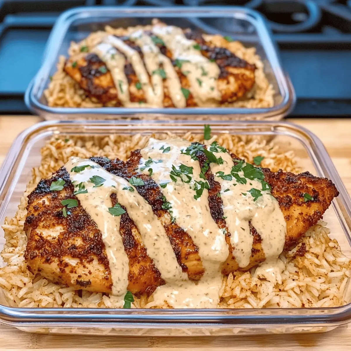 6. Serve: Layer the Cajun rice mixture on a platter, top with chicken slices, drizzle with creamy sauce, and garnish with chopped parsley.