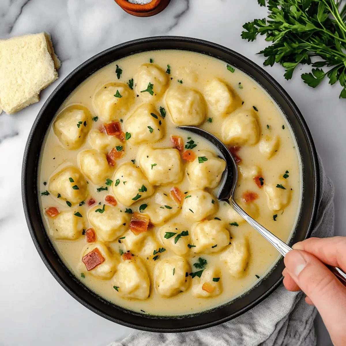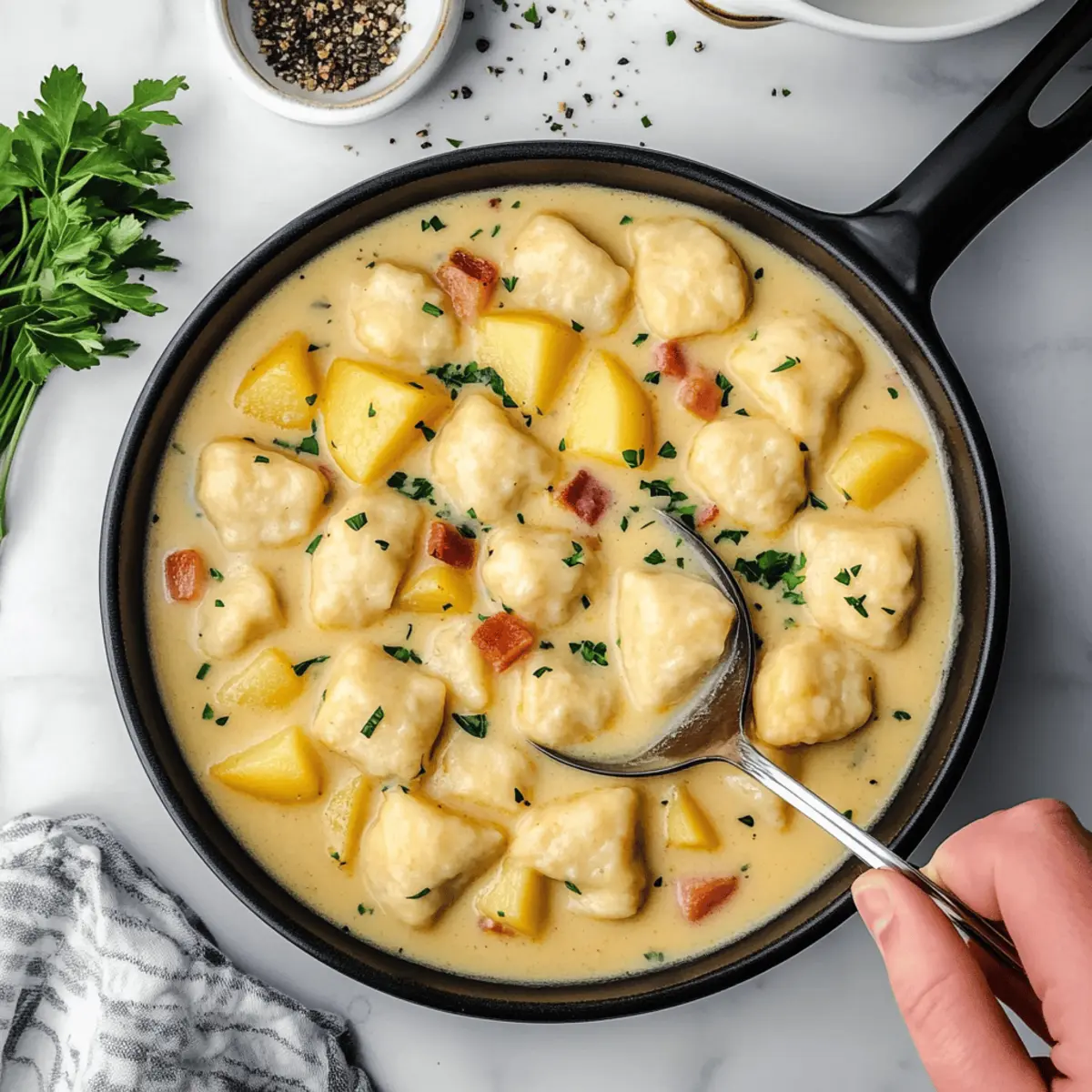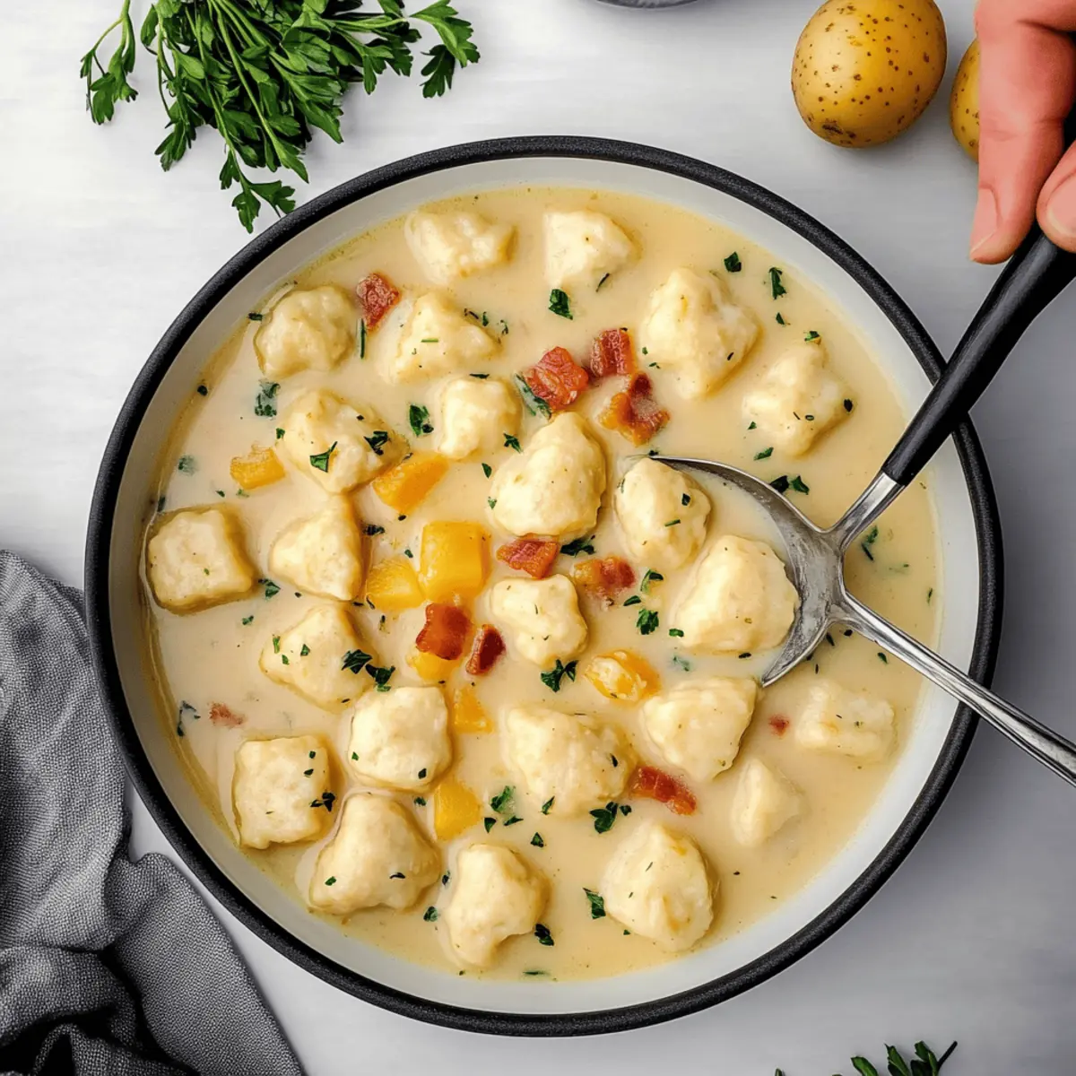 The comforting aroma of steamy broth wafted through my kitchen as I stirred the pot, instantly transporting me to the heart of the Midwest. Today, I’m sharing my take on Creamy Knoephla Soup, a delightful twist on the traditional German potato and dumpling soup that warms both body and soul. This recipe not only showcases buttery Yukon Gold potatoes creating a smooth, rich texture but also offers the added bonus of hearty, herb-infused dumplings that make for an unforgettable dining experience. Whether you’re looking to impress guests or simply wishing to treat yourself to a cozy night in, this soup is the answer to all your comfort food cravings. Ready to dive into a bowl of deliciousness that feels like a warm hug? Let’s get cooking! Why is Knoephla Soup the Ultimate Comfort Food? Nostalgic flavors transport you straight to Grandma’s kitchen, making each bowl feel like a warm hug. Simple preparation means you can whip it up even on a busy weekday, allowing you to enjoy homemade goodness without the fuss. Customizable ingredients make it easy to adapt this recipe according to your dietary needs—try it vegetarian or experiment with different herbs! And of course, rich, creamy texture paired with fluffy dumplings creates a delightful experience that friends and family will rave about. This Creamy Knoephla Soup is perfect for gatherings or cozy nights in, ensuring you’ll never want to reach for fast food again! Creamy Knoephla Soup Ingredients For the Soup Base • Bacon – Adds flavor and richness; you can omit it for a vegetarian option. • Butter – Used to sauté vegetables; substitute with olive oil for a dairy-free version. • Onions (1 cup, chopped) – Provides a flavorful base; shallots can be used for a milder taste. • Carrots (1 cup, chopped) – Adds natural sweetness and color; swap with parsnips if desired. • Celery (½ cup, chopped) – Enhances aroma and depth; omit if not available. • Garlic (2 cloves, minced) – Elevates the overall taste; garlic powder serves as a good fallback. • All-Purpose Flour (⅓ cup) – Essential for thickening the soup; use cornstarch for gluten-free options. • Bay Leaves (2) – Infuses aromatic flavor; remember to remove them before serving. • Low-Sodium Chicken Broth (8 cups) – The base for the soup; vegetable broth makes it vegetarian. • Potatoes (2 pounds, cubed) – Yukon Gold is preferred for its creamy texture; other potatoes work too. • Heavy Cream (1 cup) – Adds luscious richness; opt for coconut milk if dairy-free. • Salt and Pepper – Adjust to taste; using sea salt can elevate the flavor further. For the Dumplings • All-Purpose Flour (for dumplings) (3 cups) – Gives dumplings structure; gluten-free flour can be a great substitute. • Baking Powder (2 teaspoons) – Helps dumplings rise; ensure it’s fresh for optimal results. • Kosher Salt (1¼ teaspoons) – Seasoning for the dumpling dough; modify based on preference. • Chopped Parsley, Dill, Thyme (1 teaspoon each) – Provide fresh flavor in the dumplings; swap with herbs you enjoy. • Milk (1 cup) – Moistens the dumpling dough; non-dairy milk is a suitable alternative. • Egg (1) – Acts as a binder for dumpling ingredients; use a flaxseed egg for a vegan option. With these careful ingredient selections, you’re on your way to creating a deliciously comforting bowl of Creamy Knoephla Soup that will warm your heart and soul! Step‑by‑Step Instructions for Creamy Knoephla Soup Step 1: Cook the Bacon Begin by heating a large stockpot or Dutch oven over medium heat. Add chopped bacon and cook until crispy, which typically takes about 5-7 minutes. Be sure to stir occasionally for even cooking. Once done, use a slotted spoon to transfer the bacon to a paper towel-lined plate to drain, leaving the flavorful grease in the pot. Step 2: Sauté the Vegetables In the same pot with the bacon grease, add butter and let it melt over medium heat. Then, stir in chopped onions, carrots, and celery, cooking until they are softened and fragrant, approximately 5 minutes. Add minced garlic and cook for an additional 1-2 minutes, just until fragrant, stirring to avoid burning the garlic. Step 3: Thicken the Soup Base Sprinkle all-purpose flour into the vegetable mixture, stirring well to combine. Cook this mixture for about 2 minutes, allowing the flour to cook out and form a roux, which will thicken your Creamy Knoephla Soup. Gradually add in the low-sodium chicken broth while whisking continuously to avoid lumps, then toss in the bay leaves. Step 4: Add the Potatoes Once the broth is incorporated, add the cubed Yukon Gold potatoes to the pot. Bring the mixture to a gentle boil over medium-high heat, then reduce to a simmer. Allow the soup to cook uncovered for 20-30 minutes, or until the potatoes are tender and easily pierced with a fork. Step 5: Prepare the Dumpling Dough While the soup simmers, prepare the dumplings. In a large bowl, whisk together the all-purpose flour, baking powder, kosher salt, and chopped herbs. In a separate bowl, combine the milk and egg, whisking until well blended. Pour the wet ingredients into the dry mixture and stir until a shaggy dough forms, making sure not to overmix. Step 6: Shape and Cook Dumplings Turn the dough out onto a lightly floured surface and gently knead it a couple of times before cutting it into ½-inch squares. Once the potatoes are tender in the soup, drop the dumpling squares into the simmering broth. Ensure the soup temperature is around 180°F to 205°F and let the dumplings cook for about 5 minutes, or until they puff up and rise to the surface. Step 7: Finish the Soup With the dumplings cooked, gently stir in the heavy cream to add richness to your Creamy Knoephla Soup. Remove the bay leaves, taste the soup, and adjust seasoning with salt and pepper as needed. Serve hot, garnished with the reserved crispy bacon for a delightful crunch. How to Store and Freeze Creamy Knoephla Soup Fridg
