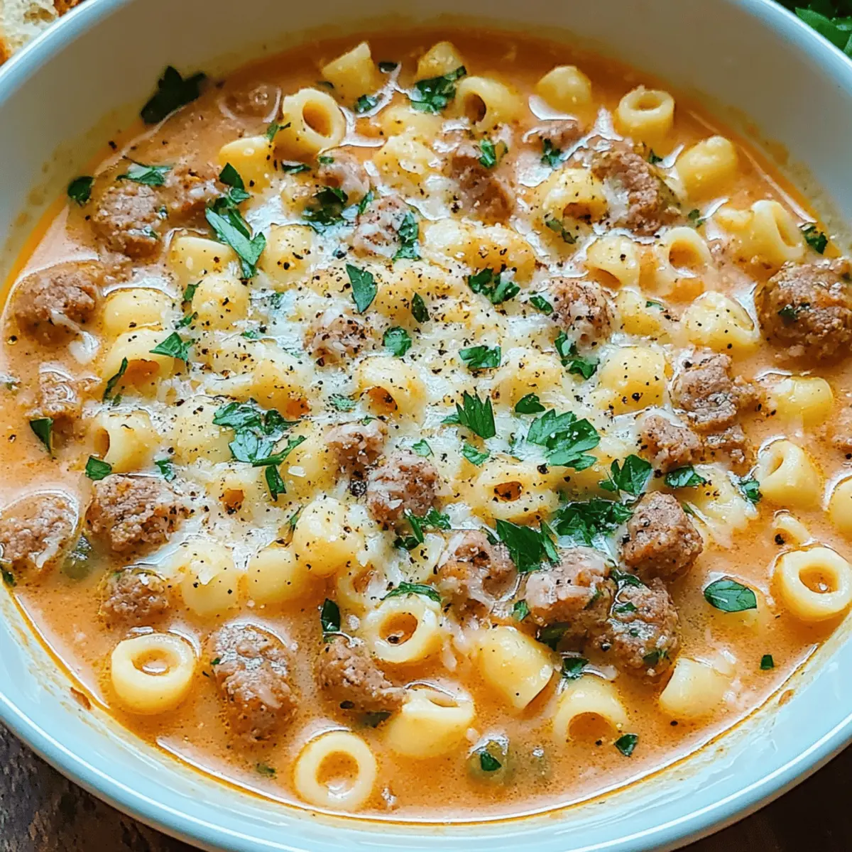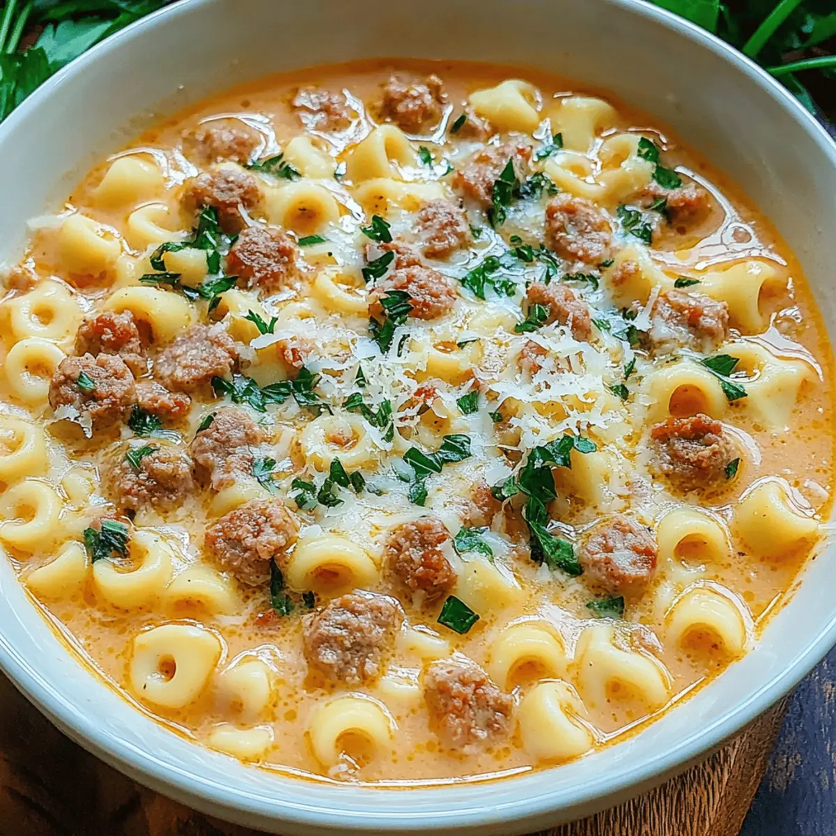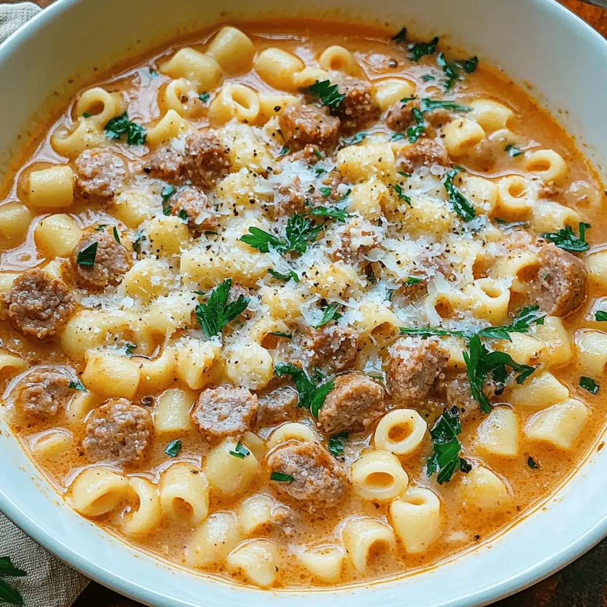 As the sun dips below the horizon on a brisk evening, the tantalizing scent of my Creamy Parmesan Italian Sausage Ditalini Soup fills the kitchen. With the perfect combination of savory sausage, rich cream, and tender pasta, this dish wraps around you like a warm hug, making it the ultimate comfort food. It’s not just about warming your belly; it’s an adaptable recipe that’s easy to whip up, even on the busiest weeknights. You can choose between spicy Italian sausage for a kick or lean turkey for a lighter touch, plus add in seasonal veggies like zucchini or spinach for a nutritious twist. Ready to dive into a bowl of cozy? Let’s get cooking! Why Is This Soup a Must-Try? Comforting Warmth: Every bowl of this Creamy Parmesan Italian Sausage Ditalini Soup offers a warm embrace, perfect for chilly evenings. Adaptable Recipe: Easily switch up sausage types or toss in seasonal veggies to suit your taste and mood. Quick Preparation: This soup comes together in under 30 minutes, making it a fantastic option for busy weeknights. Rich, Savory Flavor: The combination of creamy Parmesan and savory sausage creates an irresistible taste that will have your family coming back for seconds. Crowd-Pleasing Dish: Whether for a family dinner or a gathering with friends, this soup is sure to delight everyone at the table. Pair it with a side of warm, crusty Garlic Parmesan Focaccia for a complete meal experience! Creamy Parmesan Italian Sausage Ditalini Soup Ingredients For the Base • Italian Sausage – Provides hearty protein; substitute with turkey sausage for a leaner option. • Olive Oil – Essential for browning the sausage and sautéing vegetables. • Onion – Adds sweetness and depth; sauté until translucent for best flavor. • Garlic – Aromatic foundation of the soup; use fresh for optimal taste. • Diced Tomatoes – Contributes acidity and body to the broth; canned works well. • Chicken Stock – The flavorful base that ties the soup together; low-sodium is a good choice. For the Flavor • Dried Basil and Oregano – These herbs provide traditional Italian flavor. • Salt and Black Pepper – Essential for seasoning to taste. For the Soup • Ditalini Pasta – Small shape absorbs broth; toasting it first enhances nuttiness. • Heavy Cream – Creates a rich, creamy texture; alternatives include coconut cream for dairy-free options. • Parmesan Cheese – Adds a savory flavor; use freshly grated for melting quality. • Fresh Parsley – Brightens and garnishes the dish; swap for basil in summer. Feel the warmth of this Creamy Parmesan Italian Sausage Ditalini Soup as you gather these ingredients, ready to create a comforting meal that embraces you like a hug! Step‑by‑Step Instructions for Creamy Parmesan Italian Sausage Ditalini Soup Step 1: Brown the Sausage In a large pot over medium heat, drizzle a tablespoon of olive oil and add your Italian sausage. Use a wooden spoon to break up the sausage as it cooks, allowing it to brown for about 5-7 minutes until it’s no longer pink and has a nice caramelized color. Once cooked, remove the sausage from the pot and set it aside for later. Step 2: Sauté Aromatics In the same pot, add diced onions and minced garlic, stirring them together. Sauté for about 3-4 minutes, or until the onions become translucent and fragrant with a soft golden hue. This will create a delicious aromatic base for your Creamy Parmesan Italian Sausage Ditalini Soup, enhancing the overall flavor profile. Step 3: Simmer Soup Base Next, stir in the diced tomatoes and chicken stock, bringing the mixture to a gentle simmer. Add the dried basil and oregano, along with the browned sausage you set aside earlier. Allow everything to simmer together for about 10 minutes, so the flavors meld beautifully and create a hearty and comforting broth. Step 4: Cook Pasta Now, it’s time to add the ditalini pasta to the pot. Follow the package directions and cook it for approximately 7-9 minutes, ensuring it reaches al dente. If desired, toast the pasta in olive oil before adding it to bring out an even nuttier flavor in your delicious Creamy Parmesan Italian Sausage Ditalini Soup. Step 5: Finish with Cream and Cheese Once the pasta is cooked, lower the heat to medium-low and pour in the heavy cream along with freshly grated Parmesan cheese. Stir gently until everything is well combined and the cheese melts into the soup, creating that rich, creamy texture we all love. If needed, reserve some pasta water to adjust the soup consistency to your liking. Step 6: Season & Garnish Finally, taste your Creamy Parmesan Italian Sausage Ditalini Soup and season with salt and black pepper to your preference. Serve hot, garnished with freshly chopped parsley for a pop of color and flavor. Each bowl is now ready to offer you warmth and comfort on a chilly evening! Creamy Parmesan Italian Sausage Ditalini Soup Variations Feel free to add your own twist to the comforting flavors of this classic soup for a personalized touch! Spicy Italian: Use spicy Italian sausage instead of mild for a flavorful kick that warms your soul on chilly nights. Turkey Sausage: Swap in turkey sausage for a healthier, leaner option that still provides delicious flavor without sacrificing comfort. Vegetable Boost: Add seasonal veggies like chopped zucchini or fresh spinach to easily enhance nutrition and freshness; they pair beautifully with the soup. Gluten-Free: Substitute ditalini pasta with gluten-free pasta to enjoy a hearty, gluten-free version of your favorite soup without compromising taste. Coconut Cream: For a dairy-free option, replace heavy cream with coconut cream; it adds a subtle sweetness and richness that works well in this dish. Extra Herbs: Amp up the flavor by adding fresh herbs like thyme or rosemary to deepen the aromatic experience of your soup. Lemon Zest: A pop of lemon zest added just before serving brightens the flavors and offers a refreshing contrast to the creamy richness. Fanc