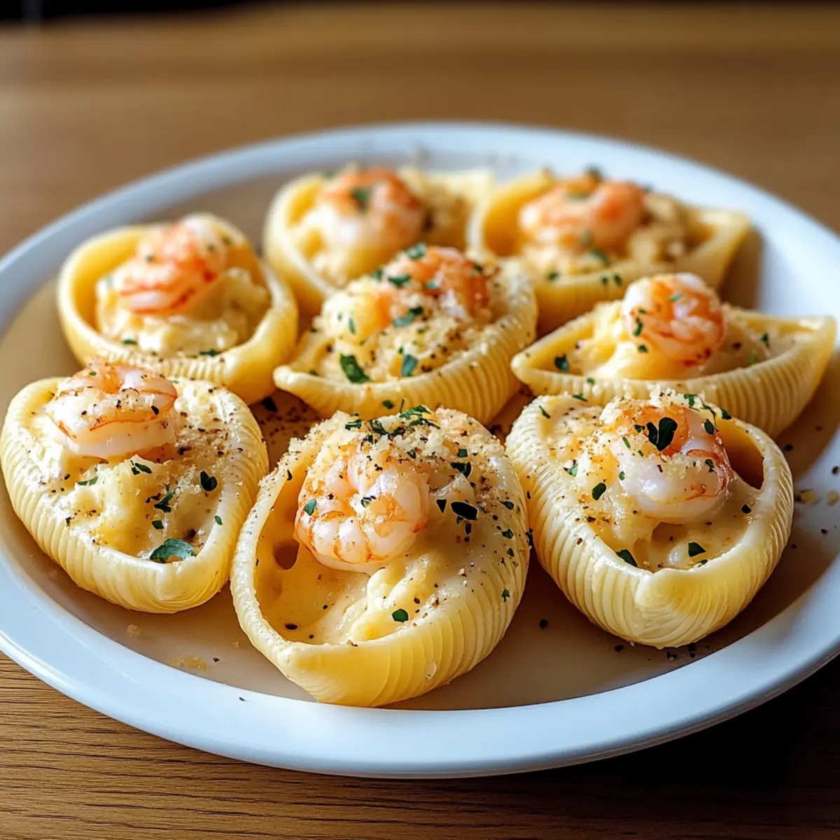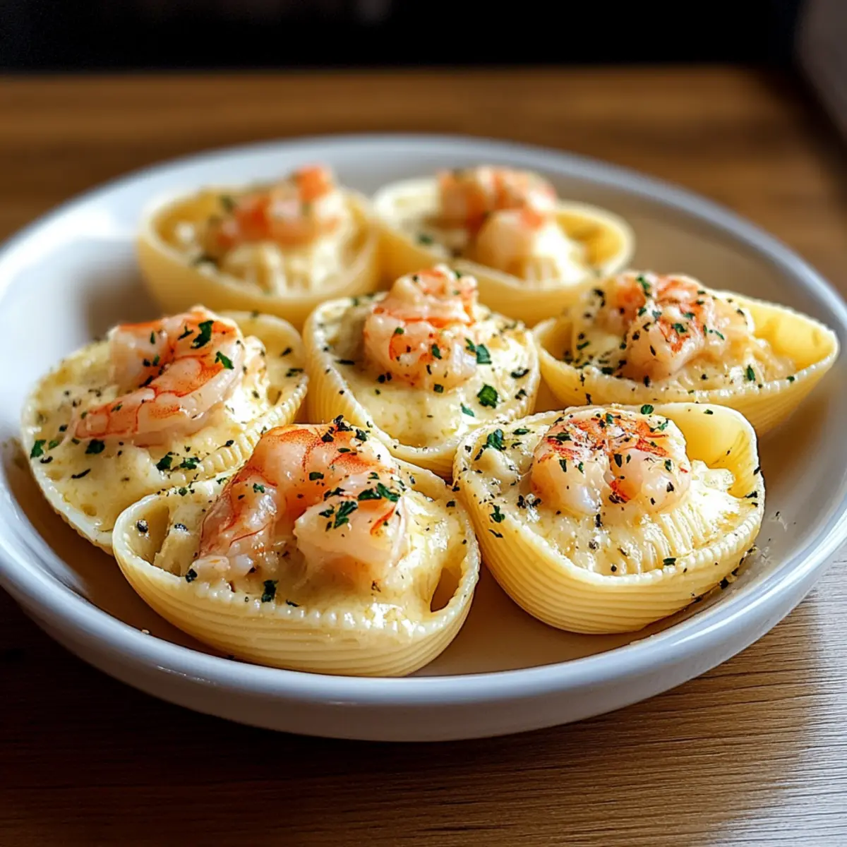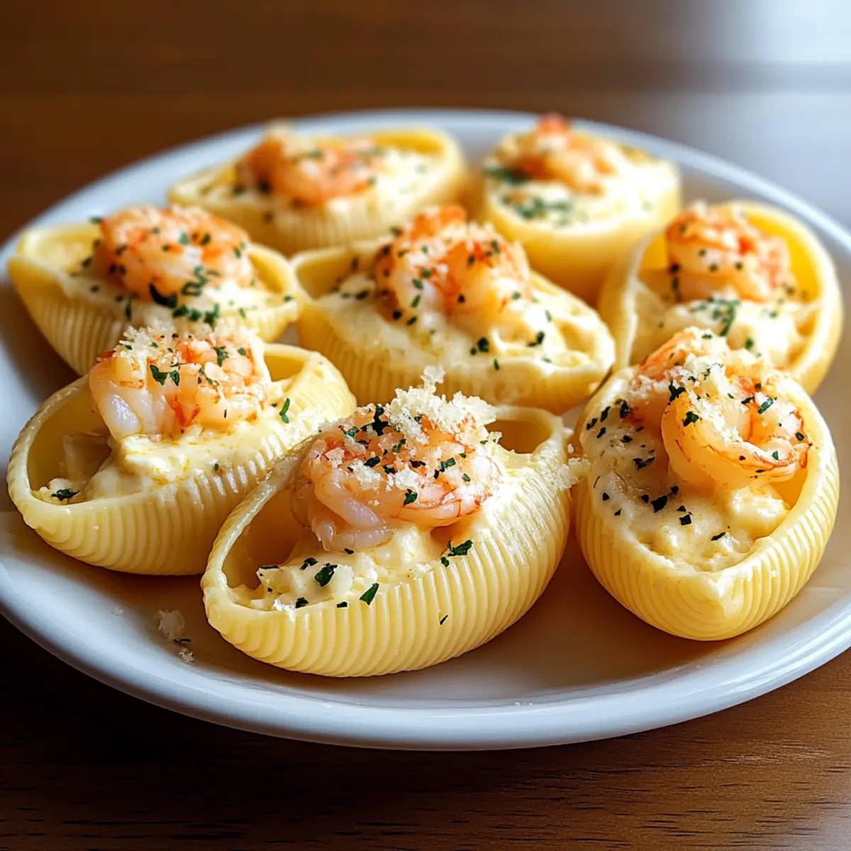As I stood in my kitchen, the warm aroma of bubbling cheese enveloped me like a cozy hug. This was the moment I knew I was about to create something special: Creamy Seafood Stuffed Shells. These delightful pasta pockets are not just a feast for the eyes; they pack a comforting punch with rich seafood and a velvety sauce that makes them perfect for intimate dinners or celebratory gatherings. What I love most about this recipe is how effortlessly indulgent it feels while being incredibly straightforward to prepare. Whether you’re wanting to impress guests or simply treat yourself to something delicious, this dish checks all the boxes. Are you ready to dive into a world of creamy goodness and seafood delight? Let’s get cooking! Why Choose Creamy Seafood Stuffed Shells? Indulgence Awaits: This recipe brings a luxurious touch to your dining table with its creamy texture and rich seafood flavor, making it a standout dish for any special occasion. Easy Preparation: With straightforward steps, you’ll create a gourmet meal without hours in the kitchen, perfect for both seasoned chefs and enthusiastic beginners. Customizable Delight: Feel free to experiment with different seafood or sauces for a personal touch, ensuring every serving is uniquely yours. Crowd-Pleasing Appeal: This comforting dish makes an impression, delighting family and friends alike, whether at casual gatherings or festive celebrations. Nutritional Boost: Packed with seafood, these stuffed shells offer not only decadence but also essential nutrients, proving that comfort food can be both delicious and wholesome. Ideal alongside a light salad or some garlic bread for the perfect meal experience! Creamy Seafood Stuffed Shells Ingredients For the Pasta • Large Pasta Shells (Conchiglie) – These are the perfect vessels for the seafood filling; if you can’t find them, manicotti or cannelloni work just as well. For the Seafood Filling • Seafood (Prawns, Crab) – Brings rich, oceanic flavors; feel free to substitute with scallops or lobster for a gourmet twist. • Cream Cheese – Adds a luscious creaminess to the filling; both store-bought or homemade varieties are great options. For the Sauce • Parmesan Cheese – Infuses the sauce with savory depth; you can swap it for a similar hard cheese if desired. • Milk – Creates a smooth, creamy base for the sauce; plant-based milk is an excellent alternative for a dairy-free version. • Seasonings (Garlic, Herbs, Salt, Pepper) – Enhances the overall flavor profile; adjust according to your preferences, and consider using fresh herbs for a brighter taste. This Creamy Seafood Stuffed Shells recipe not only elevates your home cooking but also ensures that every bite is a pleasurable experience! Step‑by‑Step Instructions for Creamy Seafood Stuffed Shells Step 1: Prepare the Pasta Begin by boiling a large pot of salted water. Cook the large pasta shells (conchiglie) for about 8-10 minutes until al dente, stirring occasionally to prevent sticking. Once cooked, drain the shells and immediately rinse them under cool water to halt the cooking process. This step will make filling the creamy seafood stuffed shells easier and prevent them from becoming mushy. Step 2: Make the Seafood Filling In a mixing bowl, combine your choice of seafood, such as prawns and crab, that have been cooked and chopped. Add softened cream cheese along with your selected seasonings, including garlic and herbs. Use a spatula to blend the mixture until smooth and well combined, ensuring the seafood filling is creamy and flavorful. This filling will provide the indulgent heart of the creamy seafood stuffed shells. Step 3: Prepare the Sauce In a medium saucepan over medium heat, melt butter until bubbly, then whisk in flour to create a roux, cooking for about 1-2 minutes until golden. Gradually whisk in milk, stirring continuously for about 5-7 minutes until the sauce thickens and is completely smooth. Remove from heat, stir in grated Parmesan cheese until melted, and season with salt and pepper. This creamy sauce will enhance the overall flavor of your stuffed shells. Step 4: Fill the Shells Carefully take each pasta shell and spoon the rich seafood filling into it, until they are generously packed but not overflowing. Place the filled shells in a greased baking dish, ensuring they are arranged in a single layer. This assembly is crucial for maintaining even cooking and allows the creamy seafood stuffed shells to blend beautifully with the sauce in the next step. Step 5: Assemble the Dish Once all the shells are filled and arranged, pour the prepared creamy sauce evenly over the top of the stuffed shells. If desired, sprinkle additional Parmesan cheese over the sauce for that extra cheesy touch. This layer will bake beautifully, creating a comforting, golden crust that enhances the visual appeal of your creamy seafood stuffed shells. Step 6: Bake Preheat your oven to 180°C (160°C Fan). Cover the baking dish with foil and bake for approximately 25-30 minutes, or until the sauce is bubbly and the shells are heated through. For a delightful finish, remove the foil for the last 5 minutes to allow the cheese to become golden brown. This baking step transforms the creamy seafood stuffed shells into a warm and enticing dish ready to impress your guests. Expert Tips for Creamy Seafood Stuffed Shells Quality Seafood Matters: Using the freshest prawns or crab will elevate the flavor significantly. Always ensure seafood is fully thawed and patted dry for the best results. Perfect Pasta Cooking: Cook the large pasta shells just until al dente; they’ll finish cooking while baking. Rinse promptly under cold water to prevent mushiness. Advance Prep Help: This Creamy Seafood Stuffed Shells dish can be assembled ahead of time and stored in the refrigerator. Just add an extra 10 minutes to the baking time if baking from chilled. Seasoning Essentials: Tasting your filling and sauce will ensure balanced flavors. Adj