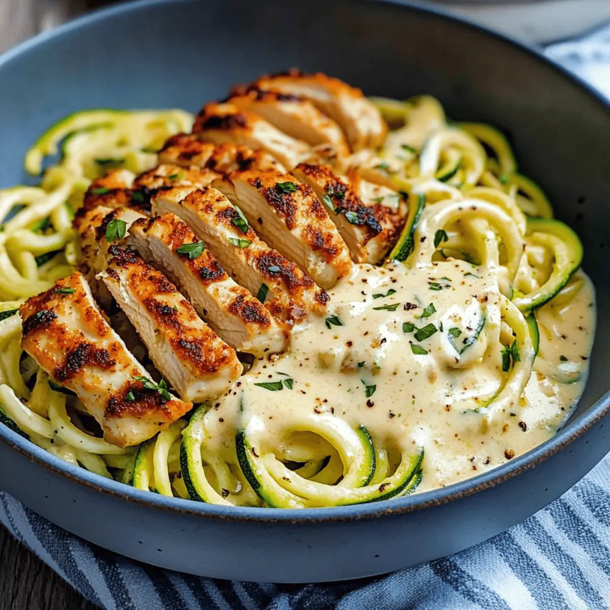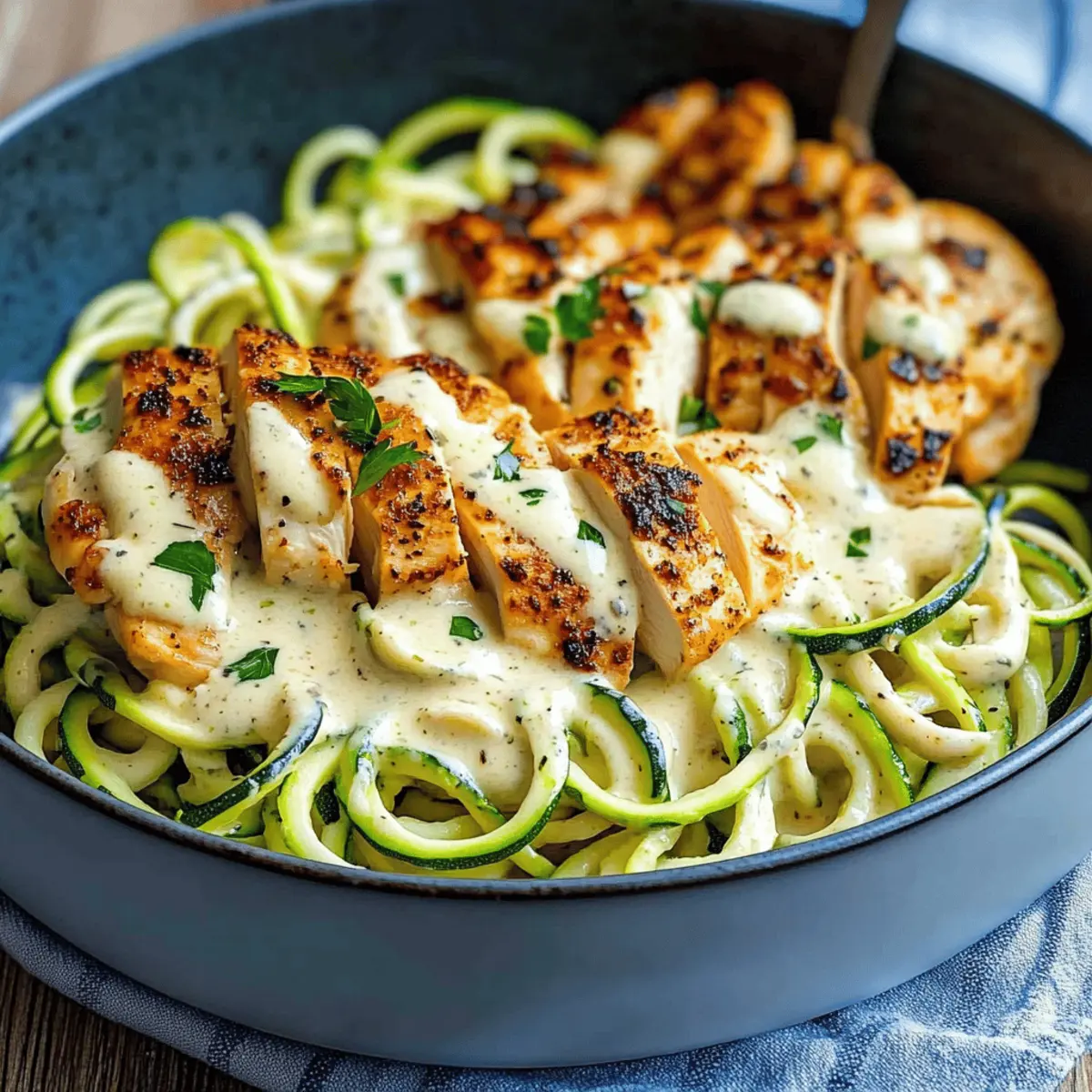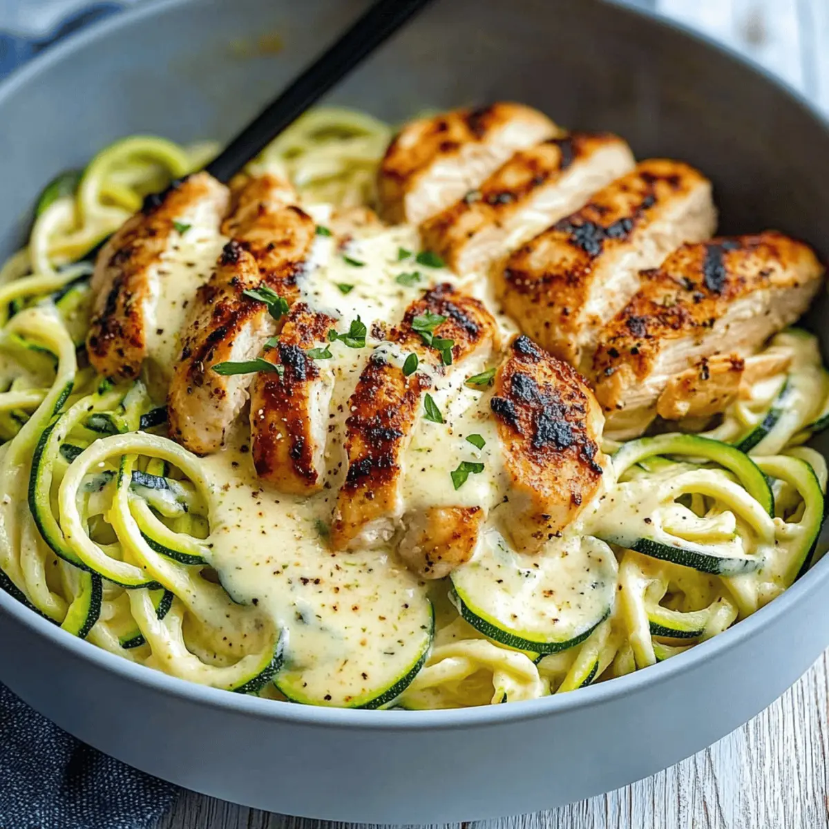 As I stood in my kitchen, the aroma of sizzling garlic wafted through the air, instantly transporting me to a cozy Italian trattoria. That’s the magic of my Creamy Zucchini Noodle Chicken Alfredo—a low-carb twist on a classic favorite that’s become my go-to weeknight dinner! In just 35 minutes, you can whip up this deliciously creamy meal that’s both satisfying and guilt-free. The tender zucchini noodles serve as the perfect base, soaking up the rich Alfredo sauce with garlicky chicken and a sprinkle of Parmesan. Not only is this recipe easy to prepare, but it’s also a healthy comfort food option for those busy nights when you want something hearty without the carbs. Are you ready to bring a taste of Italy home with a lighter touch? Let’s dive into this delightful recipe! Why is this Chicken Alfredo so special? Creamy Indulgence: This recipe offers all the flavors of traditional Alfredo without the guilt, making it a healthy alternative. Quick Prep Time: Ready in just 35 minutes, it’s perfect for those busy weeknights when you crave comfort food fast. Low-Carb Goodness: You won’t miss the pasta with zucchini noodles soaking up that rich, flavorful sauce, keeping your meal light and nutritious. Versatile Base: Feel free to customize it with added veggies like spinach or sun-dried tomatoes for an extra flavor boost! Crowd-Pleasing Comfort: Ideal for both family dinners and entertaining guests, it’s sure to impress anyone craving gourmet at home. Explore more delicious alternatives like these Chicken Alfredo Sloppy or Creamy Chicken Tortilla Wraps for varied flavors on your dinner table! Creamy Zucchini Noodle Chicken Alfredo Ingredients For the Zucchini Noodles • Zucchini – Serves as a fantastic low-carb pasta alternative; you can use pre-spiralized zucchini for convenience. For the Chicken • Boneless, Skinless Chicken Breasts – Thin slicing ensures quick cooking; this lean protein keeps the dish healthy. • Kosher Salt – Essential for seasoning; adjust according to taste preference. • Black Pepper – Freshly ground adds aromatic heat and flavor; sprinkle generously for best results. • Butter – Adds richness when sautéing the chicken, enhancing the overall flavor. • Garlic – Infuses the dish with bold flavor that elevates every bite. For the Alfredo Sauce • Heavy Cream – This forms the creamy base for the sauce; non-dairy alternatives work too if preferred. • Parmesan Cheese – Provides a rich, nutty flavor that thickens the sauce; opt for freshly grated for maximum taste. • Fresh Parsley – Brightens the dish with its vibrant color and fresh herby touch; extra parsley can be used for garnishing if desired. This Creamy Zucchini Noodle Chicken Alfredo is a dish that brings all the delicious comfort while remaining health-conscious—perfect for a delightful dinner that won’t weigh you down! Step‑by‑Step Instructions for Creamy Zucchini Noodle Chicken Alfredo Step 1: Prepare Zucchini Noodles Start by spiralizing fresh zucchini using a spiralizer or a vegetable peeler to create thin, noodle-like strands. If you prefer convenience, you can use pre-spiralized zucchini available at the store. Once spiraled, place the zucchini noodles in a microwave-safe bowl, cover them, and microwave for 1-2 minutes until slightly softened. After microwaving, drain any excess water to prevent a watery sauce later. Step 2: Cook Chicken In a large skillet, melt 2 tablespoons of butter over medium heat. Once melted, add the thinly sliced boneless, skinless chicken breasts, seasoning them generously with kosher salt, freshly ground black pepper, and minced garlic. Cook for about 7 minutes, stirring occasionally, until the chicken is fully cooked and golden brown. Remove the cooked chicken from the skillet and set it aside on a plate. Step 3: Make Alfredo Sauce In the same skillet where you cooked the chicken, pour in 1 cup of heavy cream and bring it to a gentle boil over medium heat. Stir in 1 cup of freshly grated Parmesan cheese and a sprinkle of chopped fresh parsley. Allow the sauce to simmer for 3-5 minutes, stirring frequently, until it thickens to a creamy consistency that coats the back of a spoon beautifully. Step 4: Combine Chicken and Sauce Return the cooked chicken to the skillet, gently stirring to coat it evenly in the creamy Alfredo sauce. Ensure that every piece of chicken is enveloped in that luscious sauce for maximum flavor. This is where your Creamy Zucchini Noodle Chicken Alfredo starts coming together, creating an enticing aroma as the flavors meld beautifully. Step 5: Add Zucchini Noodles Now, add the softened zucchini noodles to the skillet with the chicken and Alfredo sauce. Gently toss everything together until the zucchini noodles are fully coated with the sauce, allowing them to absorb the creamy goodness. Cook for an additional 1-2 minutes, just enough to heat through without overcooking the zucchini, which should retain a slight crunch. Step 6: Serve and Garnish Plate your delicious Creamy Zucchini Noodle Chicken Alfredo and serve it immediately. For an extra touch, garnish each serving with additional grated Parmesan cheese and a sprinkle of fresh parsley. This not only enhances the dish visually but adds an inviting burst of flavor as well. Enjoy your healthy, low-carb delight! Creamy Zucchini Noodle Chicken Alfredo Variations Get creative and make this dish your own with a few easy twists that elevate your dining experience! Extra Veggies: Add spinach or sun-dried tomatoes for a pop of color and flavor. These additions not only enhance nutrition but also bring a delightful taste that pairs beautifully with the creamy sauce. Dairy-Free Delight: Substitute heavy cream with coconut cream for a luscious dairy-free alternative. This swap offers a subtle sweetness while keeping the creaminess intact, perfect for those avoiding dairy. Cheese Switch-Up: Try Pecorino Romano instead of Parmesan for a bolder flavor. Its saltiness adds d