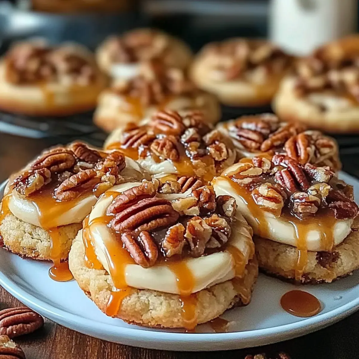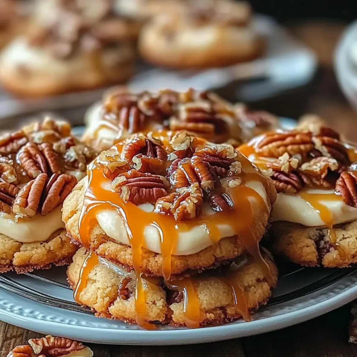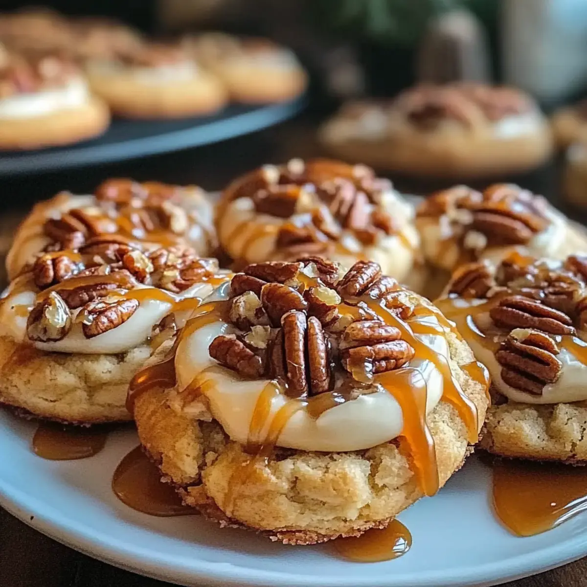 Once baked, remove your cookies from the oven and immediately drizzle warm caramel sauce over the tops. If desired, prepare the optional cream cheese frosting by mixing 4 ounces of cream cheese with 1 cup of powdered sugar and 1 tablespoon of fresh lemon juice until smooth. Frost the cooled cookies generously and sprinkle the reserved pecans on top for a delightful finishing touch.