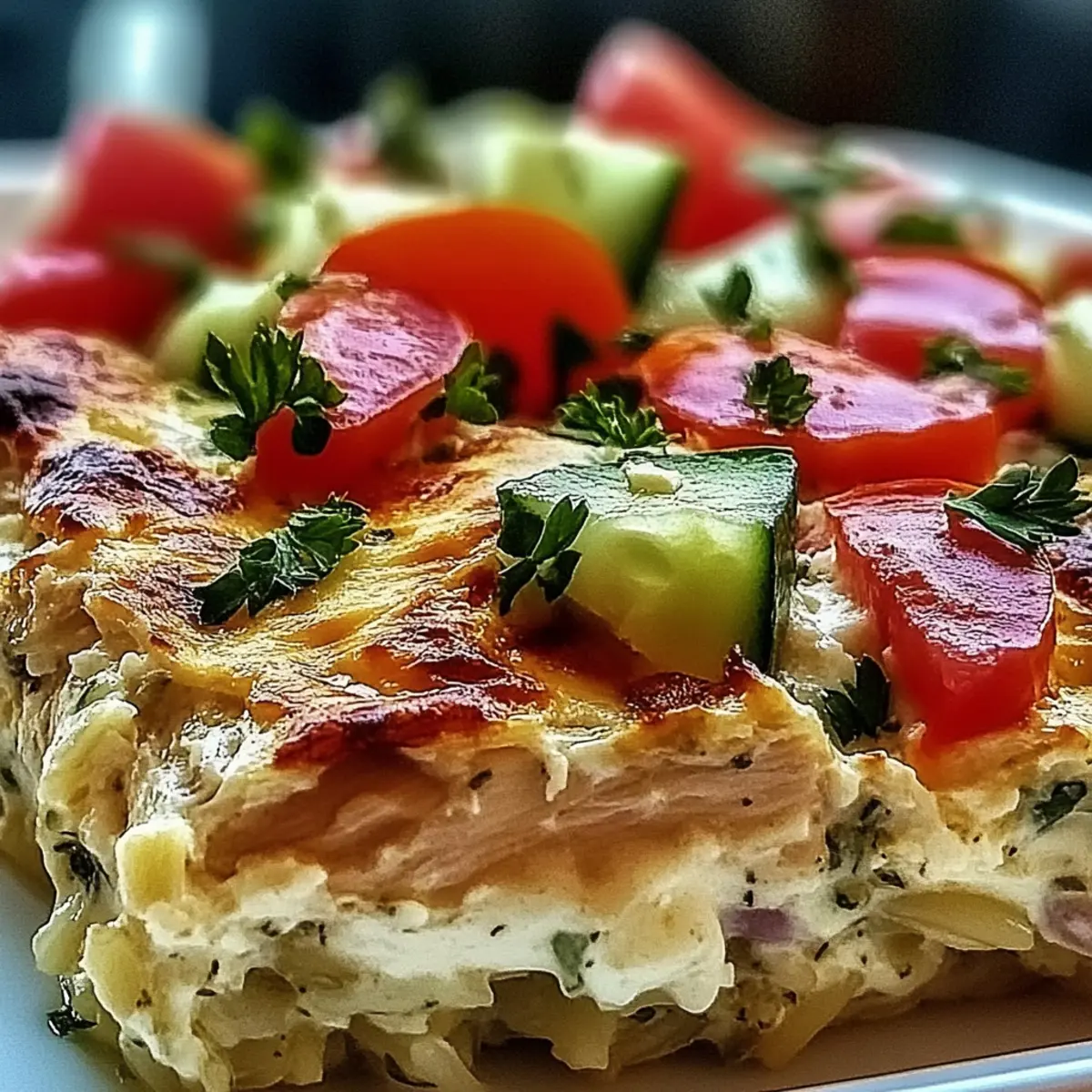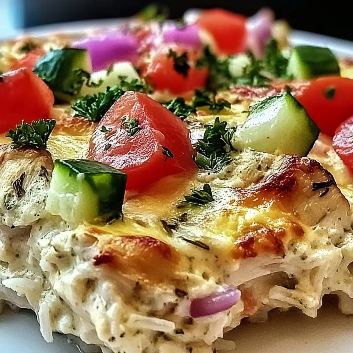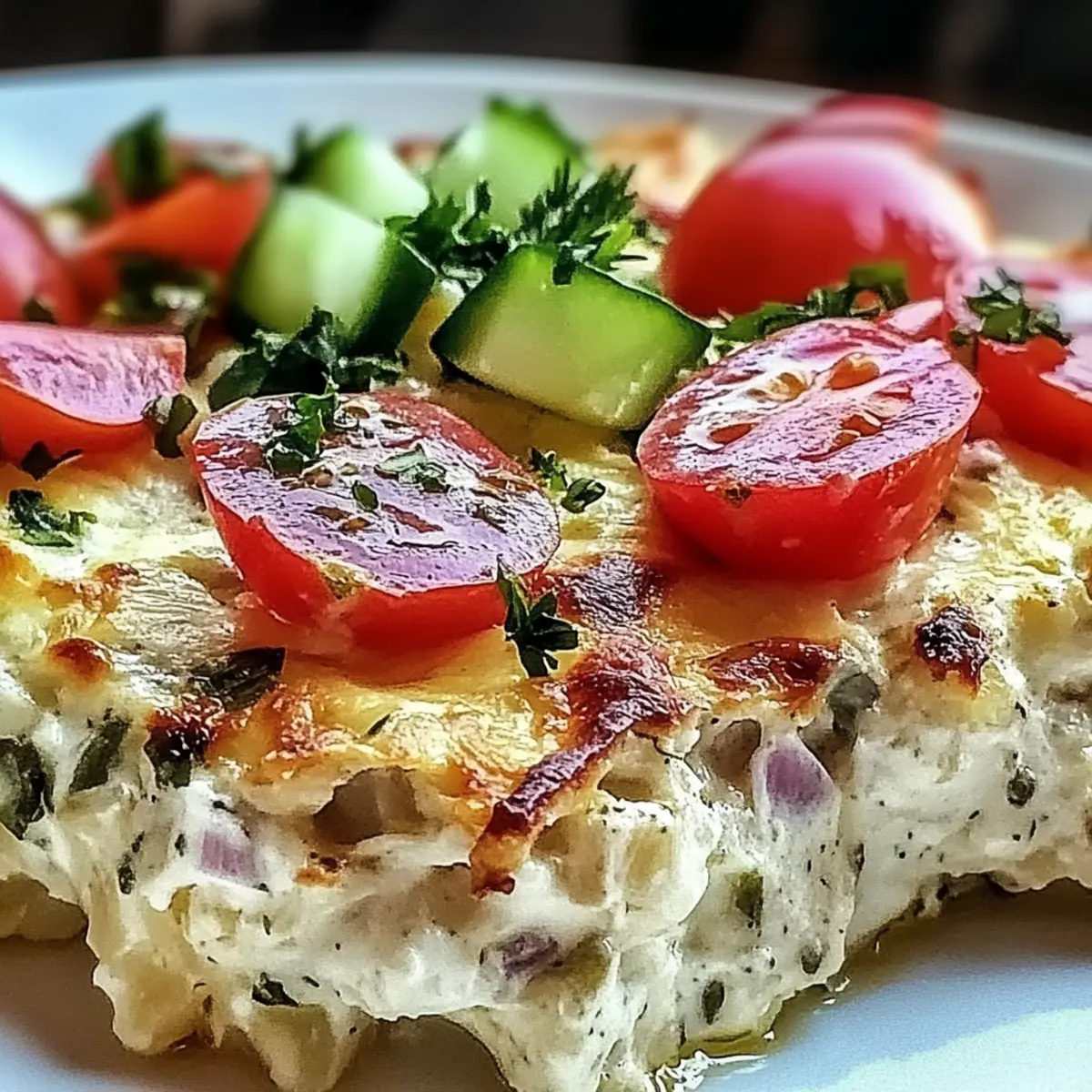 As I tossed the last sprinkle of feta cheese over my bubbling casserole, a warm wave of Mediterranean nostalgia washed over me. The Dump and Bake Chicken Tzatziki Casserole isn’t just a meal; it’s a weeknight lifesaver. With just one pan and under ten dollars, this dish serves an entire family, effortlessly merging the tangy creaminess of tzatziki with tender chicken and fluffy rice. Not only does it offer a comforting taste experience, but it also ticks off the boxes for being budget-friendly and simple to prepare. Plus, this recipe is easily adaptable, allowing you to swap in chickpeas or turkey if you’re feeling adventurous. Curious what it looks like coming out of the oven? Let’s uncover that deliciousness together! Why Is This Casserole a Winner? Convenience: This one-pan dish means minimal cleanup, making it ideal for busy nights. Budget-Friendly: A family meal for under ten dollars ensures you don’t break the bank. Versatility: Easily swap chicken for turkey or chickpeas for a delightful vegetarian twist. Flavor Explosion: The creamy tzatziki blends beautifully with juicy chicken and fresh veggies. Meal Prep Friendly: Assemble in advance for quick dinners throughout the week! Plus, serve it alongside a crisp Greek salad or some garlic bread, and you’ve got a feast worthy of any occasion! Dump and Bake Chicken Tzatziki Casserole Ingredients For the Casserole • Cooked Chicken – Adds heartiness that pairs perfectly with tzatziki and rice; can be substituted with cooked turkey for a lighter option. • White Rice (uncooked) – Soaks up luscious flavors from the chicken broth and tzatziki, creating a delightful base. • Chicken Broth – Essential for cooking the rice properly and brings depth of flavor; opt for low-sodium for a healthier choice. • Cucumber (diced) – Gives a refreshing bite, balancing the richer components of the casserole. • Red Onion (finely chopped) – Introduces mellowed sweetness, enhancing the aromatic flavor profile. • Grape Tomatoes (halved) – Adds vibrant color, bursts of sweetness, and moisture to each bite. • Kalamata Olives (pitted and sliced) – Offers a briny contrast that elevates the flavor of the dish. • Tzatziki Sauce – The creamy hero that ties all ingredients together, providing a classic Mediterranean flair. • Garlic Powder – Boosts the savory notes for a more robust flavor. • Dried Oregano – Brings earthy depth that complements the tzatziki well. • Salt and Pepper – Essential for seasoning and balancing all the flavors perfectly. • Feta Cheese (crumbled) – Melts into a tangy finish when baked, enhancing the dish’s overall character. • Fresh Parsley (chopped) – A bright garnish that elevates both the presentation and freshness. Step‑by‑Step Instructions for Dump and Bake Chicken Tzatziki Casserole Step 1: Preheat the Oven Begin by preheating your oven to 375°F (190°C). This ensures that when you put your Dump and Bake Chicken Tzatziki Casserole in, it will bake evenly and thoroughly. Step 2: Prepare the Baking Dish Lightly grease a 9×13-inch baking dish with a little olive oil or cooking spray. This will prevent the ingredients from sticking and help you achieve that perfect golden finish, making cleanup easier too. Step 3: Layer the Rice Spread the uncooked white rice evenly across the bottom of the greased baking dish. Make sure to cover the entire base to create a foundation that will soak up the flavorful chicken broth during baking, guaranteeing perfectly cooked rice. Step 4: Add the Broth Pour the chicken broth over the rice, ensuring it is completely submerged. This step is essential for proper rice cooking, allowing it to absorb the savory flavors while it bakes, turning your casserole into a tasty meal. Step 5: Add the Chicken Distribute the cooked chicken evenly over the rice layer. This hearty addition will help make your Dump and Bake Chicken Tzatziki Casserole filling and satisfying, ensuring everyone at the table enjoys a generous portion. Step 6: Scatter the Veggies Now scatter the diced cucumber, finely chopped red onion, halved grape tomatoes, and sliced Kalamata olives atop the chicken. This colorful mix will add freshness and crunch, enhancing both the flavor and visual appeal of your casserole. Step 7: Mix the Tzatziki Sauce In a separate bowl, mix the tzatziki sauce, garlic powder, dried oregano, salt, and pepper until combined. This creamy mixture is the star of your Dump and Bake Chicken Tzatziki Casserole, tying all the ingredients together beautifully. Step 8: Spread the Sauce Evenly spread the tzatziki mixture over the layered ingredients in the dish. Make sure to cover everything well; this will create a flavorful, creamy layer that melds perfectly with the chicken and rice as it bakes. Step 9: Sprinkle Feta Cheese Generously sprinkle crumbled feta cheese on top of the casserole. As it bakes, the feta will melt slightly and become golden, adding a wonderful tangy finish that enhances the overall flavor of the dish. Step 10: Bake Covered Cover the dish tightly with aluminum foil and bake in the preheated oven for 45 minutes. This step allows the casserole to steam, ensuring the rice cooks completely while locking in that delightful moisture. Step 11: Final Bake Uncovered After 45 minutes, remove the foil and bake for an additional 10 minutes, or until the feta is golden and the casserole is bubbling. Keep an eye on it during this time, as you want that delicious crust to form without overcooking. Step 12: Cool and Garnish Once done, allow the casserole to cool for a few minutes. Garnish with freshly chopped parsley for a pop of color and brightness before serving. This little touch not only elevates presentation but adds a refreshing flavor to your delicious dump and bake feast! How to Store and Freeze Dump and Bake Chicken Tzatziki Casserole Fridge: Store leftovers in an airtight container for up to 3 days. Reheat gently in the oven or microwave, ensuring th