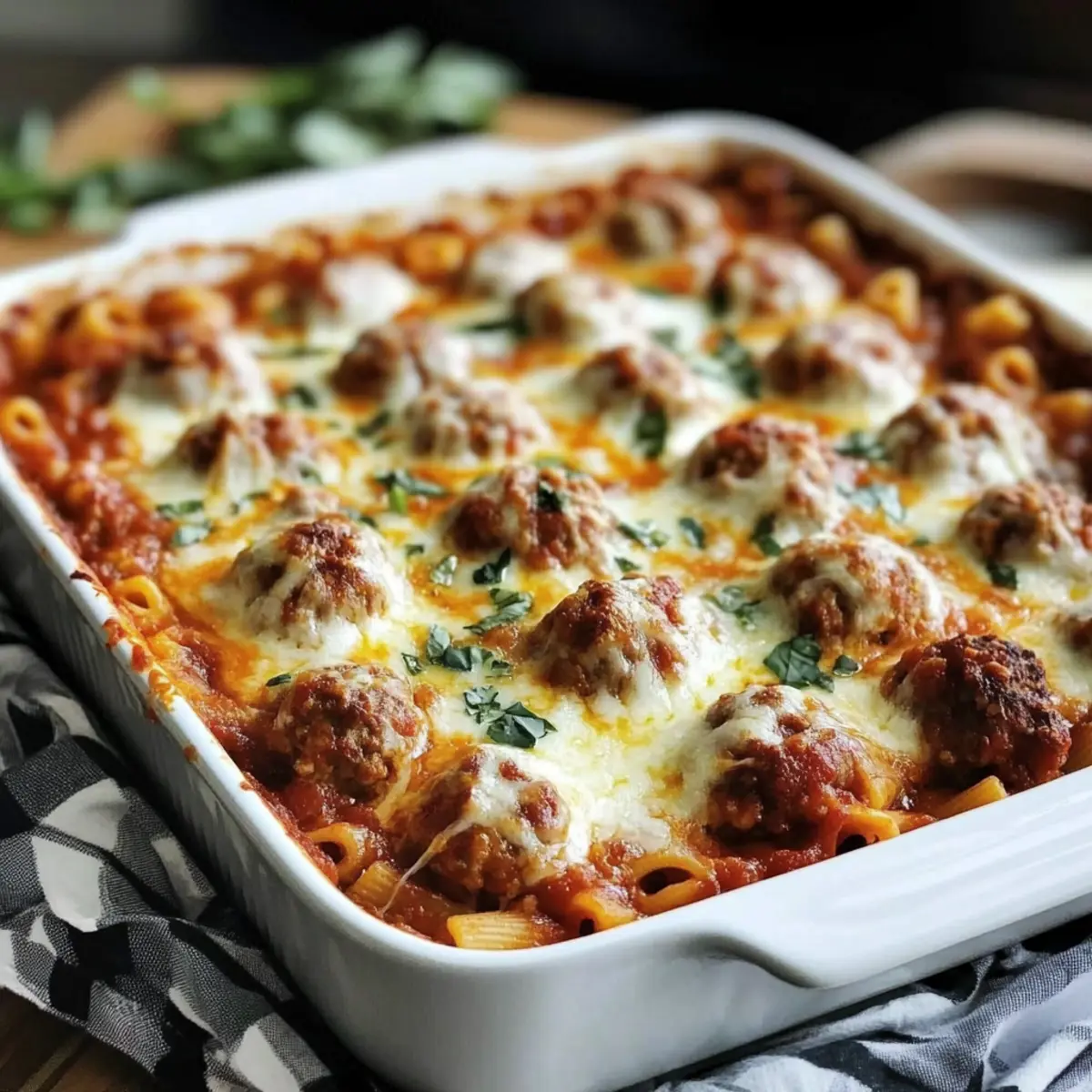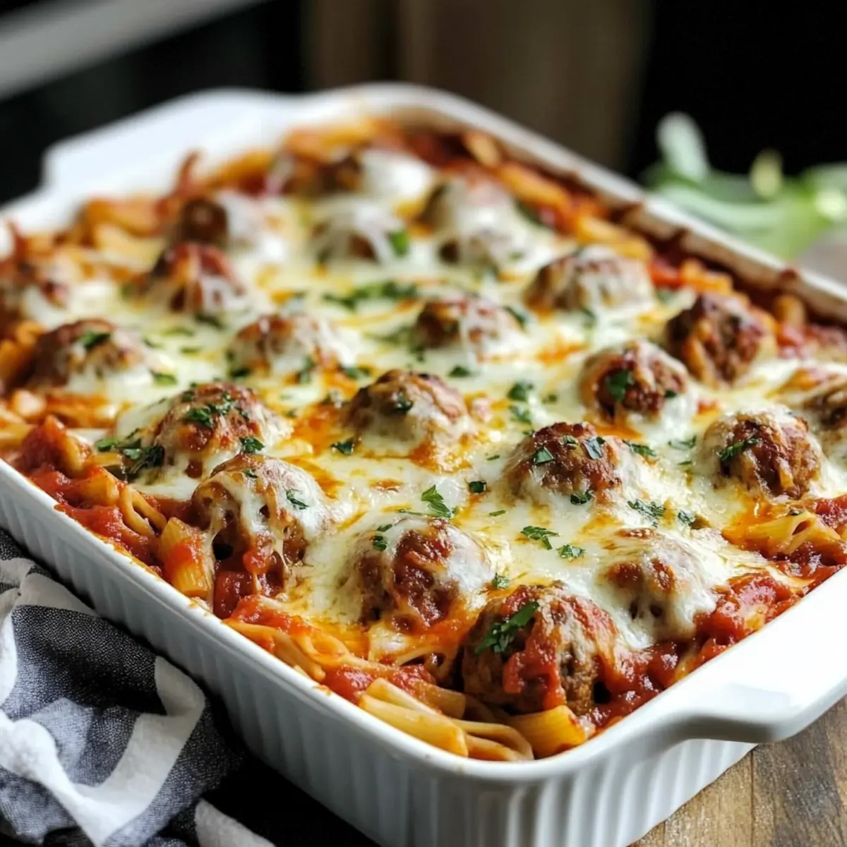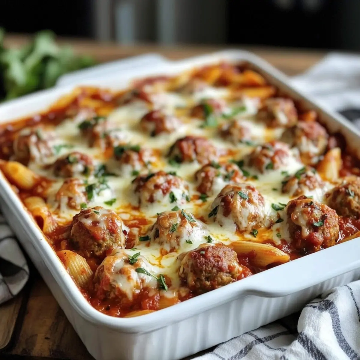 As the evening rush hour approaches, my kitchen transforms into a cozy sanctuary filled with the aroma of Italian comfort. In less than 90 minutes, you can whip up this Easy Dump and Bake Meatball Casserole, a dish that simplifies dinner without skimping on flavor. Here’s the magic: uncooked pasta cooks right in a savory marinara sauce, soaking up all that goodness, while melty mozzarella graces the top like a warm hug. Perfect for busy weeknights and potlucks, this kid-friendly meal checks off all the boxes for a hearty, satisfying feast. Trust me, your family will love it—especially those little ones who are always looking for something delicious! Are you ready to dive into this cheesy masterpiece? Why is this the ultimate casserole? Simplicity at Its Best: This dump-and-bake meatball casserole is as easy as it gets! You’ll only need basic kitchen skills to create a dish that impresses. Flavorful Comfort: With rich marinara sauce and gooey melted mozzarella, each bite is a delightful experience reminiscent of your favorite Italian meals. Kid-Approved: Perfect for families, this kid-friendly dish is sure to satisfy even the pickiest eaters, making dinner less of a battle. Versatile Variations: Feel free to swap out ingredients like meatballs or pasta types—making it your own is part of the fun! For a breakfast twist, check out my Eggs Benedict Casserole. Convenient Make-Ahead Option: You can prep this casserole ahead of time, making it an ideal choice for potlucks; just pop it in the oven when ready! Crowd-Pleasing Appeal: Whether for a weeknight dinner or a gathering, this dish promises to be a hit with everyone at the table! Dump-and-Bake Meatball Casserole Ingredients • Here’s what you’ll need to create this comforting dish! For the Casserole Base Uncooked Short Pasta (1 lb) – This forms the structure of your casserole; penne, ziti, or rigatoni are great substitutes! Marinara or Pasta Sauce (1 jar, 24–26 oz) – Adds delicious flavor and moisture; choose your favorite for best results. Water or Low-Sodium Beef Broth (3 cups) – Hydrates the pasta as it bakes; broth brings a richer taste to the dish. For the Meatballs Frozen Pre-Cooked Meatballs (1 lb) – They provide a hearty protein boost; for a homemade alternative, ensure they’re cooked properly. For Seasoning Garlic Powder (1 tsp) – Adds depth of flavor; fresh garlic is an alternative, though it requires a bit more prep! Italian Seasoning (1 tsp) – Infuses aromatic herbs into the dish; don’t hesitate to adjust to your taste. Salt (½ tsp) & Black Pepper (¼ tsp) – Season to your preference; keep in mind the saltiness of your sauce. For the Cheesy Topping Shredded Mozzarella (2 cups) – Creates that irresistible gooey topping; you can swap in dairy-free cheese if preferred. Grated Parmesan (optional, ½ cup) – Adds savory notes and enhances umami; it’s not mandatory but so delightful! For Garnish Fresh Parsley (2 tbsp, chopped) – This brightens up your casserole, adding freshness and a pop of color to the dish. Dive right into making your dump-and-bake meatball casserole with these simple yet essential ingredients! Step‑by‑Step Instructions for Dump-and-Bake Meatball Casserole Step 1: Preheat the Oven Begin by preheating your oven to 400°F (200°C). While the oven warms up, lightly grease a 9×13-inch baking dish with cooking spray or olive oil to prevent sticking. This will ensure your dump-and-bake meatball casserole comes out effortlessly when it’s ready to serve. Step 2: Prepare the Base In your greased baking dish, combine 1 pound of uncooked short pasta with 24–26 ounces of marinara or pasta sauce. Pour in 3 cups of water or low-sodium beef broth, stirring gently to mix. Season the mixture with 1 teaspoon of garlic powder, 1 teaspoon of Italian seasoning, ½ teaspoon of salt, and ¼ teaspoon of black pepper—make sure the pasta is fully submerged for even cooking. Step 3: Add the Meatballs Next, take your 1 pound of frozen pre-cooked meatballs and nestle them evenly into the pasta mixture. This step not only adds protein but also infuses the casserole with delightful flavor as it bakes. Ensure the meatballs are spaced out for optimal heating, allowing each one to absorb the delicious sauce. Step 4: Bake Covered Cover the baking dish tightly with aluminum foil, making sure the edges are crimped down securely. Place it in the preheated oven and bake for 35–40 minutes. This covered cooking will create steam, allowing the pasta to soften beautifully and cook through. Step 5: Add Cheese After 35–40 minutes, carefully remove the foil from the baking dish. Sprinkle 2 cups of shredded mozzarella and, if desired, ½ cup of grated Parmesan cheese evenly over the top. Return the casserole to the oven uncovered, allowing it to bake for an additional 10–15 minutes until the cheese melts and becomes bubbly, creating a golden, delicious crust. Step 6: Rest & Serve Once baked, take the casserole out of the oven and let it cool for about 10–15 minutes. Giving it this resting time allows the flavors to meld and will help you serve cleaner slices. Finally, garnish with 2 tablespoons of chopped fresh parsley for a pop of color and freshness before serving warm. How to Store and Freeze Dump-and-Bake Meatball Casserole Fridge: Store any leftover casserole in an airtight container for up to 3 days. Reheat in the microwave or oven until warmed through for a quick meal. Freezer: For longer storage, freeze the assembled casserole (before baking) in a tightly covered dish for up to 3 months. When ready to bake, thaw overnight in the fridge and follow baking instructions as usual. Reheating: Reheat individual portions in the microwave for about 2–3 minutes. If reheating the whole casserole, cover with aluminum foil and bake at 350°F (175°C) for 20–25 minutes, or until heated through. Make-Ahead Option: This dump-and-bake meatball casserole can be prepared 6 hours in advance and stored in the 
