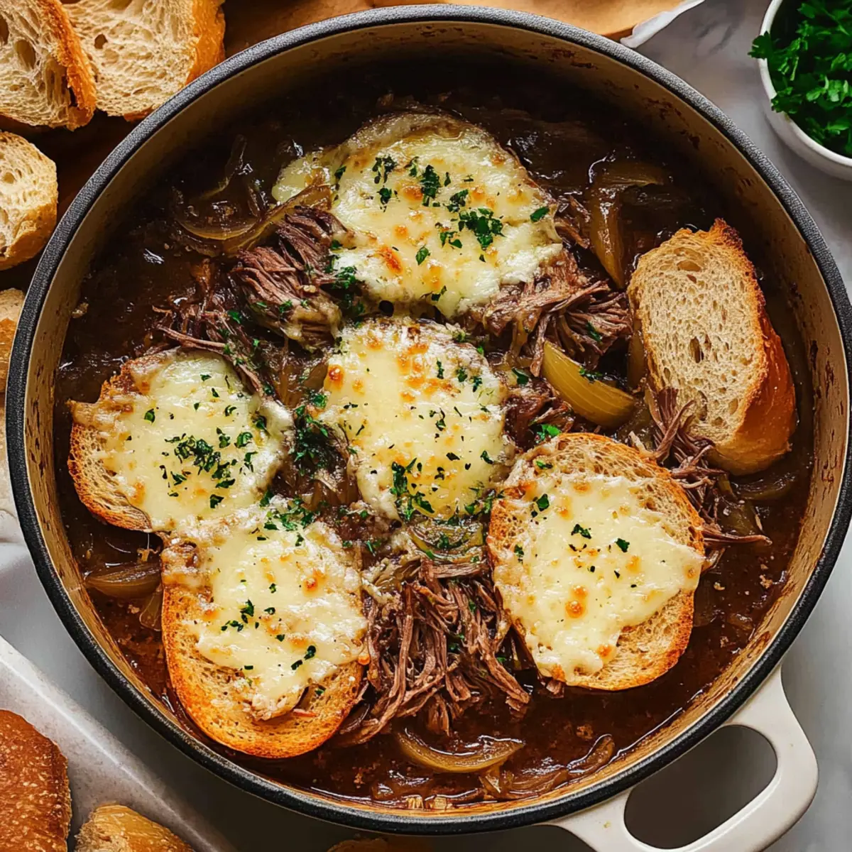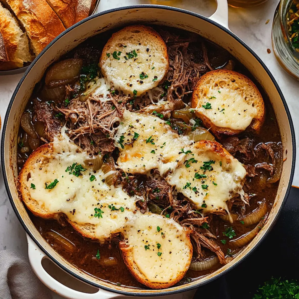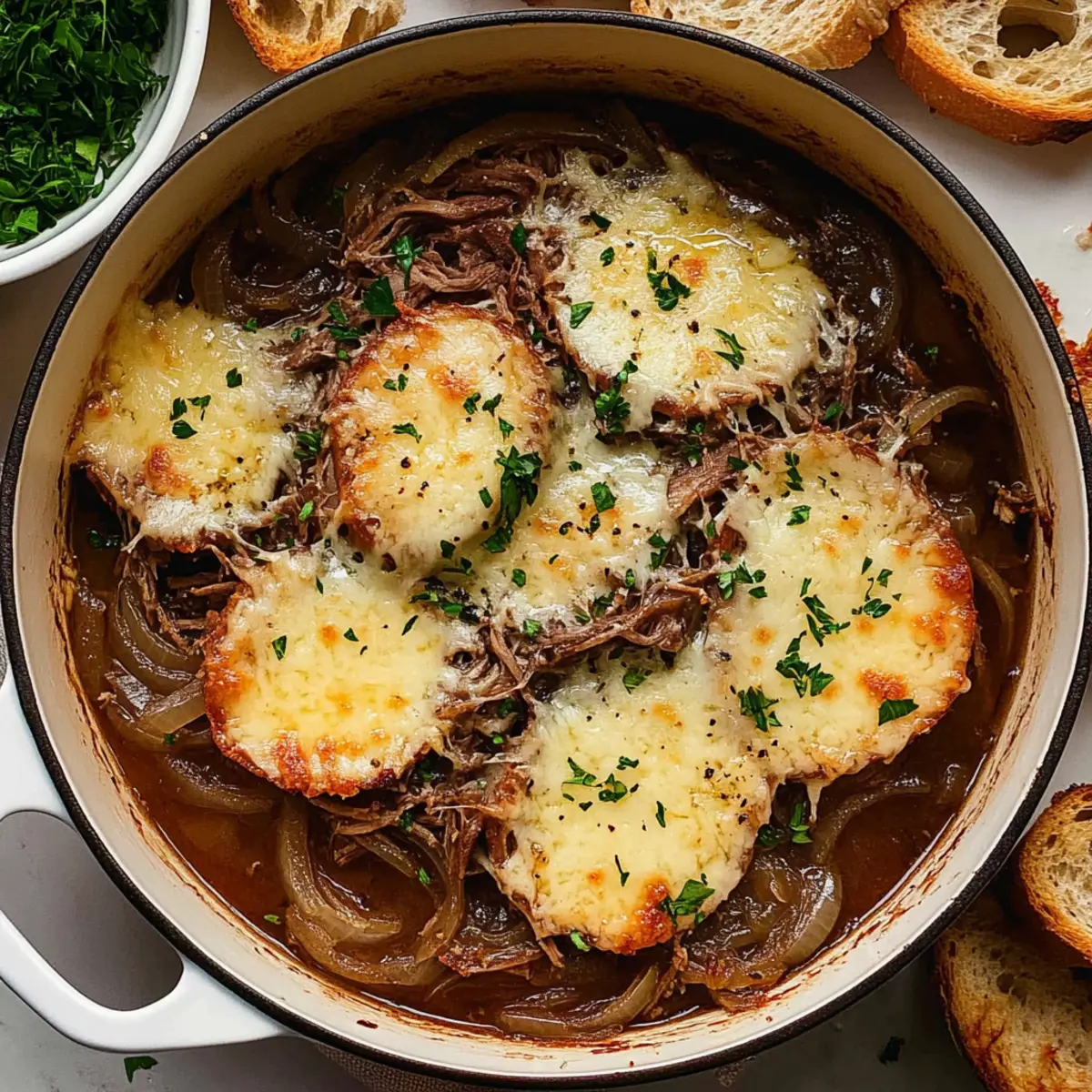 As the first hints of chilly weather drift in, I find myself longing for a warm, hearty embrace from the kitchen. That’s where my Dutch Oven French Onion Pot Roast with Gruyere Cheese Toasts steps into the spotlight—this dish is not just a meal, it’s an experience that transforms over several hours into an elevated comfort food masterpiece. With fall-apart beef braised alongside savory caramelized onions, it captures the essence of classic French onion soup. What’s more, the oozy gruyere cheese toasts are a delightful twist that make this recipe a crowd-pleaser, perfect for cozy gatherings at home. The best part? It’s a one-pot wonder, meaning less cleanup and more time to savor every delicious bite. Curious to learn how this symphony of flavors comes together? Let’s dive in! Why is this pot roast unforgettable? Hearty Comfort: This Dutch Oven French Onion Pot Roast is the ultimate comfort food, blending tender beef with the deep, rich flavors of caramelized onions. Effortless Elegance: With just one pot, this dish simplifies cooking while still impressing guests—perfect for those cozy evenings at home. Culinary Duo: Enjoy the delightful combination of savory pot roast and melted gruyere cheese toasts, creating a harmony of flavors that elevate any meal. Make-Ahead Magic: The pot roast not only tastes better with time but also stores beautifully, making it an excellent option for meal prepping or entertaining. For a twist on cheesy delight, consider pairing it with your favorite Egg Cheese Toasts or even turning it into a comforting soup with elements from my Pot Macaroni Cheeseburger recipe. Indulge in this culinary adventure and savor every moment! Dutch Oven French Onion Pot Roast Ingredients Get ready to create a sumptuous feast that’ll become a cherished family tradition! For the Pot Roast • Kosher Salt – Enhances flavor and tenderizes meat; use 1 teaspoon per pound for best results. • Garlic Powder – Adds depth and warmth to the dish; no substitutions suggested. • Onion Powder – Provides a savory backbone; keep this ingredient for full flavor. • Dried Oregano, Thyme, Rosemary – Earthy herbs that boost the aroma; fresh herbs can brighten the dish. • Coarse Ground Black Pepper – Offers heat and complexity; freshly ground is ideal. • Smoked Paprika – (Optional) Introduces a smoky essence; substitute with sweet paprika if preferred. • Celery Seed – (Optional) Elevates savory notes; feel free to omit if desired. • Oil – For searing the roast; any high smoke point oil works well. • Beef Chuck Roast – The heart of this recipe, known for its rich flavor and tenderness when braised. • Unsalted Butter – Essential for caramelizing onions; switch to salted butter with care to adjust salt. • Sweet Onions – Ideal for their sweet, caramelizing abilities; yellow onions can substitute well. • Brown Sugar – Balances the flavors in caramelized onions; honey or maple syrup can be used in its place. • Garlic – Freshly minced for a vibrant flavor; it’s a must-have! • Flour – Thickens the braising liquid; gluten-free option: cornstarch mixed with water works nicely. • Red Wine – Adds depth and acidity; dry red is best, or swap with beef broth and balsamic vinegar if avoiding alcohol. • Beef Broth – Vital for tender, juicy meat; can substitute with chicken or vegetable broth if needed. • Worcestershire Sauce – Provides a savory umami flavor; it’s best to stick with it as suggested. • Balsamic Vinegar – Balances flavors with its acidity; can be swapped with apple cider vinegar if necessary. • Dijon Mustard – Introduces a tangy element; yellow mustard can be an alternative. • Bay Leaves – Infuses the pot roast with flavor; they can be omitted but are recommended for the best taste. • Fresh Rosemary and Thyme – Impart aromatic notes; dried herbs are a suitable substitution if fresh isn’t available. For the Cheese Toasts • Baguette – Creates that crunchy texture; substitute with any crusty bread as desired. • Gruyere Cheese – Melts beautifully and is perfect for topping; Comte or Swiss cheese can be used if preferred. This Dutch Oven French Onion Pot Roast with Gruyere Cheese Toasts is set to become a family favorite, mixing a hearty meal with a delightful twist. Prepare to savor every bite! Step‑by‑Step Instructions for Dutch Oven French Onion Pot Roast with Gruyere Cheese Toasts Step 1: Prepare the Roast Start by seasoning the beef chuck roast with kosher salt, garlic powder, onion powder, and crushed black pepper. For enhanced flavor, wrap the seasoned roast in plastic wrap and let it dry brine in the refrigerator for up to 24 hours. This step allows the spices to penetrate the meat, ensuring a flavorful Dutch Oven French Onion Pot Roast. Step 2: Sear the Beef Preheat your Dutch oven over medium-high heat and add a splash of high smoke-point oil. Once shimmering, place the seasoned roast in the pot, searing each side for 5-7 minutes until deeply browned. The caramelization process develops rich flavors, creating a savory crust. After searing, remove the roast and set it aside to rest. Step 3: Caramelize Onions In the same Dutch oven, melt unsalted butter over medium heat, then add thinly sliced sweet onions. Cook the onions for 30-35 minutes, stirring frequently, until they turn golden brown. Halfway through, sprinkle in brown sugar and minced garlic to enhance the sweetness and flavor of the caramelization, creating a wonderful base for your pot roast. Step 4: Deglaze Once the onions are caramelized, sprinkle flour over them and stir well to coat. Gradually pour in red wine while scraping up any browned bits stuck to the bottom of the pot. This step is crucial for building depth in the braising liquid. Allow the wine to reduce for about 2-3 minutes before proceeding. Step 5: Braise Add beef broth, Worcestershire sauce, Dijon mustard, and fresh herbs to the pot, stirring to combine. Return 