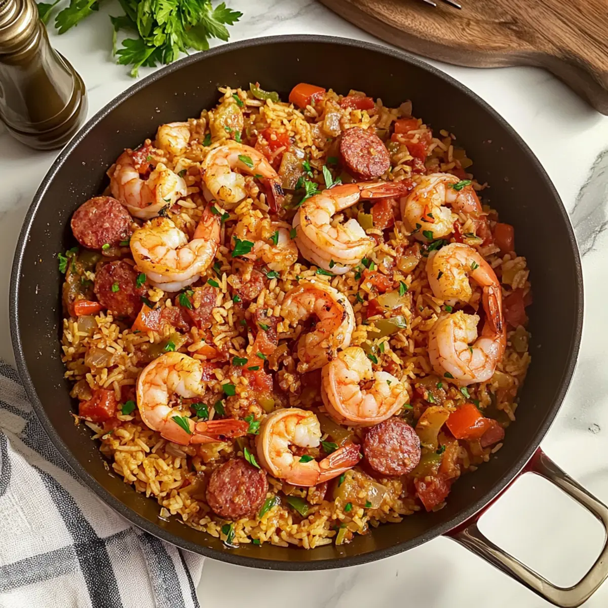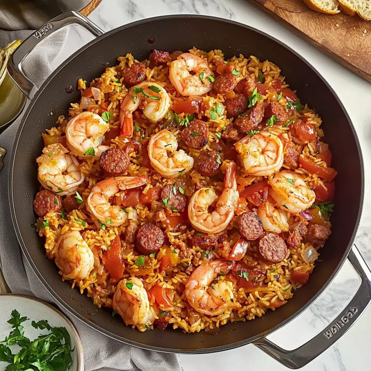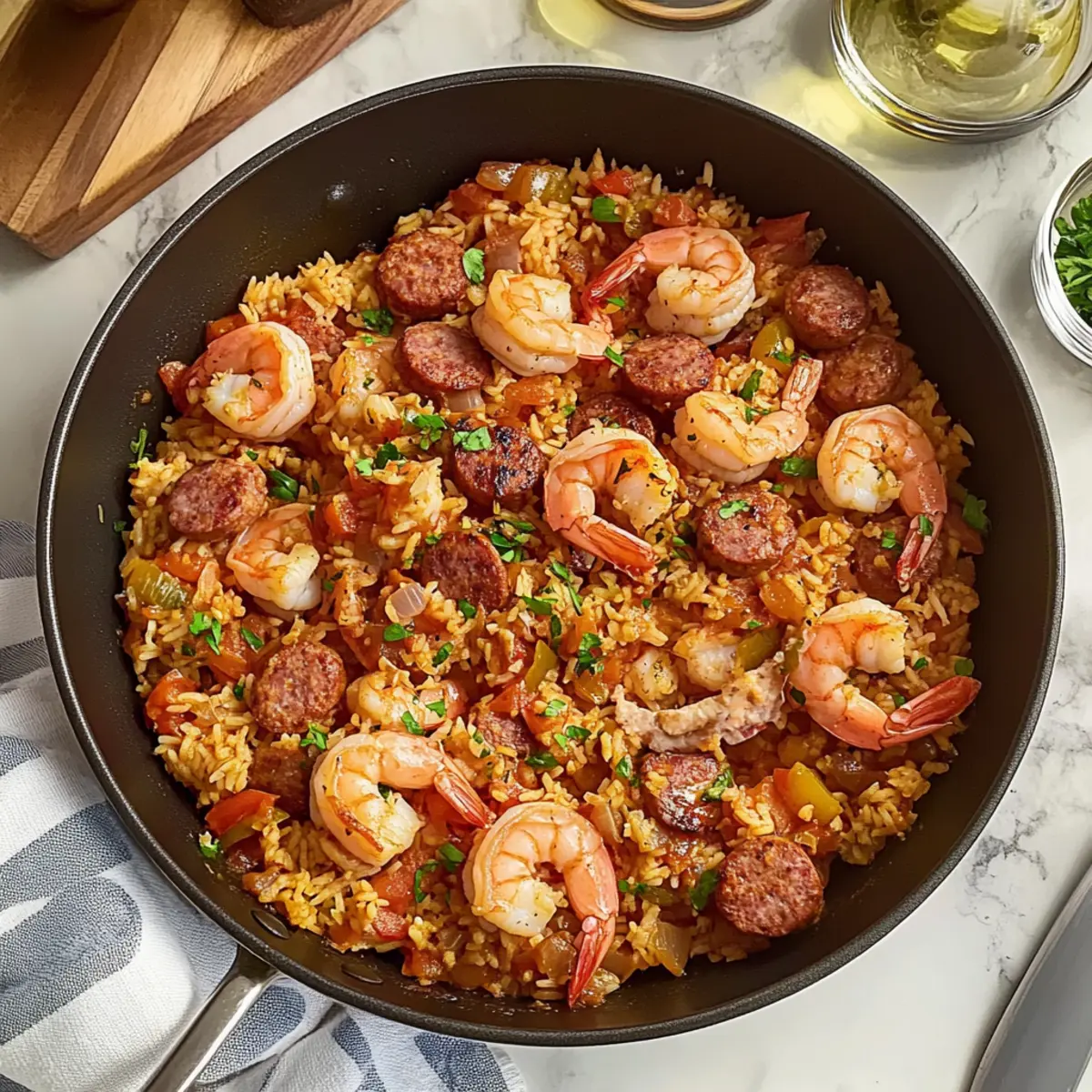 The aroma of sizzling sausage and vibrant spices dances through the air as I prepare a dish that always feels like a warm hug: Easy Jambalaya. This one-pot wonder takes me straight to the heart of Cajun cuisine, where bold flavors and hearty ingredients combine effortlessly. Featuring plump shrimp and smoky andouille sausage, this recipe not only serves up a satisfying meal but also offers the convenience of quick cleanup—perfect for those busy weeknights when you crave something homemade without the hassle. Whether it’s for a family dinner or a casual gathering with friends, my Easy Jambalaya is sure to impress. Ready to discover how to whip up this flavorful feast? Let’s dive in together! Why Is Jambalaya So Special? Dynamic flavors explode in each bite, bringing the vibrant essence of Cajun cuisine straight to your table. One-pot convenience means less fuss and more fun, allowing you to savor the cooking process. Crowd-pleaser appeal makes it perfect for family dinners or entertaining friends. Customizable ingredients let you adapt the recipe to your taste, whether you swap shrimp for chicken or add a variety of veggies. Plus, with minimal cleanup required, you can enjoy a delicious homemade meal without the hassle. For a twist, pair it with Hawaiian Roll French for a delightful bite of sweetness! Easy Jambalaya Ingredients For the Base Vegetable Oil – Provides the foundation for sautéing; olive oil or butter can be used as alternatives. Smoked Andouille Sausage – Infuses a smoky flavor; try kielbasa or turkey sausage for a lighter option. Small Sweet Onion – Adds sweetness and depth; feel free to use any onion variety. Red Bell Pepper & Green Bell Pepper – Bring color and sweetness; you can swap them for other bell pepper colors or omit. For the Flavor Basmati Rice – Cooks quickly and absorbs all the bold flavors well; long-grain rice is a suitable substitute if needed. Garlic – Enhances the overall aroma and flavor; fresh cloves are best, but powdered can work in a pinch. Sweet Paprika, Dried Oregano, Onion Powder, Dried Thyme, Bay Leaf – These spices create the essential Cajun flavor profile; adjust to your taste. Kosher Salt & Black Pepper – Key for seasoning; you can use sea salt and freshly cracked black pepper as alternatives. For the Liquid and Texture Chicken Stock – Acts as the cooking liquid adding rich flavor; switch to vegetable stock for a vegetarian version. Petite Diced Tomatoes – Provide acidity and moisture; fresh tomatoes can be used if preferred or omitted entirely. Tomato Paste – Thickens and deepens the tomato flavor; tomato sauce can also work in its place. Hot Sauce – Adds that extra kick; adjust based on your spice tolerance or omit for a milder dish. For the Main Ingredients Medium Shrimp – Peeled and deveined for convenience; frozen shrimp can save time without compromising taste. Fresh Parsley – Provides garnish and freshness; substitute with green onions if desired. Step‑by‑Step Instructions for Easy Jambalaya Step 1: Heat the Oil Begin by heating 2 tablespoons of vegetable oil in a large Dutch oven over medium heat. Allow the oil to shimmer for about 1-2 minutes, indicating it’s hot enough. This step prepares the base for your delicious Easy Jambalaya and will help infuse flavors into the dish as you sauté the next ingredients. Step 2: Sauté the Sausage and Vegetables Add 8 ounces of sliced smoked andouille sausage, 1 diced small sweet onion, and 1 each of diced red and green bell pepper to the pot. Cook these ingredients for about 4-5 minutes until the vegetables are tender and the sausage is slightly browned. The combination creates a flavorful base that will tantalize your senses while cooking. Step 3: Incorporate the Rice and Seasonings Stir in 1 cup of basmati rice along with 3 minced garlic cloves, 1 tablespoon sweet paprika, 1 teaspoon dried oregano, 1 teaspoon onion powder, ½ teaspoon dried thyme, and 1 bay leaf. Sauté this mixture for an additional 1-2 minutes until fragrant, allowing the rice to absorb the rich flavors and ensuring your Easy Jambalaya is bursting with aromatic goodness. Step 4: Add Liquids and Simmer Pour in 4 cups of chicken stock, along with 1 can of petite diced tomatoes (undrained), 2 tablespoons of tomato paste, and a splash of hot sauce for extra kick. Bring the mixture to a boil, then cover the pot and reduce the heat to low. Let it simmer for approximately 15 minutes, allowing the flavors to meld together while the rice cooks perfectly. Step 5: Stir in the Shrimp Once the rice is tender, fold in 1 pound of peeled and deveined medium shrimp. Season to taste with kosher salt and black pepper. Cover again, cooking for about 5 minutes until the shrimp are pink and opaque, signaling they are fully cooked. This step transforms your Easy Jambalaya into a hearty and satisfying one-pot meal. Step 6: Add Fresh Parsley and Serve Finally, stir in a handful of chopped fresh parsley for a pop of color and freshness. Give everything a gentle stir to mix well. Serve your Easy Jambalaya hot in bowls, allowing the vibrant colors and rich aromas to delight your family and friends. Expert Tips for Easy Jambalaya Choose the Right Pot: Using a Dutch oven helps ensure even cooking and enhances the richness of flavors in your Easy Jambalaya. Freshness Matters: Always try to use fresh garlic and vegetables—they bring out the best flavors and aromas in your dish. Don’t Rush the Simmer: Allowing the rice to simmer fully is essential; undercooked rice can ruin the texture of your Easy Jambalaya. Adjust Spice Levels: Taste your dish before serving; feel free to alter the amount of hot sauce based on your family’s preference for heat. Storage Tips: Store leftovers in airtight containers, and remember, jambalaya tastes even better the next day as the flavors meld! How to Store and Freeze Easy Jambalaya Fridge: Store leftover jambalaya in an airtight container for up to 3-4 days. This helps to maintain