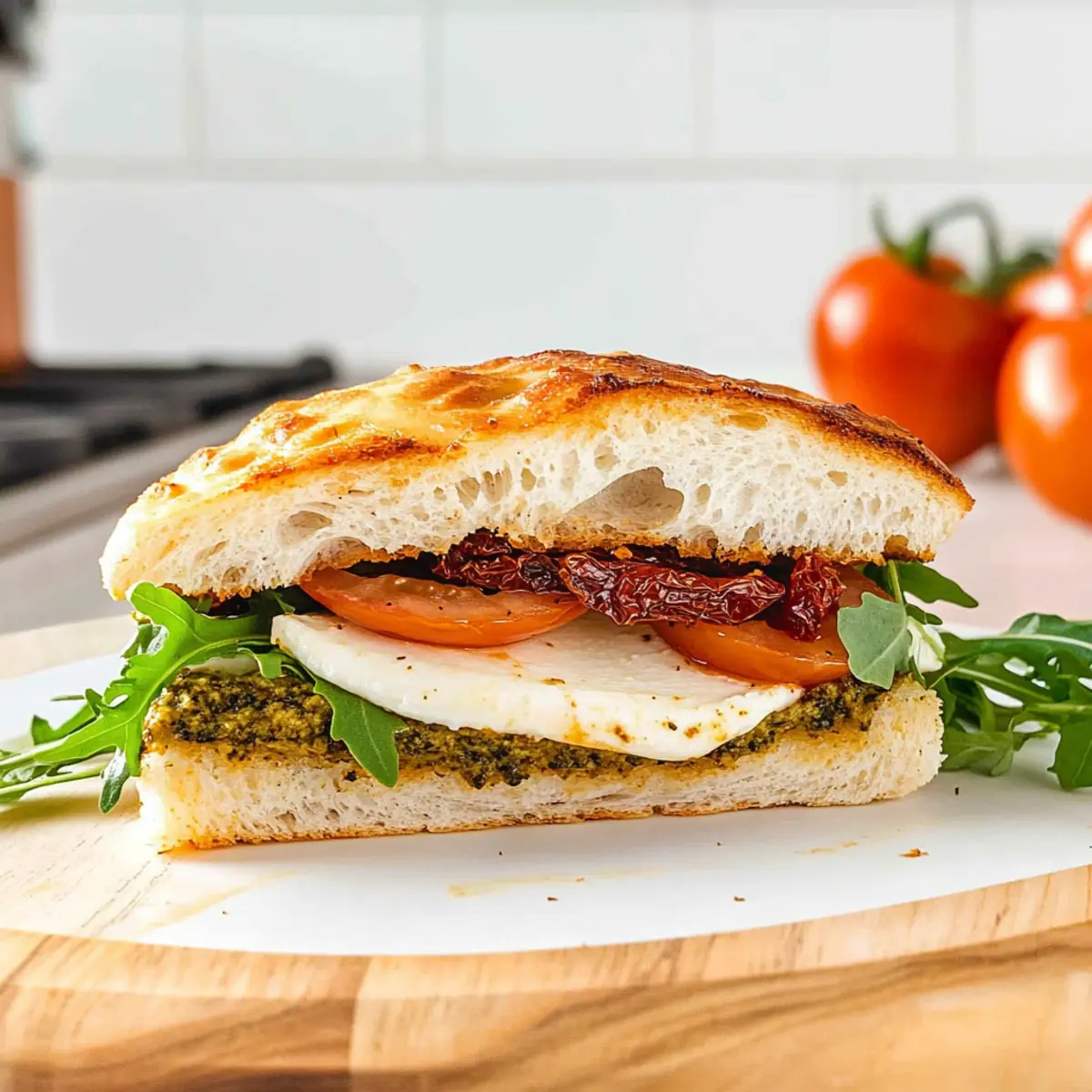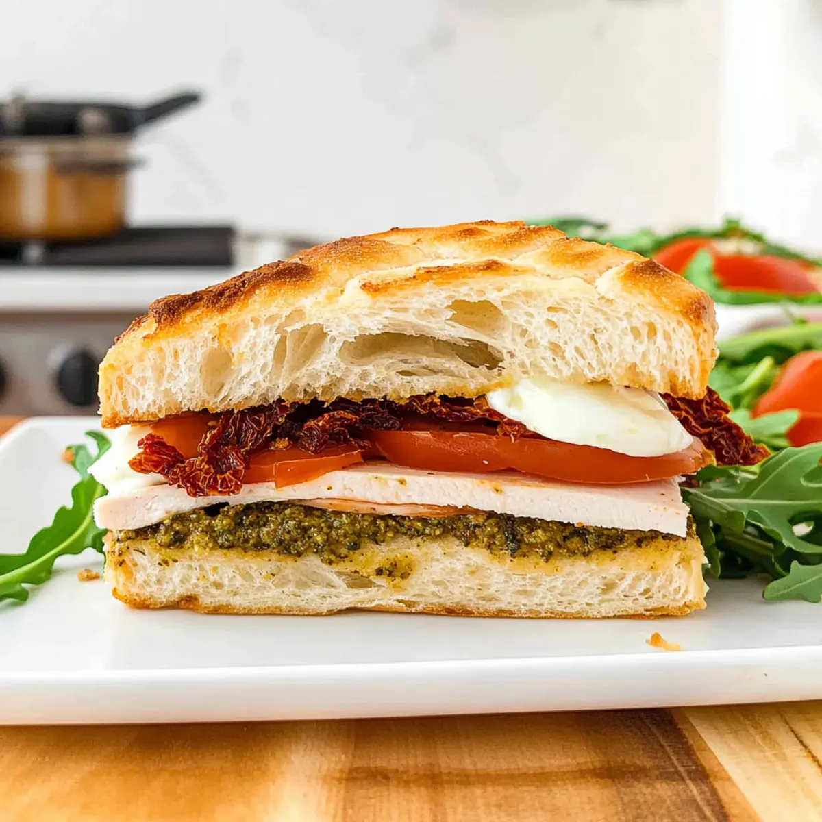There’s nothing quite like the scent of freshly baked focaccia wafting through the kitchen, beckoning you to create something truly indulgent. Today, I’m excited to share my recipe for a Turkey and Mozzarella Focaccia Sandwich with Sun-Dried Tomato Pesto—a dish that’s not only a cinch to whip up but also fully customizable to suit your cravings. This heartwarming sandwich brings layers of tender turkey, creamy mozzarella, and vibrant, juicy tomatoes together between two fragrant slices of rosemary focaccia. Whether you’re looking for a quick lunch option or a delightful dinner that will impress your family and friends, this nourishing sandwich hits all the right notes. So, how about we dive into making this culinary delight together? Why Is This Focaccia Sandwich a Must-Try? Unforgettable Flavor: This sandwich is bursting with the robust taste of sun-dried tomato pesto, perfectly complementing the tender turkey and creamy mozzarella. Customizable: Feel free to swap in your favorite proteins or cheeses; it’s all about making it your own! Quick Prep: With simple ingredients and minimal steps, this recipe is perfect for busy weeknights or spontaneous lunch cravings. Comfort Food Classic: Combining hearty fillings with soft, fragrant rosemary focaccia, it embodies everything you love about satisfying comfort food. Perfect Pairing: Serve it alongside a warm bowl of creamy tomato bisque soup for an unforgettable meal. You’ll be amazed at how quickly it becomes a favorite! Focaccia Sandwich Ingredients For the Bread Rosemary Focaccia Bread – The fragrant base of this focaccia sandwich; you can use store-bought focaccia or ciabatta for convenience. For the Pesto Sun-Dried Tomato Pesto – Adds bold, sweet, and tangy flavor; can be made ahead and stored in the fridge for up to 1 week. For the Fillings Shaved Deli Turkey – Provides hearty protein; feel free to substitute with grilled chicken or a meatless option if desired. Fresh Mozzarella Cheese – Offers creaminess and richness; alternatives include provolone or goat cheese for a different twist. Ripe Tomatoes – Adds freshness and juiciness; use any variety you love, or throw in extra for added flavor. Arugula or Mixed Greens – Brings crispness and nutrition to the sandwich; spinach works well as a substitute or use any preferred greens. Step‑by‑Step Instructions for Turkey and Mozzarella Focaccia Sandwich with Sun-Dried Tomato Pesto Step 1: Prepare the Pesto Start by making your sun-dried tomato pesto by combining sun-dried tomatoes, garlic, nuts, cheese, and olive oil in a food processor. Pulse until you achieve a smooth, spreadable consistency, typically around 1-2 minutes. This vibrant pesto can be made in advance and stored in the fridge for up to a week, so feel free to prepare it ahead of time. Step 2: Slice the Focaccia Once your pesto is ready, grab your rosemary focaccia bread and slice it in half horizontally. Make sure to cut it evenly to create a nice top and bottom for your sandwich. Lay both halves cut-side up on a clean, flat surface; you’ll want that fragrant, fresh bread exposed for the next delicious steps. Step 3: Spread the Pesto Take your prepared sun-dried tomato pesto and generously spread a layer on the bottom half of the focaccia. Make sure to cover it entirely, as this will infuse your focaccia sandwich with robust flavors. The pesto’s bright color and aroma should already get your taste buds excited! Step 4: Layer the Fillings Now, it’s time to build your turkey and mozzarella focaccia sandwich! Start by layering fresh arugula or mixed greens on top of the pesto, followed by slices of ripe tomatoes for that juicy touch. Add on the creamy slices of fresh mozzarella, then top it off with a generous amount of shaved deli turkey, ensuring an even distribution. Step 5: Complete the Sandwich Once all the fillings are in place, carefully place the top half of the focaccia onto the layered ingredients. Gently press down to help the sandwich hold together, enhancing the melding of flavors. You can cut the sandwich into portions right now or leave it whole to slice just before serving. Step 6: Serve and Enjoy After assembling your Turkey and Mozzarella Focaccia Sandwich, it’s best enjoyed right away. If you’ve made it ahead of time, let it sit at room temperature for about 15 minutes to soften before serving. Pair it with a warm bowl of tomato bisque for a satisfying meal that is sure to delight! What to Serve with Turkey and Mozzarella Focaccia Sandwich There’s nothing like enhancing a cozy meal with delightful sides to elevate your dining experience. Creamy Tomato Bisque: This rich, velvety soup perfectly complements the sandwich’s flavors, providing a warm, comforting pairing that everyone loves. It’s the ultimate companion on a chilly day! Arugula Salad: A bright, peppery mix of arugula with cherry tomatoes and a light vinaigrette adds a fresh crunch, balancing the richness of the focaccia sandwich wonderfully. Potato Wedges: Crispy on the outside and fluffy on the inside, these flavorful wedges can be seasoned your way, creating a satisfying contrast with the soft sandwich. Pickled Vegetables: Tangy pickles or a medley of pickled veggies can cut through the sandwich’s richness, offering a zesty bite that lingers long after each mouthful. Sweet Potato Fries: The natural sweetness of these fries adds an enjoyable contrast to the savory turkey and mozzarella, making every bite feel indulgent yet wholesome. Sparkling Water with Lemon: A refreshing beverage option, sparkling water with a hint of lemon cleanses the palate between bites, enhancing the overall meal enjoyment. Dark Chocolate Squares: For a simple dessert, pair with rich dark chocolate squares; the bittersweet chocolate makes for a lovely finish to your meal, tantalizing your taste buds sweetly. Make Ahead Options These Turkey and Mozzarella Focaccia Sandwiches are perfect for busy home cooks looking to save time! You ca