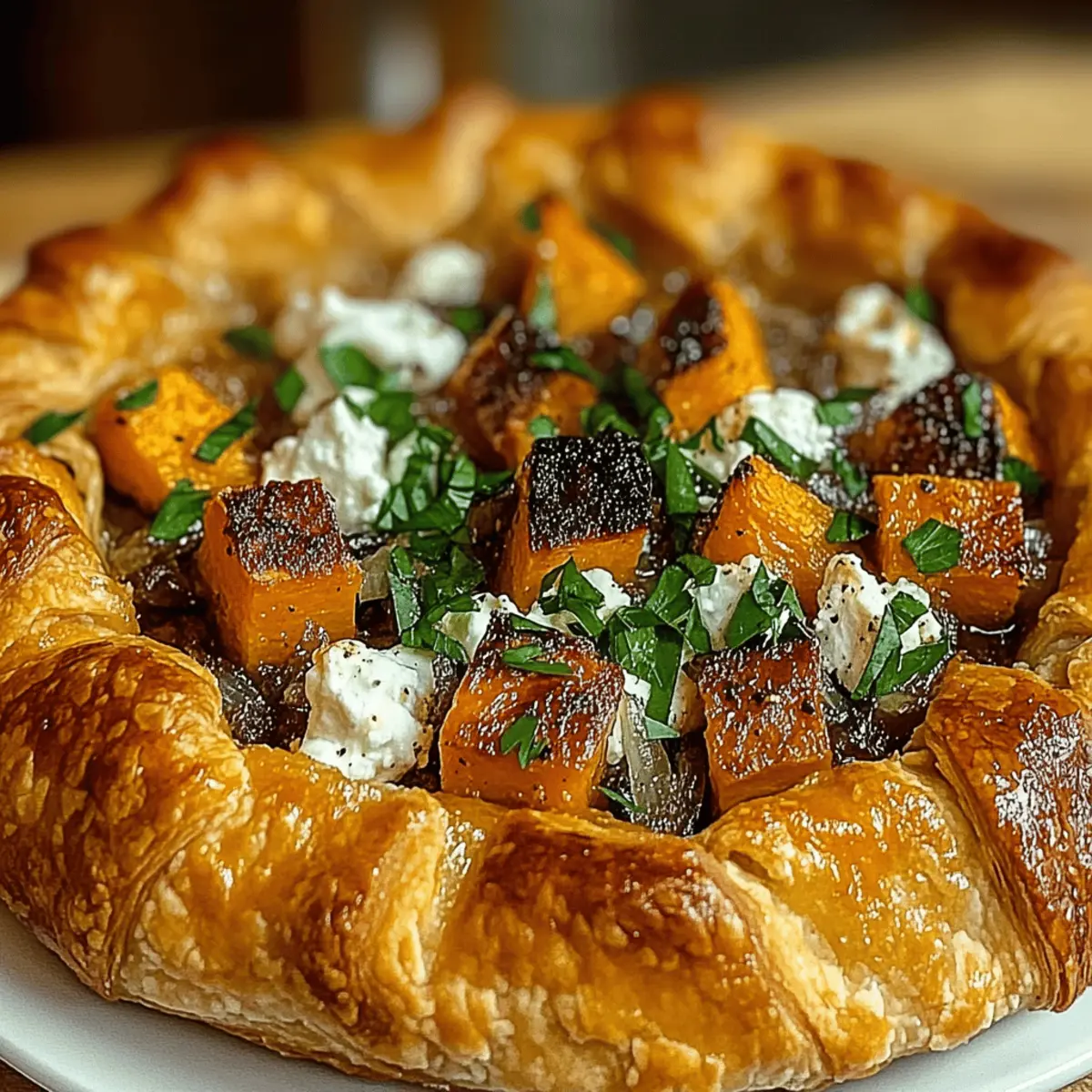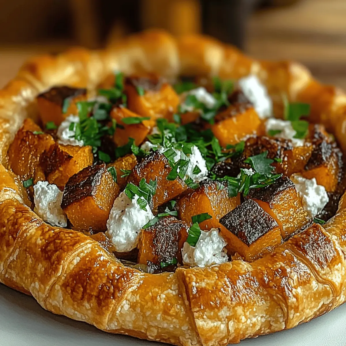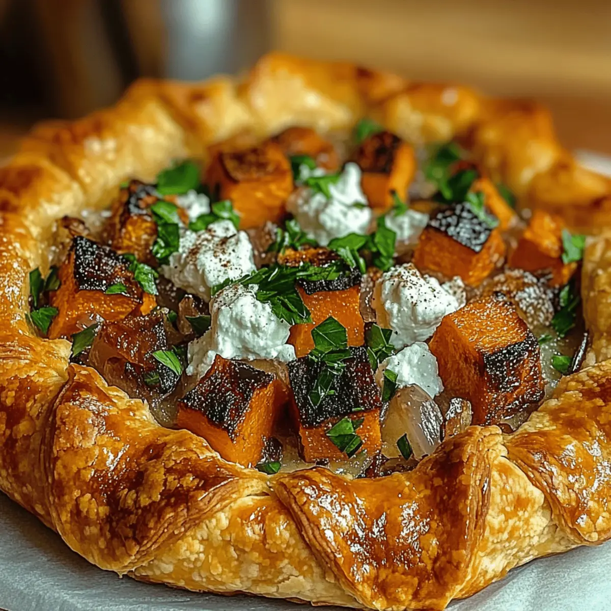 The aroma of roasted butternut squash wafted through my kitchen, instantly transporting me to autumn gatherings filled with laughter and warmth. That’s when I decided it was time to create a dish that celebrates this comforting season—introducing my Golden Butternut Squash and Goat Cheese Galette! This rustic delight marries the sweetness of roasted squash with the tangy creaminess of goat cheese, creating a dish that’s not only a feast for the eyes but a hug for your taste buds. With its flaky crust and earthy thyme notes, it’s a showstopper that’s perfect for cozy dinners or festive celebrations. Plus, it’s vegetarian and easily adaptable to a gluten-free diet! Are you ready to bring a slice of seasonal joy to your table? Why will you adore this galette? Irresistible Flavors: The Golden Butternut Squash and Goat Cheese Galette combines roasted squash’s natural sweetness with creamy goat cheese, creating a symphony of taste that will delight every palate. Simplicity: This recipe is straightforward, using easily available ingredients that won’t break the bank or leave you stressed. Perfect for Gatherings: It’s an impressive dish that everyone—friends, family, or dinner guests—will admire and enjoy, making it a must-try for your next cozy gathering. Versatile: While it shines as a vegetarian option, consider serving it alongside grilled chicken or fish for a well-rounded meal. Make-Ahead Friendly: You can prepare this galette in advance, allowing you to enjoy more time with your guests by simply reheating it before serving; check out my tips for the perfect storage! Golden Butternut Squash and Goat Cheese Galette Ingredients For the Filling • Butternut Squash – Provides sweetness and texture for a delightful filling; opt for firm squash with minimal blemishes. • Olive Oil – Helps roast the squash and sauté the onions, enhancing overall flavor; feel free to substitute with butter for a richer taste. • Salt and Pepper – Essential seasonings that elevate the dish; adjust according to your taste preference. • Dried Thyme (or Fresh) – Adds earthy notes that pair wonderfully with squash; fresh thyme enhances the flavor even more. • Onions or Shallots – Sweetness and depth come from caramelized onions for the best flavor; shallots offer a more delicate taste. • Goat Cheese – Brings creamy richness and tanginess; a great lower-fat alternative to cow’s milk cheese; feta works as a substitute if desired. • Grated Parmesan Cheese – Optional yet recommended for an extra layer of savory depth. For the Crust • Store-bought Pie Crust or Homemade Dough – Serves as the base; homemade offers more flavor but store-bought saves time; both are delicious! • Egg (for egg wash) – Provides a beautiful golden finish when brushed on before baking. For Garnish • Fresh Parsley or Arugula – Adds a pop of color and a fresh note to your Golden Butternut Squash and Goat Cheese Galette; feel free to skip if preferred. • Honey (optional) – A drizzle elevates the flavors with a touch of added sweetness; perfect for balancing the rich ingredients! Step‑by‑Step Instructions for Golden Butternut Squash and Goat Cheese Galettes Step 1: Preheat Oven Begin by preheating your oven to 400°F (200°C). This ensures a perfectly baked crust and allows the flavors of the Golden Butternut Squash and Goat Cheese Galette to develop beautifully. Make sure the oven is fully heated for even cooking before placing your galette inside. Step 2: Prepare Squash Cube the butternut squash into bite-sized pieces and toss them in a bowl with olive oil, salt, pepper, and thyme. Spread the seasoned squash evenly on a baking sheet, ensuring there’s space between them to promote even roasting. Roast in the preheated oven for 25-30 minutes, or until the squash is tender and lightly golden. Step 3: Roll Out Dough While the squash is roasting, roll out your store-bought or homemade pie crust into a 12-inch circle on a lightly floured surface. Place the rolled-out dough onto a parchment-lined baking sheet, allowing the edges to hang over slightly. This crust will serve as the delightful base for your Golden Butternut Squash and Goat Cheese Galette. Step 4: Sauté Onions In a medium skillet over medium heat, add a drizzle of olive oil and chopped onions. Cook the onions for about 5-7 minutes, stirring occasionally, until they turn translucent and sweetly caramelized. Set them aside to cool slightly as you prepare to assemble your galette. Step 5: Assemble Galette Spread the sautéed onions evenly over the rolled-out pie crust, leaving about an inch of space from the edges. Next, layer the roasted butternut squash on top, then sprinkle crumbled goat cheese and grated Parmesan cheese to enhance the flavors of your Golden Butternut Squash and Goat Cheese Galette. Step 6: Fold Edges Gently fold and pleat the edges of the crust over the filling, creating a rustic look while leaving the center exposed. Brush the visible crust with beaten egg for a beautiful, golden finish during baking. This step adds both flavor and visual appeal to your galette. Step 7: Bake Bake the galette in the preheated oven for 25-30 minutes, or until the crust is a lovely golden brown and the filling is bubbling. The aroma of roasting squash and goat cheese will fill your kitchen, promising a delicious reward at the end of this process. Step 8: Cool & Finish Once out of the oven, allow your Golden Butternut Squash and Goat Cheese Galette to cool slightly on the baking sheet. For an extra touch, drizzle a little honey over the top if desired, and garnish with fresh parsley or arugula for color before serving. Expert Tips for Golden Butternut Squash and Goat Cheese Galette Preheat Oven Completely: Ensuring your oven is fully preheated helps achieve that golden, flaky crust; don’t skip this step for even baking. Cool the Filling: Let your roasted butternut squash and sautéed onions cool slightly before assembling to