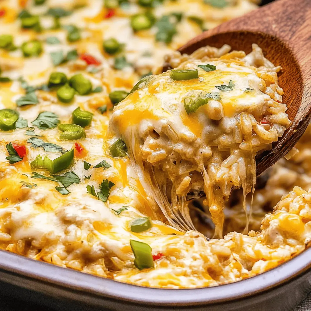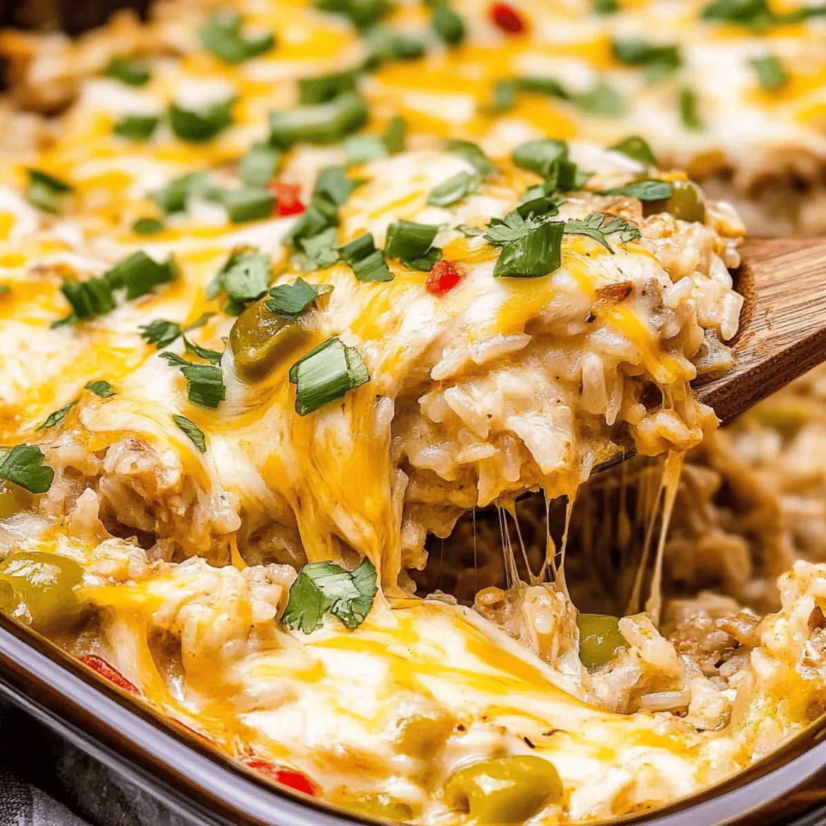 As I stirred the pot, the irresistible aroma of spices filled my kitchen, instantly transporting me to the vibrant Southwest. This Green Chile Chicken and Rice Casserole combines creamy textures with a zesty kick, creating a comforting dish that feels like a warm embrace. Perfect for those busy evenings, this quick and easy one-pan meal is not only gluten-free but also a guaranteed crowd-pleaser. With wholesome ingredients like shredded chicken, brown rice, and fire-roasted tomatoes, it’s a delicious option for anyone tired of takeout. Plus, it’s versatile enough to switch up based on what you have at home! Ready to learn how to create this delectable dish that your family will ask for time and again? Let’s dive in! Why is this casserole a must-try? Comforting, hearty flavors: The Green Chile Chicken and Rice Casserole is a warm hug for your taste buds, fusing creamy goodness with a zesty twist. One-pan simplicity: You’ll love how easy this dish is to prepare, saving you time on cleanup after a long day. Healthy & satisfying: Packed with protein and wholesome ingredients, it fuels your family without the guilt. Customizable delight: Whether you prefer to switch up the cheese or try quinoa instead of rice, this casserole flexes to fit your needs. Pair it with a fresh green salad or crispy tortilla chips to round out your meal! Green Chile Chicken and Rice Casserole Ingredients • Get ready to whip up a comforting meal! For the Casserole Olive Oil – Provides moisture and helps sauté vegetables; any neutral oil works too. Green Onions – Adds mild onion flavor; substitute with ½ cup diced yellow onion if you want a stronger taste. Chili Powder – Brings heat to the dish; feel free to adjust according to your spice preference. Ground Cumin – Adds a warm earthiness to the casserole. Garlic Powder – Enhances the savory depth of flavor. Dried Oregano – Offers herbaceous notes that elevate the overall taste. Kosher Salt & Black Pepper – Essential for seasoning; adjust them to your liking. Shredded Chicken Breasts – Adds protein and texture; chicken thighs or rotisserie chicken are great substitutes. Cooked Brown Rice – Provides heartiness; swap with white rice or quinoa for variety. Canned Diced Green Chiles – The star flavor of the dish; choose mild or hot to control the heat level. Fire-Roasted Tomatoes – Contributes rich tomato flavor and a hint of smokiness; canned diced tomatoes work in a pinch. Frozen Corn – Adds a sweet crunch; consider using fire-roasted corn for an extra kick. Green Enchilada Sauce – Acts as the flavorful base; confirm it’s gluten-free by checking labels. Plain Greek Yogurt – Adds creaminess and protein; full-fat sour cream can be a perfect substitute. Shredded Cheddar Cheese – Ties the dish together with a melty topping; Monterey Jack or Pepper Jack can add a twist. Enjoy making this Green Chile Chicken and Rice Casserole with these fresh ingredients! Step‑by‑Step Instructions for Green Chile Chicken and Rice Casserole Step 1: Preheat the Oven Begin by preheating your oven to 350°F (175°C). This temperature will ensure your Green Chile Chicken and Rice Casserole bakes evenly and develops that perfectly melty cheese topping. Take out a large oven-safe skillet, which will be your one-pan hero for this dish. Step 2: Sauté the Vegetables and Spices In your preheated skillet, add a drizzle of olive oil over medium heat. Allow it to warm for about a minute before tossing in chopped green onions along with chili powder, ground cumin, garlic powder, and dried oregano. Sauté the mixture for 2 minutes, stirring occasionally, until the onions soften and the spices become fragrant, creating a warm, inviting aroma. Step 3: Combine the Main Ingredients Next, add your shredded chicken, cooked brown rice, canned diced green chiles, fire-roasted tomatoes, and frozen corn to the skillet. Mix everything together gently until well combined, allowing the warmth of the skillet to heat the ingredients through. You’ll know it’s ready when it starts bubbling slightly, which should take about 3-4 minutes. Step 4: Stir in the Greek Yogurt Once the mixture is heated and combined, take the skillet off the heat. Quickly stir in the Greek yogurt, ensuring it’s well integrated without curdling. This step adds a luscious creaminess to your Green Chile Chicken and Rice Casserole. Make sure the skillet is off the heat while mixing to keep the yogurt smooth. Step 5: Top with Cheese and Bake Sprinkle the remaining shredded cheddar cheese evenly over the top of the casserole. Transfer the skillet to your preheated oven and bake for 15 minutes. You’ll know it’s done when the cheese is melted and bubbling beautifully, inviting everyone to the table with its delicious aroma. Step 6: Serve and Enjoy Once out of the oven, let your Green Chile Chicken and Rice Casserole cool slightly before serving. Optionally, garnish with diced tomatoes and chopped cilantro for a fresh finish. This comfort dish is perfect for a cozy night in, so dish it up and enjoy the warm, savory goodness! Green Chile Chicken and Rice Casserole Variations Feel free to let your imagination run wild and customize this casserole to suit your taste preferences or dietary needs! Dairy-Free: Swap the Greek yogurt and cheese for dairy-free options like cashew cream and nutritional yeast for a creamy, non-dairy twist. It’s a great way to keep the comforting feel without the dairy. Vegetarian Delight: Substitute the shredded chicken with shredded jackfruit or chickpeas for a hearty vegetarian option that’s still satisfying. The green chiles and spices will keep the flavors vibrant and delicious! Quinoa Twist: Replace brown rice with quinoa for a lighter, gluten-free alternative that packs even more protein and nutrients. Quinoa adds a lovely, nutty flavor and pairs beautifully with the southwest spices. Spicy Kick: Add diced jalapeños or a few dashes of hot sauce to the mix for an extra