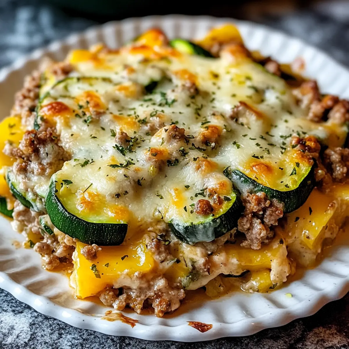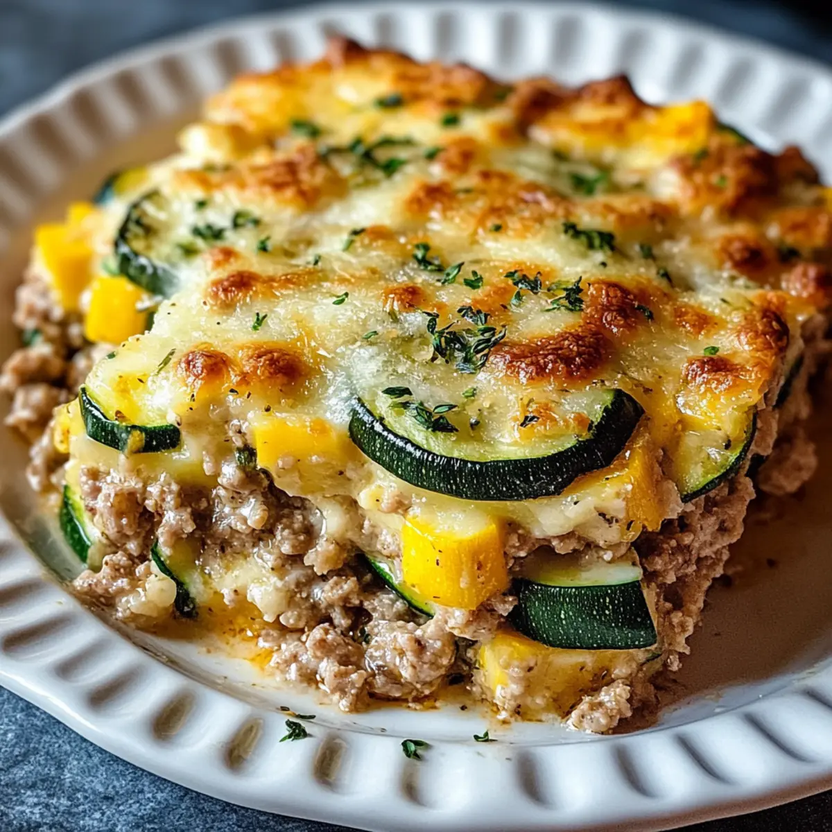 In the heart of my kitchen, there’s a certain cozy melody that plays as the chopping board clinks under the knife, and that’s the sound of a new favorite in the making: Savory Ground Turkey Zucchini Casserole. This comforting dish combines lean ground turkey, vibrant zucchini, and gooey cheese to create a mouthwatering meal that warms both body and soul. What makes this casserole even more irresistible? It’s not only a healthy choice for those eager to escape the fast-food rut, but it also comes together in just 45 minutes, making it a dependable go-to for busy weeknights. As the cheesy goodness bubbles in the oven, I can’t help but wonder: what secret ingredient would you add to elevate this dish even further? What makes this casserole a must-try? Hearty Ingredients: The blend of ground turkey and tender zucchini creates a satisfying meal that fills you up without weighing you down. Quick & Easy: In just 45 minutes, you’ll have a wholesome dinner that’s perfect for hectic weeknights—no more resorting to takeout! Crowd-Pleasing Flavor: With melty cheese and aromatic herbs, each bite bursts with flavors that appeal to both adults and kids alike. Versatile Options: Feel free to mix in your favorite vegetables or swap the turkey for other proteins, making this casserole adaptable to your family’s preferences. Healthy Comfort: Enjoy the cozy satisfaction of comfort food that aligns with your health goals—this dish is both nourishing and delicious! Ground Turkey Zucchini Casserole Ingredients For the Casserole • Ground Turkey – A lean protein that cooks quickly, absorbing the flavors beautifully; can be swapped with ground chicken or beef. • Zucchini – Adds moisture and a tender crunch; substitute with yellow squash for a change. • Onion – Provides sweetness and aroma when sautéed; shallots can be a milder alternative. • Garlic – Imparts a deep, robust flavor; garlic powder may also work in a pinch. • Diced Tomatoes – Adds juiciness and prevents the dish from becoming too dry; fresh tomatoes can be used if desired. • Shredded Cheese – Contributes delicious gooeyness; consider cheddar or mozzarella for best results. • Italian Seasoning – A blend that brings Mediterranean flavors into the mix; substitute with individual herbs like basil or oregano. • Salt and Pepper – Essential for enhancing all the flavors; adjust according to taste preferences. • Olive Oil – Used for sautéing and adds richness; any cooking oil may be used, but olive oil elevates the taste. For the Topping • Parmesan Cheese – Gives a salty, nutty finish that enhances texture; feel free to omit for a lighter dish. • Breadcrumbs – Adds a crispy texture on top; panko breadcrumbs or crushed crackers work as alternatives. This Ground Turkey Zucchini Casserole blends simple ingredients into a delightful, wholesome weeknight dinner your family will love! Step‑by‑Step Instructions for Ground Turkey Zucchini Casserole Step 1: Preheat the Oven Begin by preheating your oven to 375°F (190°C). This ensures that your Ground Turkey Zucchini Casserole cooks evenly. While the oven is heating, prepare your 9×13-inch baking dish by spraying it generously with non-stick cooking spray, which will help the casserole crisp up beautifully. Step 2: Sauté Aromatics In a large skillet, pour in a tablespoon of olive oil and set it over medium heat. Once the oil is shimmering, add in the diced onion and minced garlic, sautéing for 3-4 minutes. Keep an eye on them; they should become fragrant and translucent, signaling that they are ready for the next addition. Step 3: Cook the Ground Turkey Add the ground turkey to the skillet, using a wooden spoon to break it apart as it cooks. Stir and cook for about 6-8 minutes, or until the turkey is browned and no longer pink. Season the mixture with Italian seasoning, salt, and pepper, stirring well to infuse all those delicious flavors into the meat. Step 4: Add Zucchini and Tomatoes Next, gently fold in the sliced zucchini and drained diced tomatoes into the skillet, cooking for an additional 5 minutes. You want the zucchini to be slightly softened but still retain a bit of crunch, creating the perfect texture in your Ground Turkey Zucchini Casserole. Step 5: Incorporate Cheese Remove the skillet from the heat and mix in half of the shredded cheese. Stir until it melts into the hot turkey and vegetable mixture, creating a creamy, cohesive filling. This step enhances the flavor profile and binds the ingredients together beautifully. Step 6: Transfer to Baking Dish Carefully transfer the turkey and zucchini mixture into the prepared baking dish, spreading it out evenly with the back of a spoon. Ensure it’s level for even cooking, allowing the flavors to combine harmoniously as it bakes. Step 7: Add Toppings Sprinkle the remaining shredded cheese over the top of the casserole, followed by the grated Parmesan cheese and optional breadcrumbs. This layer will create a golden, crispy topping that contrasts wonderfully with the creamy filling beneath. Step 8: Bake the Casserole Place the baking dish in your preheated oven and bake for 20-25 minutes. Keep an eye on the casserole; it’s ready when the cheese is bubbling and the top achieves a beautiful golden brown hue, signaling all the flavors have melded perfectly. Step 9: Let it Cool Once out of the oven, let the casserole cool for a few minutes before slicing. This brief cooling period allows the layers to set, making it easier to serve the flavorful pieces of your delightful Ground Turkey Zucchini Casserole. Ground Turkey Zucchini Casserole Variations Feel free to sprinkle your own flair into this delicious casserole and tailor it to your family’s taste! Ground Meat Swap: Try using ground chicken or beef instead of turkey for a different flavor profile. Each option brings its own unique twist! Veggie Boost: Add bell peppers, spinach, or mushrooms for extra nutrition and vibrancy. These can b