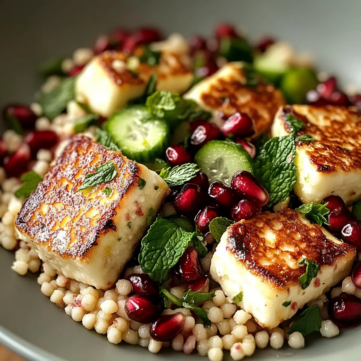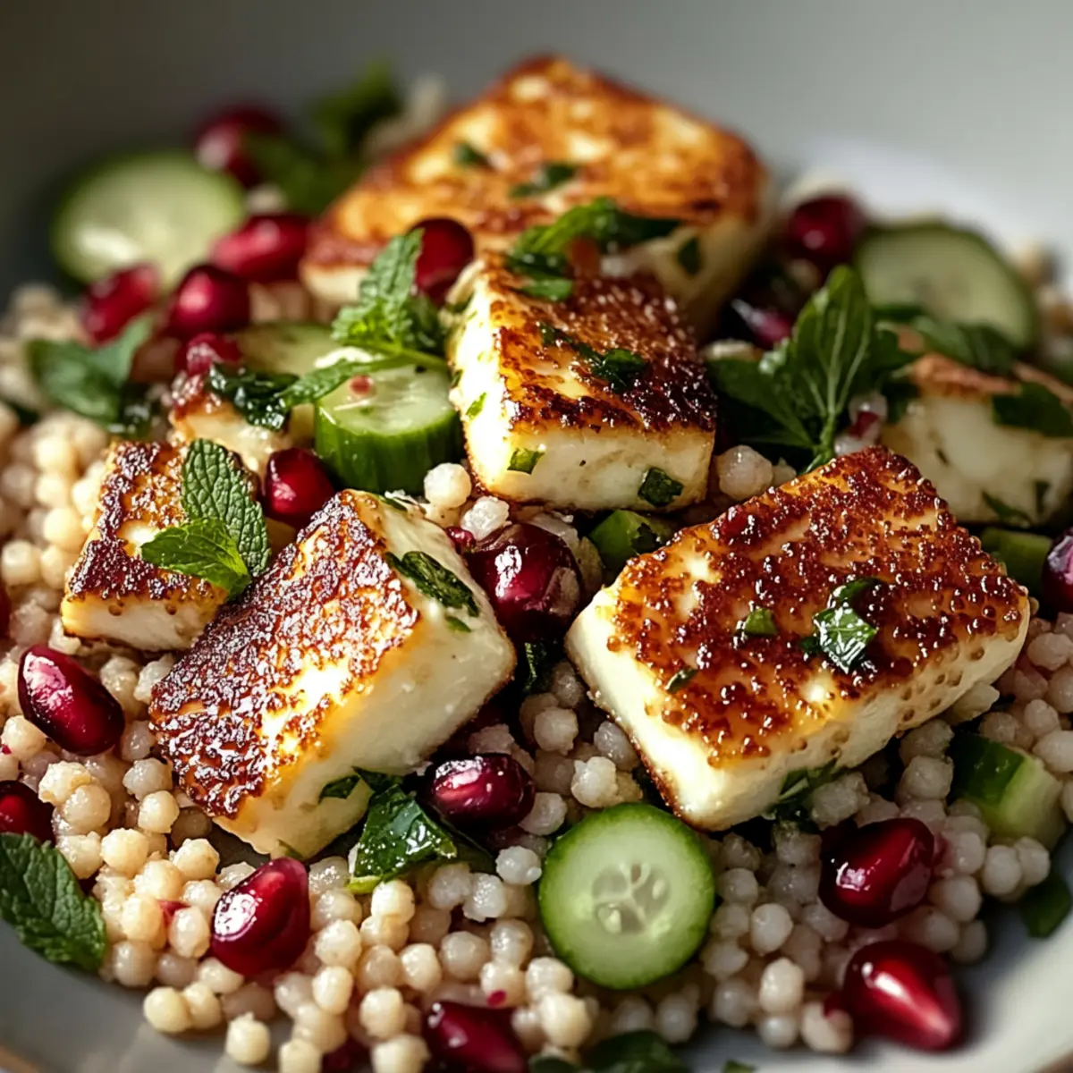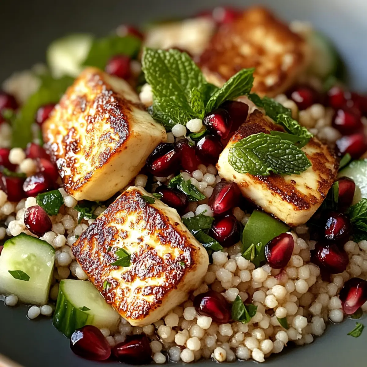 The vibrant colors of this Halloumi & Pomegranate Couscous Salad with Mint-Lemon Dressing dance on the plate, promising a little culinary adventure. As I tossed together crispy halloumi, jewel-like pomegranate seeds, and a zesty mint-lemon dressing, I felt an overwhelming sense of satisfaction. This recipe blends quick prep with unforgettable flavors – perfect whether you’re in a lunch rut or looking to impress at your next gathering. It’s not just a salad; it’s a canvas for personalization, inviting bursts of creativity that suit any palate. Want to delight your senses with something light yet fulfilling? Let’s dive into this Mediterranean-inspired dish that’s as delightful to make as it is to devour! Why is this salad a must-try? Bright, Vibrant Colors: The Halloumi & Pomegranate Couscous Salad is a feast for the eyes, making every bite as exciting as the first. Quick & Easy: With just 20 minutes of prep, it’s perfect for busy weekdays or last-minute gatherings. Flavor Explosion: Crispy halloumi complements the sweet-tart pops of pomegranate, creating a taste experience that’s both satisfying and refreshing. Customization Galore: Feel free to swap couscous for quinoa or add more veggies, ensuring every plate is unique. Enhance your meals with this salad alongside a delicious Chaffle Egg Cheese for added dimensions of flavor! Crowd-Pleaser: Whether it’s a light lunch or a festive side dish, it’s sure to impress everyone at the table, proving that salads can steal the spotlight. Elevate your culinary game today with this salad that’s as delightful to make as it is to share! Halloumi & Pomegranate Couscous Salad Ingredients For the Salad Couscous – A fluffy base that perfectly soaks up the dressing; swap it for quinoa to keep things gluten-free. Halloumi Cheese – Adds a crispy and salty element; be sure to choose vegetarian-friendly brands without animal rennet. Pomegranate Seeds – Provide juicy sweetness and vibrant color; can also be replaced with dried cranberries or halved fresh grapes. Cucumber – Offers a crunchy, refreshing texture; consider using bell peppers for a different crunch. Cherry Tomatoes – Introduce a juicy, slightly tart component; don’t substitute, as they’re essential for unique flavor. Fresh Mint – Enhances the dish with a fragrant and refreshing herb flavor; omit only if absolutely necessary. For the Dressing Lemon Juice – Brings zest and brightness to the salad; lime juice can serve as a great substitute. Olive Oil – A rich base for the dressing; opt for high-quality extra virgin oil for the best taste. Honey or Maple Syrup – Adds a hint of sweetness to balance the acidity; maple syrup is perfect for a vegan alternative. Salt & Pepper – Essential seasonings that elevate overall flavor; adjust to your taste preferences. Combine these delightful ingredients to create your Halloumi & Pomegranate Couscous Salad with Mint-Lemon Dressing that’s as full of life as it is of flavor! Step‑by‑Step Instructions for Halloumi & Pomegranate Couscous Salad with Mint-Lemon Dressing Step 1: Prepare Halloumi Heat a non-stick pan over medium heat for about 2 minutes. Slice the halloumi cheese into even pieces, placing them in the pan without oil. Cook for 2-3 minutes until golden brown and crispy on one side, then flip and repeat on the other side. Once both sides are beautifully browned, remove the halloumi from the heat and set aside to keep warm. Step 2: Cook Couscous In a large bowl, pour boiling water over the couscous, ensuring it’s fully submerged. Cover the bowl with a lid or plastic wrap and let it sit for 5-10 minutes. After this time, check the couscous; it should have absorbed all the water and be fluffy. Fluff up the couscous with a fork, ensuring it’s light and airy before moving on to the next step. Step 3: Make Dressing In a small bowl, whisk together the fresh lemon juice and olive oil until well combined, about 30 seconds. Add in honey or maple syrup, chopped mint, salt, and pepper to taste. Continue whisking until the dressing is emulsified and smooth, creating a bright mint-lemon dressing that will bring all the flavors of the Halloumi & Pomegranate Couscous Salad together beautifully. Step 4: Combine Ingredients In a large mixing bowl, combine the fluffy couscous, juicy pomegranate seeds, diced cucumber, and sweet cherry tomatoes. Drizzle the prepared mint-lemon dressing over the mixture, then gently toss everything together until the ingredients are evenly coated with the dressing. Take care not to break the pomegranate seeds as you mix. Step 5: Serve Transfer the colorful salad to a serving platter or bowls. Top generously with the warm, crispy slices of halloumi cheese, allowing them to melt slightly into the salad. This Halloumi & Pomegranate Couscous Salad can be enjoyed warm or chilled, making it a versatile dish ready to delight at any meal. Expert Tips for Halloumi & Pomegranate Couscous Salad Fresh Halloumi: For the best flavor, always use halloumi that’s freshly opened. It complements the salad’s texture beautifully, creating a delightful contrast with the fluffy couscous. Right Cooking Temperature: Ensure your pan is preheated before adding halloumi to achieve that golden crisp. A pan that’s too cold will make the halloumi chewy instead of crispy. Dressing Balance: Whisk the dressing until emulsified for a well-blended flavor. This ensures every bite of the Halloumi & Pomegranate Couscous Salad is perfectly seasoned. Ingredient Prep: Dice cucumbers and tomatoes uniformly to ensure even distribution throughout the salad. This not only enhances the presentation but also balances flavors in every forkful. Storage Tips: If making ahead, keep the dressing separate until just before serving to preserve the salad’s freshness and texture. It will still stay tasty for up to 3 days! Explore Customizations: Embrace the customizable nature of this salad! Think about adding roasted vegetables or grains 