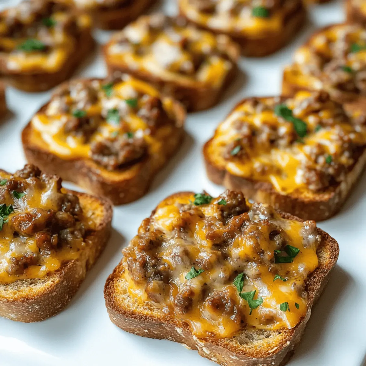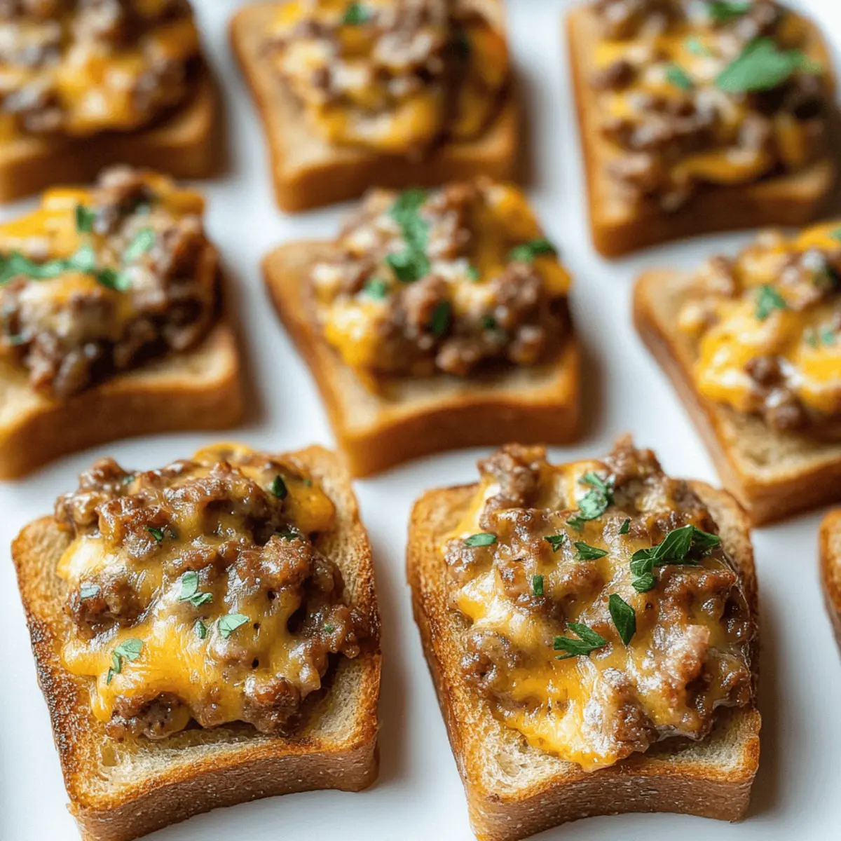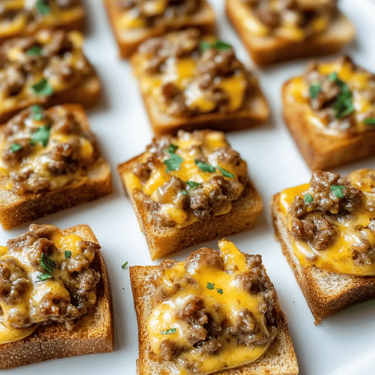 As the aroma of sizzling beef and spicy sausage fills my kitchen, I’m instantly transported back to countless gatherings with friends and family. Hanky Panky Appetizers are a delightful twist on nostalgic comfort food that have become my go-to recipe for any occasion. This dish brings together savory ground beef, zesty sausage, and creamy Velveeta, all nestled on crunchy rye bread. They’re not only a crowd-pleaser, but these appetizers are also quick to prepare, making them the perfect addition to your next party or game night. Whether you’re hosting a casual get-together or simply craving something delicious, you’ll love how easy it is to whip up this classic appetizer. Ready to dive into these cheesy bites? Let’s get cooking! Why are Hanky Panky Appetizers so irresistible? Nostalgic Flavors: Your taste buds will dance with delight as these appetizers combine tradition and comfort in every bite. Quick Preparation: With minimal prep time, you’ll be serving these cheesy delights in under 30 minutes! Crowd-Pleaser: Perfect for any occasion, they can bring everyone together around the table, creating a lively atmosphere. Versatile Ingredients: Feel free to customize with your choice of sausage and bread, ensuring there’s something for everyone. Make-Ahead Magic: Prepare them ahead of time and freeze for a quick last-minute snack option—ideal for busy schedules! Experience the joy of sharing these delightful Hanky Panky Appetizers, and consider pairing them with an assortment of finger foods or delicious dips for a complete party spread. Hanky Panky Ingredients For the Filling Ground Beef – Provides a hearty base; opt for lean ground beef for a healthier touch. Ground Hot Sausage – Infuses a delightful spice; substitute with mild sausage if you prefer less heat. Velveeta – Adds creaminess and smooth texture; try Cheddar for a sharper, more robust flavor. Worcestershire Sauce – Enhances the overall taste with its savory notes; soy sauce makes a great alternative. Oregano – Brings a hint of herbal freshness; can be omitted for a simpler flavor profile. Garlic Salt – Delivers seasoning depth; fresh minced garlic can elevate the flavor even further. Salt – Helps balance all the flavors; adjust based on your personal taste. For the Base Party Rye Bread – Serves as a crunchy foundation; swap it for pumpernickel or sourdough for a twist. Optional Garnish Chopped Parsley – Adds visual appeal and a fresh finish; it’s optional but brightens up the dish nicely. These Hanky Panky Appetizers promise to be a flavorful addition to your gatherings, perfect for satisfying any crowd! Step‑by‑Step Instructions for Hanky Panky Appetizers Step 1: Cook the Meat In a large skillet over medium heat, combine 1 pound of ground beef and 1 pound of ground hot sausage. Using a spatula, break the meat apart as it cooks, ensuring it browns evenly for about 5-7 minutes. Once browned, the meat should be no longer pink and should exude a savory aroma, signaling that it’s ready for the next step. Step 2: Cube the Cheese While the meat is cooking, take 8 ounces of Velveeta cheese and cut it into small cubes. This will help the cheese melt smoothly into the meat mixture later on. Aim for uniform cubes to ensure even melting, which adds a creamy texture to your Hanky Panky Appetizers. Step 3: Drain Excess Grease Once the meat is fully browned, carefully drain off any excess grease from the skillet. Use a colander or a spoon to remove unwanted fat, as this step ensures that your Hanky Panky filling remains deliciously rich and not overly greasy, resulting in a much lighter bite. Step 4: Mix in Cheese and Seasonings Return the skillet to low heat and stir in the cubed Velveeta cheese, allowing it to melt completely with the meat mixture. As the cheese becomes creamy, add in 1 tablespoon of Worcestershire sauce, 1 teaspoon of oregano, 1 teaspoon of garlic salt, and salt to taste. Stir well until everything is evenly combined and bubbling, about 2-3 minutes. Step 5: Preheat the Broiler Set your oven’s broiler to high, and prepare a baking sheet by lining it with slices of party rye bread. Aim to use about 24 slices, ensuring they’re spread evenly on the sheet. The preheated broiler will give the Hanky Panky Appetizers a lovely golden finish during baking. Step 6: Assemble the Bites Scoop a generous 2-tablespoon portion of the meat and cheese mixture onto each slice of rye bread. Spreading it evenly will help ensure every bite captures that delicious cheesy flavor and meaty goodness. You should have a beautifully topped baking sheet ready to broil! Step 7: Broil the Appetizers Place the baking sheet under the broiler and keep a close eye on it for 2-3 minutes. The edges of the meat and cheese mixture will begin to bubble and turn golden. If you prefer a softer finish, bake at 350°F for 15-18 minutes instead, until heated through and golden brown. Step 8: Optional Garnish and Serve Once done, carefully remove the Hanky Panky Appetizers from the oven. For added visual appeal, sprinkle with chopped parsley if desired. These cheesy delights are best served warm, allowing the creamy filling to shine. Arrange on a platter and get ready to enjoy! Hanky Panky Variations & Substitutions Feel free to unleash your creativity and tailor these appetizers to suit your taste buds! Mild Sausage: Swap hot sausage for mild sausage or ground turkey for a leaner bite. This will still deliver great flavor without the extra heat. Cheese Alternatives: Experiment with different cheeses like Cheddar or Monterey Jack for a unique twist on the traditional taste. Imagine the rich flavor of melted Cheddar oozing through each bite! Herbs Galore: Get adventurous with herbs like thyme or basil. This adds a fragrant touch that elevates the experience, taking you to new flavor heights. Bread Choices: Don’t limit yourself to rye; try mini baguettes or gluten-free bread to cater to everyone’s preferences. Just visualiz