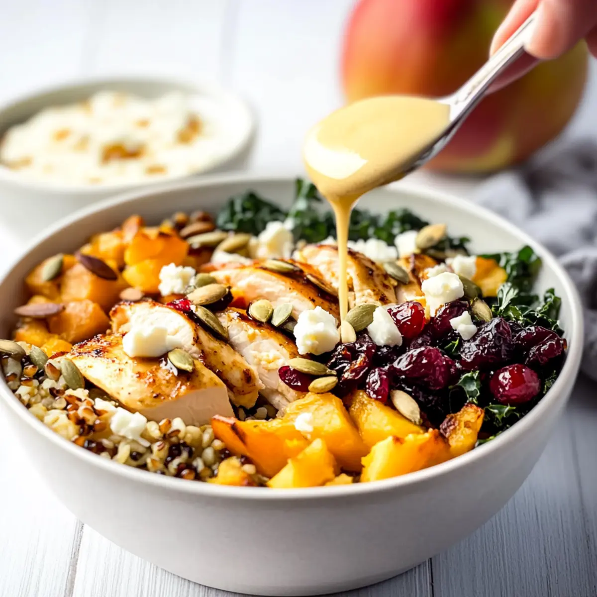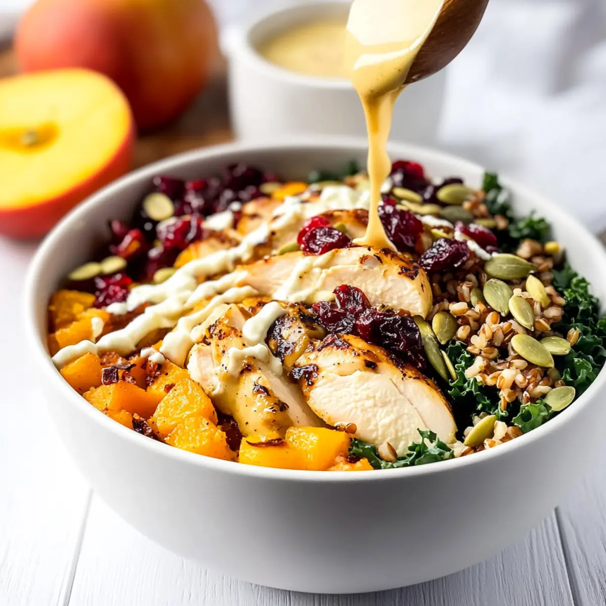 1. Layer farro at the base of each bowl, add crispy kale, butternut squash, apple slices, and grilled chicken. Top with feta, cranberries, and pumpkin seeds, and drizzle with dressing.