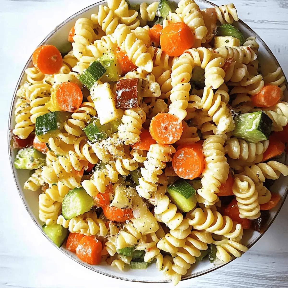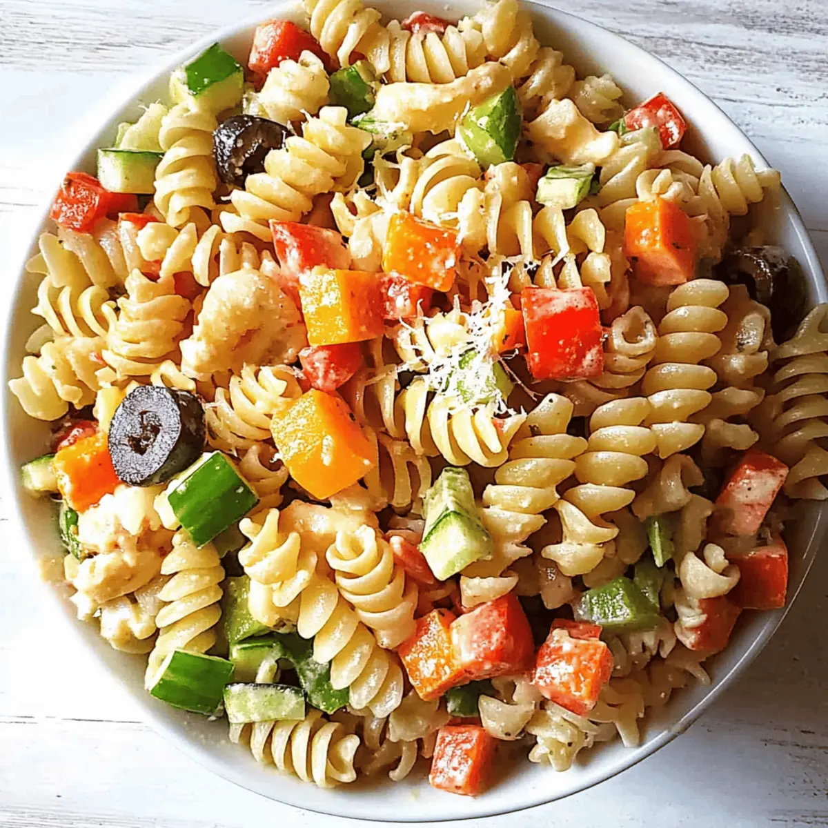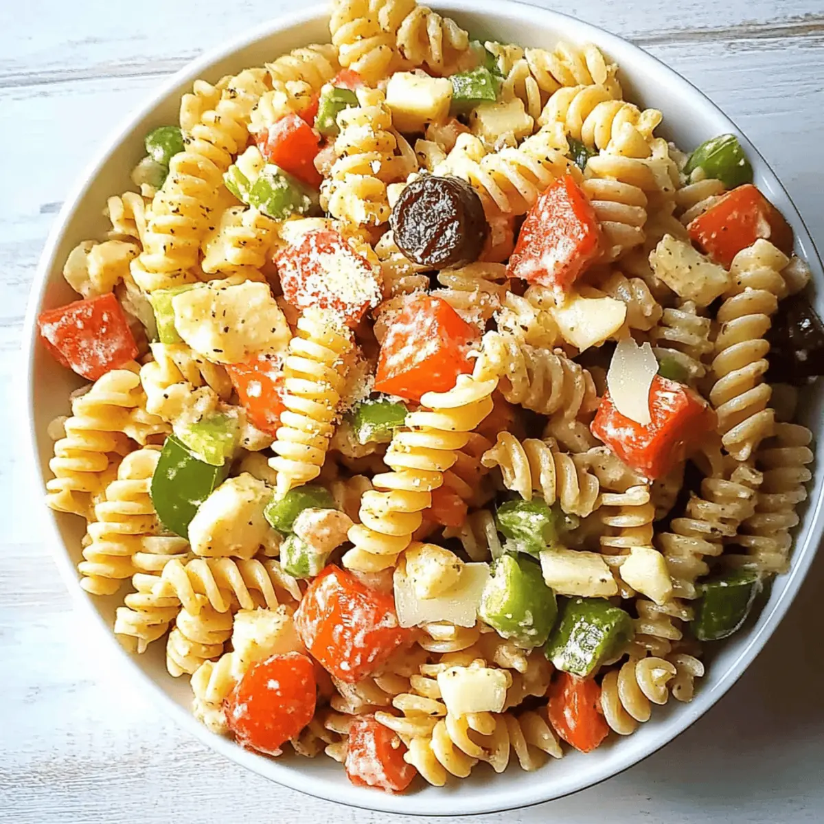 A lively burst of colors and flavors hits you as you prepare this Copycat Kraft’s Italian Pasta Salad. It’s reminiscent of summer picnics and backyard barbecues, combining tricolor rotini with a zesty Italian dressing that promises quick satisfaction. Not only is this recipe a nostalgic nod to a classic favorite, but it also serves as a fantastic, stress-free side dish for gatherings or simple family meals. With just a few easy steps, you can whip up a refreshing and customizable salad that caters to everyone’s palate. Plus, it’s not just quick to make; it’s also a make-ahead marvel, ideal for those busy days when time is tight. Curious about how to bring all these vibrant elements together? Let’s dive into the recipe! Why is Italian Pasta Salad a Must-Try? Colorful, Eye-Catching Presentation: The vibrant tricolor rotini makes this salad not only delicious but visually appealing for any gathering. Quick Preparation: With just a few simple steps, you can whip up this delightful dish perfectly suited for hectic summer days or impromptu BBQs. Versatile Flavor Profile: Tailor it to your taste with customizable add-ins like olives, mini pepperoni, or fresh veggies, ensuring it’s a hit with everyone. Nostalgia Delight: This copycat of a beloved classic brings back fond childhood memories, making every bite a potential walk down memory lane. Make-Ahead Marvel: Prepare this salad in advance, allowing the flavors to meld beautifully and saving you precious time on busy days. Experience the joy of homemade goodness that shines in dishes like Corn Pasta Salad and Butter Shrimp Pasta, with your family and friends asking for seconds! Italian Pasta Salad Ingredients For the Pasta • Tri-Color Rotini – The vibrant base offering structure and a fun visual appeal; feel free to substitute with any short pasta of your choice. For the Dressing • Kraft’s Zesty Italian Dressing – This tangy dressing is a key element for flavor; a homemade Italian vinaigrette works as a great alternative if needed. For Seasoning • Italian Seasoning – Infuses the salad with a delightful blend of herbs like oregano and basil; you can swap it with individual dried herbs to suit your preferences. • Sweet Basil – Adds a fresh, sweet note; using fresh basil will enhance the flavor’s richness. • Onion Powder – Contributes a mild onion flavor without texture; fresh onions can be substituted, but use them sparingly. • Garlic Powder – Complements the onion with a robust garlicky taste; fresh minced garlic is an option too, but be cautious with the amount. For Creaminess • Grated Parmesan Cheese – This finishing touch brings a creamy element to the salad; nutritional yeast can be used as a vegan substitute. For Extra Flavor • Sliced Olives – Offers a briny depth and can be personalized based on your tastes. • Cubed Colby Jack Cheese – Adds richness and a mild flavor; feel free to switch with your favorite cheese. • Mini Pepperoni – Perfect for a savory bite; omit it for a vegetarian option. • Sliced Green Pepper – Introduces a refreshing crunch; any bell pepper can work. • Sliced Onion – Adds a zestiness and crunch; opt for milder varieties if you prefer. • Cherry or Grape Tomatoes – These juicy bites brighten the dish and offer a hint of sweetness. • Mini Croutons – For an extra crispy texture, sprinkle these on top before serving. Tailor your Italian Pasta Salad to your heart’s content with these varied ingredients and enjoy a delightful blend of flavors at your next gathering! Step‑by‑Step Instructions for Copycat Kraft’s Italian Pasta Salad Step 1: Cook the Pasta Begin by boiling a large pot of salted water over high heat. Once it reaches a rolling boil, add the tri-color rotini and cook according to package instructions, usually about 7-9 minutes, until al dente. Drain the pasta in a colander and rinse under cold water to stop the cooking process and cool it down, ensuring a delicious Italian Pasta Salad. Step 2: Combine Dressing and Seasonings In a spacious mixing bowl, pour in the Kraft’s Zesty Italian Dressing. Add Italian seasoning, sweet basil, onion powder, and garlic powder. Whisk these ingredients together for about 30 seconds until well blended. This flavorful mixture will give your Spanish Pasta Salad that signature tang; set it aside while you prepare the pasta. Step 3: Mix Pasta with Dressing Once the pasta has cooled, add the rotini into the bowl with the dressing mixture. Using a spatula or large spoon, gently toss the pasta to ensure each piece is evenly coated in the vibrant dressing and seasonings. This should take about 1-2 minutes, providing a beautiful base for your Copycat Kraft’s Italian Pasta Salad. Step 4: Add Cheese and Mix Next, sprinkle the grated Parmesan cheese over the coated pasta. Gently fold the cheese into the salad, allowing it to melt slightly and enhance the creamy texture throughout. This should take another minute, ensuring every bite of your Italian Pasta Salad is rich and satisfying. Step 5: Incorporate Additional Ingredients Now it’s time to elevate your dish! If desired, mix in sliced olives, cubed Colby Jack cheese, mini pepperoni, sliced green pepper, sliced onion, and cherry tomatoes to add color and flavor. Gently toss again, making sure all add-ins are distributed evenly throughout the salad. Step 6: Chill Before Serving For the best flavor experience, cover the bowl with plastic wrap and place it in the refrigerator for at least 1 hour. This chilling time allows all the flavors of the Italian Pasta Salad to meld beautifully, creating a refreshing dish that’s perfect for summer gatherings. Expert Tips for Italian Pasta Salad Perfect Pasta Texture: Ensure you cook the rotini al dente to keep its firmness in the salad; overcooked pasta can become mushy. Chill for Flavor: Letting the Italian Pasta Salad sit in the fridge for at least an hour enhances the flavors, allowing them to mingle beautifully. D