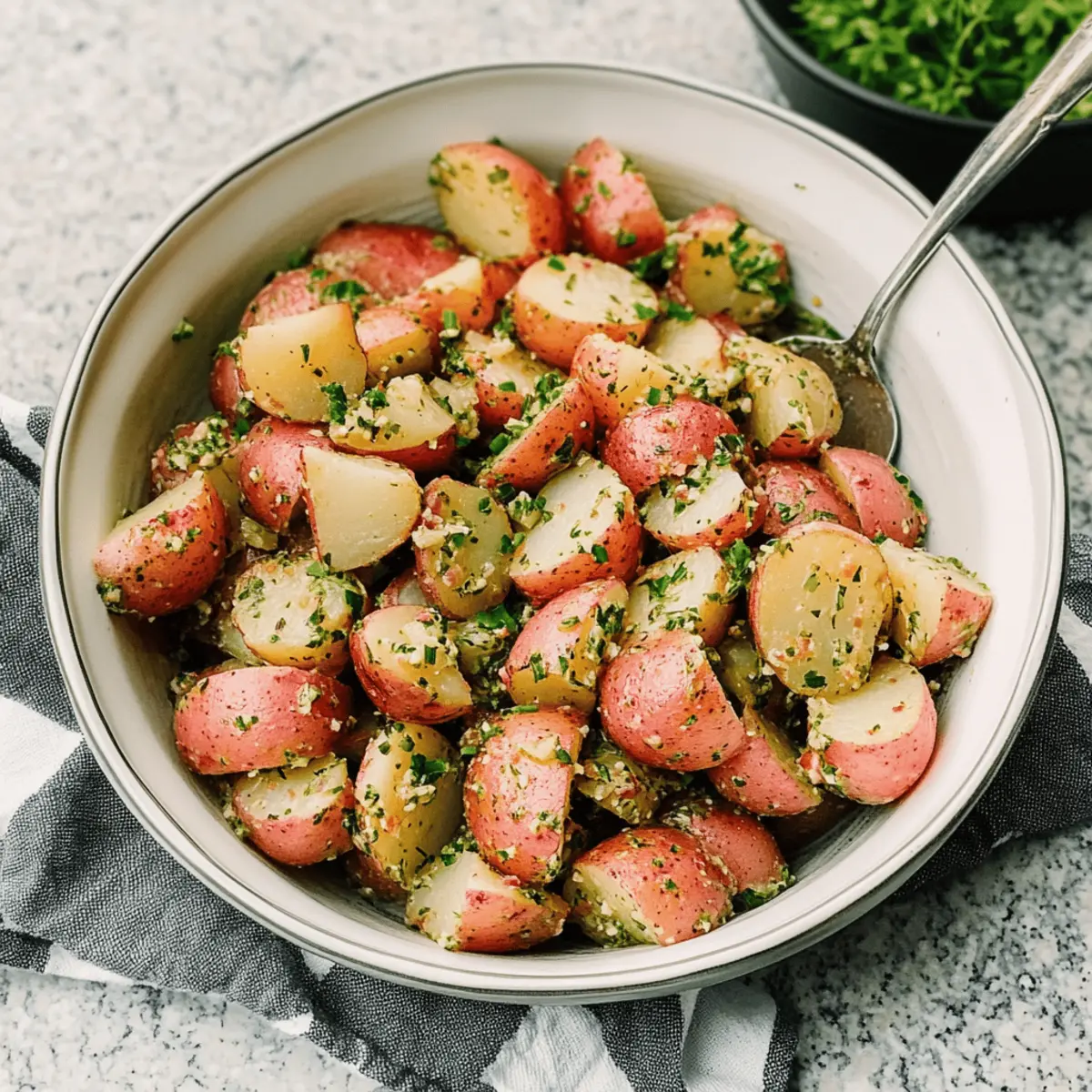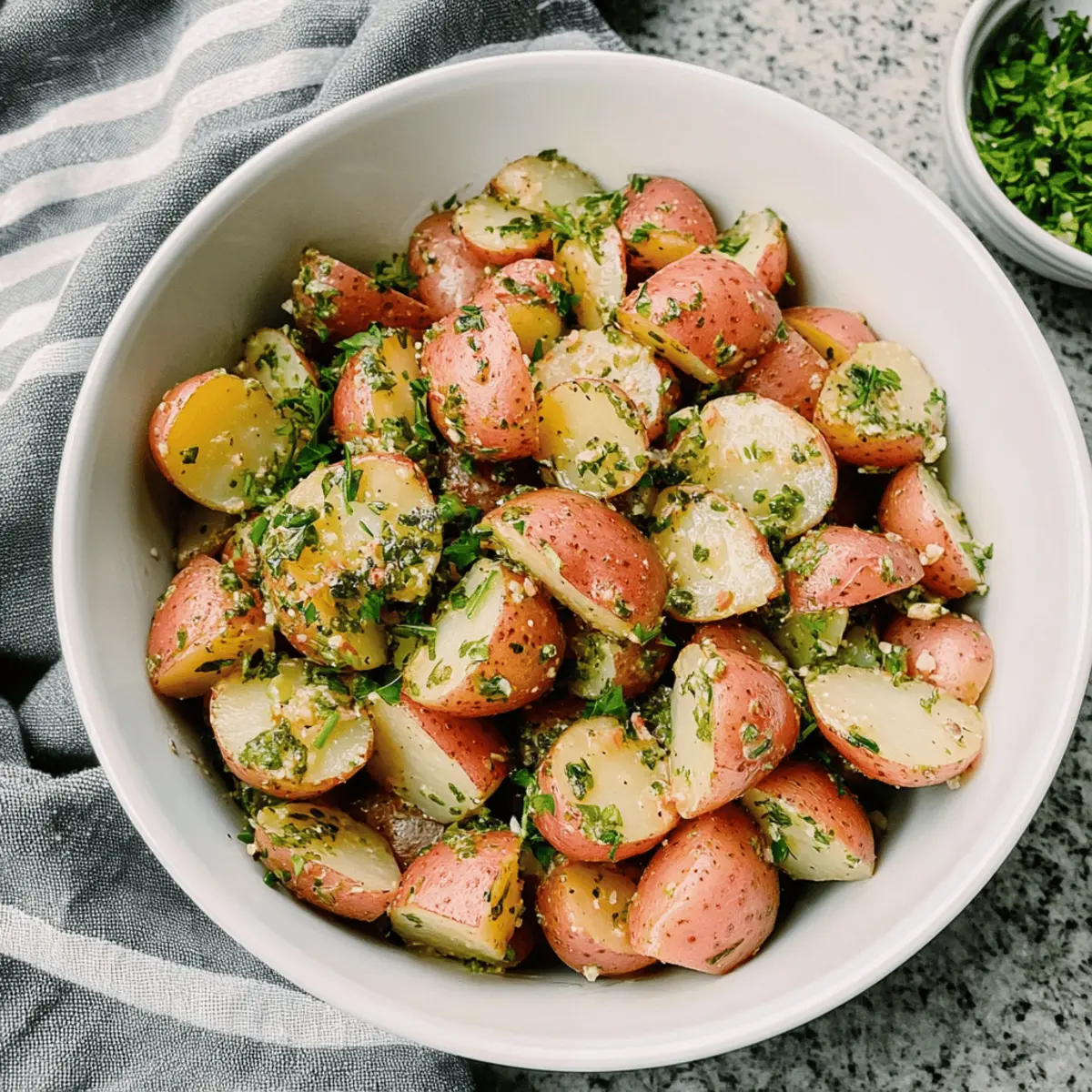 Last summer, at a sun-soaked picnic with friends, I stumbled upon a vibrant dish that quickly became a crowd favorite: Classic Italian Potato Salad with Red Wine Vinaigrette. As I tossed the tender baby potatoes with the tangy dressing, bursts of flavor from fresh herbs filled the air, making it impossible to resist. This no-mayo salad is not only a healthy choice but also a delightful vegan and gluten-free option, perfect for potlucks and warm gatherings. The best part? It only gets better as it marinates, allowing the ingredients to meld into a symphony of taste. Are you ready to elevate your summer side dishes with this easy and delectable recipe? Why is this potato salad irresistible? Freshness is at the heart of this Italian Potato Salad, featuring vibrant ingredients that burst with flavor. No-Mayo & Light: Ditch the heaviness of traditional salads for a vegan, gluten-free delight that’s equally satisfying. Versatile Flavor: Customize with herbs or add-ins like bell peppers for a unique twist. Easy Preparation: With just a few simple steps, you’ll have a stunning dish ready for any gathering. Perfect as a side for grilled meats or just to spice up your weeknight dinners, it’s a crowd-pleaser that is sure to impress! Italian Potato Salad Ingredients • Discover the vibrant flavors! For the Salad • Baby Red New Potatoes – The starchy base that gives the salad a delightful texture; feel free to swap them with Yukon Gold or fingerling potatoes for a different taste. • Kosher Salt – Enhances all the natural flavors; adjust according to your taste preferences. • Extra Virgin Olive Oil – Adds richness and a smooth texture to the vinaigrette. • Red Wine Vinegar – Provides a tangy acidity that perfectly balances the dish; you can substitute it with champagne or white wine vinegar if needed. • Lemon (zest and juice) – Introduces a refreshing brightness; the zest enhances aroma, while juice can be adjusted for desired tartness. • Garlic (minced) – Delivers depth of flavor; garlic powder can be used for a milder touch. • Ground Pepper – A seasoning element that adds a hint of heat; adjust to your personal spice level. • Fresh Parsley (chopped) – Brightens the salad with its herbal notes; fresh basil or mint can be great alternatives. • Fresh Chives (chopped) – Adds a mild onion flavor; consider using green onions for a subtle twist. For the Vinaigrette • Extra Virgin Olive Oil – Forms the base of the dressing, creating a rich, luscious coating for the potatoes. • Red Wine Vinegar – Key for adding that tangy punch, complementing the no-mayo theme of the Italian Potato Salad. Step‑by‑Step Instructions for Classic Italian Potato Salad Step 1: Prepare Potatoes Start by washing the baby red new potatoes thoroughly under cold water. Slice each potato into “fat” quarters to ensure even cooking. Aim for consistent size for uniform tenderness. Set them aside while you prep for the boiling step, and get ready for that vibrant Italian Potato Salad! Step 2: Boil Place the quartered potatoes into a large pot and cover them with cold water, adding a generous pinch of kosher salt. Bring the water to a rolling boil over high heat, then reduce to a gentle simmer. Cook the potatoes for 8-10 minutes, until they are tender but still firm. You should be able to pierce them easily with a fork without them falling apart. Step 3: Make Vinaigrette While the potatoes are cooking, grab a mixing bowl and whisk together ¼ cup of extra virgin olive oil, 3 tablespoons of red wine vinegar, the juice and zest of 1 lemon, and 1 minced garlic clove. Add in the chopped parsley and chives. Whisk until the mixture is well emulsified and fragrant, creating a tangy dressing that beautifully complements the Italian Potato Salad. Step 4: Drain and Dry Potatoes Once tender, carefully drain the cooked potatoes in a colander. Return the potatoes to the hot pot for a few minutes to allow remaining moisture to evaporate. This step ensures the potatoes absorb the vinaigrette fully, enhancing the flavor of your Italian Potato Salad. Step 5: Combine Ingredients Transfer the warm potatoes to a large salad bowl and pour the vinaigrette over them. Gently toss the mixture until every piece is well coated with that aromatic dressing. Adjust the seasoning with a sprinkle of salt and ground pepper to taste, allowing the flavors to shine in your Italian Potato Salad. Step 6: Marinate Let the salad sit at room temperature for at least 1 hour before serving, giving it a chance for the flavors to meld together and deepen. Ideally, the Italian Potato Salad becomes even more delightful if you can marinate it longer, so plan ahead if possible for those summer gatherings! How to Store and Freeze Italian Potato Salad Fridge: Store any leftover Italian Potato Salad in an airtight container in the refrigerator for up to 4 days. This allows the flavors to continue to develop even after serving. Freezer: While it’s best enjoyed fresh, you can freeze the salad for up to 1 month. However, the texture of the potatoes may change once thawed. Reheating: If serving straight from the fridge, allow the salad to come to room temperature before enjoying to enhance its flavors. Avoid reheating in the microwave, as this can make the potatoes mushy. Preparation: For best results, assemble the salad fresh and only store the vinaigrette separately if you want the best flavor and texture when serving later. Italian Potato Salad Variations Feel free to explore these delightful twists that will brighten up your Italian Potato Salad and make it uniquely yours! Different Potatoes: Swap baby red potatoes for Yukon Gold or fingerling varieties to add a buttery flavor and creamy texture. Herb Options: Toss in fresh basil or mint in place of parsley for a refreshing herbal note that complements summer gatherings beautifully. Veggie Boost: Mix in diced bell peppers or sliced black olives for a vibrant splash of color and a sa