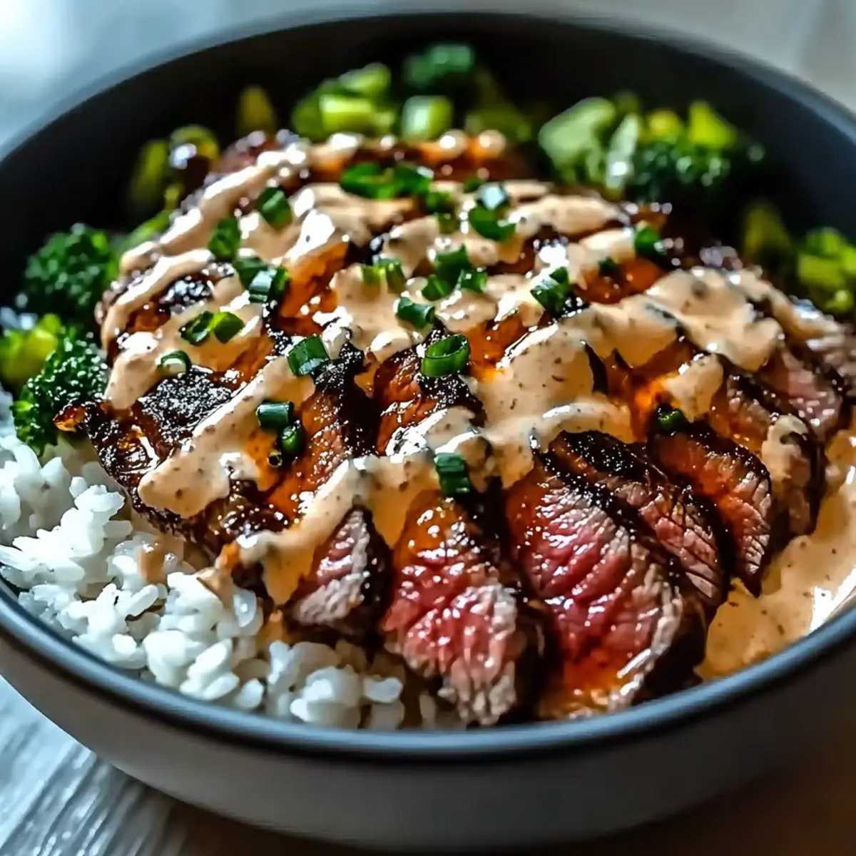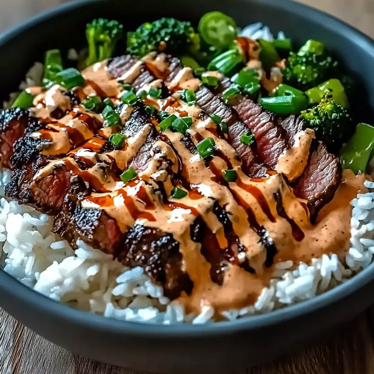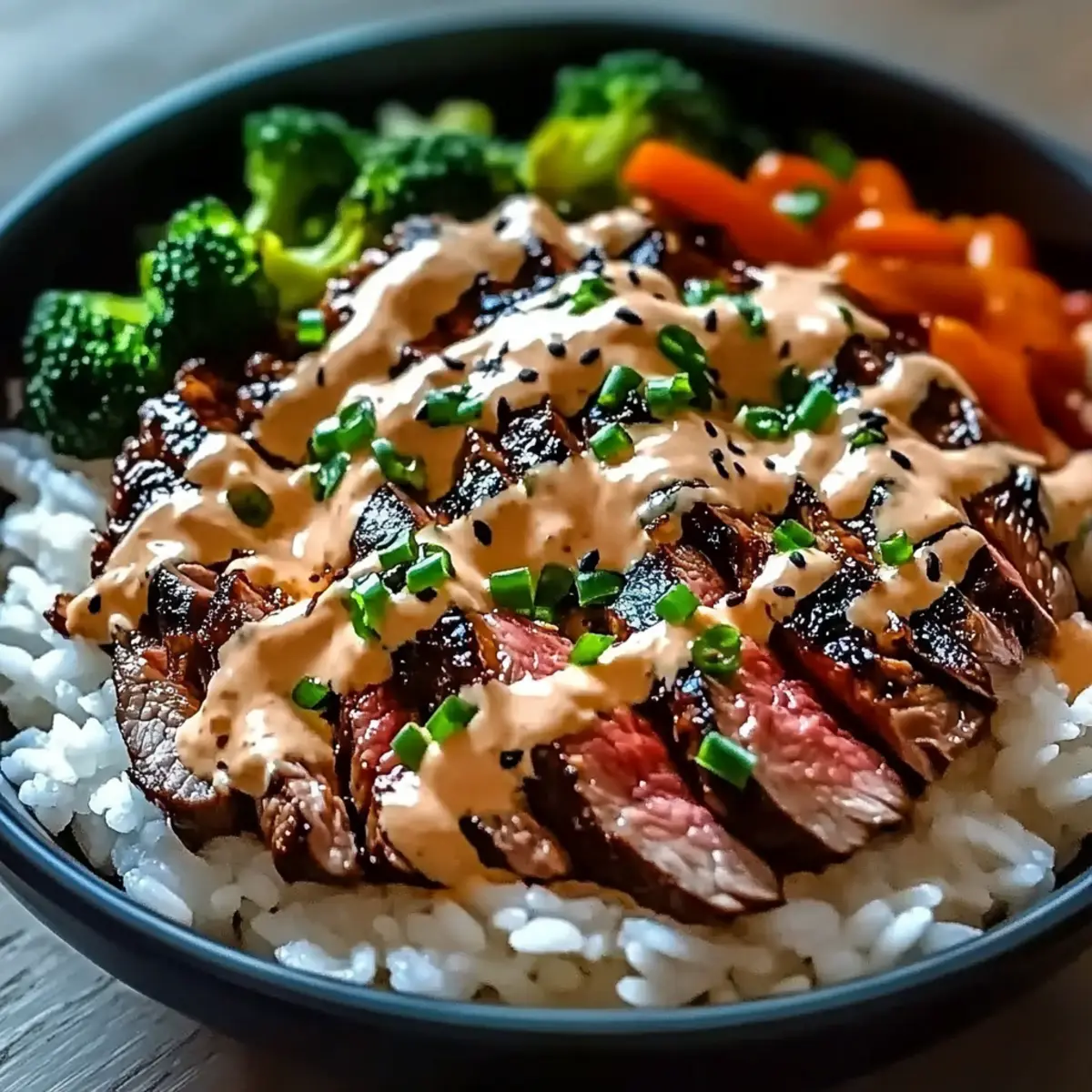 Korean BBQ Steak Rice Bowls combine marinated steak, rice, and spicy cream sauce for a satisfying dinner that's easy to prepare.