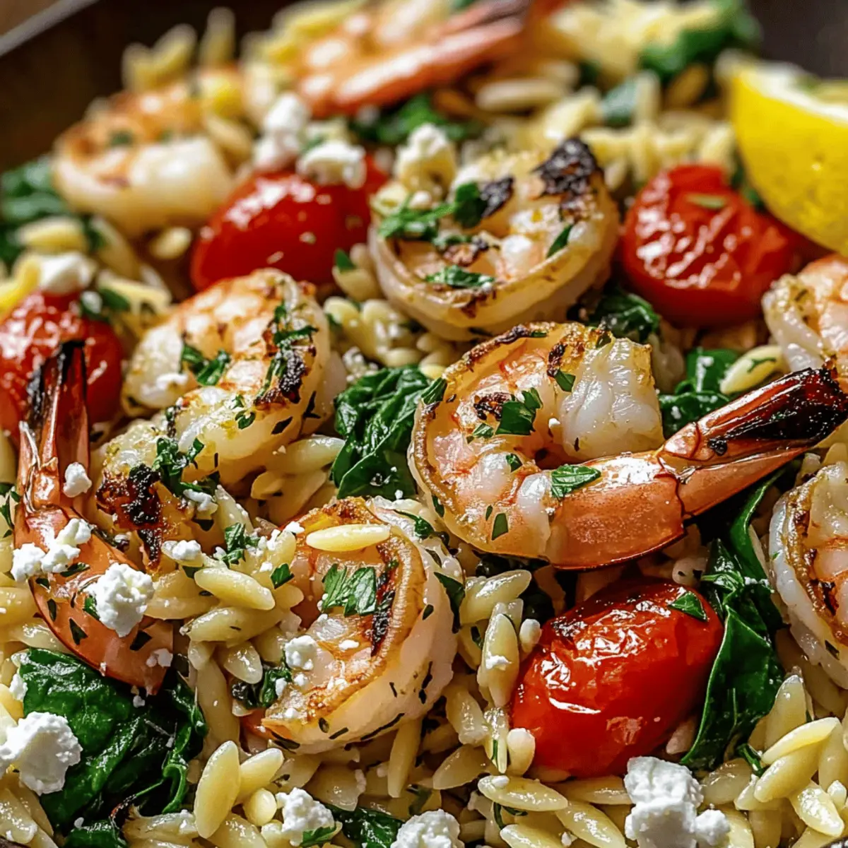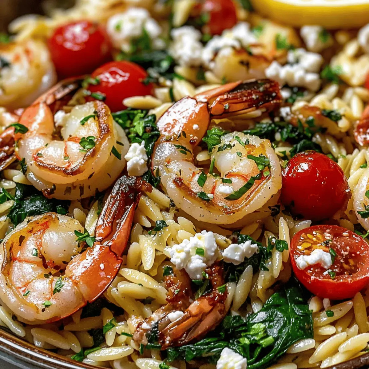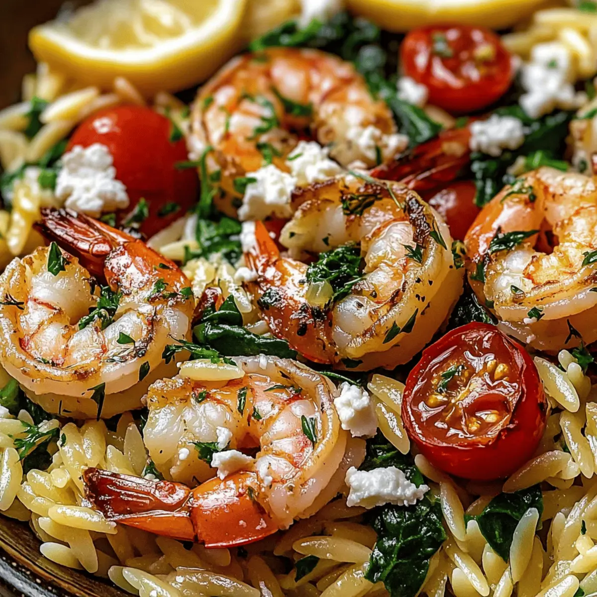 As the golden glow of summer sunsets paints the sky, I find myself craving vibrant dishes that capture the essence of the season. That’s where my Mediterranean Lemon Feta Orzo with Roasted Shrimp comes into play, a perfect blend of zesty lemon, creamy feta, and succulent shrimp that transports me straight to sun-kissed shores. Not only is this dish quick and easy to whip up, but it also shines at any gathering, making it an ideal choice for picnics or dinner parties. Imagine a colorful medley of orzo pasta, fresh herbs, and juicy tomatoes all coming together in perfect harmony. Ready to savor a taste of the Mediterranean in your own kitchen? Let’s dive into this delightful recipe! Why is this dish so delightful? Bright, Bold Flavors: A delightful fusion of zesty lemon and creamy feta creates a taste explosion that sings of the Mediterranean. Easy Preparation: With just a few simple steps, this dish is perfect for those who want a homemade meal without the fuss. Versatile Options: Whether you stick with shrimp or try alternatives like grilled chicken or marinated tofu, you’ll love how adaptable this recipe is. Crowd-Pleasing Appeal: Serve this orzo at your next gathering, and watch your friends and family rave about its vibrant colors and mouthwatering flavors. Pair it with a refreshing Peach Lemonade Refreshing to elevate your meal. Perfect for Any Occasion: Whether it’s a warm summer picnic or a cozy dinner at home, this dish shines in any setting, warming hearts and filling bellies. Lemon Feta Orzo Roasted Shrimp Ingredients • For the Shrimp Large shrimp – Peel and devein for the best texture; you can also use grilled chicken or marinated tofu as an alternative protein. Extra-virgin olive oil – Adds richness and enhances the flavors beautifully. Kosher salt – Elevates the overall flavor; adjust according to your taste preference. Black pepper – Gives mild heat; freshly ground provides the best taste. Dried oregano – Infuses the dish with lovely herbal notes typical of Mediterranean cuisine. Smoked paprika – Adds a subtle smokiness; feel free to omit if you prefer milder flavors. Lemon zest and juice – Brightens the dish with acidity; fresh is always best for the strongest flavor. • For the Orzo Orzo pasta – The delightful base of this dish, perfect for a chewy texture; for a gluten-free option, swap for gluten-free or rice. Garlic – Provides aromatic flavor; finely grate it for even distribution. Crushed red pepper flakes – Optional heat; add according to your spice preference. Cherry tomatoes – Adds sweetness and color to the dish; halved for better incorporation. Baby spinach – Offers a pop of color and nutrients; chop roughly before mixing in. • For Freshness Fresh parsley and dill – Bring freshness to the dish; substitute dill with basil or mint if you wish. Feta cheese – Creamy and tangy; soft goat cheese can be used for a milder flavor. Capers – Optional for a briny kick; make sure to rinse them before adding. Let’s gather these ingredients and embark on a delightful culinary journey with this Lemon Feta Orzo with Roasted Shrimp! Step‑by‑Step Instructions for Lemon Feta Orzo Roasted Shrimp Step 1: Preheat the Oven Begin by preheating your oven to 425°F (220°C). While the oven warms up, line a baking sheet with parchment paper to prevent sticking and ensure easy cleanup. This step is crucial as it prepares a hot, even cooking environment for the shrimp, promising that wonderfully roasted flavor. Step 2: Prepare the Shrimp In a mixing bowl, combine the large peeled and deveined shrimp with extra-virgin olive oil, kosher salt, black pepper, dried oregano, smoked paprika, and lemon zest. Toss everything well to ensure the shrimp are coated evenly in spices. Spread the seasoned shrimp out in a single layer on the prepared baking sheet, allowing for optimal roasting. Step 3: Roast the Shrimp Place the baking sheet in the preheated oven and roast the shrimp for 8–10 minutes. Keep an eye on them as they cook; they should turn opaque and slightly curled when done. This quick roasting process enhances their natural sweetness while retaining juiciness—a key element in our Lemon Feta Orzo Roasted Shrimp. Step 4: Cook the Orzo While the shrimp are roasting, bring a large pot of salted water to a rolling boil. Add the orzo pasta and cook until al dente, usually about 8-10 minutes. Once cooked, drain the orzo in a colander, then return it to the pot to keep it warm while you prepare the rest of the dish. Step 5: Dress the Orzo To the hot orzo pasta, add in some extra-virgin olive oil, fresh lemon juice, grated garlic, and optional crushed red pepper flakes. Stir everything together gently to ensure that the pasta absorbs the tangy flavors. This dressing is essential for coating the orzo, infusing it with the bright essence of our Lemon Feta Orzo. Step 6: Fold in the Veggies Next, fold in halved cherry tomatoes, roughly chopped baby spinach, fresh parsley, and dill into the orzo mixture. Stir until the spinach wilts slightly from the residual heat, creating a beautiful blend of colors and flavors. This medley adds nutritional goodness and a Mediterranean flair to our dish. Step 7: Add the Feta Gently mix in the crumbled feta cheese and optional capers into the orzo until evenly distributed. The creamy feta enhances the dish’s richness, while the capers provide a touch of briny flavor, elevating the overall experience of the Lemon Feta Orzo with Roasted Shrimp. Step 8: Serve and Enjoy Finally, transfer the lemon feta orzo to a serving dish and top it with the roasted shrimp. This dish can be enjoyed warm or at room temperature, making it a perfect centerpiece for picnics or gatherings. Garnish with extra herbs and lemon wedges for an added pop of color and flavor! How to Store and Freeze Lemon Feta Orzo Fridge: Store leftovers in an airtight container for up to 2 days; the flavors actually improve over time, making your Lemon Feta Orzo wit