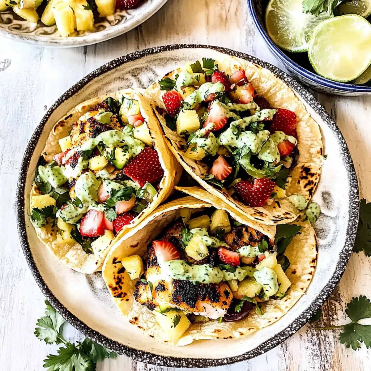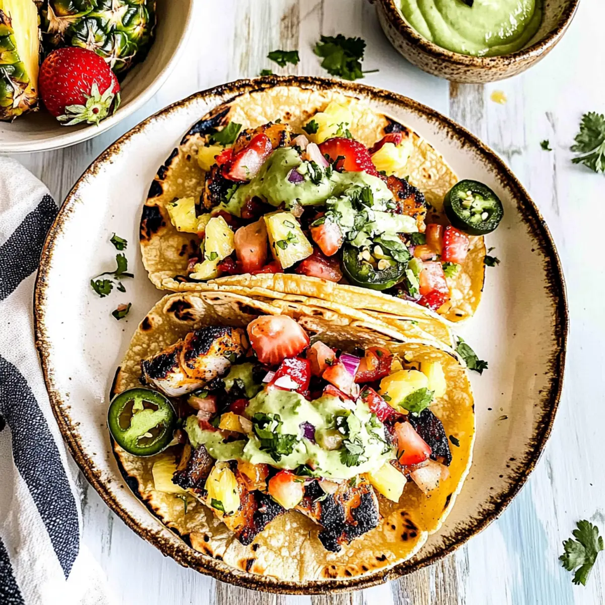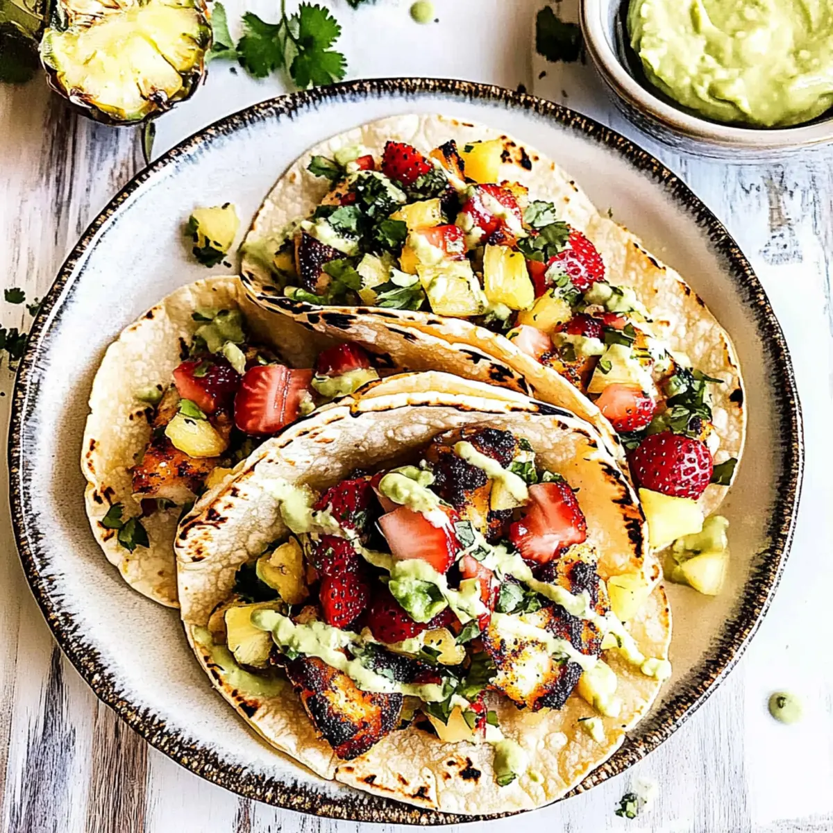 “Why settle for bland bites when you can indulge in vibrant flavors?” That was my reaction when I first tried Mahi Mahi Fish Tacos, and ever since, they’ve become a staple in my kitchen. This recipe marries the smokiness of seasoned mahi mahi with a refreshing strawberry pineapple slaw, creating a culinary fiesta that brings joy to any table. Quick to prepare—often in less than 40 minutes—these tacos are not only casual and fun but also a healthy alternative to fast food, packed with lean protein and essential nutrients. Plus, they’re gluten-free when served on corn tortillas, making them a versatile dish for everyone. Are you ready to whip up a taco night that will delight your family and friends? Let’s dive into this delicious recipe! Why Choose Mahi Mahi Fish Tacos? Flavor Explosion: The bold combination of the perfectly seasoned mahi mahi and zesty strawberry pineapple slaw guarantees a delightful experience with every bite. Quick Prep Time: Enjoy a tasty meal ready in under 40 minutes—perfect for those busy weeknights! Healthy Choice: Packed with lean protein and low in mercury, these tacos are a nutritious option that outshines fast food alternatives. Versatile Variations: Feel free to switch out the mahi mahi for cod or tilapia, or customize your slaw with seasonal fruits for a fresh twist. Gluten-Free Delight: Served in corn tortillas, they cater to gluten-free diets without sacrificing flavor. Whether you’re hosting a taco night or simply treating yourself, these tacos are guaranteed to impress! If you’re looking for more delicious options, try our Baked Chicken Tacos for a different flavor experience! Mahi Mahi Fish Tacos Ingredients For the Fish Mahi Mahi Fillets – The star of the dish, bringing lean protein and a moist texture. Olive Oil – Used for cooking, adds depth; substitute with avocado oil for a unique flavor. Lime Juice – Offers brightness; freshly squeezed is the way to go! Reduced Sodium Soy Sauce – Introduces umami to the marinade; coconut aminos work as a gluten-free alternative. Seasonings (paprika, chipotle chile powder, brown sugar, cumin, garlic powder, onion powder, salt, oregano) – Create a flavorful depth; adjust spices to suit your heat preference. For the Slaw Green Cabbage – Provides the crunchy base; purple cabbage tossed in makes for a colorful twist. Strawberries, Pineapple, Blueberries – Fruits that enhance sweetness and fresh flavor; swap with any seasonal fruit you love! Red Onion – Adds a sharp contrast; can be omitted for a milder taste if preferred. Jalapeños – For a kick of heat; adjust the quantity based on your spice tolerance. Cilantro – Fresh herb that brightens the slaw; omit if you’re not a fan. For Serving Corn Tortillas – Essential for authentic taste and gluten-free goodness; feel free to try homemade versions for a richer texture. Avocado Crema – Adds creaminess that balances the flavors; it’s simple to make and elevates your tacos! Step‑by‑Step Instructions for Mahi Mahi Fish Tacos Step 1: Marinate the Fish In a large bowl, whisk together olive oil, lime juice, reduced sodium soy sauce, and the spices—paprika, chipotle chile powder, brown sugar, cumin, garlic powder, onion powder, salt, and oregano. Once combined, add the mahi mahi fillets, coating them completely in the marinade. Let the fish marinate for 15 to 30 minutes; this allows the flavors to penetrate while you prepare the other components. Step 2: Prepare the Slaw and Crema While the mahi mahi fish is marinating, prepare the strawberry pineapple slaw. In a large mixing bowl, combine shredded green cabbage, diced strawberries, pineapple, blueberries, finely chopped red onion, and jalapeños. Toss to mix all ingredients evenly. For the avocado crema, blend together ripe avocados, lime juice, a pinch of salt, and a little water until smooth. Set both the slaw and crema aside. Step 3: Cook the Fish Heat a skillet over medium-high heat and add a drizzle of olive oil. Once the oil is shimmering, carefully place the marinated mahi mahi fillets in the skillet. Cook each side for about 3-4 minutes, or until the fish turns golden brown and flakes easily with a fork; the internal temperature should reach approximately 137°F for optimal doneness. Step 4: Warm the Tortillas While the fish is cooking, wrap your corn tortillas in foil and place them in the oven at 350°F for about 5-7 minutes. This step will warm the tortillas and make them softer and more pliable for easy assembly of your mahi mahi fish tacos, ensuring a delightful texture with each bite. Step 5: Assemble the Tacos Once the fish is cooked, allow it to rest for a minute before breaking it into bite-sized pieces. Take a warm tortilla, fill the center with the flaky mahi mahi, then generously top with the vibrant strawberry pineapple slaw and a drizzle of the creamy avocado crema. Garnish with additional cilantro or lime wedges as desired to add an extra burst of flavor. What to Serve with Mahi Mahi Fish Tacos Enhance your taco night with delightful pairings that elevate these vibrant flavors into a full feast. Cilantro Lime Rice: The zesty flavors of this fluffy rice complement the fish while adding a refreshing twist to the meal. Grilled Corn on the Cob: Sweet, charred corn brings a smoky element that enhances the overall experience of the tacos. Tortilla Chips with Salsa: Crunchy chips dipped in zesty salsa provide texture and a perfect starter for your taco feast. Mango Black Bean Salad: This colorful salad introduces a medley of textures and flavors that pairs beautifully with the mahi mahi. For those seeking more contrast, consider a side of Roasted Vegetables. Their earthy flavors enhance the taco filling, adding a satisfying bite to your meal. And don’t forget to sip on a Crisp White Wine—the perfect companion to cut through the richness of the avocado crema while enhancing the fresh, fruity slaw! Make Ahead Options These Mahi Mahi Fish Tacos are perfect fo