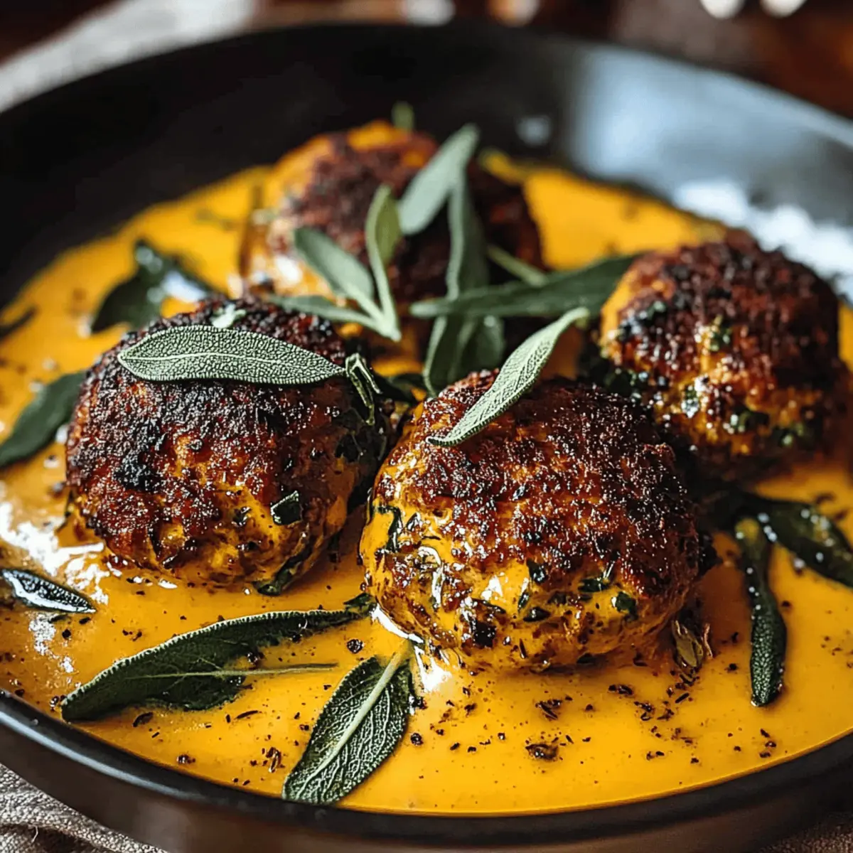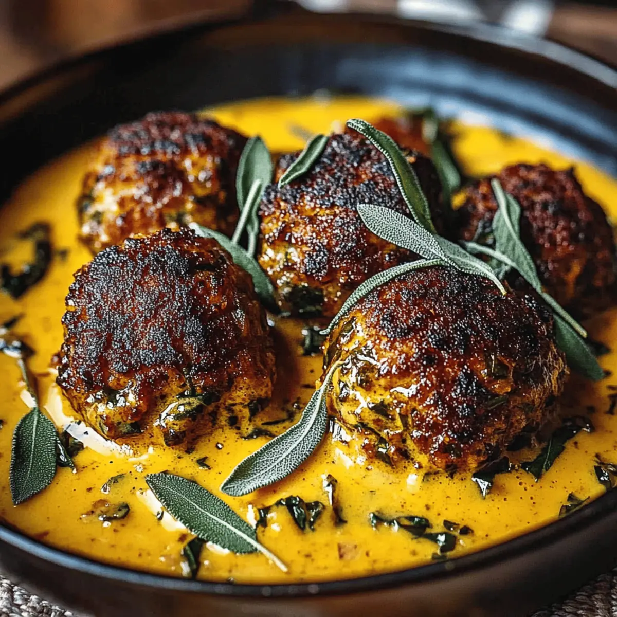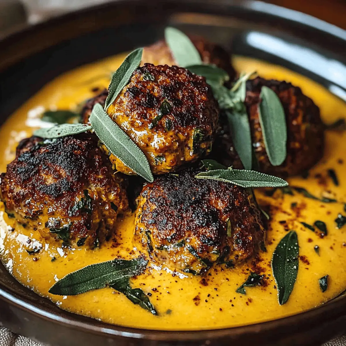 As the leaves turn golden and the air crisps, my cravings shift toward comforting meals that embrace all the warm, cozy flavors of fall. This is where my Turkey Meatballs with Pumpkin Sage Sauce come into play—a dish that invites you to gather around the table and share hearty smiles. These meatballs not only offer lean, healthy protein, but they also come bathed in a rich and creamy pumpkin sage sauce that can easily be made gluten-free or dairy-free. It’s a delightful twist on traditional comfort food that you can whip up quickly on a busy weeknight yet present with pride to guests. Ready to immerse yourself in the season’s best flavors? Let’s dive into this scrumptious recipe! Why is this dish a fall favorite? Comforting Warmth: This dish embodies the essence of fall, providing a cozy meal that warms the soul. Healthy Twist: Packed with lean turkey and wholesome pumpkin, it makes for a nutritious option without sacrificing flavor. Quick & Easy: Prepare this recipe in under 30 minutes—perfect for busy weeknights when time is tight! Versatile Variations: Whether you need gluten-free or a vegetarian option, this recipe adapts easily for everyone at the table. Crowd-Pleasing Flavor: The savory pumpkin sage sauce and tender meatballs create a dynamic dish that pleases even the pickiest eaters. Elegant Presentation: Serve it over pasta or creamy polenta for a dish that’s both comforting and visually appealing, ideal for impressing guests. Meatballs Pumpkin Sage Sauce Ingredients For the Meatballs • Ground Turkey – Offers a lean base; use 93% lean for the best flavor and texture. • Panko Breadcrumbs – Keeps meatballs tender while binding them; regular breadcrumbs can be substituted if needed. • Grated Parmesan Cheese – Adds depth; swap for nutritional yeast to make it dairy-free. • Egg – Acts as a binder for the meatballs; replace with a flax egg for a vegan option. • Yellow Onion – Infuses aromatic flavor; use shallots for a milder taste. • Garlic – Enhances the overall flavor; fresh is preferred but garlic powder works in a pinch. • Fresh Sage & Thyme – Provide a lovely herbal note; dried can be used, but adjust the amount. • Olive Oil – Ideal for browning meatballs; avocado oil is a good alternative. For the Pumpkin Sage Sauce • Pumpkin Puree – The star ingredient adding creaminess and flavor; use pure pumpkin—not pie filling. • Chicken Broth – Adds depth; opt for low-sodium for better control over salt levels. • Heavy Cream – Contributes richness; coconut cream is a great substitute for a dairy-free version. • Nutmeg – Brings warmth; enhances the pumpkin flavor; feel free to experiment with cinnamon or allspice instead. • Salt and Pepper – Essential for seasoning; adjust to your taste preferences. Step‑by‑Step Instructions for Turkey Meatballs with Pumpkin Sage Sauce Step 1: Combine Ingredients In a large mixing bowl, combine the ground turkey, panko breadcrumbs, grated Parmesan cheese, egg, finely chopped yellow onion, minced garlic, fresh sage, thyme, salt, and pepper. Use your hands or a wooden spoon to mix until just combined, making sure not to overmix, which can lead to tough meatballs. Step 2: Form Meatballs Take a generous tablespoon of the mixture and roll it into a 1.5-inch meatball. Place each meatball onto a parchment-lined baking sheet, ensuring they’re spaced apart for easy cooking. You should yield around 20 meatballs, all ready for browning in the next step. Step 3: Brown Meatballs In a large skillet, heat 2 tablespoons of olive oil over medium heat until shimmering. Carefully add the meatballs in a single layer, browning them for about 2–3 minutes on each side until golden brown and slightly crisp. Once browned, transfer them to a plate while you prepare the sauce. Step 4: Sauté Aromatics Using the same skillet, reduce the heat slightly and add another tablespoon of olive oil if needed. Add chopped onion and minced garlic, sautéing for 5–7 minutes until softened and fragrant. This creates a delicious base for your creamy pumpkin sage sauce. Step 5: Make Sauce Stir in the pumpkin puree, chicken broth, heavy cream, and more grated Parmesan to the skillet with the sautéed onions and garlic. Add the fresh sage, thyme, and nutmeg, whisking until the mixture is smooth and well combined. The vibrant orange color should make your mouth water! Step 6: Simmer Sauce Bring the sauce to a gentle simmer over medium-low heat. Allow it to simmer for 10–15 minutes while stirring occasionally—you want it to thicken slightly and develop rich flavors. The aromas coming from your skillet will be simply irresistible. Step 7: Season Sauce Taste the sauce and adjust the seasoning by adding salt and pepper according to your preference. This step is crucial to enhance the flavors of your Meatballs Pumpkin Sage Sauce, creating a comforting and savory dish. Step 8: Combine Gently add the browned meatballs back into the sauce, ensuring they are coated. Cover the skillet and let them simmer for an additional 15–20 minutes, allowing the internal temperature of the meatballs to reach 165°F while soaking up all that delicious pumpkin sage sauce. Step 9: Serve Once done, serve your Turkey Meatballs with Pumpkin Sage Sauce over pasta, creamy polenta, or even mashed potatoes. Garnish with additional fresh sage, a sprinkle of Parmesan, and a dash of red pepper flakes for a touch of heat. Enjoy this heartwarming dish! Meatballs Pumpkin Sage Sauce Variations Feel free to get creative with these variations, adding your personal touch to this delightful dish! Gluten-Free: Use gluten-free breadcrumbs instead of panko to keep your meatballs tender without the gluten. Dairy-Free: Swap heavy cream for coconut cream to maintain that rich and creamy texture without dairy. Vegan: Replace turkey with lentils or mushrooms to make a delicious plant-based meatball, bound together with a flax egg. Spicy Kick: Add crushed red pepper flakes