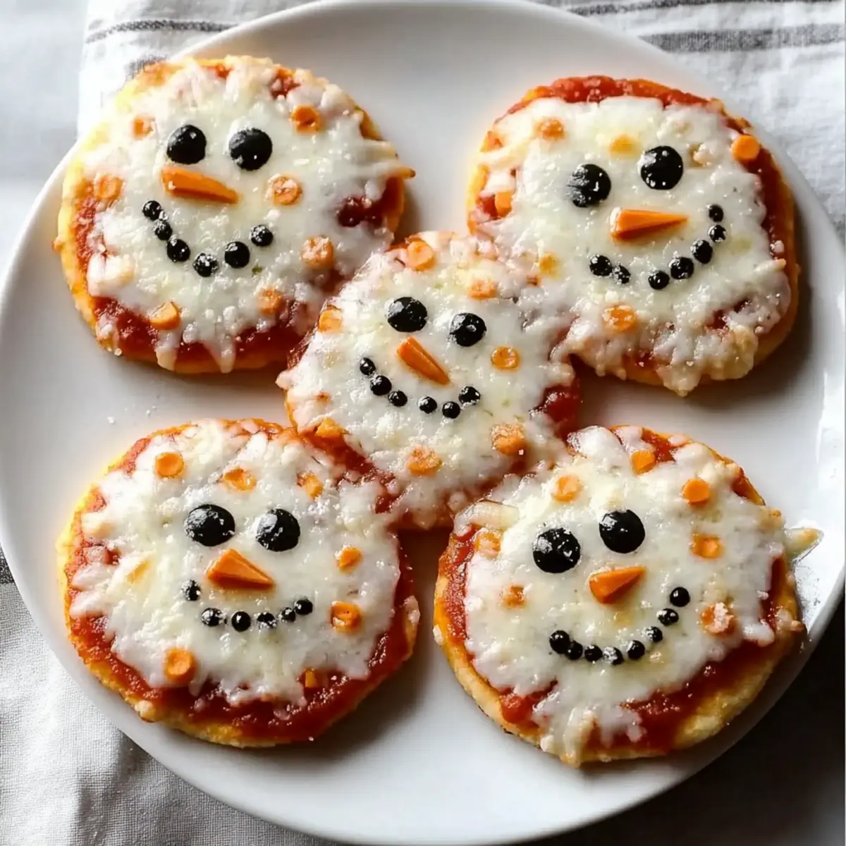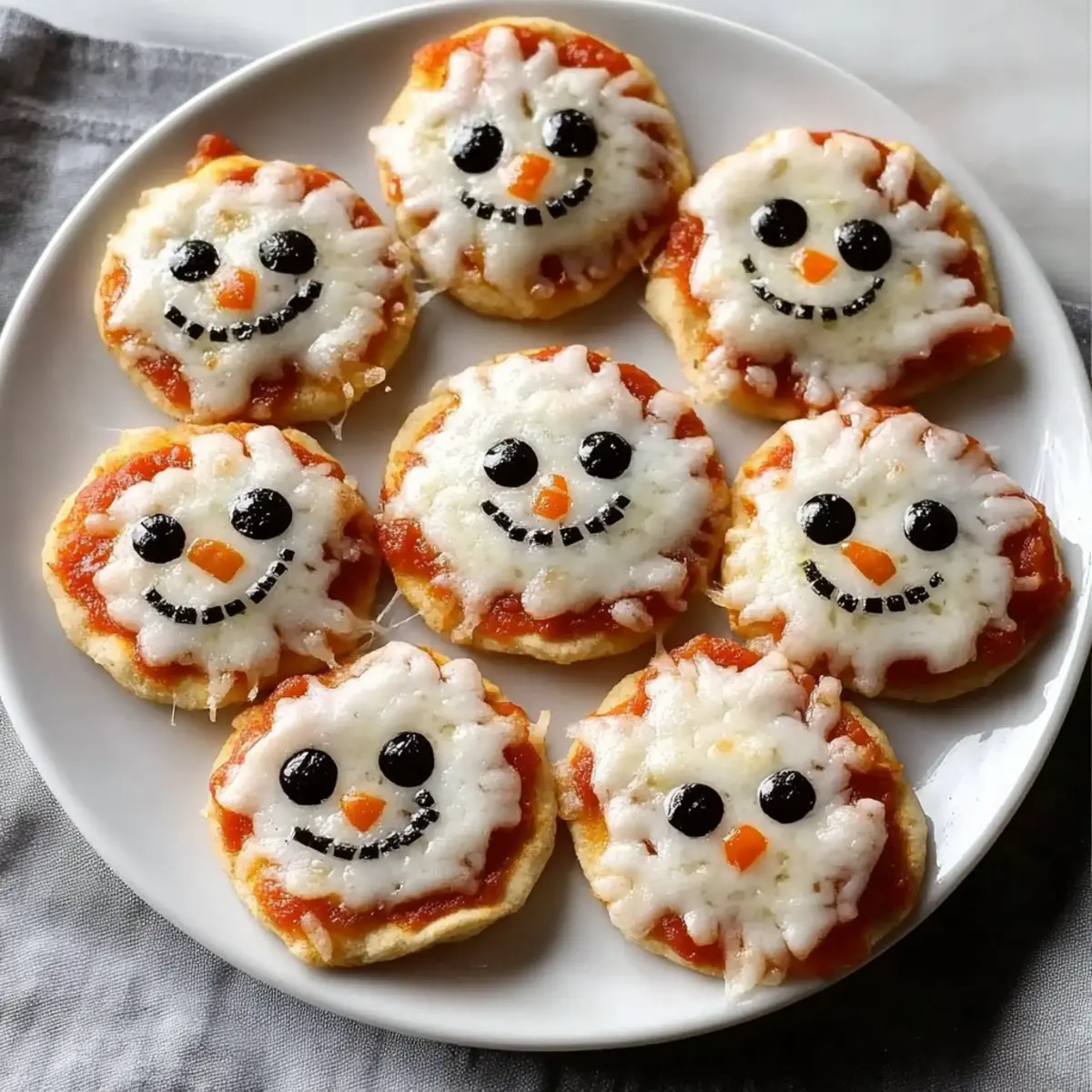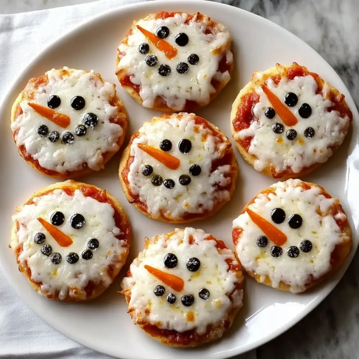 As I watched the first snowflakes of the season drift outside my window, a playful idea struck me: why not bring winter indoors with a touch of whimsy? Enter my Mini Snowman Pizzas—adorable little bites that are as delightful to assemble as they are to devour. With flaky biscuit bases slathered in rich tomato sauce and topped with gooey cheese, these festive snacks not only bring charm to your holiday gatherings but also make for an effortless cooking experience. Perfect for impressing guests or keeping the kids engaged in the kitchen, these mini pizzas are sure to be a hit! Curious how to create these fun, wintry treats that’ll leave everyone smiling? Let’s dive into the delicious details! Why Make Mini Snowman Pizzas? Delightful Presentation: These Mini Snowman Pizzas are not only delicious, but they also bring a smile to everyone’s face with their charming holiday design. User-Friendly: Perfect for home cooks of all levels, this recipe uses simple ingredients that come together without any fuss. Versatile Options: Customize to your heart’s content! Try using different toppings, including veggies for a healthier twist or switching up the cheese— mozzarella or cheddar, the choice is yours! Quick Cooking: Ready in just 15 minutes, they’re ideal for last-minute gatherings or a cozy family dinner. For more easy-to-make delights, check out my Mini Baked Chicken recipe! Crowd-Pleaser: They are fantastic for holiday parties or casual get-togethers—everyone loves pizza, especially when it looks like a snowman! Create lasting memories while enjoying these whimsical bites. Mini Snowman Pizzas Ingredients • Preparing for your festive fun? Here’s what you’ll need. For the Base Flaky Biscuits – The perfect foundation for your Mini Snowman Pizzas; use ready-made dough for a quick assembly. For the Sauce Tomato Sauce – This saucy delight brings moisture and flavor; feel free to swap in marinara or any unique flavored sauce for a tasty twist. For the Topping Shredded Cheese – Melted cheesy goodness on top; traditional mozzarella is great, but using cheddar can amp up the taste. For the Decorations Vegetables (e.g., bell peppers, cherry tomatoes) – These colorful veggies create the snowman’s features; get creative with any vibrant veggies you prefer, or try out different shapes! Bring your kitchen to life with these delightful ingredients and get ready to make some Mini Snowman Pizzas that everyone will love! Step‑by‑Step Instructions for Mini Snowman Pizzas Step 1: Preheat the Oven Begin by preheating your oven to the temperature indicated on the flaky biscuit packaging, usually around 375°F (190°C). This step is crucial for achieving perfectly baked pizza bases. As the oven warms up, gather your ingredients and line a baking sheet with parchment paper for easy cleanup. Step 2: Prepare the Biscuit Base Open the flaky biscuit dough and gently cut out small rounds using a cookie cutter or a glass. Each round should be about 2-3 inches in diameter to form the perfect base for your Mini Snowman Pizzas. Place the rounds evenly spaced on the prepared baking sheet, ensuring room for the biscuits to puff up while baking. Step 3: Add Tomato Sauce Take your tomato sauce and spread a generous layer over each biscuit round using the back of a spoon. Aim for an even coat that covers the biscuit but doesn’t overflow. The sauce not only adds flavor but also ensures that each Mini Snowman Pizza stays moist and delicious as they bake. Step 4: Sprinkle on the Cheese Next, sprinkle shredded cheese generously on top of each sauced biscuit round. Mozzarella is a classic choice, but feel free to mix in some cheddar for added flavor. The cheese will melt beautifully and create a gooey, inviting topping, making your Mini Snowman Pizzas look even more festive. Step 5: Create the Snowman Faces Now it’s time for some fun! Use small pieces of colorful vegetables like bell peppers or cherry tomatoes to create the snowman features on your pizzas. Place veggie pieces for eyes, a nose, and buttons, letting your creativity shine. This step adds charm and whimsy, bringing your Mini Snowman Pizzas to life. Step 6: Bake to Perfection Place the baking sheet in the preheated oven, and let your Mini Snowman Pizzas bake for about 10-15 minutes. Keep an eye on them as they cook; you’re looking for a golden brown color on the biscuits and bubbly cheese. The delightful aroma will fill your kitchen, signaling that they are nearly ready. Step 7: Cool and Serve Once baked to perfection, carefully remove the Mini Snowman Pizzas from the oven and allow them to cool for a few minutes on the baking sheet. This cooling period helps the cheese set slightly, making it easier to serve. After cooling, transfer them to a colorful plate for a festive presentation, and your festive snack is ready to be enjoyed! How to Store and Freeze Mini Snowman Pizzas Fridge: Store any leftover Mini Snowman Pizzas in an airtight container for up to 3 days to keep them fresh and tasty. Freezer: If you want to make these delightful snacks ahead of time, assemble and freeze them for up to a month. Just ensure they’re well-wrapped to prevent freezer burn. Reheating: For the best texture, reheat the pizzas in a preheated oven at 350°F (175°C) for about 10 minutes until hot and crispy. Alternatively, use an air fryer for a quick reheating option! Make Ahead Options These Mini Snowman Pizzas are perfect for busy home cooks looking to save time during the holiday season! You can prepare the biscuit base and assemble the pizzas up to 24 hours in advance. Simply cut out the biscuit rounds and layer them with sauce and cheese, but hold off on adding the vegetable decorations. Cover the assembled pizzas with plastic wrap and refrigerate to maintain their freshness. When you’re ready to enjoy them, pop the snowman pizzas into a preheated oven and bake for about 10-15 minutes until golden brown and bubbly. This way, you can focus on enj