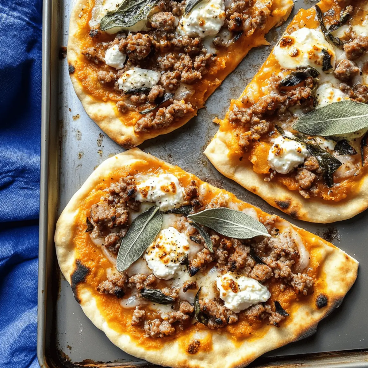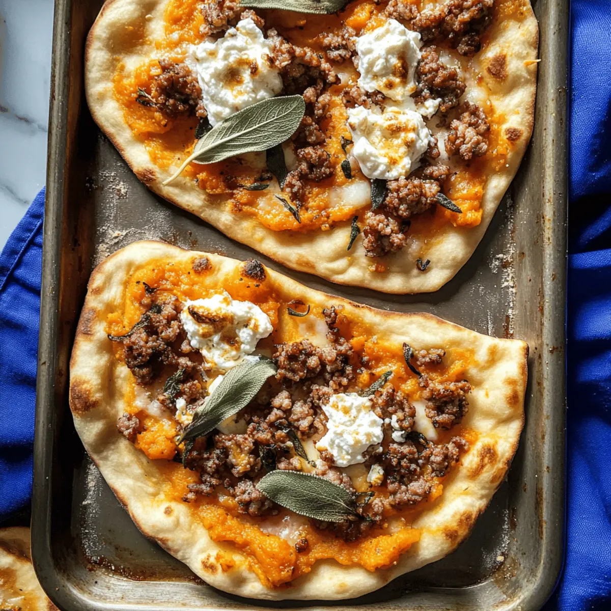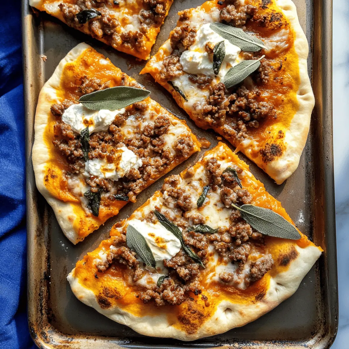 A whiff of autumn brings a warm embrace, the kind that wraps around you like a cozy scarf on a brisk day. This is precisely what you’ll experience with these irresistible Autumn Naan Pizzas. Imagine crispy naan topped with creamy pumpkin puree, sweet caramelized shallots, and savory ground sausage—each slice bursting with seasonal richness. Not only are these Naan Pizzas a delightful twist on traditional pizza, but they also come together in just 30 minutes, making them a perfect weeknight treat for busy home chefs. With their vibrant flavors and comforting textures, these pizzas fit right into your fall dinner plans. Are you ready to savor this seasonal comfort on your dinner table? Why are Naan Pizzas a Fall Favorite? Crispy, Comforting Base: Naan provides a delightful texture contrast with its crispy edges and chewy center, perfect for holding all the toppings. Festive Flavors: The creamy pumpkin puree and savory sausage create a beautiful harmony of sweet and savory, capturing the essence of fall. Quick and Easy: Ready in just 30 minutes, these Naan Pizzas are a perfect solution for busy nights. Versatile Topping Options: Feel free to get creative—swap the sausage for mushrooms or add fresh greens for an extra nutrient boost! For more creative ideas, check out our guide on vegetarian pizza toppings. Crowd-Pleasing Dish: Perfect for gatherings or weeknight dinners, these pizzas are sure to please everyone at the table, making them a hit for family or friends! Naan Pizzas Ingredients Get ready to gather the perfect ingredients to create your delicious Naan Pizzas! For the Base Naan Bread – Serves as the crispy, chewy foundation for your Naan Pizzas, offering a delightful twist on traditional pizza. For the Toppings Extra-Virgin Olive Oil – Adds richness and moisture; feel free to substitute with avocado oil for a different flavor. Shallots – Provide sweetness and depth of flavor when sautéed; yellow onions can be used as a substitute if needed. Ground Sausage (pork, turkey, or chicken) – Adds savory protein and richness; plant-based sausage is a great option for a vegetarian alternative. Canned Pumpkin Puree – Acts as the creamy pizza sauce with that seasonal flavor; fresh pumpkin puree can also be used if it’s available. Dried Oregano – Enhances the flavor profile with earthy notes; you can substitute with Italian seasoning for convenience. Fontina Cheese – Melts beautifully, adding a nutty taste; mozzarella or gouda can be used for a different cheese experience. Whole-Milk Ricotta Cheese – Contributes creaminess and lightness; cottage cheese or dairy-free ricotta work well for a non-dairy option. Fresh Sage Leaves – Infuses an aromatic element; thyme or parsley can be used instead if you prefer. Hot Honey – Provides a sweet-spicy finish to your Naan Pizzas; maple syrup or balsamic glaze can be alternatives if hot honey isn’t available. Gather these ingredients and get ready to delight your taste buds with delicious Naan Pizzas! Step‑by‑Step Instructions for Naan Pizzas Step 1: Preheat the Oven Begin your culinary adventure by preheating your oven to 425°F (220°C). This ensures that your Autumn Naan Pizzas will cook evenly, achieving that perfect crispy texture. While the oven is warming up, gather your ingredients and get ready to assemble a delightful meal that captures the flavors of fall. Step 2: Sauté the Shallots In a medium skillet, heat 1 tablespoon of extra-virgin olive oil over medium heat. Once the oil is hot, add finely sliced shallots and sauté for about 4-5 minutes until they become soft and translucent. Stir occasionally to prevent browning; the goal is to develop their sweetness, which will beautifully enhance the flavor of your Naan Pizzas. Step 3: Cook the Sausage Now, add the ground sausage to the skillet with the sautéed shallots. Cook the mixture for approximately 6-7 minutes, stirring often until the sausage is browned and cooked through. The savory aroma will start to fill your kitchen, making it even harder to resist this delicious Autumn Naan Pizza recipe! Step 4: Prepare the Naan Base While the sausage cooks, arrange naan bread on a baking sheet lined with parchment paper. Using a spatula, spread a generous layer of creamy pumpkin puree over each piece of naan. Sprinkle dried oregano over the pumpkin to season, giving your base a delightful touch before loading up with toppings. Step 5: Add the Cheese and Toppings Sprinkle fontina cheese evenly over the pumpkin-covered naan, followed by the cooked sausage and shallot mixture. Finally, add dollops of whole-milk ricotta cheese atop the savory layers, creating a luscious combination of flavors that will melt beautifully in the oven. Step 6: Season with Fresh Sage In a small bowl, drizzle the fresh sage leaves with the remaining olive oil, ensuring they’re lightly coated. Scatter the sage over the assembled Naan Pizzas, allowing its aromatic essence to mingle with the other ingredients during baking and infuse your dish with an additional layer of fall flavor. Step 7: Bake the Naan Pizzas Carefully place the baking sheet in the preheated oven and bake for approximately 15 minutes. Keep an eye on them as they bake; your Naan Pizzas should become golden brown with crisp edges and the cheese should melt into a bubbly deliciousness, perfectly showcasing all those autumn flavors. Step 8: Drizzle with Hot Honey and Serve Once baked, remove the Naan Pizzas from the oven and drizzle hot honey over the top to add a sweet-spicy kick. Let them cool for a minute before slicing into pieces, and serve warm, inviting your family and friends to savor these mouthwatering Autumn Naan Pizzas together! What to Serve with Autumn Naan Pizzas? Pairing these delightful Autumn Naan Pizzas with the right sides elevates your fall feast and completes the meal. Crispy Mixed Greens Salad: A light salad with a tangy vinaigrette cuts through the richness of the pizzas, refreshing your palate. Add nuts f