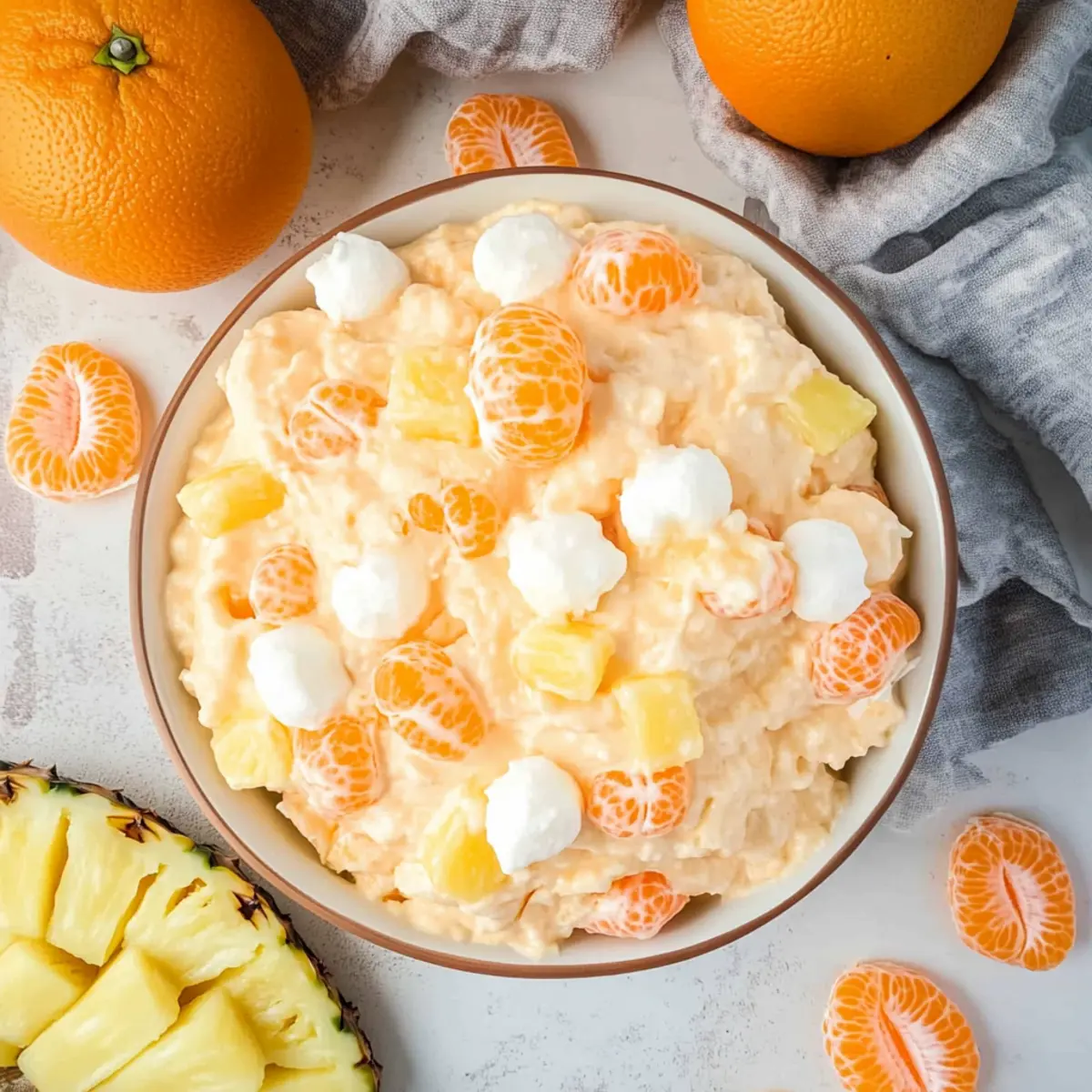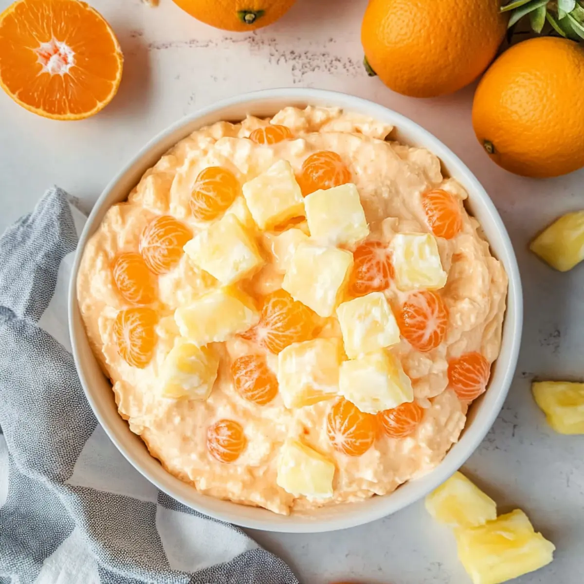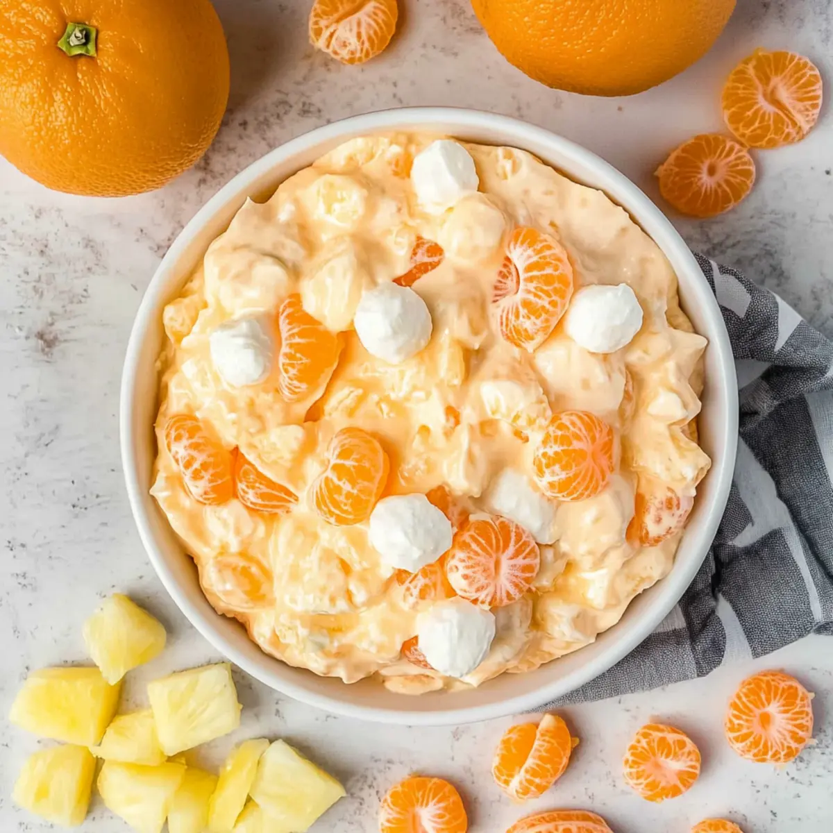 Walking into my kitchen one sunny afternoon, the sweet scent of citrus filled the air, instantly lifting my spirits. It was the perfect day for a classic Orange Fluff Salad—a no-bake dessert that’s as simple to prepare as it is delightful to eat. This easy recipe combines vibrant mandarin oranges and crushed pineapple with the creamy goodness of vanilla pudding and Cool Whip, creating a light, fluffy treat that everyone will adore. Not only does it come together quickly, making it a great choice for spontaneous gatherings, but it also serves as a refreshing crowd-pleaser for any occasion. Whether you’re looking to impress at a potluck or simply indulge your sweet tooth, this dessert is sure to bring sunshine to your table. What will you pair it with for your next gathering? Why is Orange Fluff Salad so special? Irresistibly Refreshing: This dessert is a delightful mix of tropical flavors, combining mandarin oranges and crushed pineapple that dance on your palate. No-Bake Simplicity: Perfect for any skill level, it requires minimal effort but delivers maximum impact, making it your go-to for casual get-togethers. Light and Creamy: The airy texture from vanilla pudding and Cool Whip creates a satisfying dessert that feels indulgent without being heavy. Crowd-Pleasing Appeal: Bright and cheerful, it’s an instant favorite at BBQs and potlucks, guaranteeing compliments and requests for the recipe. Versatile Variations: Feel free to get creative! Substitute peaches or try different jello flavors for a unique twist. This Corn Pasta Salad or Pancakes Good They would complement your Orange Fluff Salad perfectly for a delightful spread. Orange Fluff Salad Ingredients For the Base Orange Jello Mix – Adds vibrant color and flavor; opt for sugar-free for a lighter dessert. Boiling Water – Essential for activating the jello and ensuring proper consistency. Cold Water – Helps cool the jello mixture quickly, making it easier to work with. For the Creamy Layer Instant Vanilla Pudding Mix – Provides a rich, creamy texture; feel free to experiment with other pudding flavors for variety. Cool Whip – Adds lightness and sweetness; you can substitute with homemade whipped cream for a fresher taste. For Texture and Flavor Mini Marshmallows – Contributes delightful sweetness and texture; can be swapped with larger marshmallows chopped into smaller pieces. Mandarin Oranges – Adds juicy sweetness; ensure they are well-drained to avoid excess moisture. Crushed Pineapple – Infuses a tropical flavor; make sure it is drained well for the best results. Creating this Orange Fluff Salad combines delightful flavors and textures without any baking involved, making it a wonderfully simple treat to share! Step‑by‑Step Instructions for Orange Fluff Salad Step 1: Prepare the Jello Mixture In a mixing bowl, dissolve one package of orange jello mix in 1 cup of boiling water, stirring until completely dissolved. The mixture should be bright and smooth, with no granules visible. Once dissolved, add ½ cup of cold water to cool the mixture slightly. Step 2: Chill Until Thickened Cover the bowl and refrigerate the jello mixture for about 15-20 minutes or until it’s slightly thickened, resembling a gel-like consistency. Keep an eye on it to ensure you don’t let it set completely; you want it thick enough to hold shape but not fully set. Step 3: Mix in Pudding Once the jello has thickened, add one package of instant vanilla pudding mix into the bowl. Whisk vigorously for about 2 minutes until the mixture is smooth and well combined. The pudding will blend into the jello, creating a luscious, creamy base for your Orange Fluff Salad. Step 4: Fold in the Whipped Topping Gently fold in 2 cups of Cool Whip using a spatula, being careful not to deflate the airy texture. The mixture should be light and fluffy, turning a beautiful orange hue. Ensure all the pudding and jello are fully incorporated into the Cool Whip for a consistent texture. Step 5: Add Fruit and Marshmallows Stir in 1 cup of mini marshmallows, 1 cup of well-drained mandarin oranges, and 1 cup of crushed pineapple. Gently mix until the fruit and marshmallows are evenly distributed throughout the fluffy mixture. This step adds delightful bursts of flavor and texture to your Orange Fluff Salad. Step 6: Refrigerate to Set Transfer the mixture into a serving dish, spreading it out evenly. Cover it with plastic wrap or a lid and refrigerate for at least 2 hours, but preferably overnight. This chilling time allows the flavors to meld beautifully while ensuring a perfect, creamy texture that everyone will love. Step 7: Serve and Enjoy Once chilled, remove the Orange Fluff Salad from the refrigerator. Serve it in individual bowls or as a large scoopable dish, pairing it with your favorite cakes or as a refreshing side to your meals. The vibrant colors and fluffy texture promise to be a real crowd-pleaser! What to Serve with Orange Fluff Salad Walking into my kitchen one sunny afternoon, the sweet scent of citrus filled the air, instantly lifting my spirits. It was the perfect day for a classic Orange Fluff Salad—a no-bake dessert that’s as simple to prepare as it is delightful to eat. This easy recipe combines vibrant mandarin oranges and crushed pineapple with the creamy goodness of vanilla pudding and Cool Whip, creating a light, fluffy treat that everyone will adore. Not only does it come together quickly, making it a great choice for spontaneous gatherings, but it also serves as a refreshing crowd-pleaser for any occasion. Whether you’re looking to impress at a potluck or simply indulge your sweet tooth, this dessert is sure to bring sunshine to your table. What will you pair it with for your next gathering? Grilled Chicken Skewers: The savory, smoky flavor complements the sweetness of the Orange Fluff Salad perfectly, balancing the meal beautifully. Mixed Green Salad: A crisp, refreshing salad adds texture and a lightness that contrasts deli
