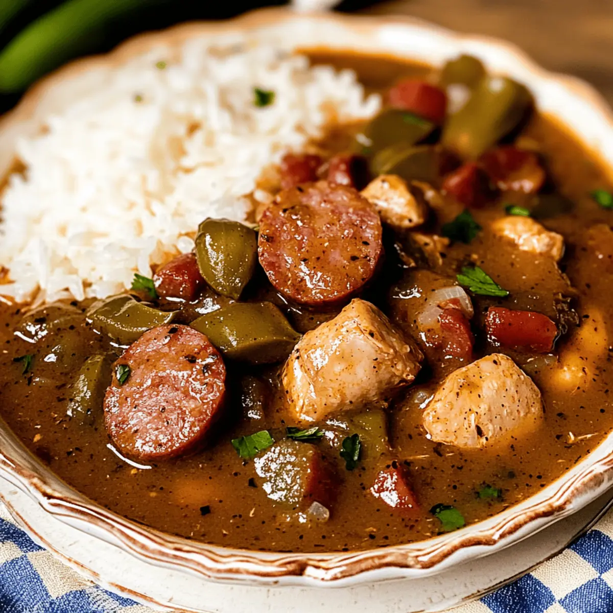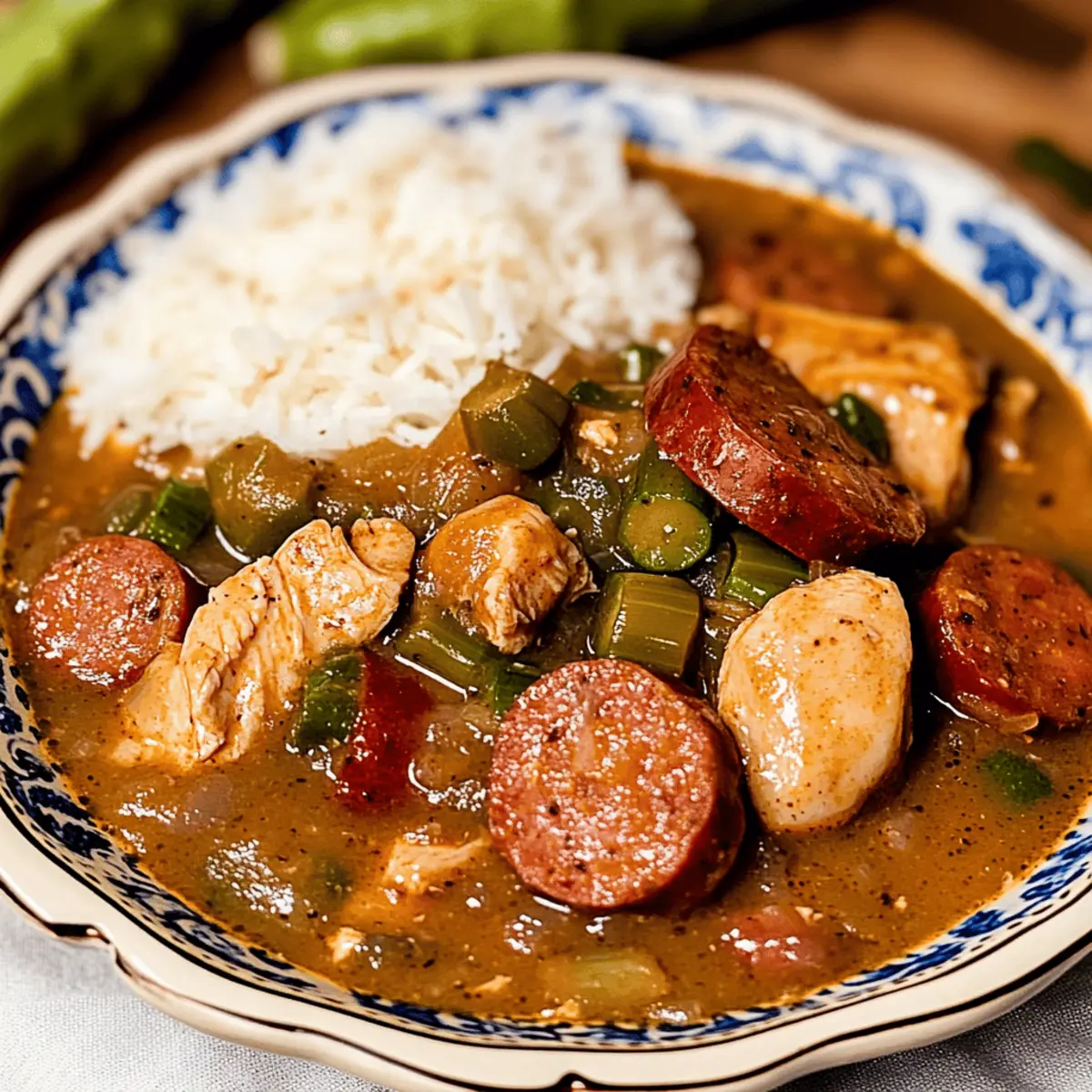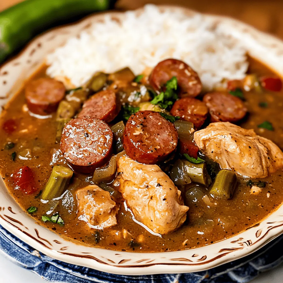 The comforting aroma of New Orleans Cajun Chicken and Sausage Gumbo wafts through my kitchen, instantly transporting me to a bustling café on Bourbon Street. As I simmer the bold spices and hearty ingredients, I find that this traditional Cajun dish is not just a recipe; it’s a delicious embrace on a chilly evening. This gumbo is a cherished crowd-pleaser, perfect for family gatherings or cozy nights in, effortlessly blending tender chicken, smoky sausage, and a robust medley of veggies. Plus, with a little patience, the rich roux comes together, creating a satisfying texture that warms the soul. Are you ready to dive into the heart of Southern comfort food? Let’s explore how to craft this culinary masterpiece! Why is Cajun Gumbo a Must-Try? Aromatic, Flavorful Bliss: The smoky scent of Andouille sausage and the depth of spices create an irresistible aroma that draws everyone to the table. Warm, Hearty Comfort: This gumbo is a soul-warming dish that fills you up with its delightful blend of chicken, sausage, okra, and veggies, perfect for chilly nights. Endless Variations: Whether you choose seafood for a Creole twist or even a vegetarian version, this dish adapts beautifully, catering to every palate. Crowd-Pleasing Delight: Serve it at family gatherings alongside fragrant rice, and watch your guests rave about this classic Southern comfort food! If you enjoyed this dish, consider trying a Bang Bang Chicken or our delicious Butter Chicken Comfort next. Orleans Cajun Chicken andouille Sausage Gumbo Ingredients For the Protein 1 lb Chicken – Provides the main protein. Can substitute with turkey or duck for a different flavor. 12 oz Sausage (Andouille preferred) – Adds a hearty, smoky flavor. Substitute with kielbasa or a vegetarian sausage for a milder taste. For the Roux 1 ¼ cups Vegetable Oil – Forms the base of the gumbo. Do not substitute with olive oil as it can affect the flavor and heat tolerance. 1 cup All-Purpose Flour – Thickens the roux. Whole wheat flour can be an alternative, but will change flavor and texture. For Flavoring 3 tsp Cajun Seasoning – Blends spices for authentic flavor. Adjust by adding more or using a homemade mix based on preference. 64 oz Chicken Broth – Provides depth of flavor. Homemade broth is ideal; store-bought works in a pinch. 1 tsp Black Pepper – Balances flavors. Freshly ground provides better aroma. 2 tsp Cajun Seasoning (additional) – Enhances flavors towards the end of cooking. 3 tsp Gumbo Filé – Finishing spice that adds complexity. Can omit but try to use if possible for authentic taste. 2 tsp Hot Sauce – For heat and flavor. Adjust based on spice sensitivity. ¼ tsp Salt – Balances the dish. Use to taste depending on saltiness of the broth. For the Vegetables ½ cup Bell Pepper (diced) – Part of the ‘holy trinity’ in Cajun cooking, for flavor and aroma. ½ cup Celery (diced) – Adds crunch and earthiness. Essential for traditional gumbo. ½ cup Onions (diced) – Enhances sweetness and depth of flavor. Substitute with shallots for a milder taste. 1 cup Okra (sliced) – Thicken gumbo and adds unique flavor. Substitute with additional flour or a corn starch slurry if unavailable. Step‑by‑Step Instructions for Orleans Cajun Chicken Andouille Sausage Gumbo Step 1: Sear Chicken and Sausage Begin by seasoning the chicken and sausage with 3 teaspoons of Cajun seasoning for a flavor kick. In a large pot, heat 1 tablespoon of oil over medium heat. Once hot, add the chicken and sausage, searing each side until they achieve a golden brown color, about 10 minutes. Remove the meats from the pot and set them aside on a plate. Step 2: Make the Roux In the same pot, combine 1 ¼ cups of vegetable oil and 1 cup of flour to create the roux. Stir continuously over medium heat, watching closely as it darkens to a deep brown, which takes about 45 minutes. This is crucial for authenticity, so don’t rush it—keep stirring diligently until you achieve a rich, nutty aroma. Step 3: Add Vegetables Finely chop the bell pepper, celery, and onions to make up the Cajun ‘holy trinity.’ Once your roux is ready, carefully add the diced vegetables to the pot and cook for about 5 minutes, stirring occasionally. The veggies will soften and blend beautifully into the roux, filling your kitchen with amazing aromas. Step 4: Incorporate Broth Gradually pour in 64 ounces of chicken broth while stirring to mix it into the roux and vegetable mixture. This creates a smooth base for your gumbo. Raise the heat slightly and bring the mixture to a gentle simmer, cooking for about 7-10 minutes. You’ll start to see bubbles forming, indicating it’s beginning to thicken. Step 5: Flavor It Up Once simmering, stir in 1 teaspoon of black pepper, an additional 2 teaspoons of Cajun seasoning, 3 teaspoons of gumbo filé, and 2 teaspoons of hot sauce for that signature kick. Add the sliced okra next, stirring everything together. Let the mixture bubble for a couple of minutes while the okra releases its flavor and slightly thickens the gumbo. Step 6: Combine Ingredients Return the seared chicken and sausage to the pot, allowing them to nestle into the flavorful gumbo. Lower the heat and let the mixture simmer gently on low for about 15 minutes. This simmering phase is critical, as it allows all the wonderful flavors to meld together for a deeply savory experience. Step 7: Serve Your Orleans Cajun Chicken Andouille Sausage Gumbo is now ready to shine! Serve it hot over a bed of fluffy white rice for a complete meal. Each spoonful should be rich and hearty, brimming with tender chicken, smoky sausage, and a delightful medley of spices. How to Store and Freeze Orleans Cajun Chicken Andouille Sausage Gumbo Fridge: Store leftover gumbo in an airtight container for up to 3 days. Allow it to cool completely before sealing to prevent moisture buildup. Freezer: For longer storage, freeze in a sturdy, freezer-safe container for up to 3 months. Label with the da
