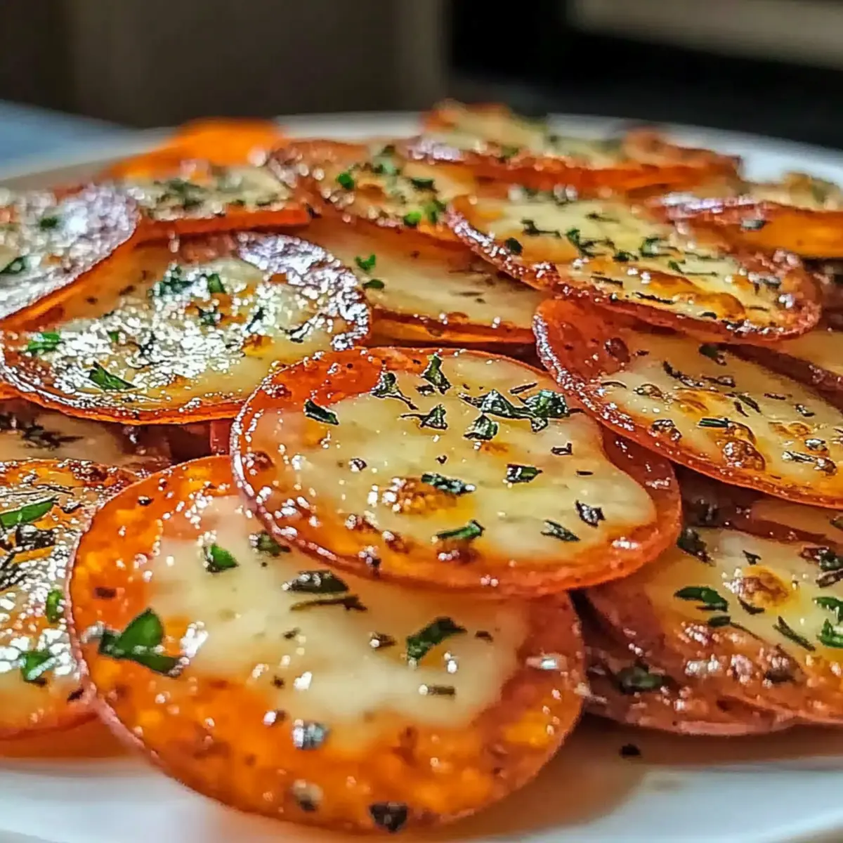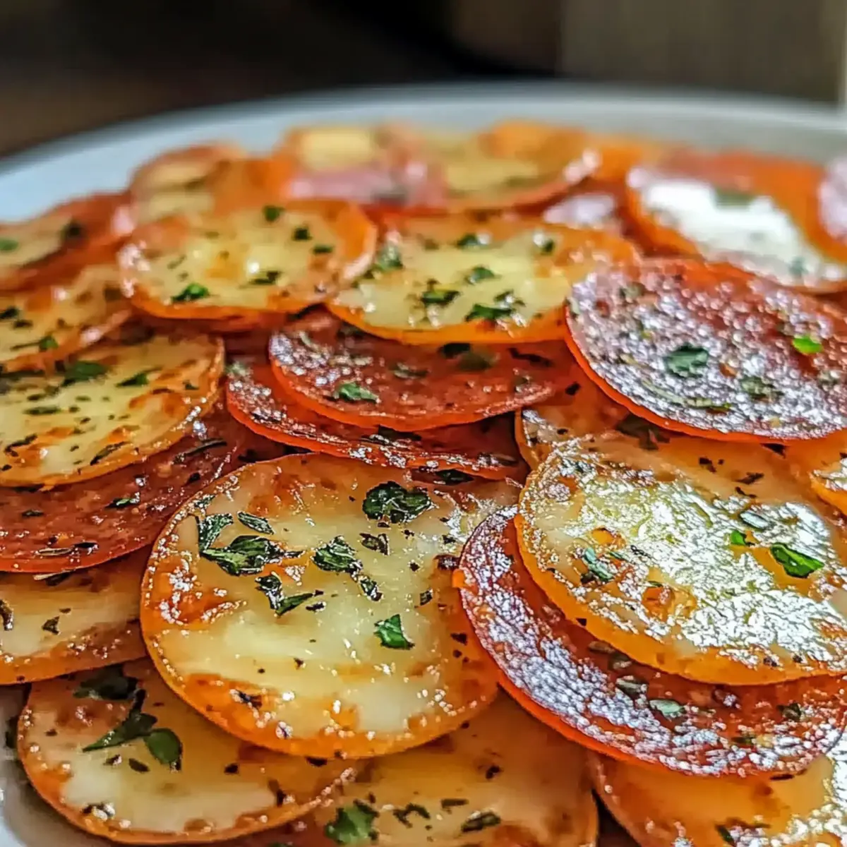 As I rummaged through my pantry one afternoon, a brilliant idea sparked: why not create a snack that combines my love for cheese and pepperoni? Thus, I stumbled upon the truly delightful Pepperoni Cheese Crisps. These crispy bites are not only incredibly easy to whip up but also pack a satisfying crunch that’s absolutely addictive! Whether you’re gearing up for game day, hosting a movie night, or simply in the mood for a quick and delicious treat, these snacks are your new go-to. They’re gluten-free and ready in just 20 minutes, making them the perfect option for those of us looking to ditch fast food without sacrificing flavor. Curious about how to make these irresistible crisps? Let’s dive in! Why Are These Crisps So Irresistible? Quick Preparation: You can whip up these Pepperoni Cheese Crisps in just 20 minutes, making them a fantastic spur-of-the-moment snack. Gluten-Free Goodness: Perfect for those with dietary restrictions, these crisps are a delightful gluten-free treat that everyone can enjoy. Versatile Flavor Options: Feel free to mix and match cheeses or add your favorite spices for a personalized touch. Try using Egg Cheese Toasts for a breakfast variation! Crowd-Pleasing Snack: Whether it’s game day or a movie night, these cheesy bites will be the star of the show! Satisfying Crunch: Each bite delivers an irresistible crunch, reminiscent of potato chips but bursting with cheesy goodness! Pepperoni Cheese Crisps Ingredients Here’s everything you need to bring your crispy creation to life! For the Cheese Mixture Shredded Mozzarella Cheese – Provides that deliciously stretchy and gooey texture; swap with provolone for a new flavor twist. Shredded Cheddar Cheese – Adds a sharp richness that elevates the dish; Monterey Jack makes a milder alternative if preferred. Grated Parmesan Cheese – Offers nutty notes that enhance overall flavor depth; Grana Padano can be a suitable substitute. For the Pepperoni Pepperoni Slices – These are the star of your crisps, adding that quintessential spice and crispiness; try turkey pepperoni for a healthier option or spicy pepperoni for an added kick. For Seasoning Italian Seasoning – Infuses the crisps with an aromatic blend of herbs; fresh herbs can be used for an even more intense flavor profile. Garlic Powder – Boosts the savory essence without overpowering; fresh minced garlic can be substituted for a bolder taste. Red Pepper Flakes (Optional) – Provides a spicy kick; cayenne pepper can replace it for a stronger heat level if desired. For Garnish Fresh Parsley (Optional) – Adds a splash of color and a hint of freshness to your crisps; chopped chives are a delightful alternative! Now that you have all your ingredients lined up, your journey to making irresistible Pepperoni Cheese Crisps is just around the corner! Step‑by‑Step Instructions for Pepperoni Cheese Crisps Step 1: Preheat the Oven Begin by preheating your oven to 375°F (190°C). While the oven heats, prepare a baking sheet by lining it with parchment paper to prevent sticking. This simple step sets the stage for your delicious Pepperoni Cheese Crisps, ensuring they bake perfectly crispy and golden without a mess. Step 2: Combine the Cheeses In a large mixing bowl, combine shredded mozzarella, cheddar, and grated Parmesan cheese until they are well mixed. This heavenly blend of cheeses creates a wonderful gooey texture that is crucial for your Pepperoni Cheese Crisps. Be sure to fully incorporate the cheeses to ensure even flavor in every bite. Step 3: Season the Cheese Mixture Next, sprinkle in Italian seasoning and garlic powder to your cheese blend, stirring well for even distribution. If you’re craving an extra kick, now’s the time to add red pepper flakes for a spicier crisp. Mixing these seasonings with the cheese not only elevates the flavor but also makes your crisps truly irresistible. Step 4: Prepare the Pepperoni Take your pepperoni slices and, if they’re large, cut them in half for a more manageable size. This makes it easier to top each slice with cheese and ensures that every bite of your Pepperoni Cheese Crisps is packed with flavor. Set the prepared pepperoni aside as you move onto the next step. Step 5: Arrange on the Baking Sheet Place the pepperoni slices in a single layer on the prepared baking sheet, making sure to space them slightly apart. This spacing is key to allowing the pepperoni to crisp up nicely and the cheese to melt evenly. The anticipation builds as you prepare for the delicious baking process! Step 6: Top with Cheese Generously sprinkle the cheese mixture over each pepperoni slice, ensuring an even coating. The goal here is to create a delightful cheese crown atop your pepperoni, which will turn golden and crispy as they bake. Take care to cover each slice adequately for that perfect cheesy goodness in your Pepperoni Cheese Crisps. Step 7: Bake the Crisps Carefully place the baking sheet in your preheated oven and bake for 8-10 minutes. Keep a close eye on them, as you’ll want the cheese to be fully melted and lightly golden. The transformation from simple ingredients to crunchy snacks is exciting, and the aroma will fill your kitchen! Step 8: Cool & Serve Once baked to perfection, remove the baking sheet from the oven and let the Pepperoni Cheese Crisps cool briefly. Transfer them to a wire rack to cool completely, which helps maintain their crisp texture. Serve warm and enjoy the delightful crunch with optional garnishing of fresh parsley for an extra pop of color! Pepperoni Cheese Crisps Variations & Substitutions Feel encouraged to make these delicious Pepperoni Cheese Crisps your own with the following creative ideas that will tantalize your taste buds! Cheese Swaps: Try using provolone or pepper jack for a different flavor experience. Mixing cheeses can elevate your snack with unique tastes! Turkey Pepperoni: Opt for turkey pepperoni instead of traditional for a healthier, leaner option. You’ll still sa