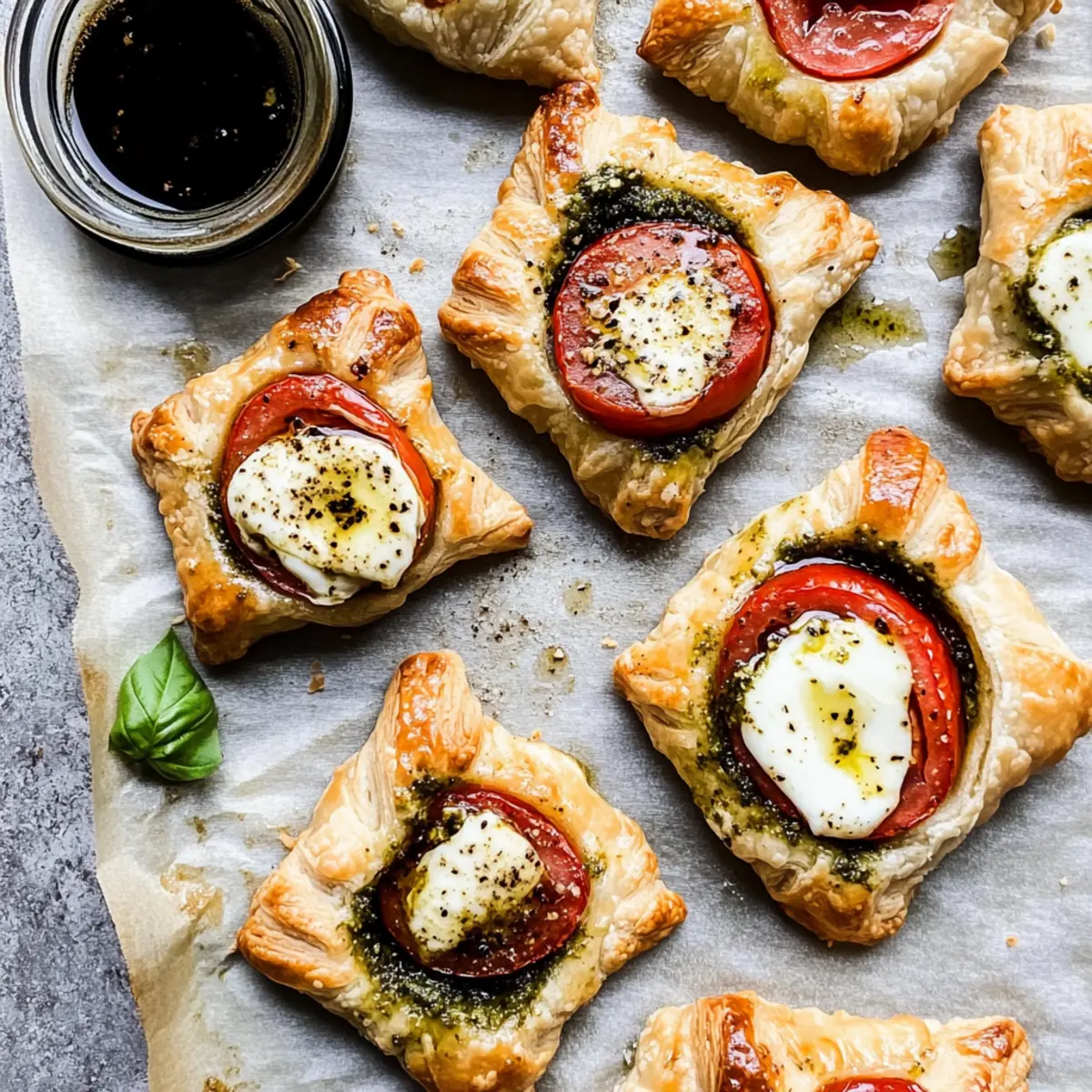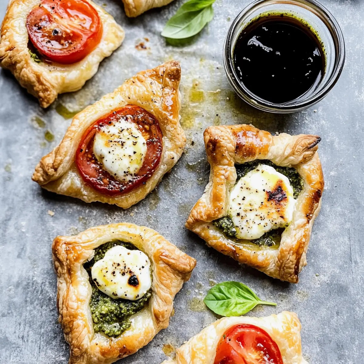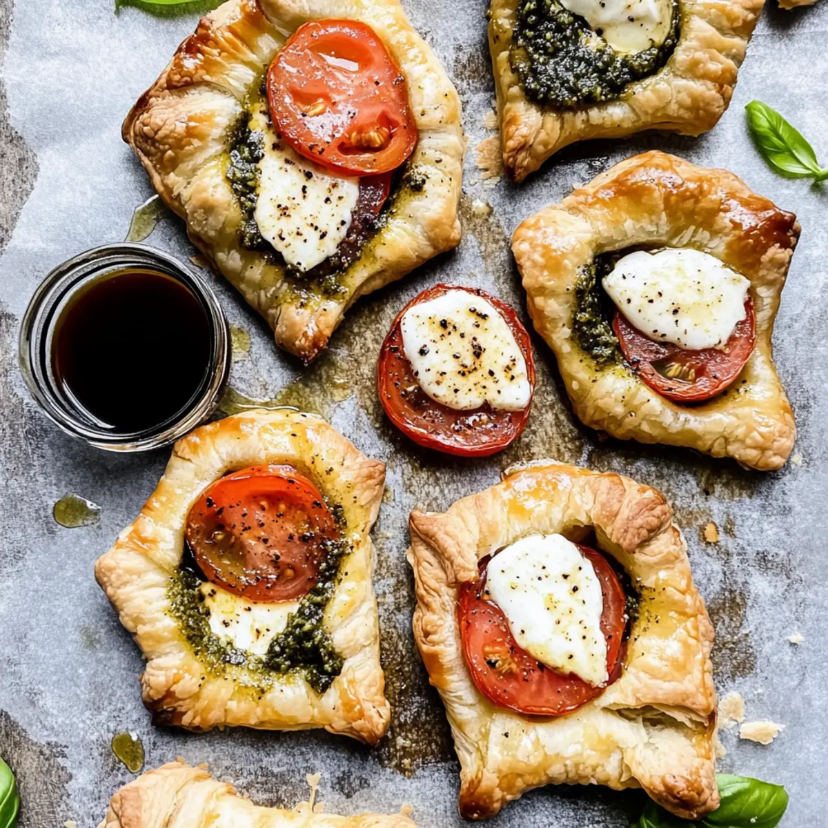 The kitchen was a flurry of color and tantalizing scents as I whipped up a batch of Pesto Caprese Puff Pastries for a summer gathering. These delights feature flaky puff pastry generously topped with homemade pesto, vine-ripened Roma tomatoes, and ooey-gooey mozzarella, all coming together for a mouthwatering appetizer. The best part? You can have these beauties ready in under 30 minutes! Not only are they a breeze to make, but they’re also an impressive crowd-pleaser that highlights fresh ingredients. So, whether you’re hosting friends or simply craving something delicious, get ready to elevate your appetizer game with this easy recipe. Curious about how to make these irresistible bites? Let’s dive in! Why Are These Puff Pastries So Special? Simplicity: These Pesto Caprese Puff Pastries are quick and easy, perfect for any cooking skill level. Fresh Ingredients: With a focus on homemade pesto and ripe tomatoes, every bite bursts with flavor and vibrancy. Crowd-Pleaser: Ideal for gatherings, everyone will be reaching for seconds! Versatile: Swap in different cheeses or veggies for a unique twist each time. Time-Saving: Bake these beauties in just 30 minutes, making them a go-to appetizer for last-minute invites. Whether served warm or slightly cooled, they bring a delightful touch to your table! Pesto Caprese Puff Pastries Ingredients For the Pesto Walnuts – Provide a nutty flavor and creaminess to the pesto; substitute with pine nuts for a traditional taste. Fresh Basil Leaves – The aromatic green herb that forms the base of the pesto; use parsley if fresh basil isn’t available. Lemon Juice – Adds freshness and acidity; substitute with vinegar for a different tang. Salt – Enhances flavors; adjust to taste. Pepper – Adds a hint of spice; freshly ground is best. Garlic – Brings a robust flavor; feel free to use roasted garlic for a milder taste. Olive Oil – Essential for blending the pesto smoothly; avocado oil can substitute for a different profile. Grated Parmesan Cheese – Provides creaminess and richness; nutritional yeast works for a dairy-free option. For the Pastries Puff Pastry – The flaky base; phyllo dough can be used but will alter the baking time. Roma Tomatoes – Adds juicy freshness; heirloom varieties can give a different taste and color. Fresh Mozzarella – Melts beautifully for a creamy center; burrata offers a richer flavor. Small Basil Leaves – For garnish and added freshness; substitute with arugula or microgreens if desired. Balsamic Glaze – Gives a sweet tangy finish; balsamic vinegar can be used in a pinch, but glaze is preferred for richness. Step‑by‑Step Instructions for Pesto Caprese Puff Pastries Step 1: Preheat the Oven Begin by preheating your oven to 400°F (200°C) while preparing a baking sheet lined with parchment paper. This setup will help the Pesto Caprese Puff Pastries bake evenly and achieve that perfect golden-brown finish. Ensuring the oven is hot enough prior to baking is essential for that flaky, crispy texture you desire. Step 2: Make the Homemade Pesto In a blender or food processor, combine walnuts, salt, and garlic, pulsing until a sandy mixture forms. Then, add fresh basil leaves and lemon juice, blending until combined. Slowly drizzle in olive oil while blending until the pesto reaches a smooth consistency. Finally, fold in grated Parmesan cheese to add rich flavor to your homemade pesto. Step 3: Prepare the Puff Pastry On a lightly floured surface, roll out your thawed puff pastry to ensure it’s smooth and pliable. Cut the pastry into nine equal squares using a sharp knife or pizza cutter. Make sure to keep the squares uniform in size, as this will help your Pesto Caprese Puff Pastries bake evenly and look appealing when served. Step 4: Assemble the Pastries On each square of puff pastry, spoon a generous dollop of the homemade pesto at the center. Then, place a slice of juicy Roma tomato and a piece of fresh mozzarella on top of the pesto. Next, gently fold two opposite corners of each pastry towards the center, pinching to enclose the filling. This creates the perfect little pockets for baking. Step 5: Chill the Assembled Pastries Transfer the assembled puff pastries to the fridge and chill them for at least 20 minutes. This chilling step helps the pastries firm up, ensuring they maintain their shape during baking. It’s an essential tip for achieving the perfect texture in your Pesto Caprese Puff Pastries. Step 6: Brush and Season Once chilled, remove the pastries from the refrigerator. Brush the tops gently with an egg wash made from a whisked egg for a beautiful golden finish. Sprinkle garlic salt and additional grated cheese over the top for added flavor. These final touches will ensure your Pesto Caprese Puff Pastries are not only tasty but also eye-catching. Step 7: Bake the Pastries Place the pastries in the preheated oven and bake for 20–25 minutes, or until they are puffed up and golden brown. Keep an eye on them as they bake; you want to achieve a lovely flaky exterior and melty mozzarella inside. The aroma wafting from the oven will certainly be irresistible! Step 8: Finish and Serve After baking, remove the pastries from the oven and allow them to cool slightly on a wire rack. Drizzle with balsamic glaze for a sweet tangy finish and garnish with small basil leaves for freshness. Your Pesto Caprese Puff Pastries are now ready to impress your guests at any gathering! What to Serve with Pesto Caprese Puff Pastries Create a delightful meal experience by pairing the vibrant flavors of these pastries with complementary sides. Arugula Salad: A peppery arugula salad with lemon vinaigrette adds a fresh and zesty contrast to the creamy mozzarella and rich pesto. The crispness of the arugula balances the flakiness of the pastries beautifully. Sautéed Vegetables: Colorful sautéed bell peppers, zucchini, and cherry tomatoes provide a vibrant medley of flavors and textures, enhancing the fresh ingred